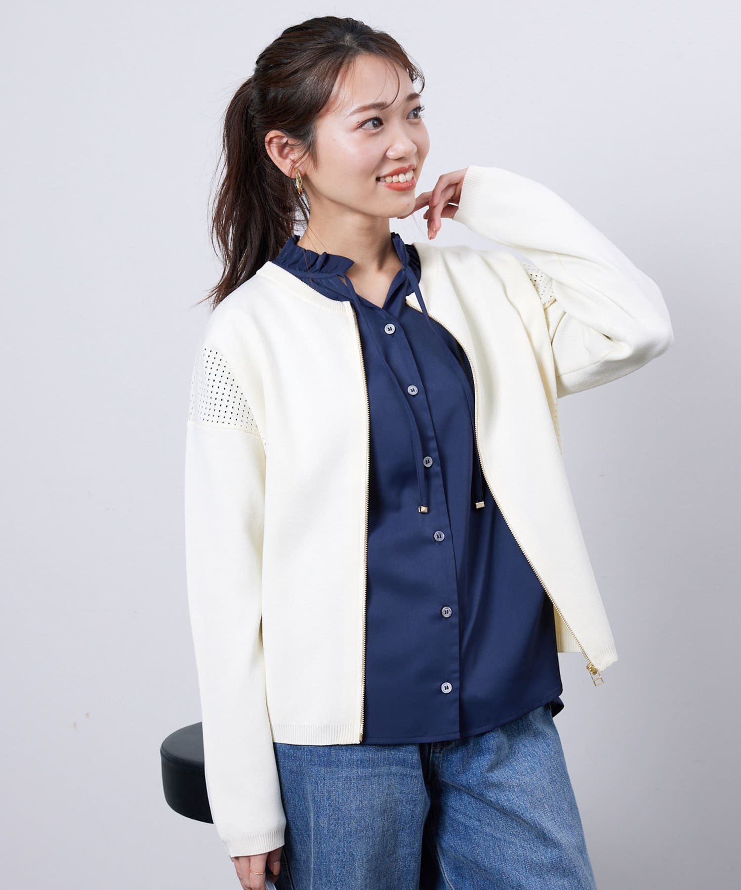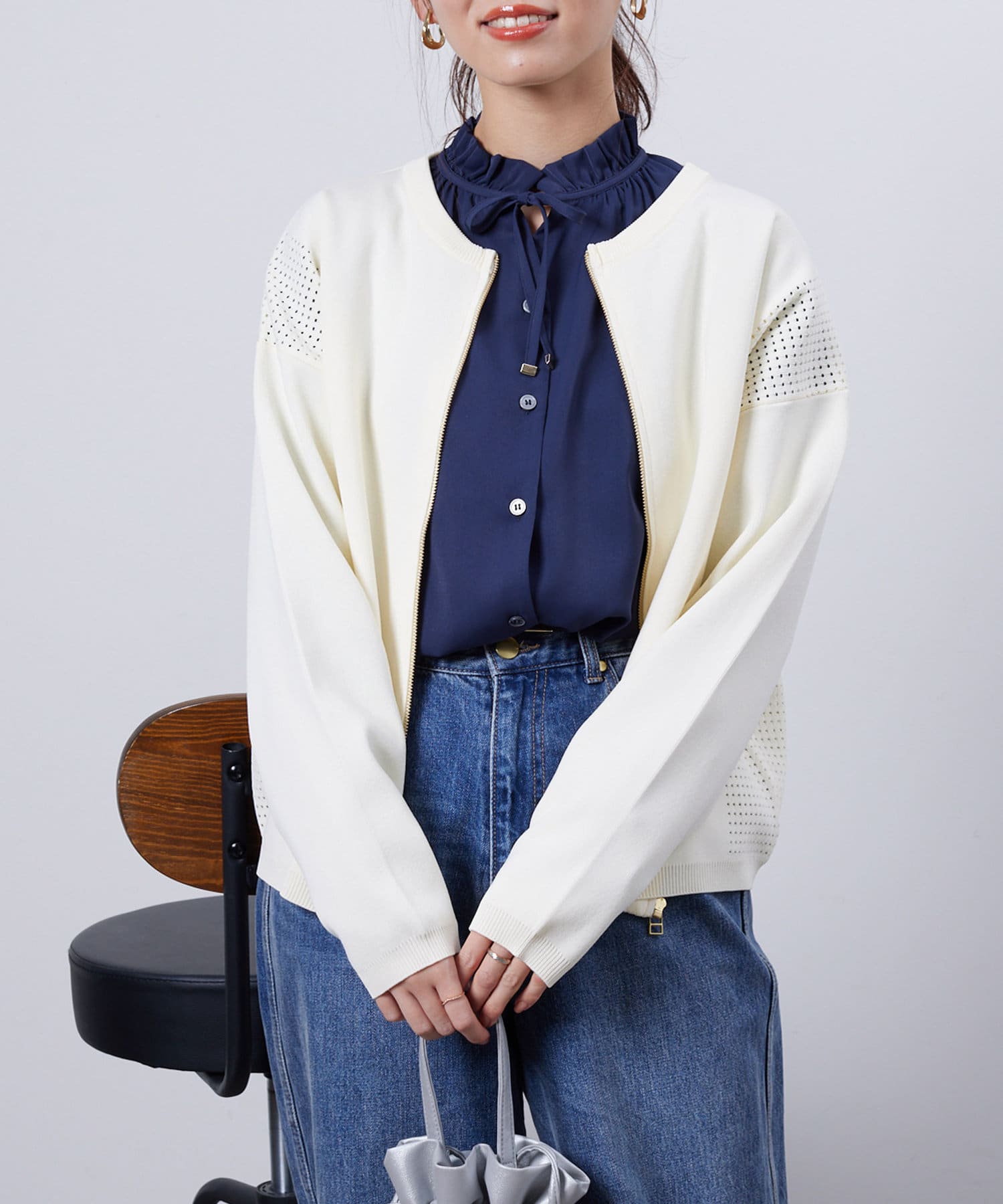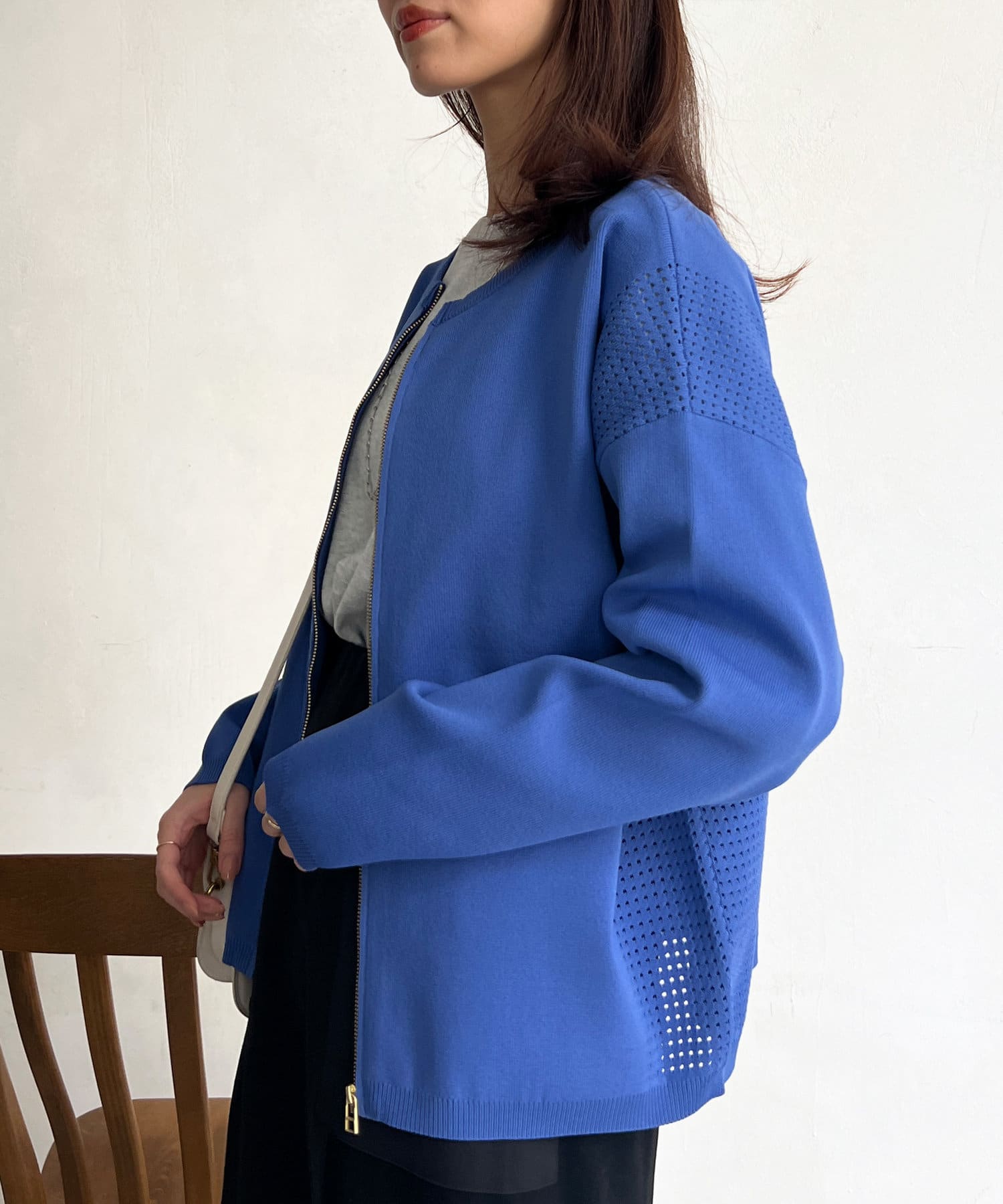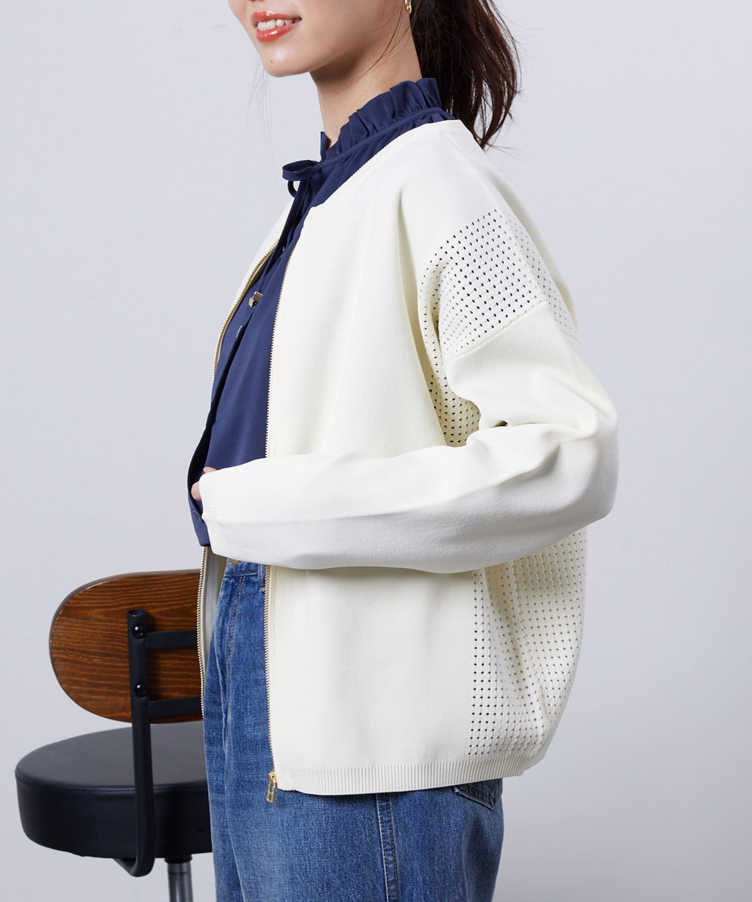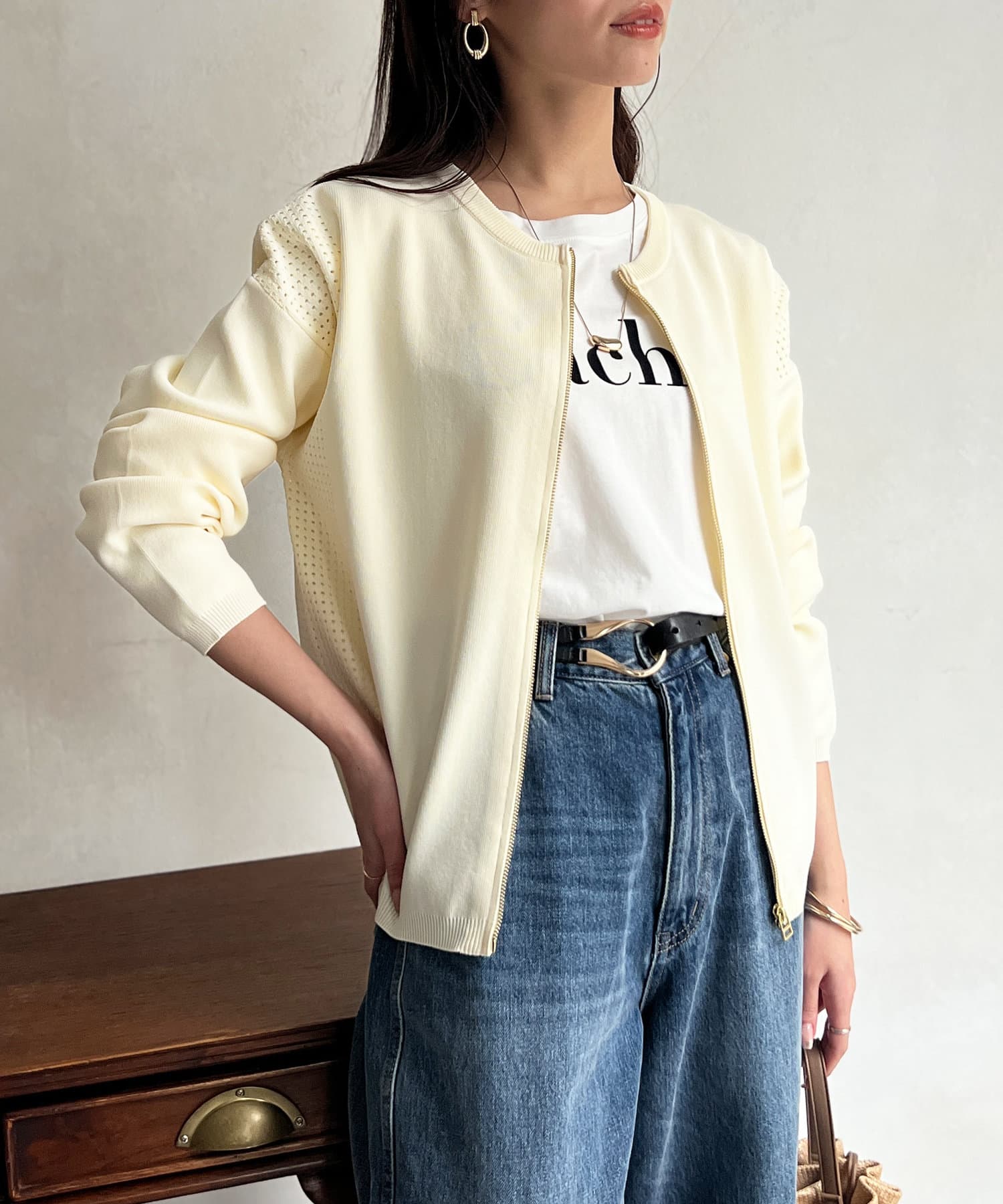 Chez toi(シェトワ) 軽量ニットアイレットジップカーディガン
