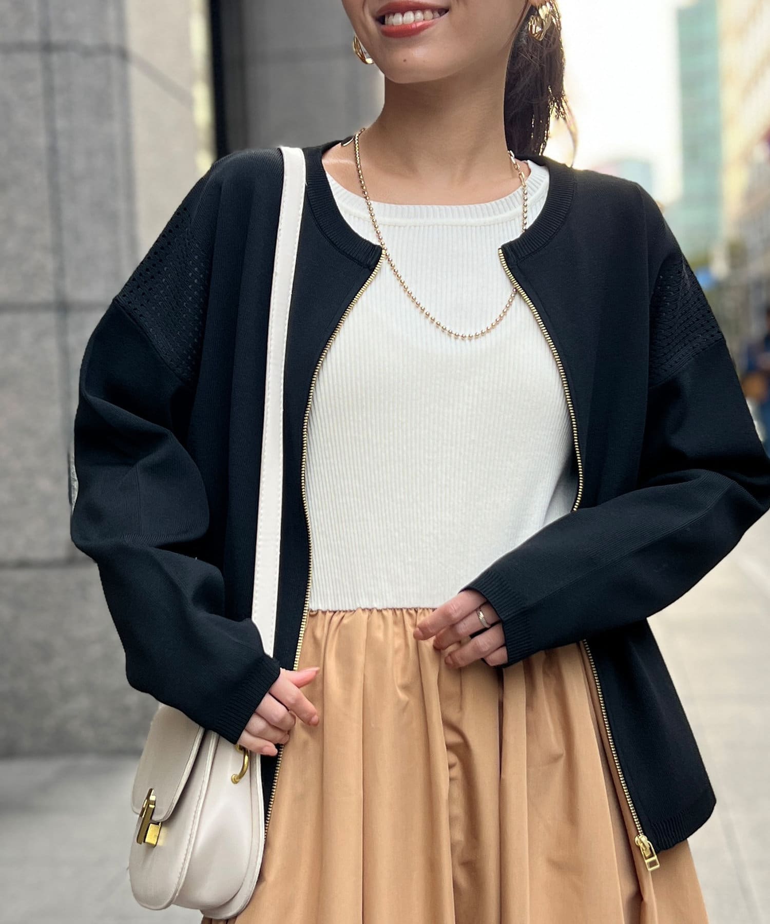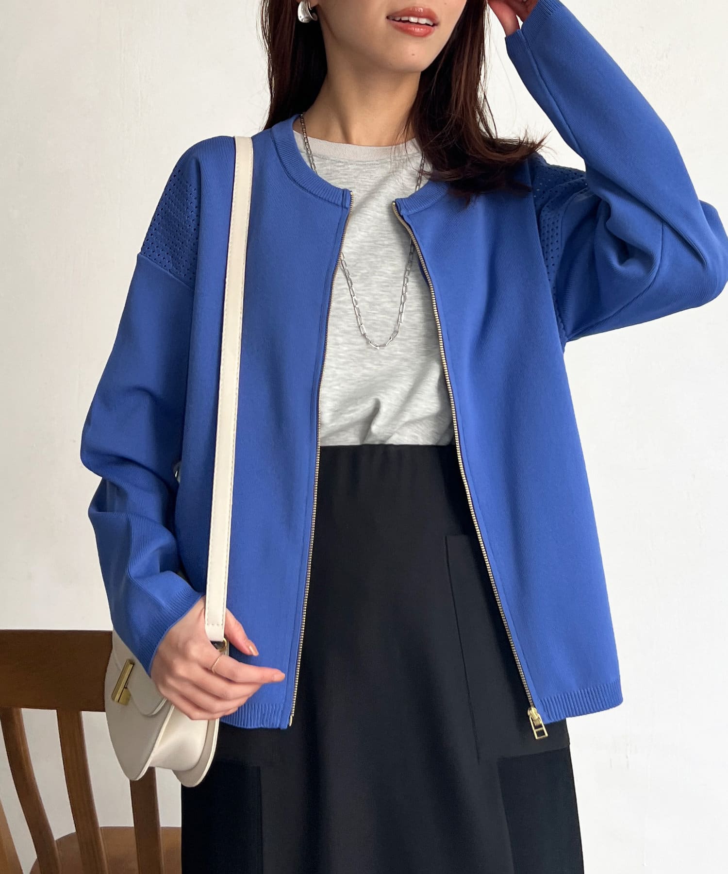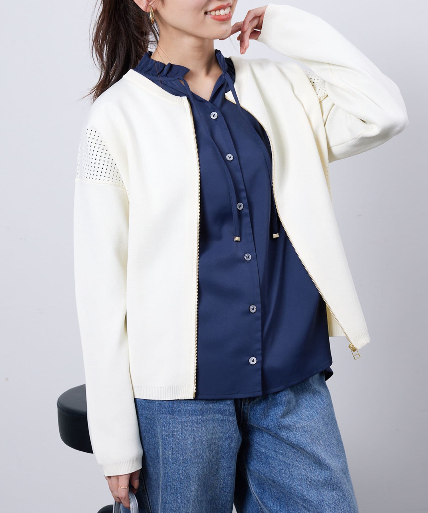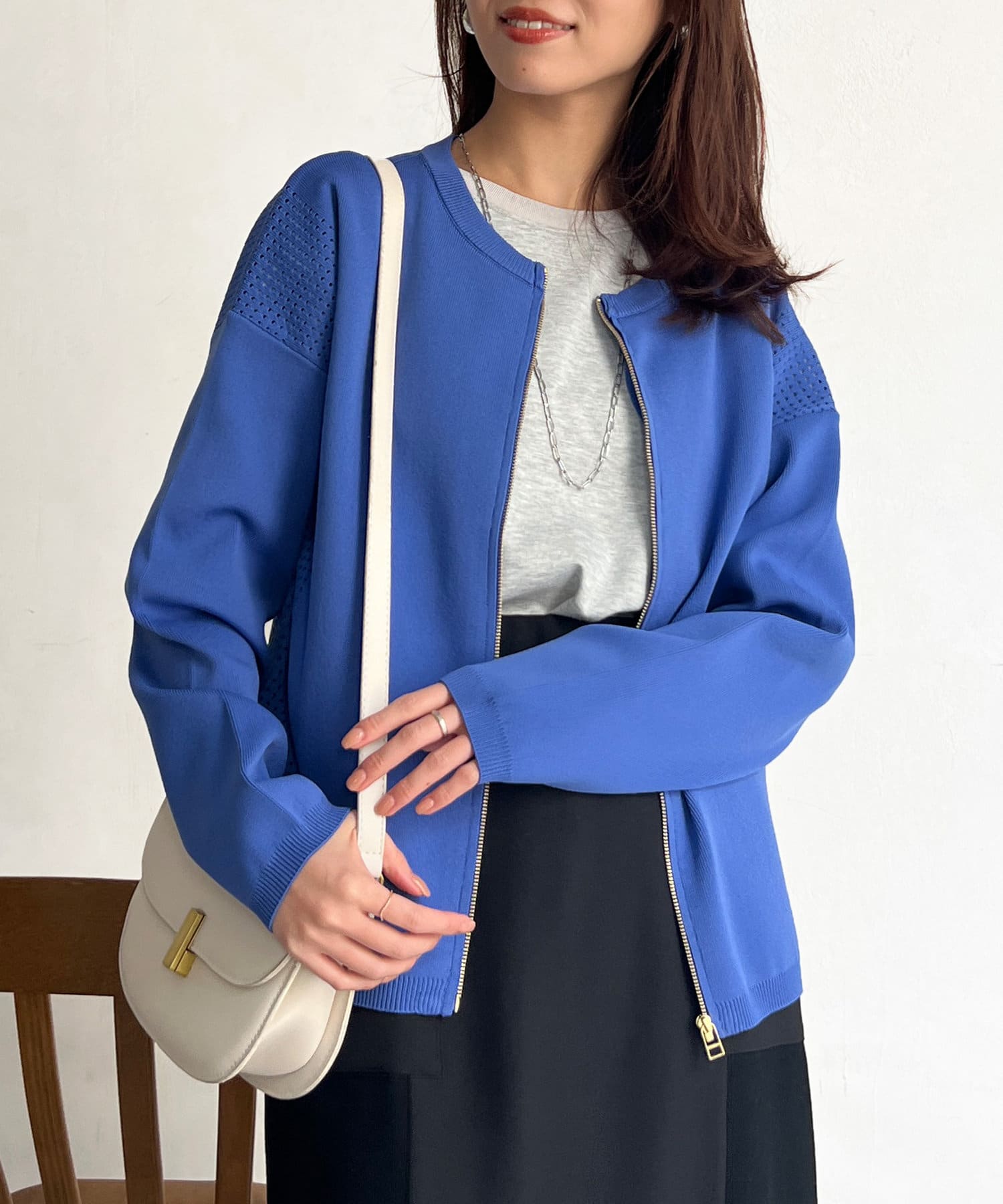 Chez toi(シェトワ) 軽量ニットアイレットジップカーディガン
