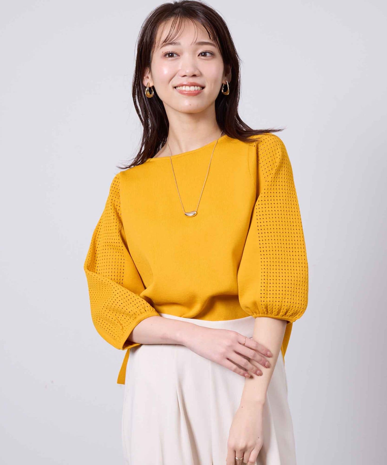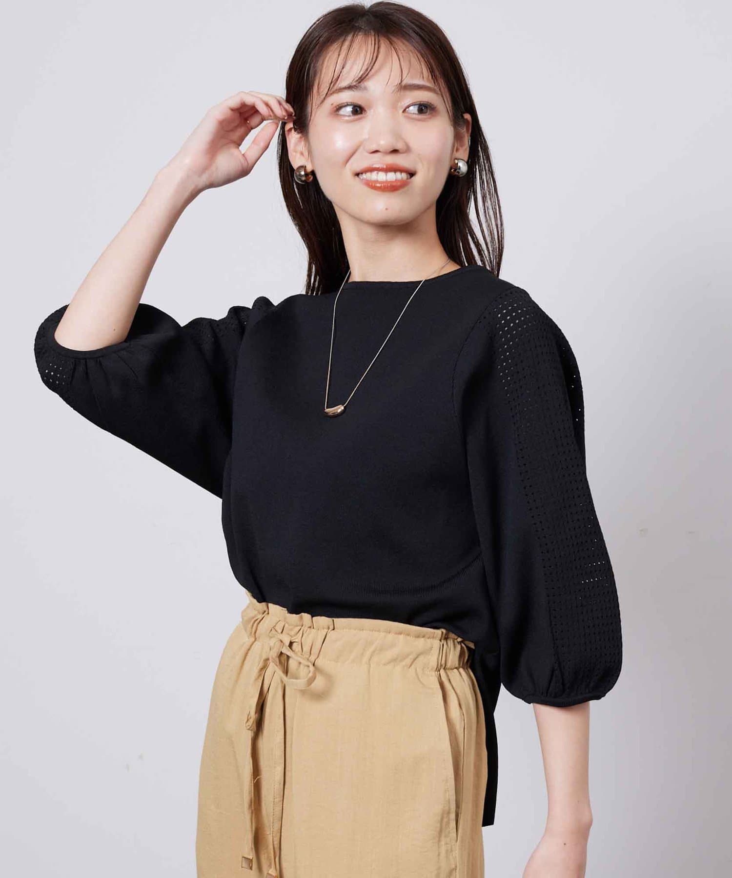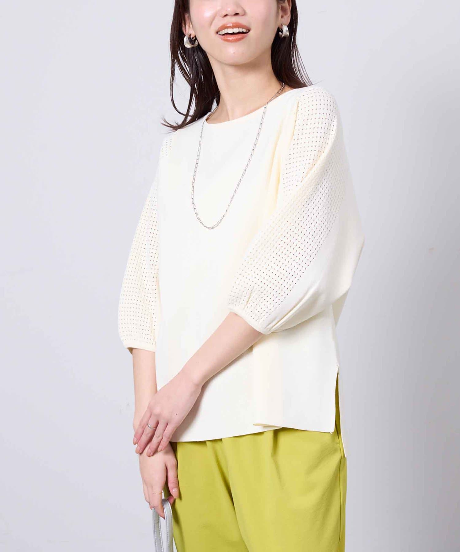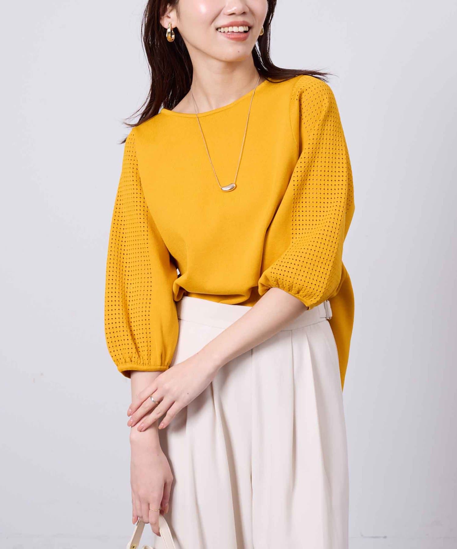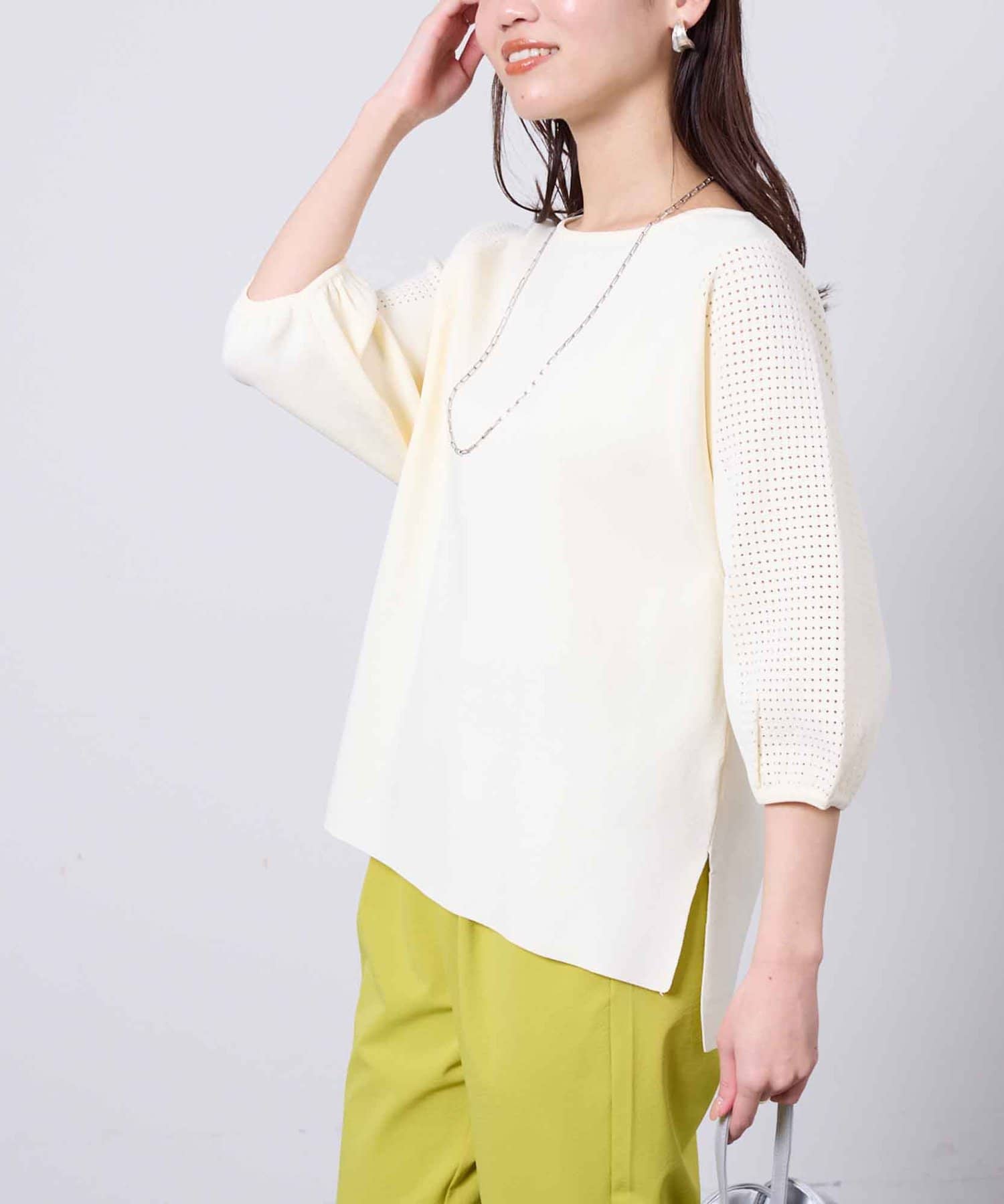 お袖の部分を透かし目模様のアイレットを施し、大人可愛いニット。