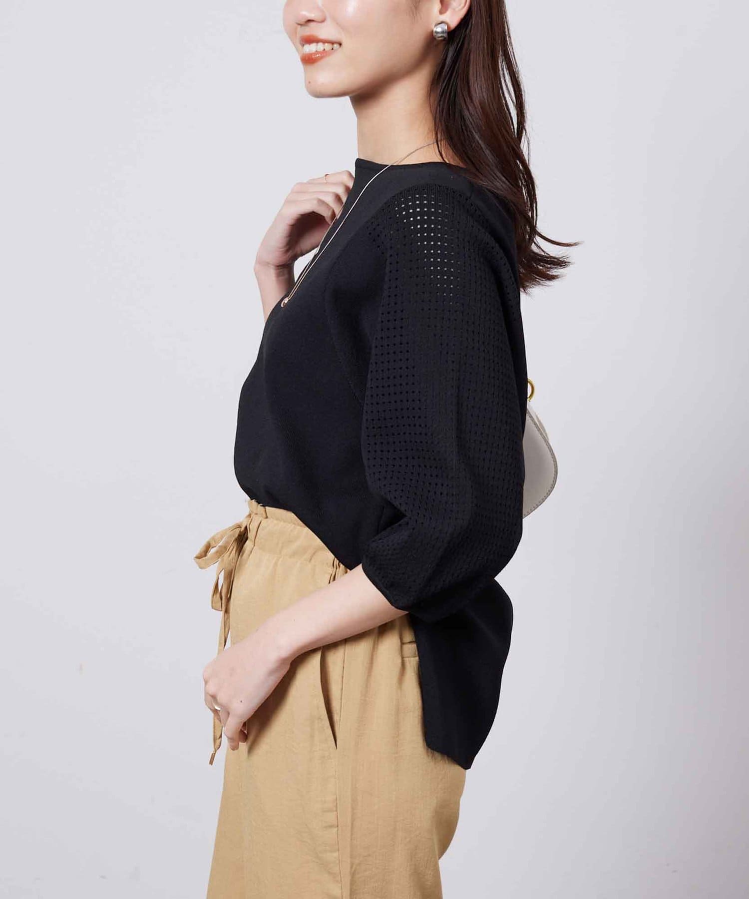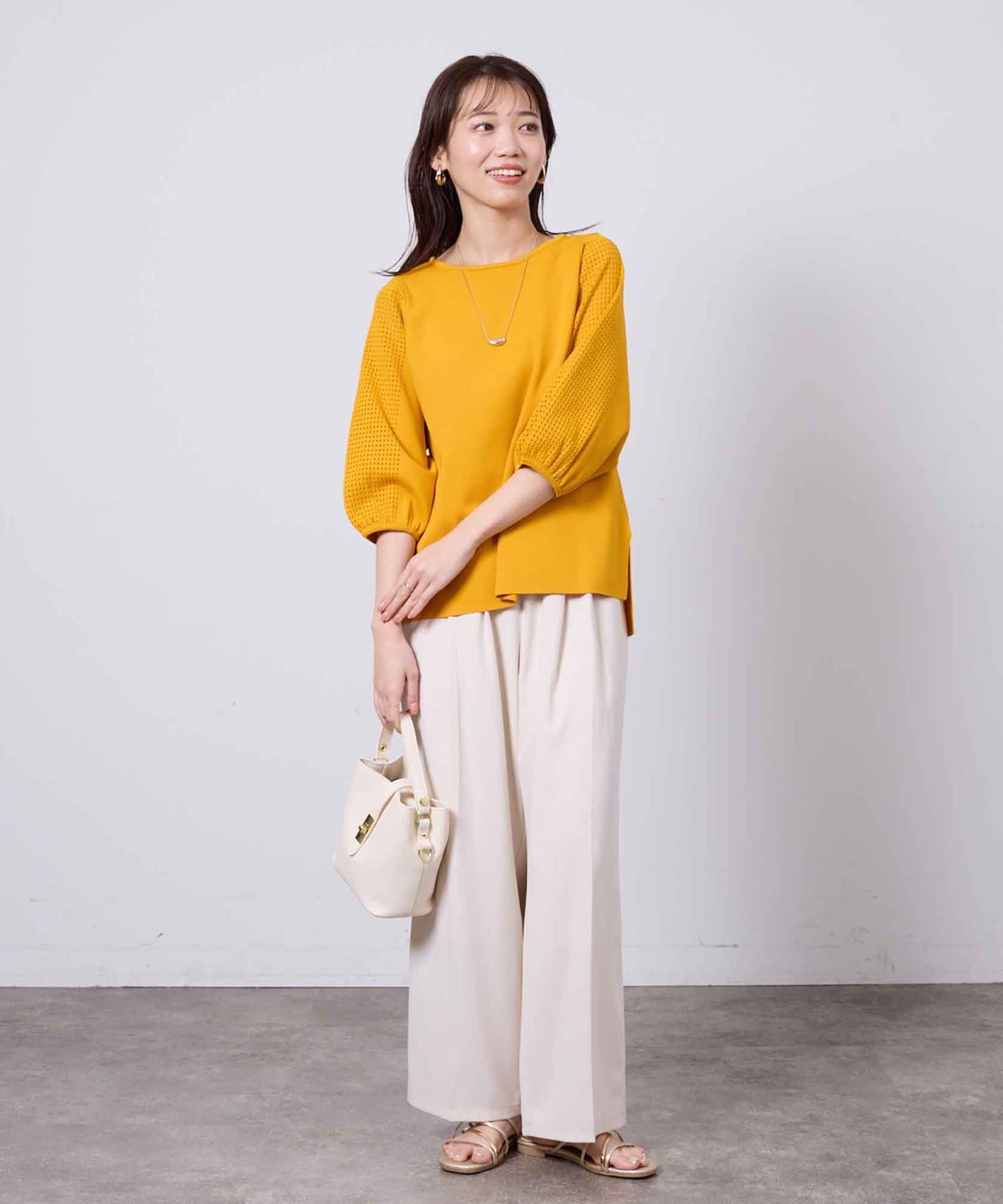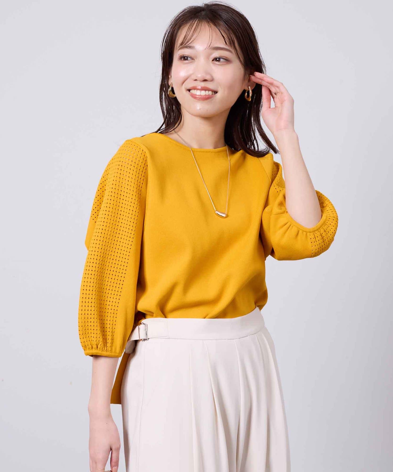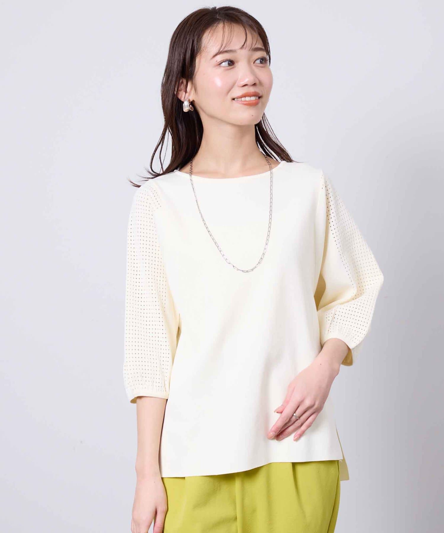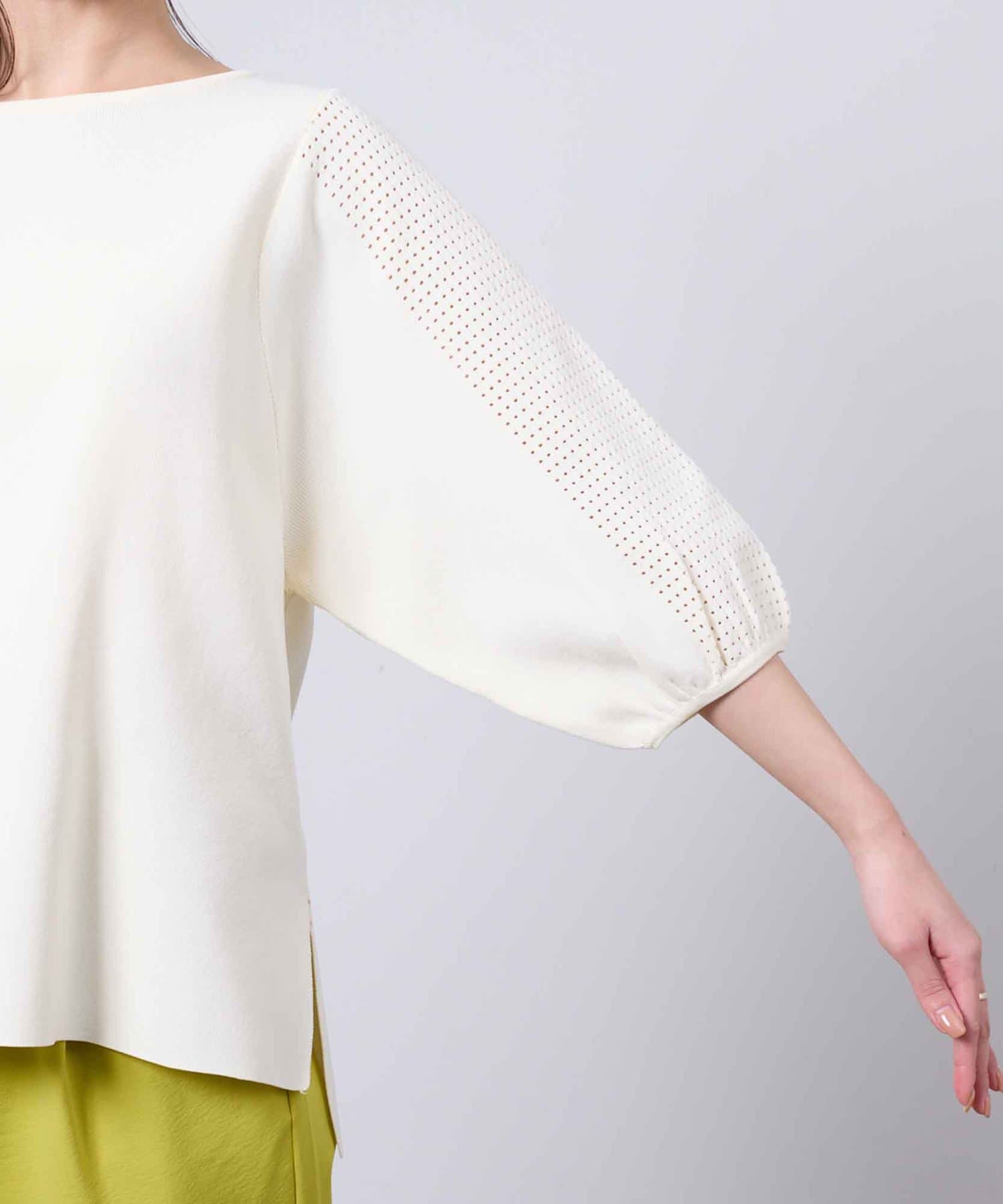 お袖の部分を透かし目模様のアイレットを施し、大人可愛いニット。