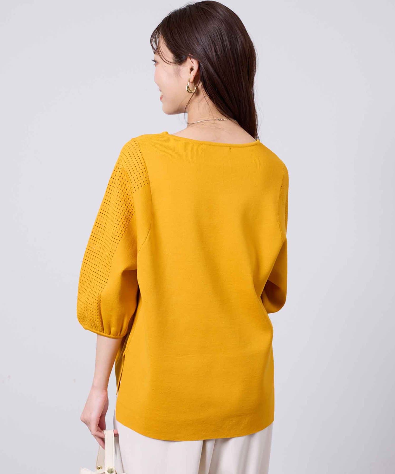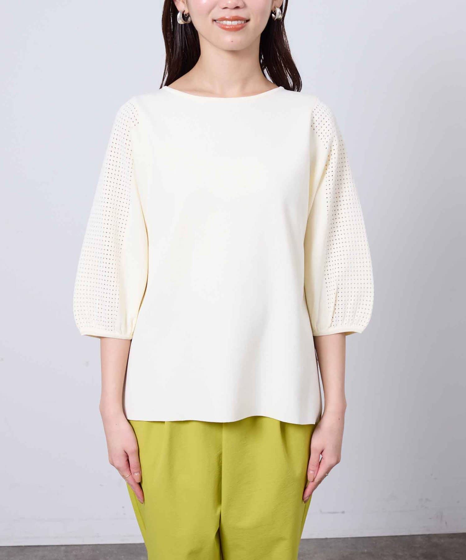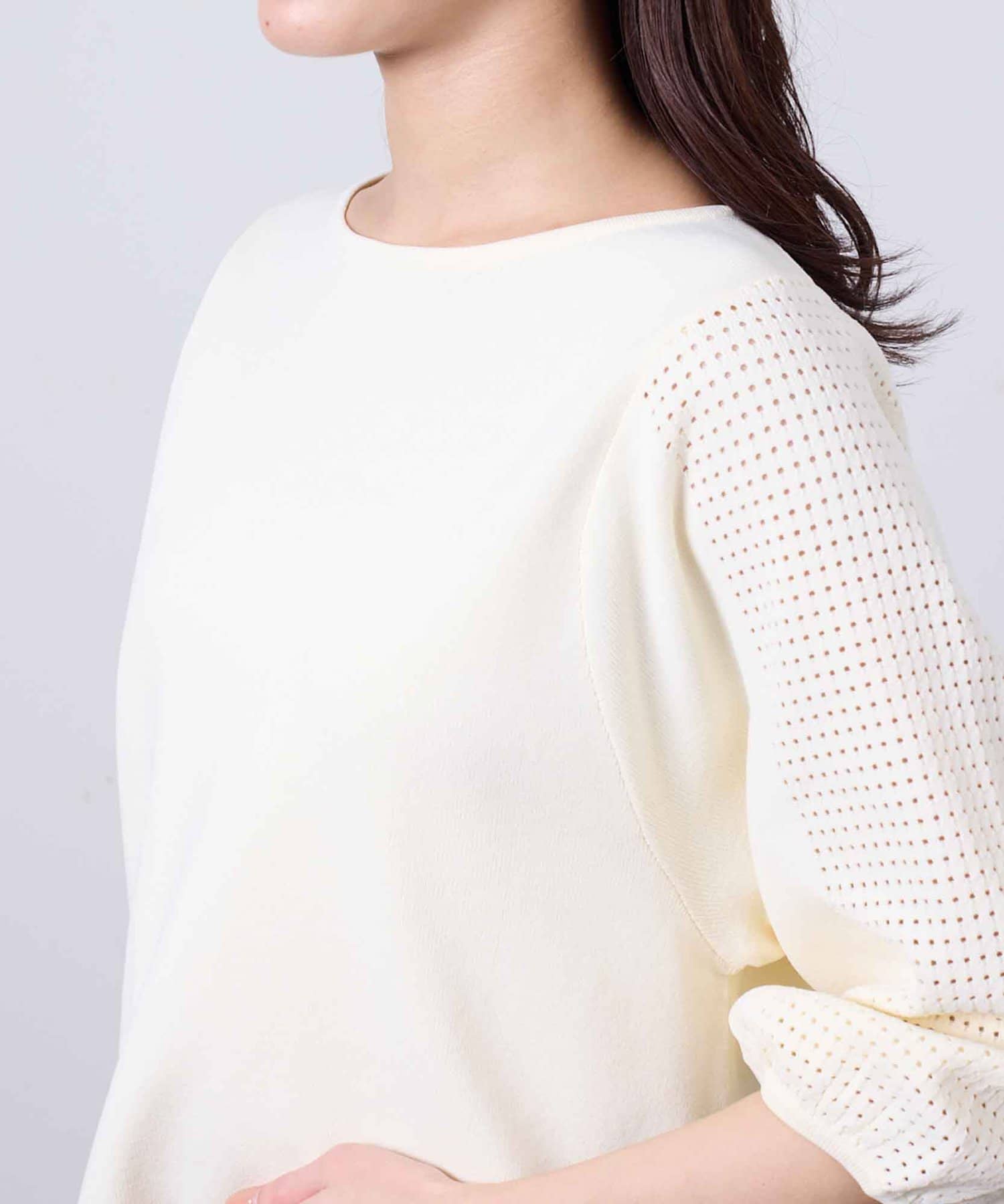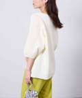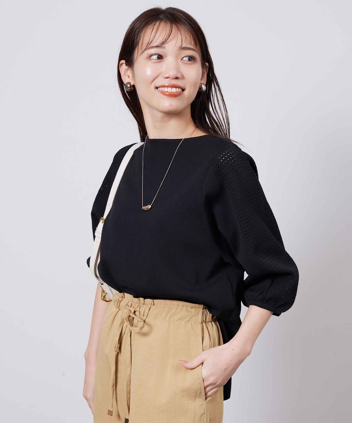 お袖の部分を透かし目模様のアイレットを施し、大人可愛いニット。