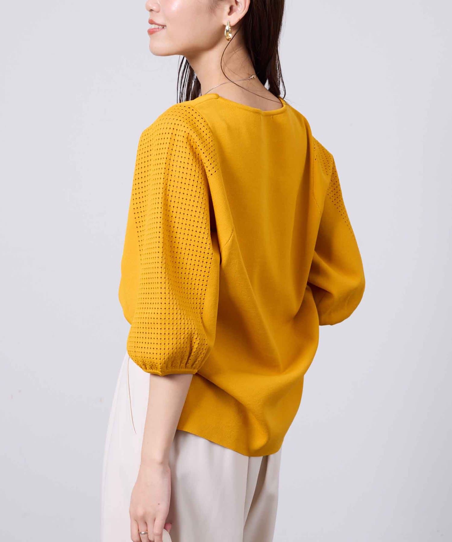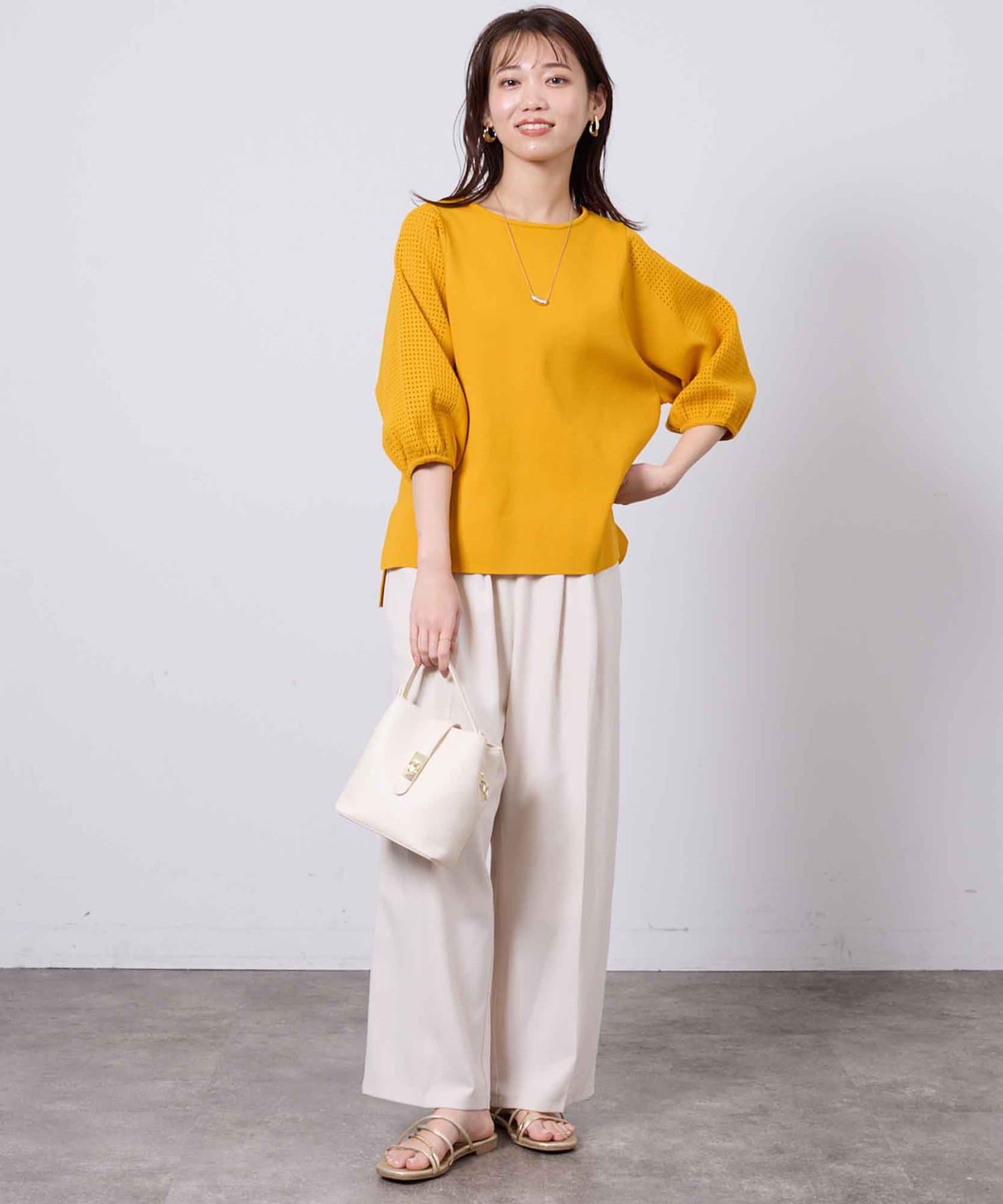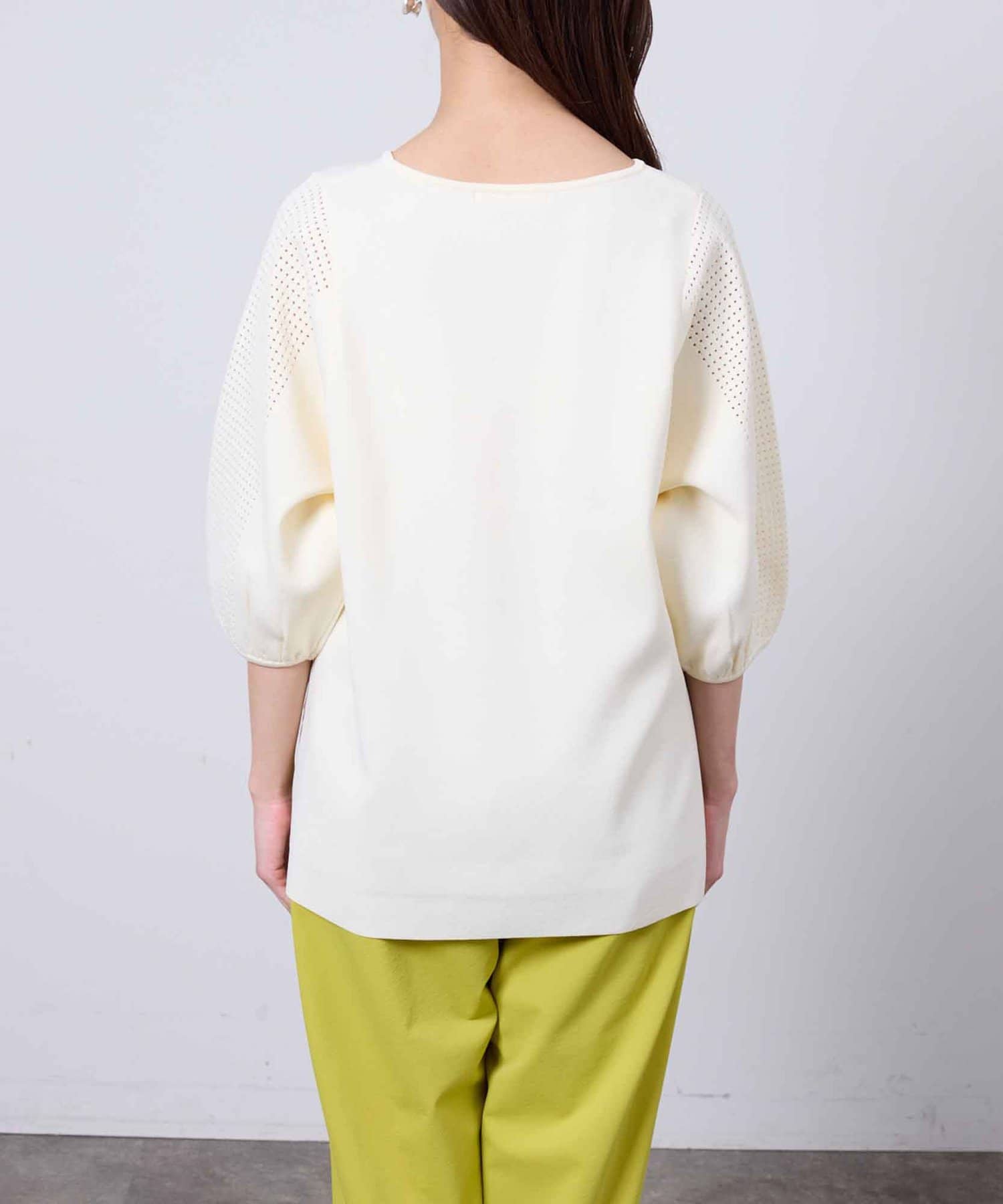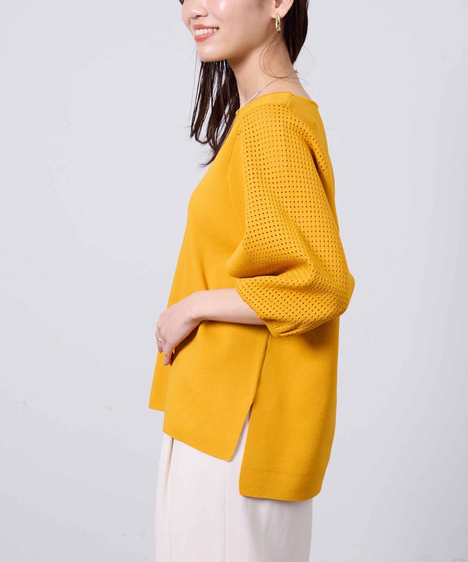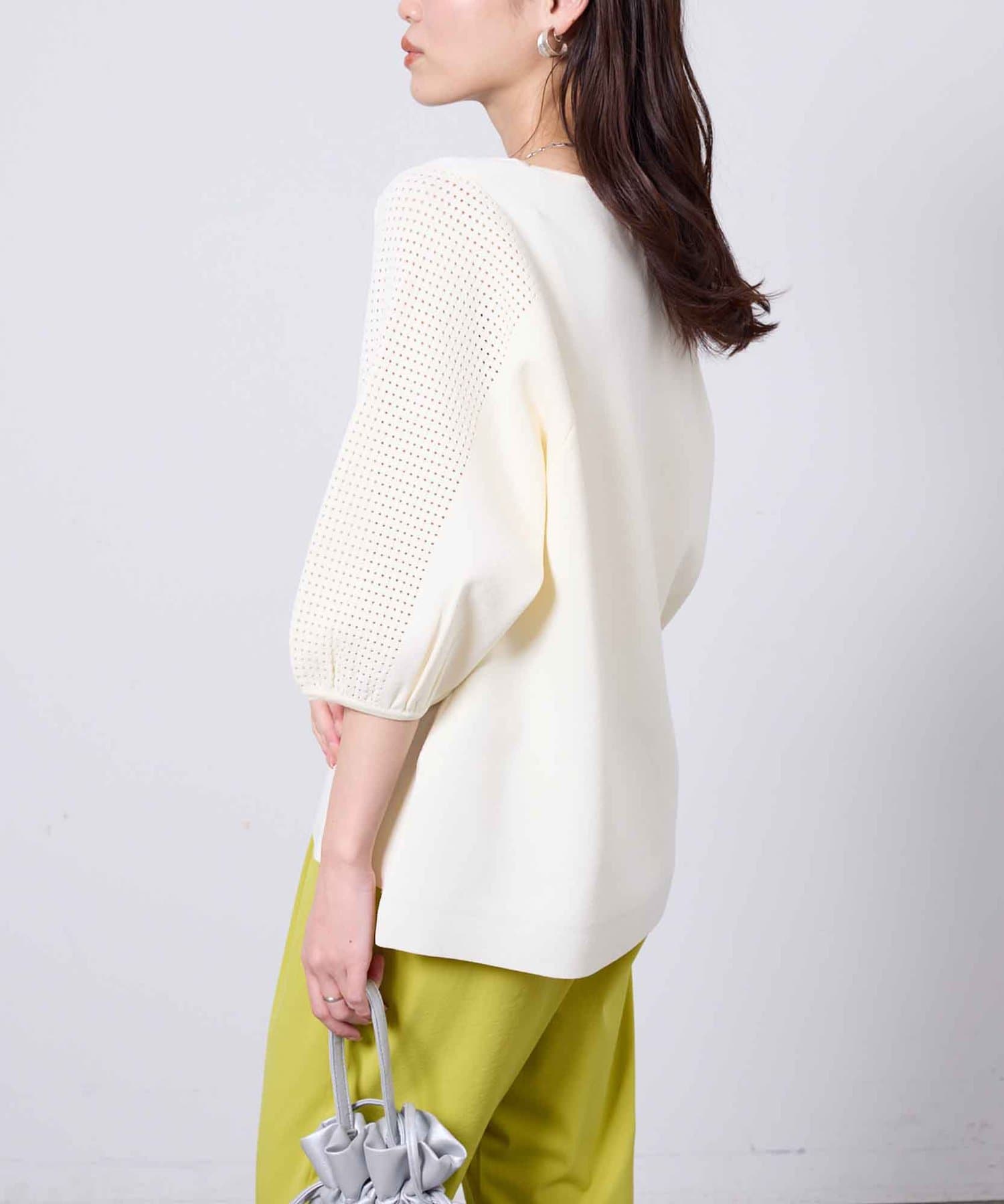 お袖の部分を透かし目模様のアイレットを施し、大人可愛いニット。