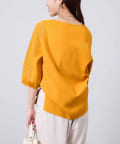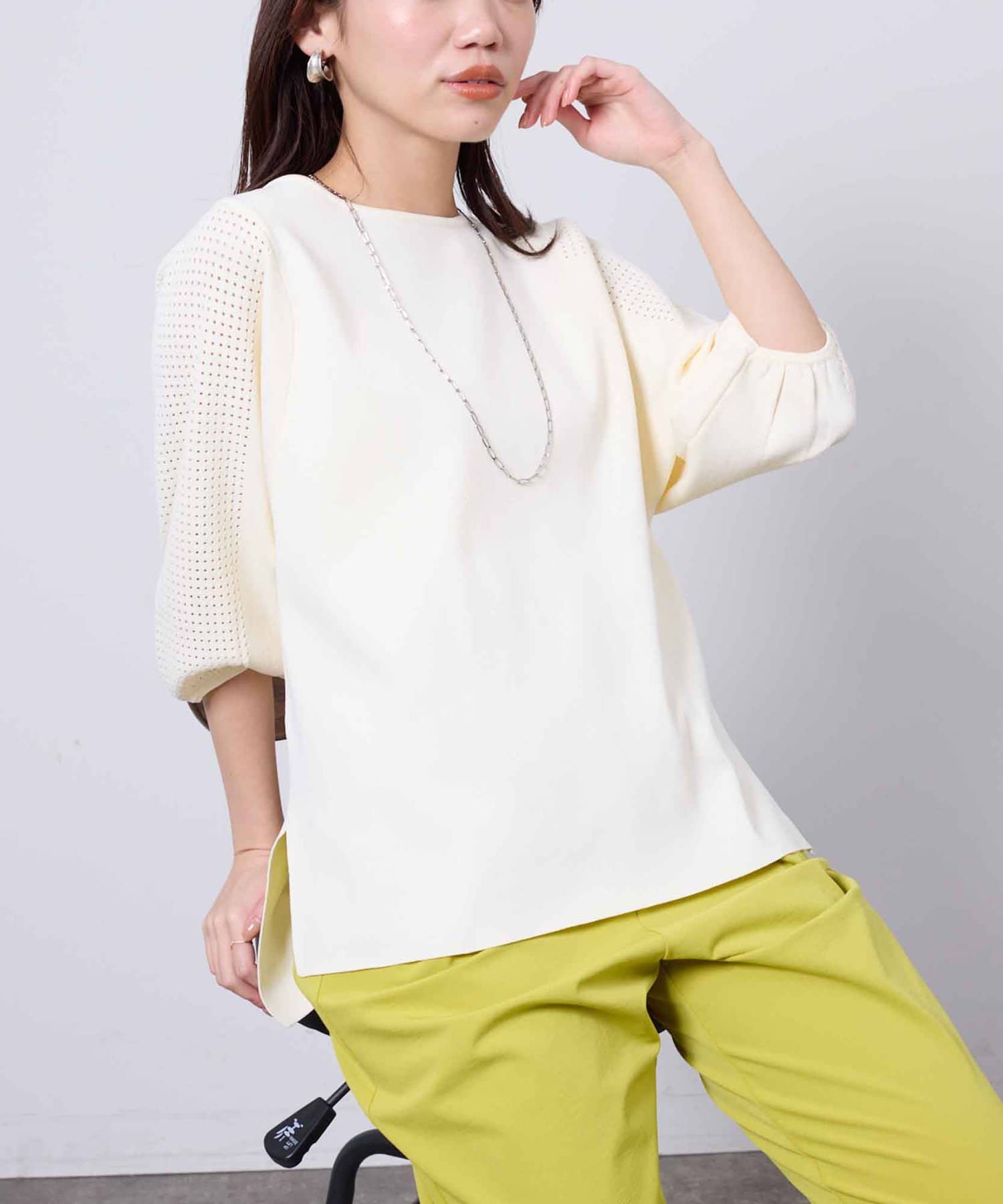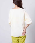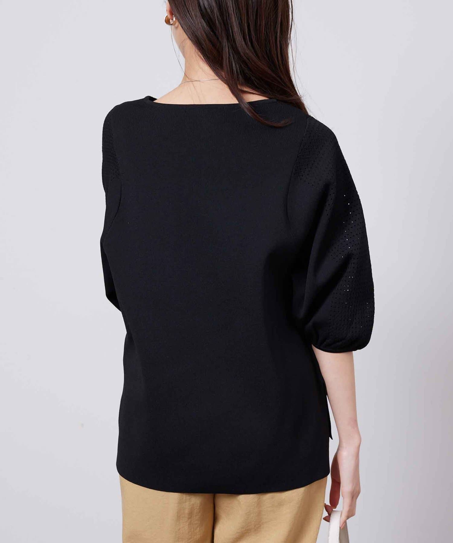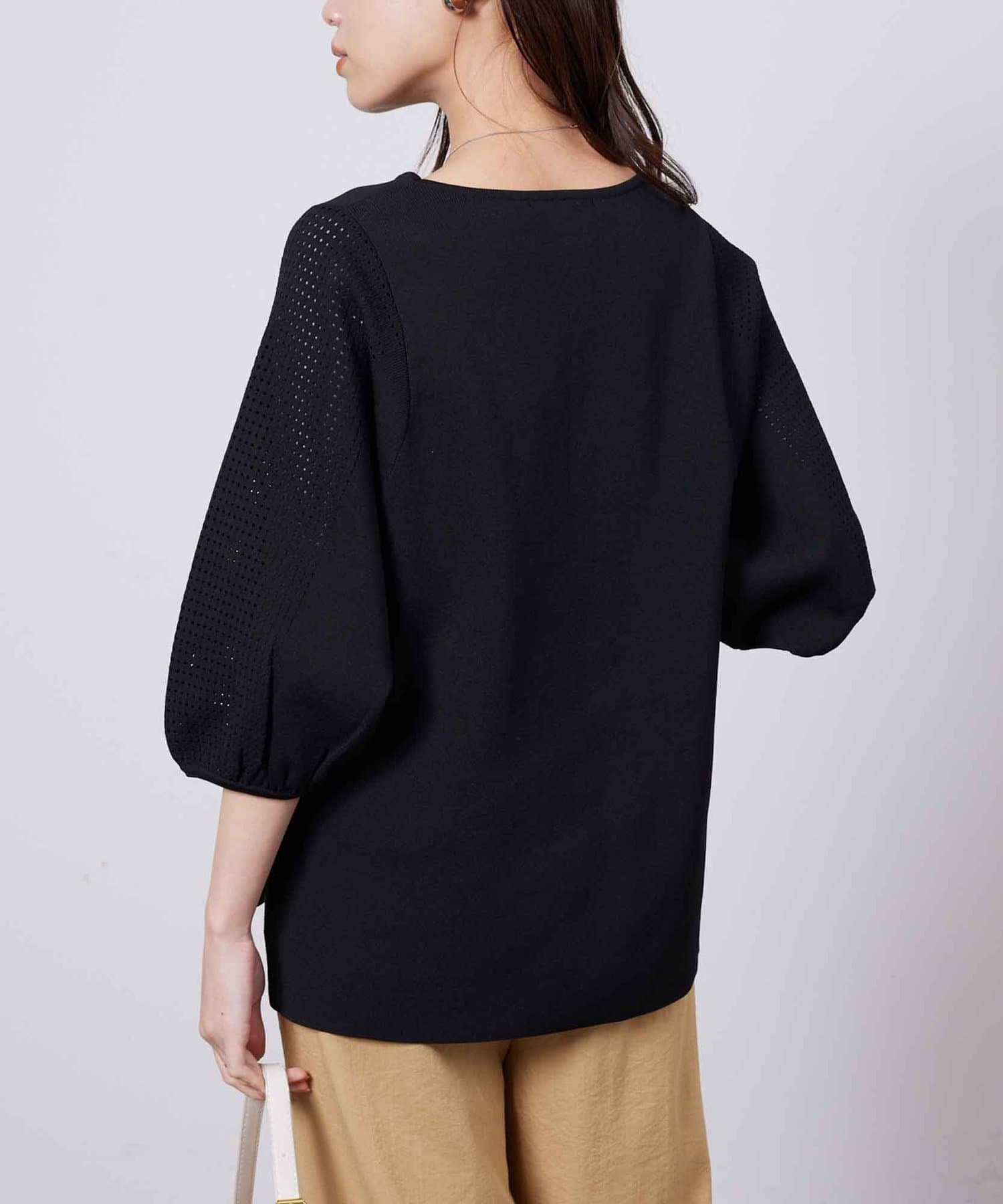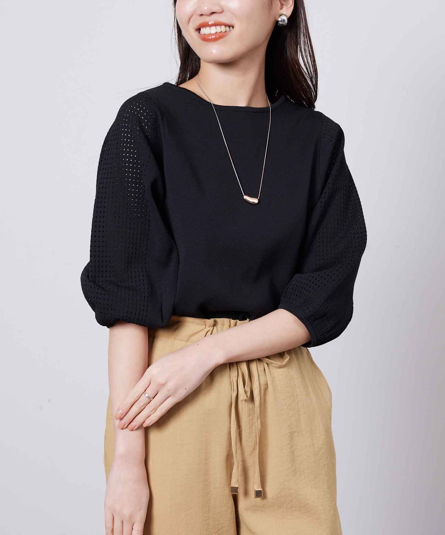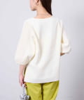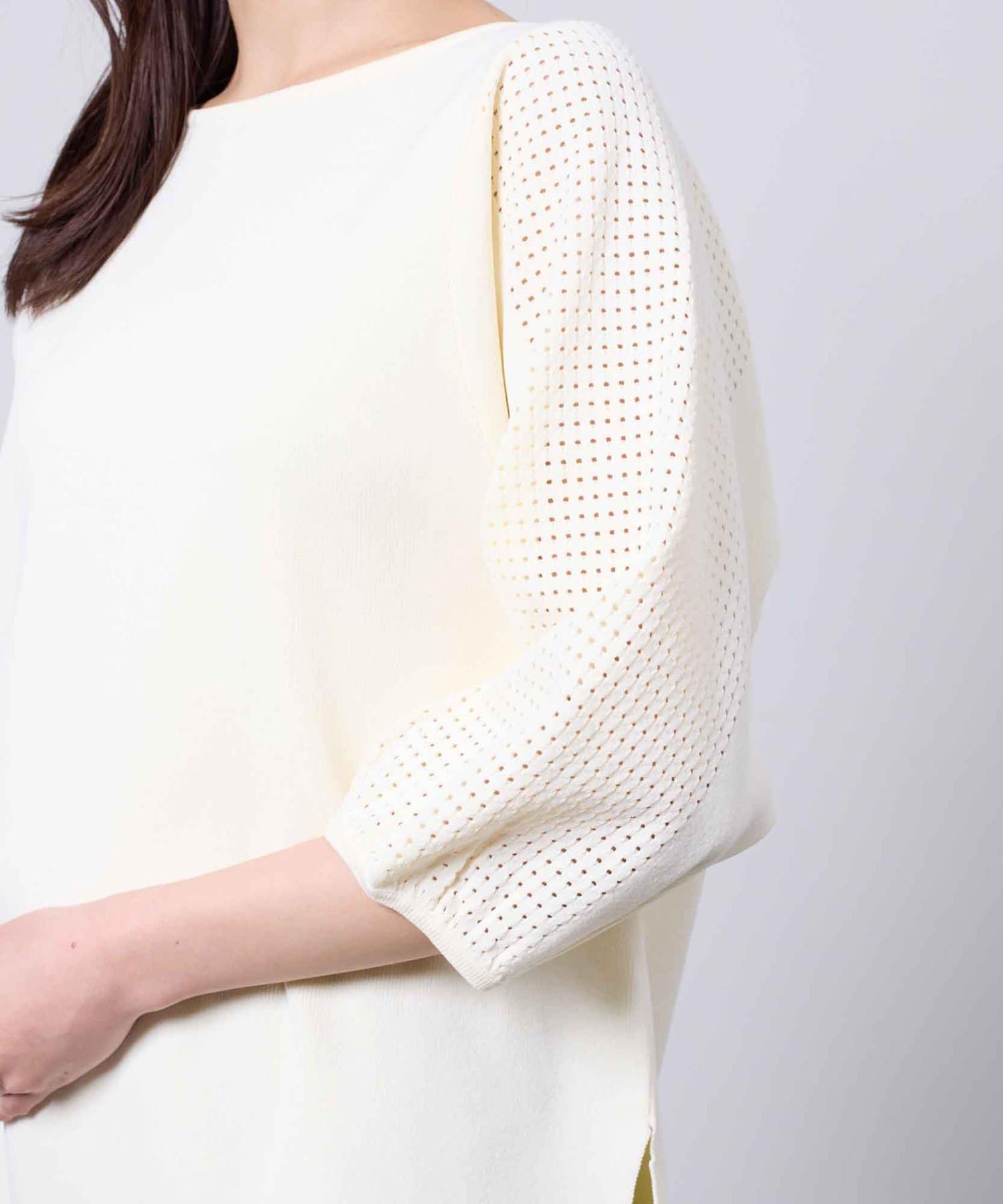 お袖の部分を透かし目模様のアイレットを施し、大人可愛いニット。