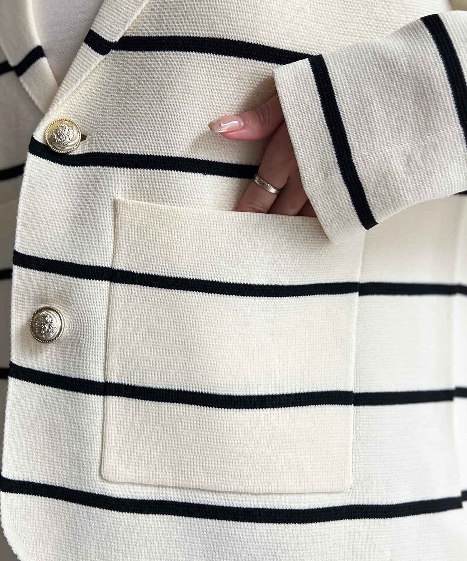 ゴールドボタンがアクセントになった大人のテーラードジャケット。