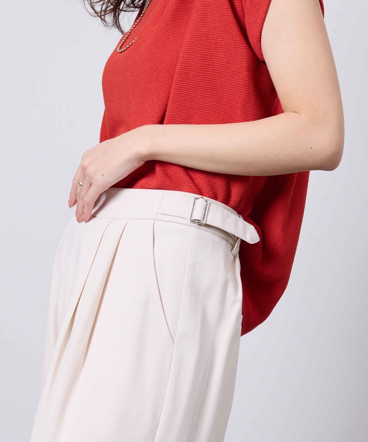 サイドにベルトが付いており調節も可能。またベルトがコーデの