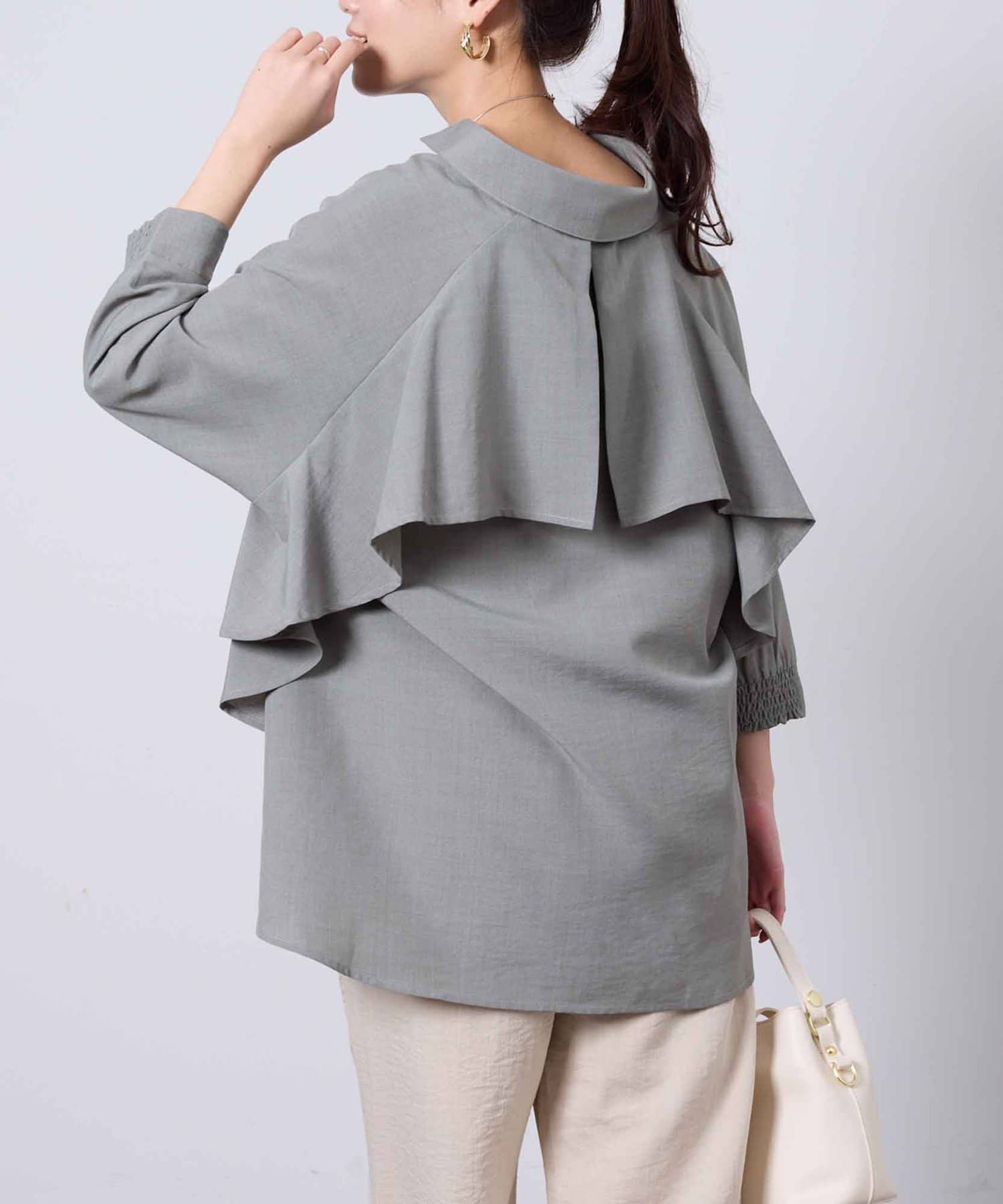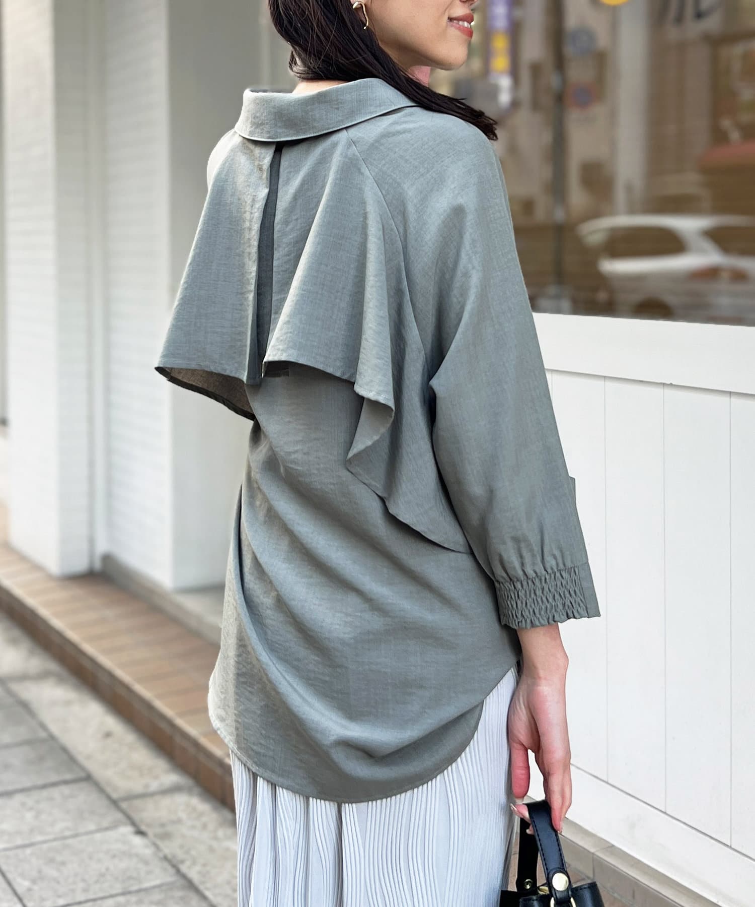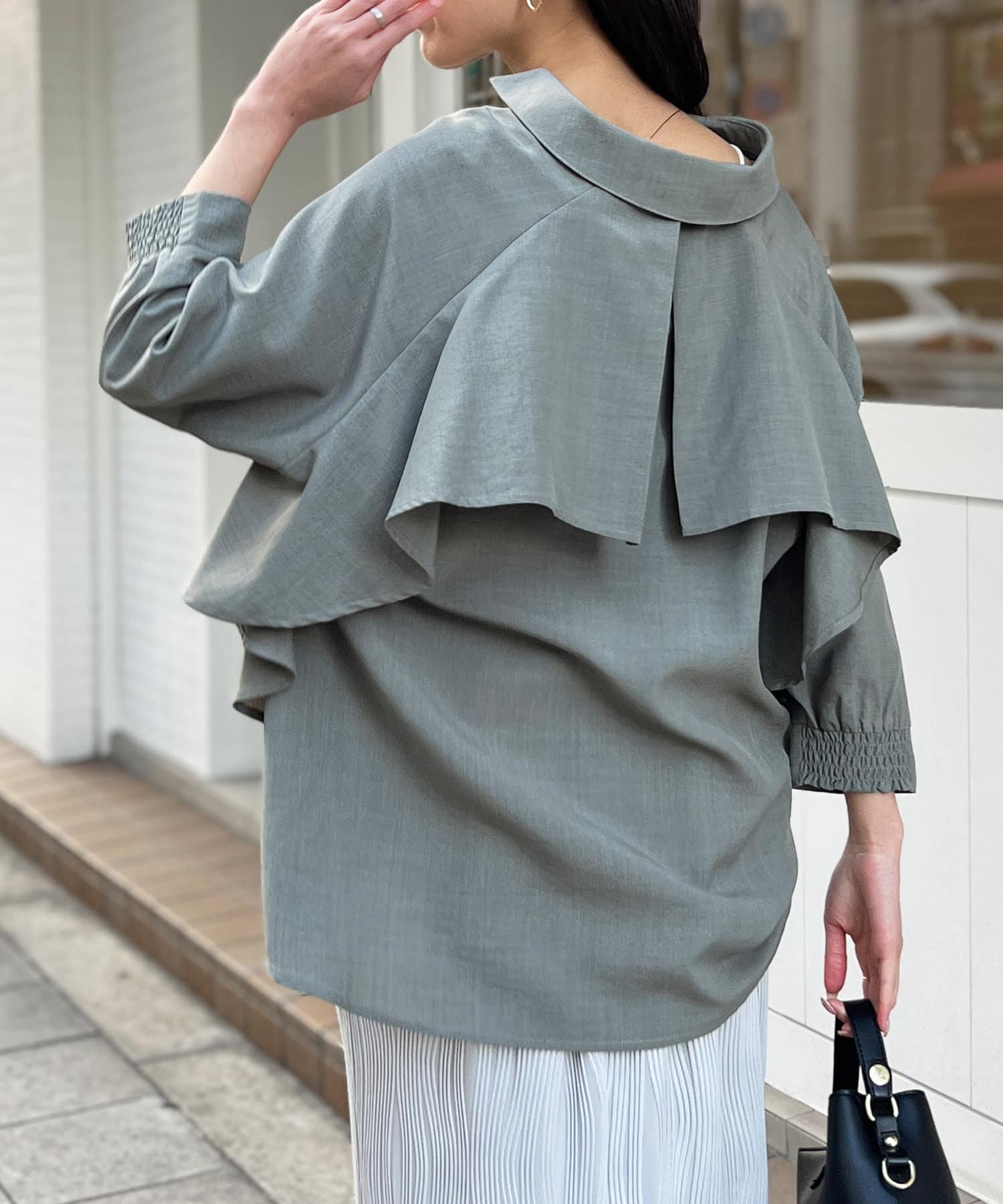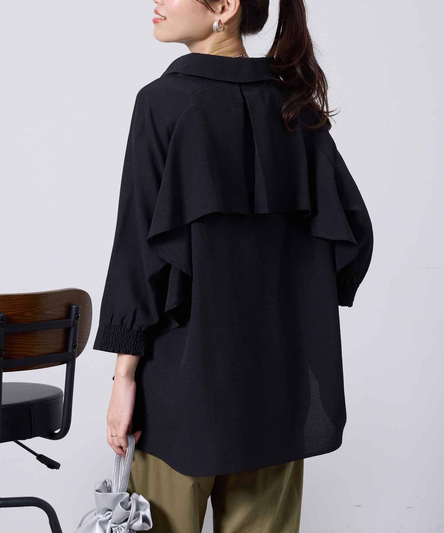 後ヨーク部分がフリルになっているデザインなので、ふんわりと広がるシルエットが大人可愛い印象に仕上げてくれます。