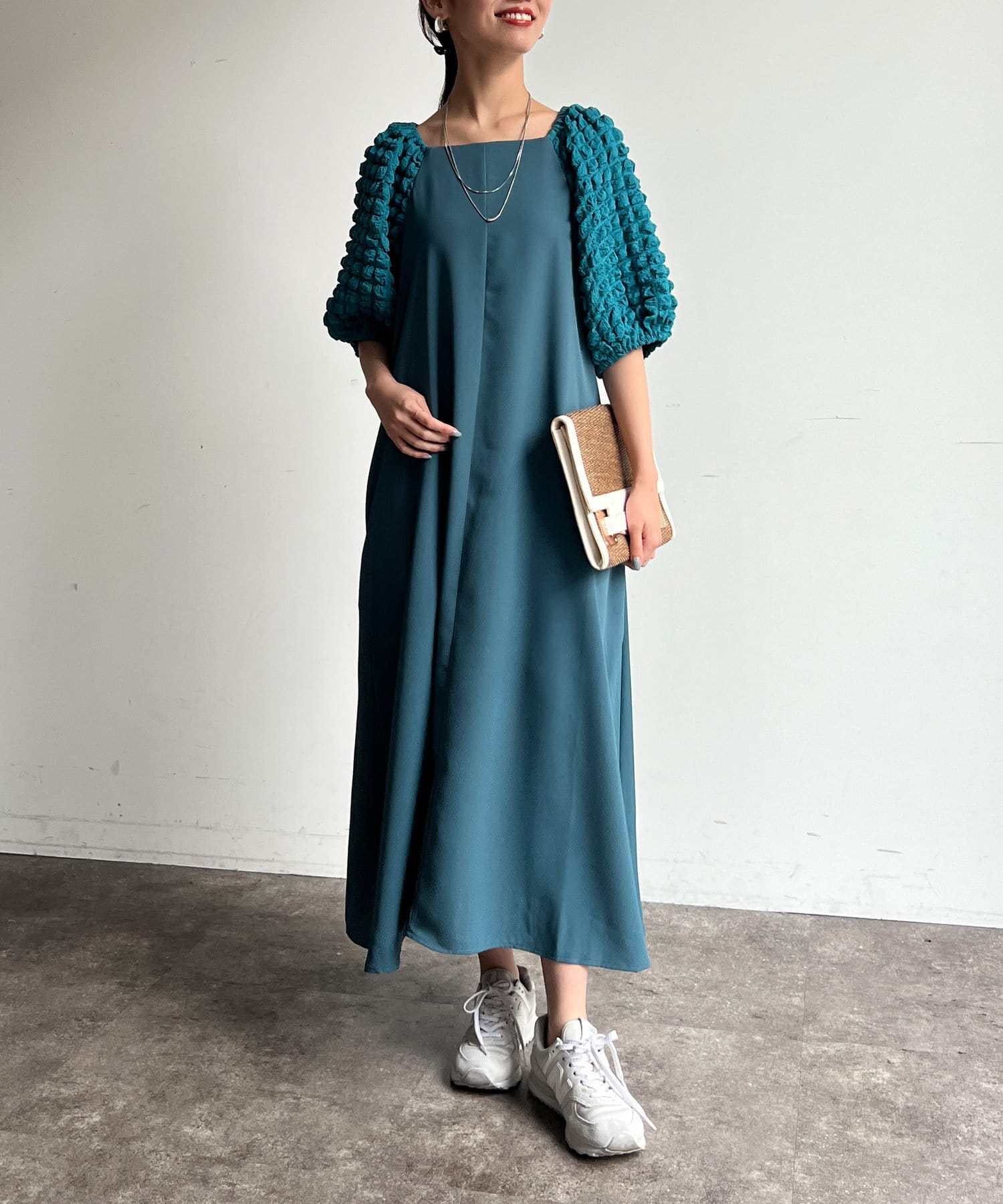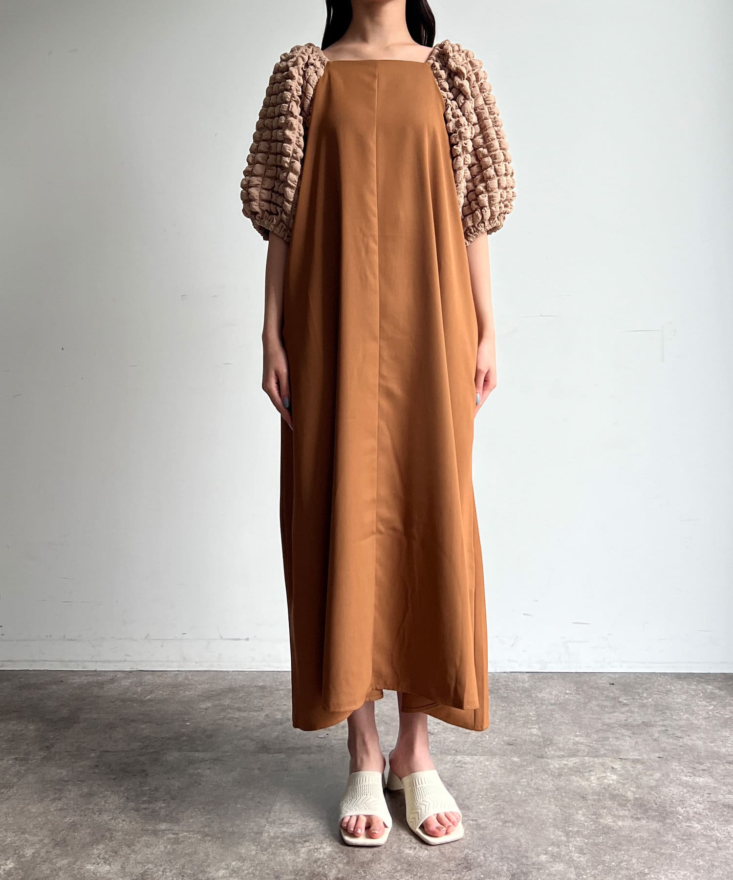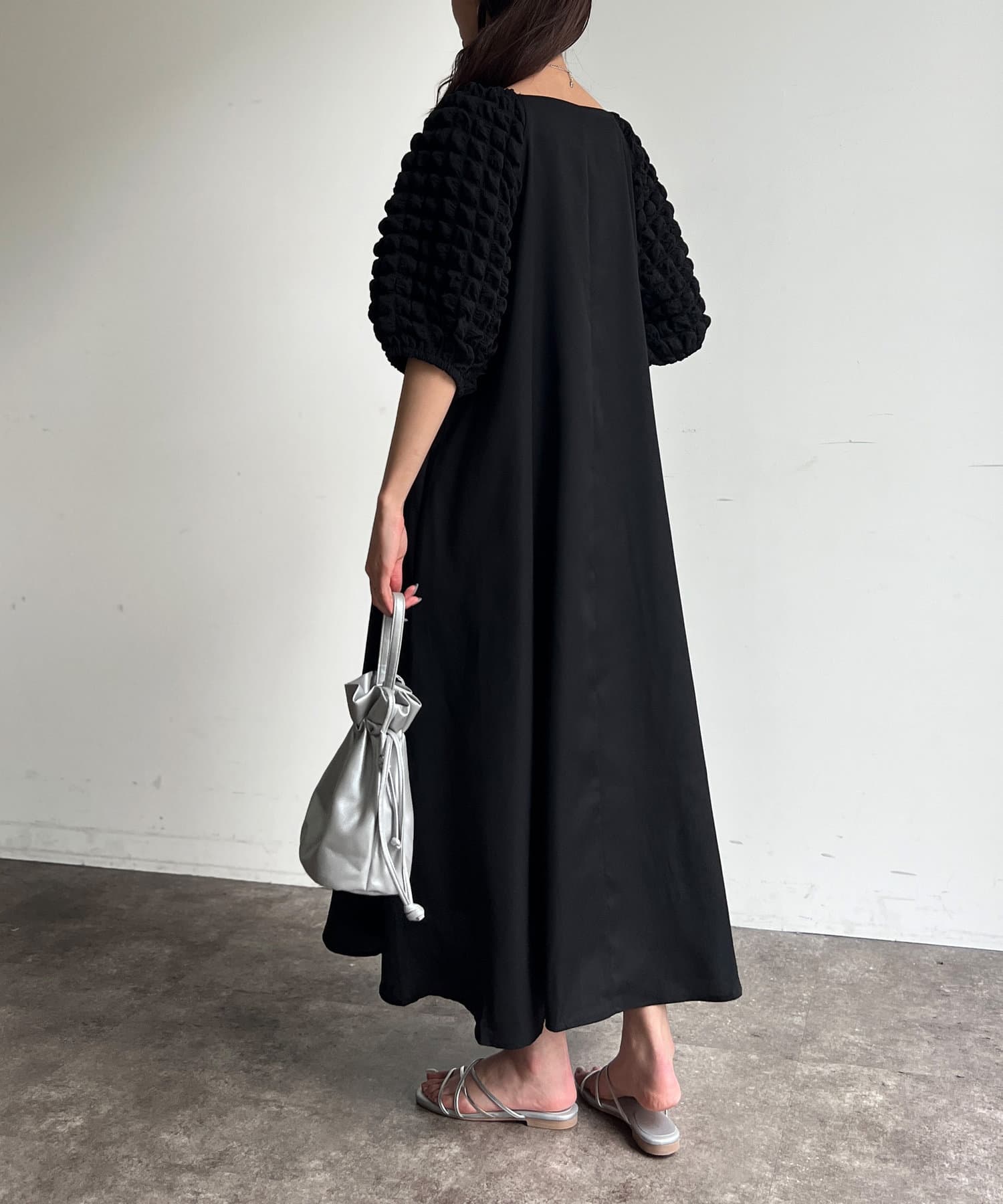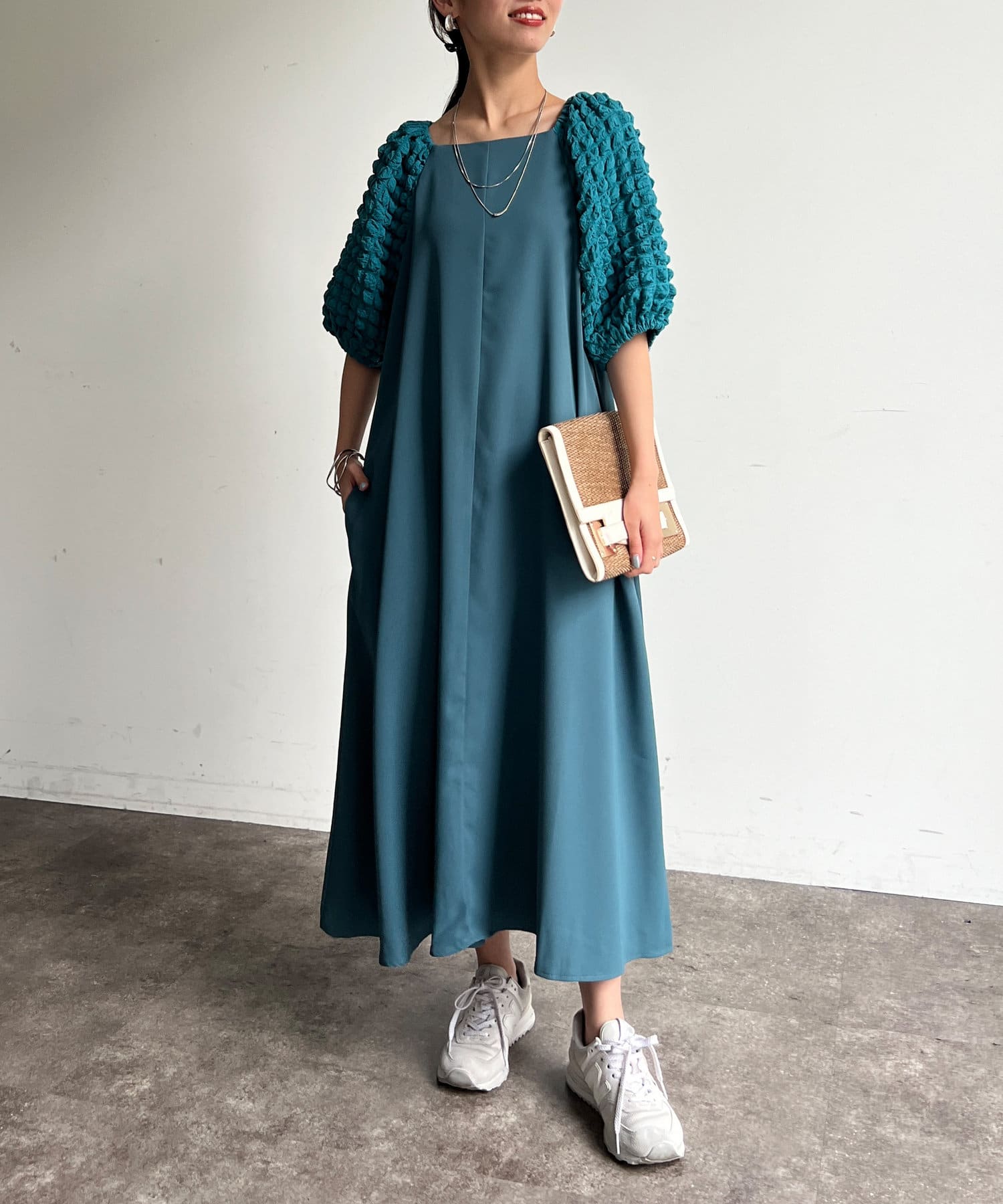 ぽこぽことしたお袖が大人可愛い印象のワンピース。