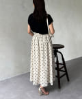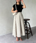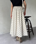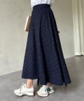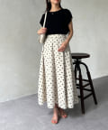 裾に向かってフレアに広がり、またドット柄でカジュアル過ぎず