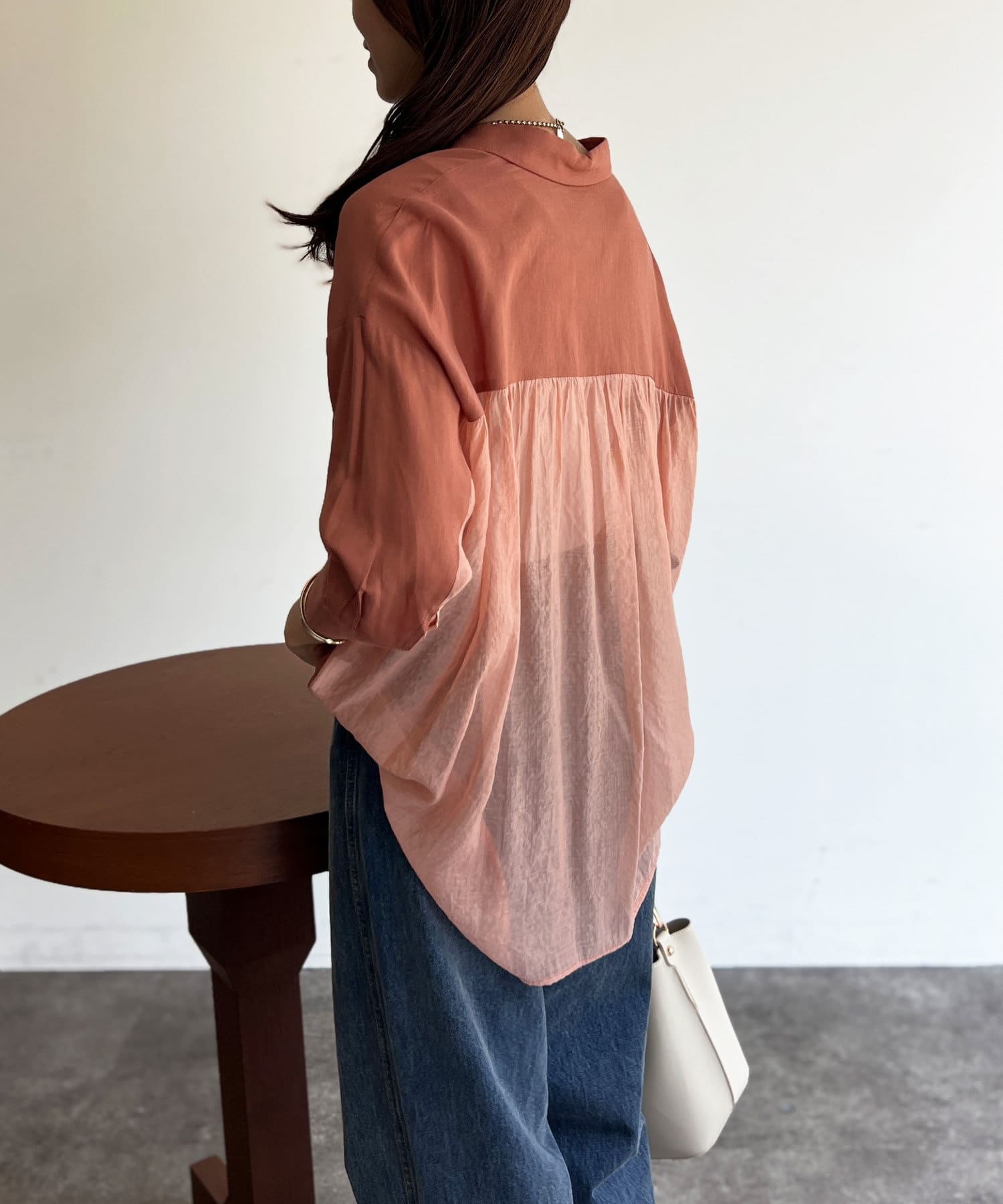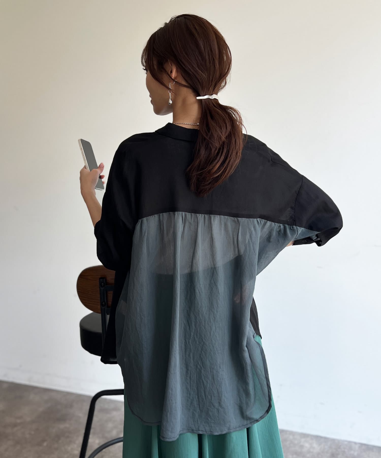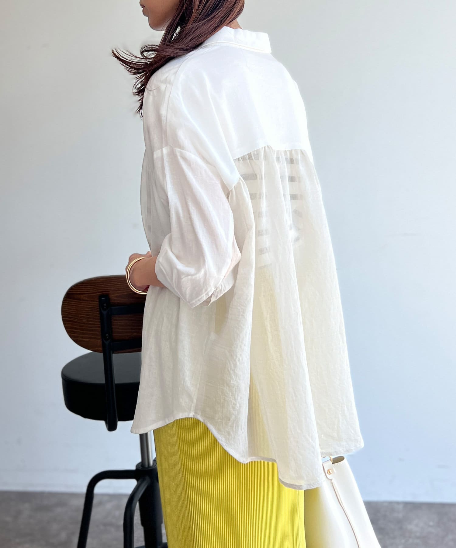 程よいシアー感が大人カジュアルなシャツ。後ろはバイカラーで