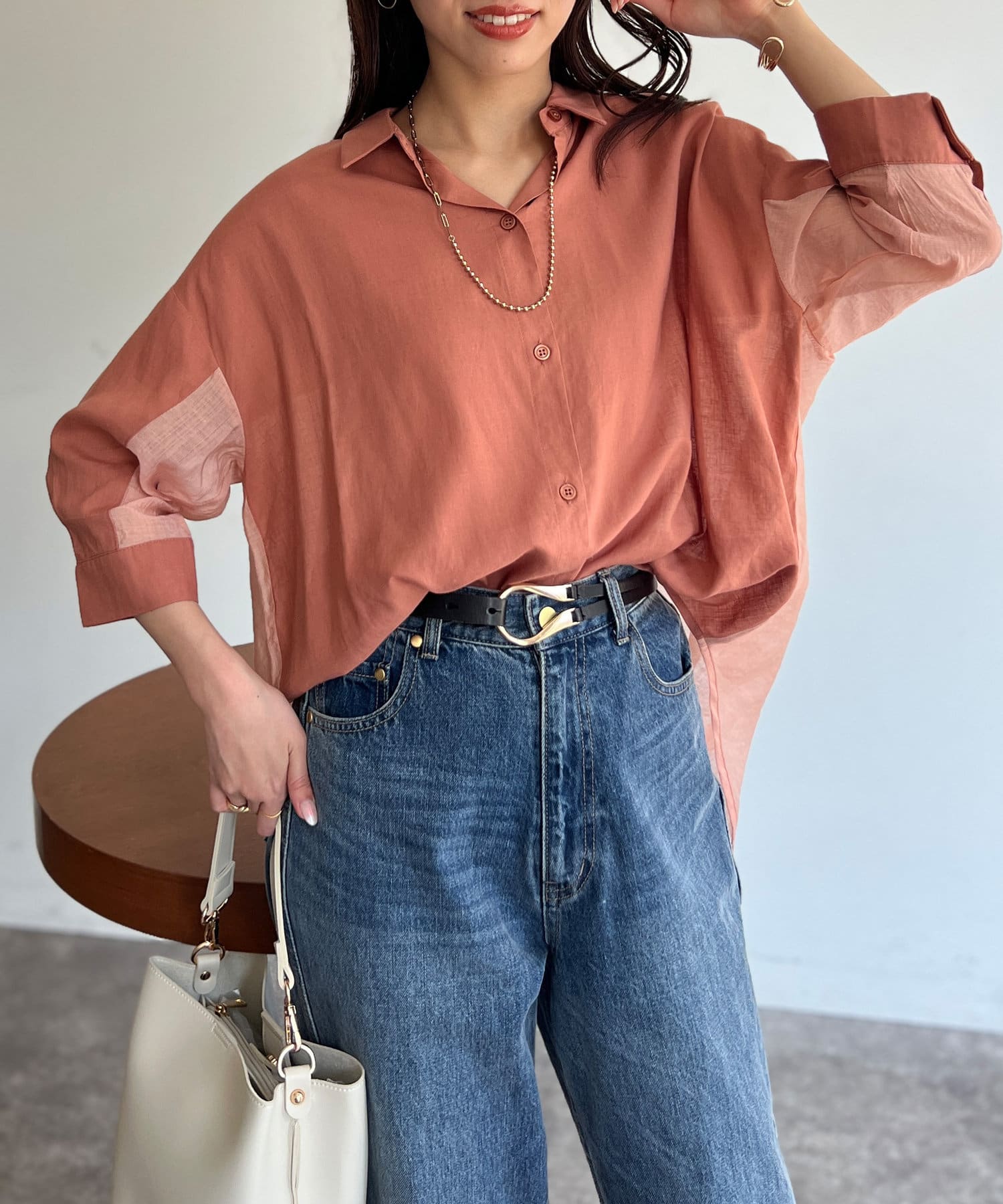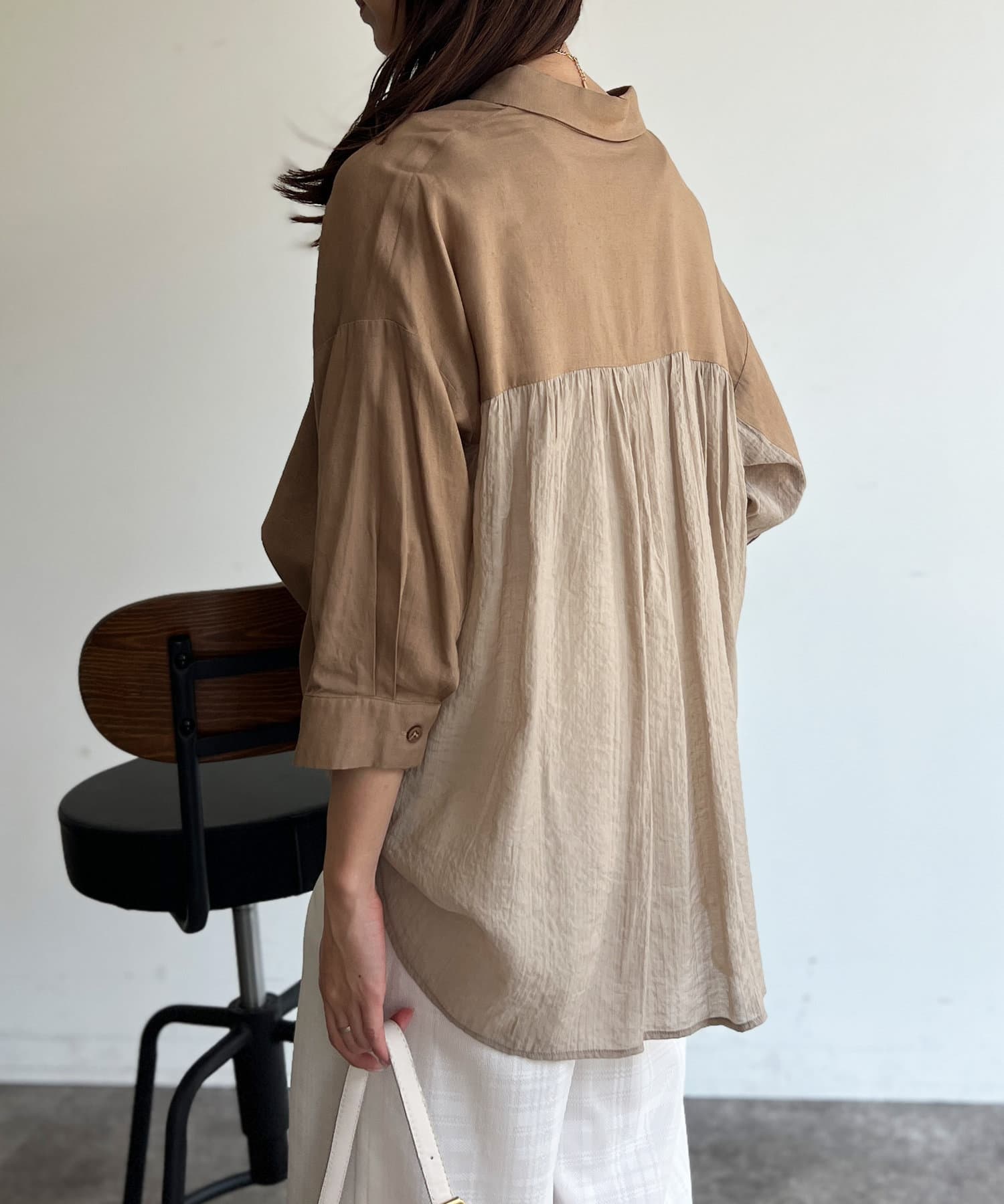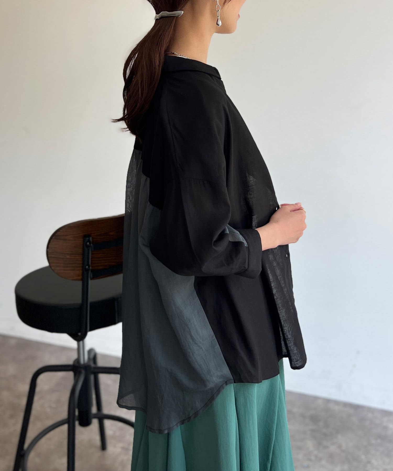 程よいシアー感が大人カジュアルなシャツ。後ろはバイカラーで