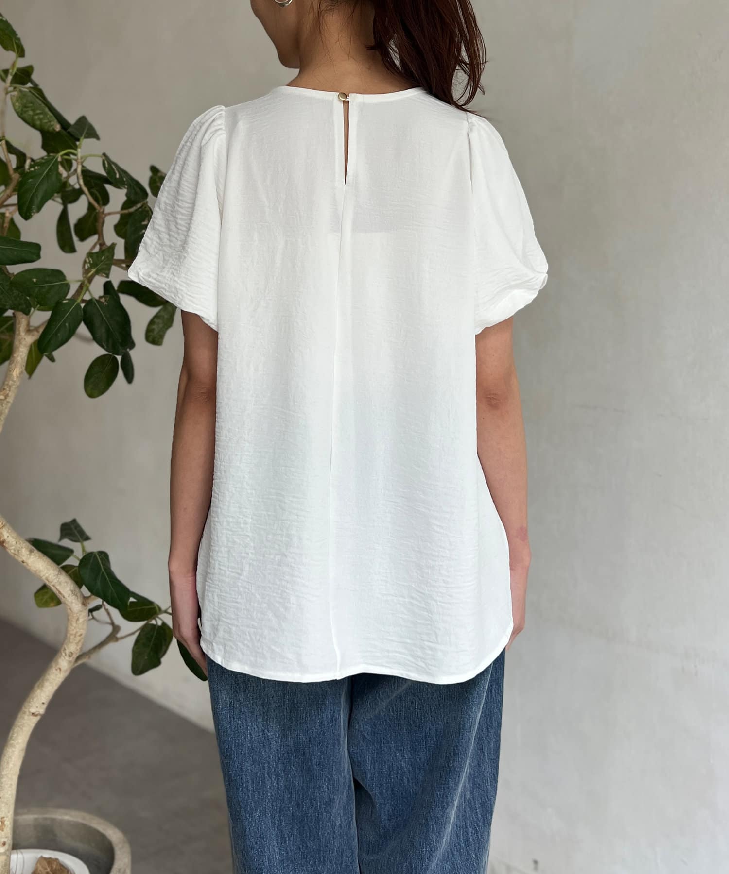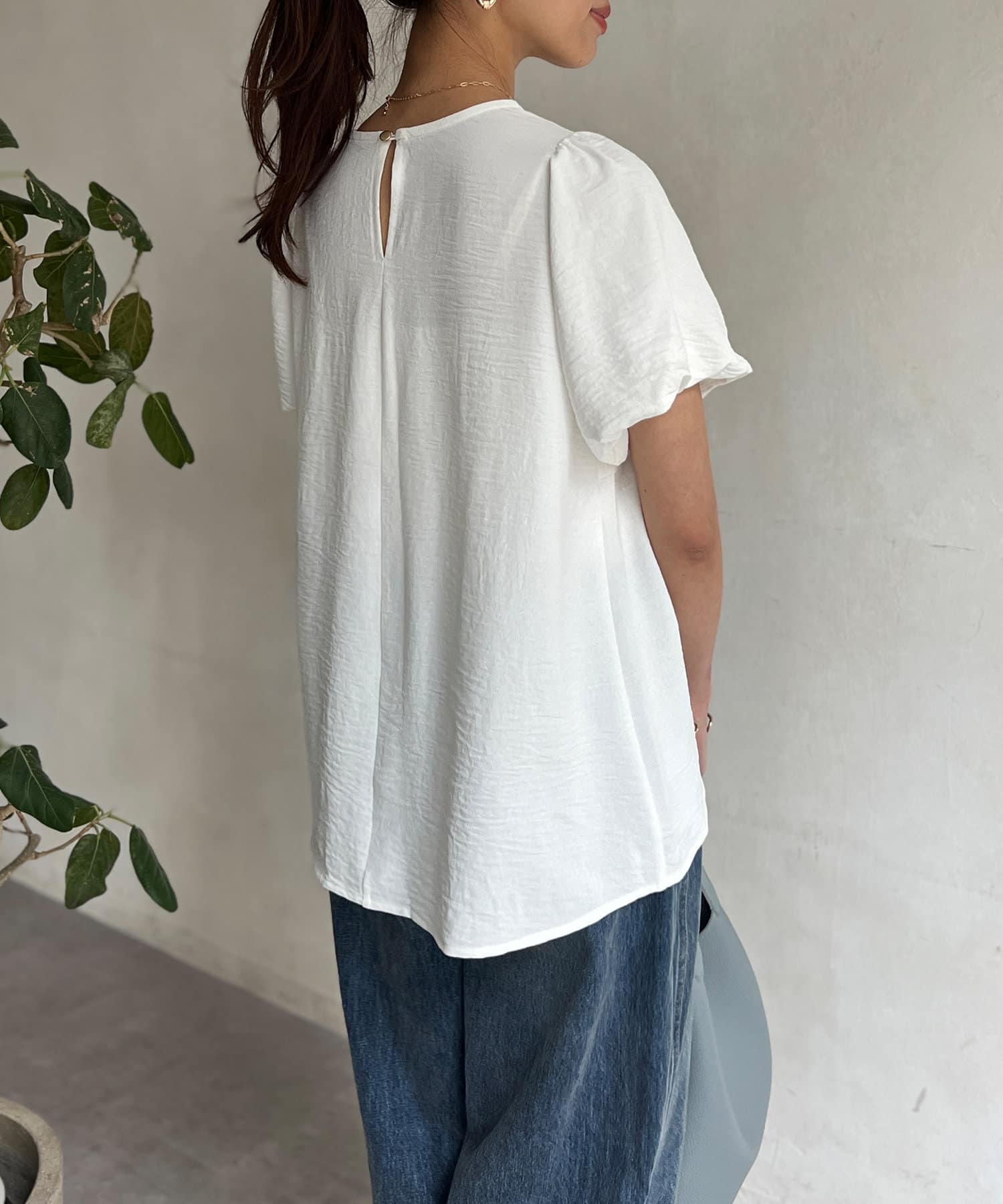 お洗濯してもシワにならずきれいめに着られてお気に入りです。袖のパフも気になるほどボリュームが出ないので着やすいです。