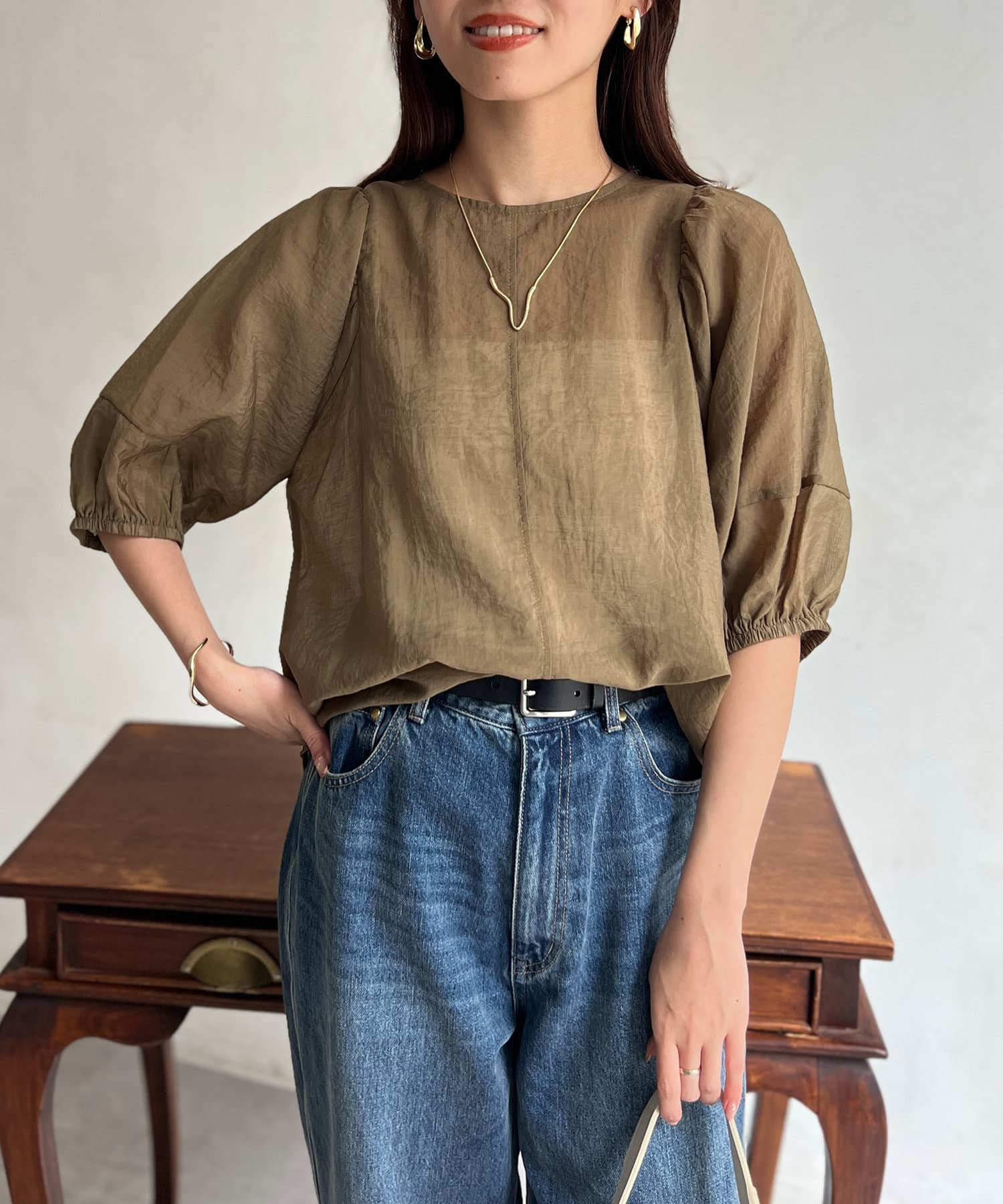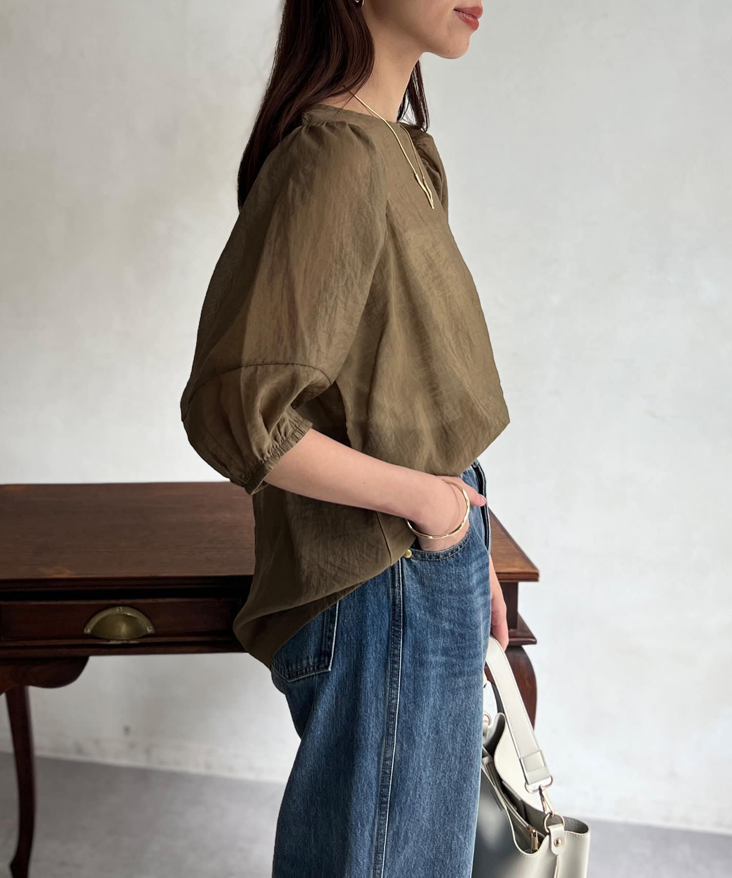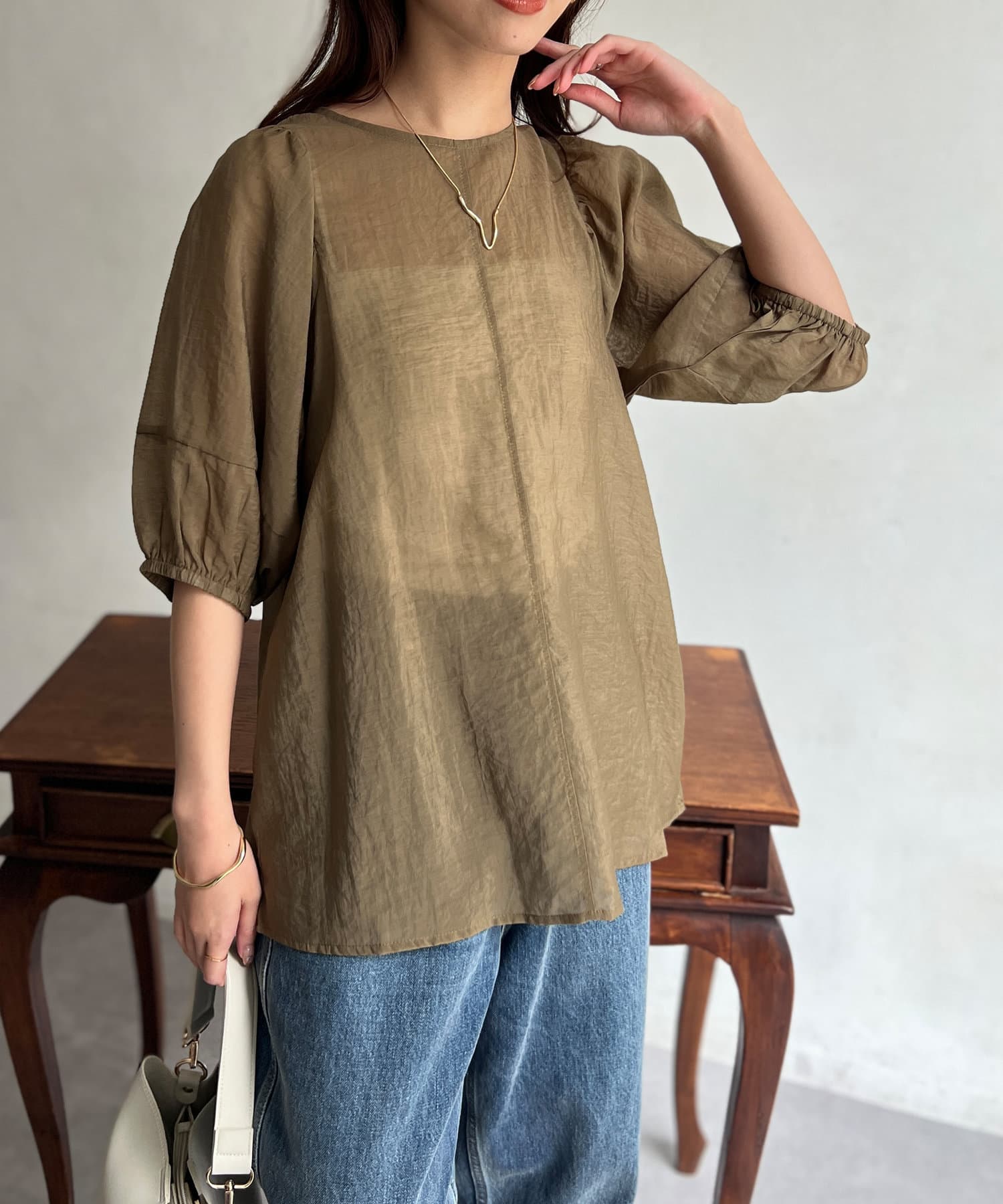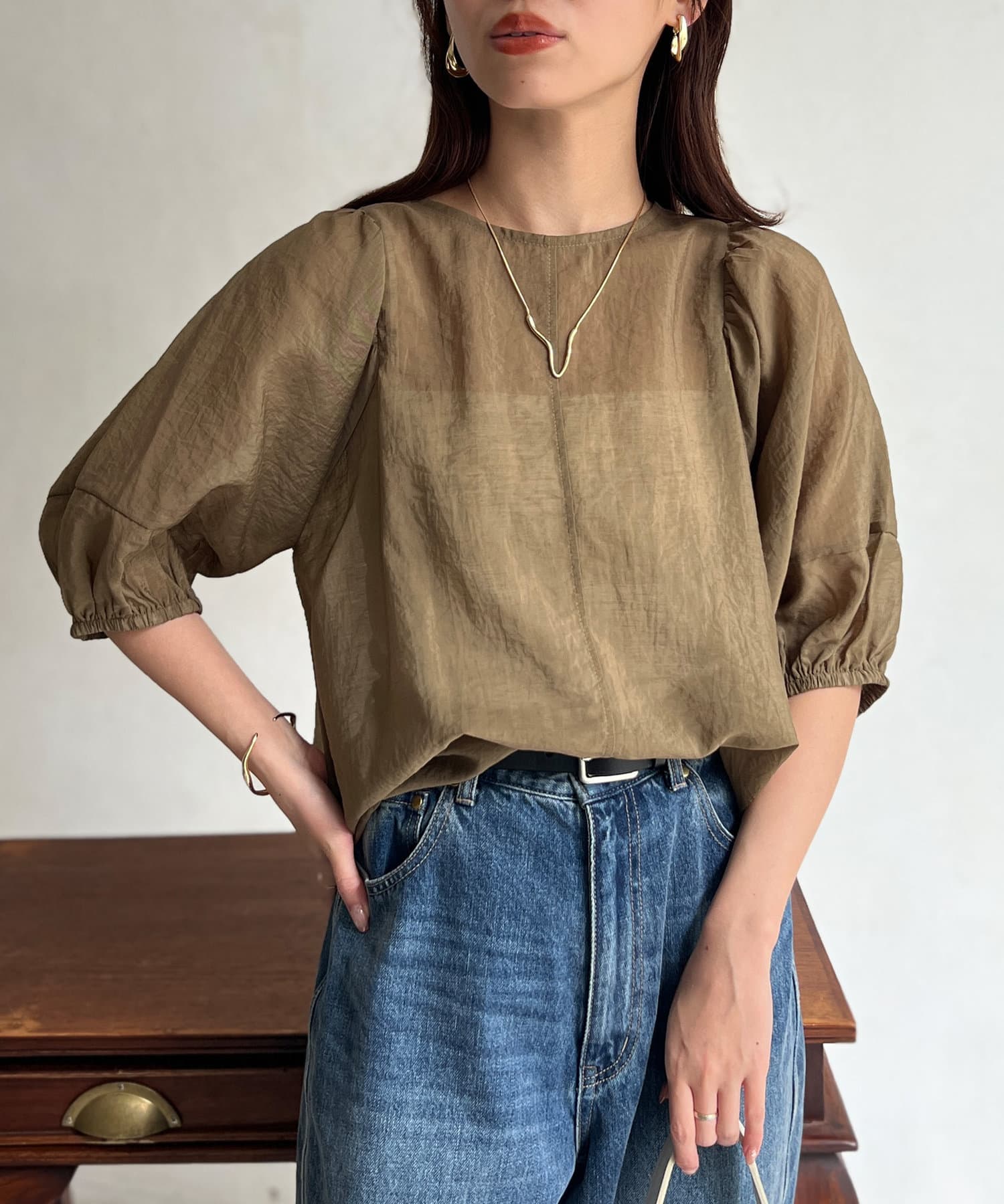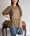 モカの色が夏の終わりにとても良くて、ランタンスリーブの袖の長さも理想的で、シアー感も上品で大活躍です。
