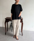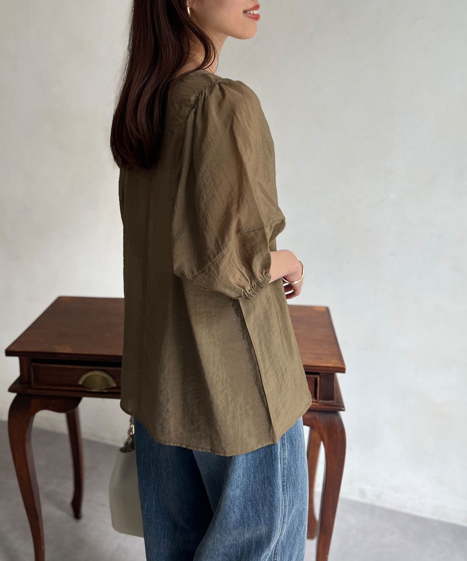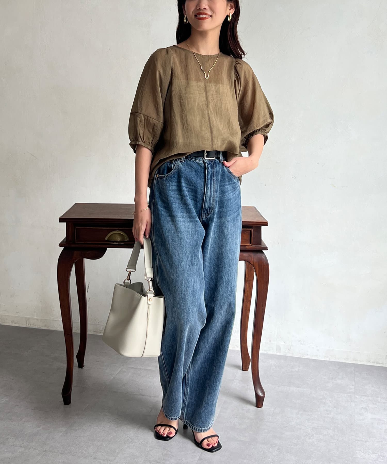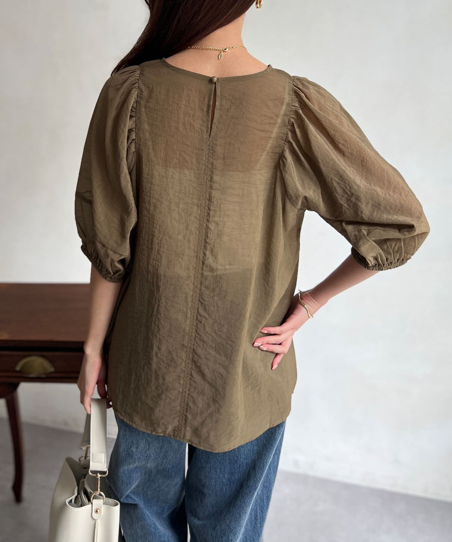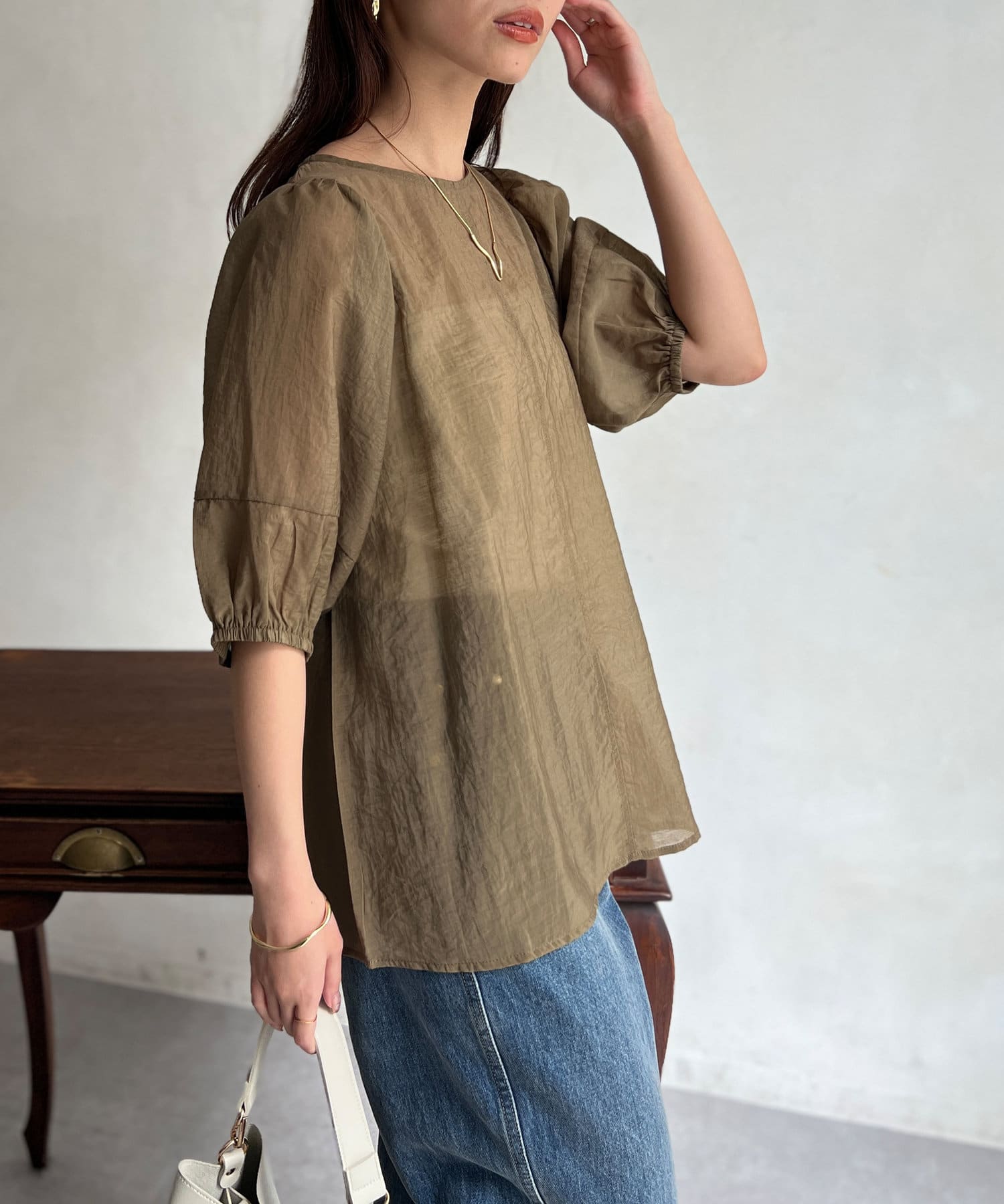 モカの色が夏の終わりにとても良くて、ランタンスリーブの袖の長さも理想的で、シアー感も上品で大活躍です。