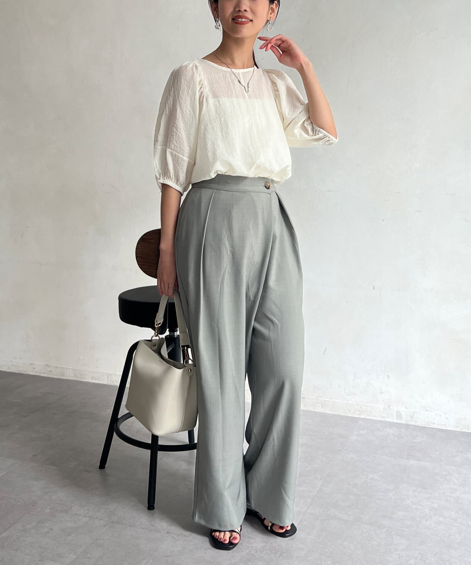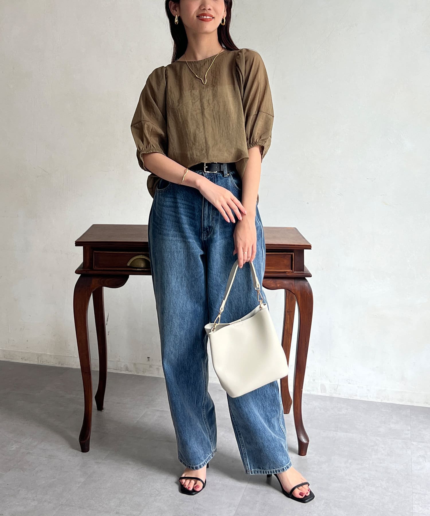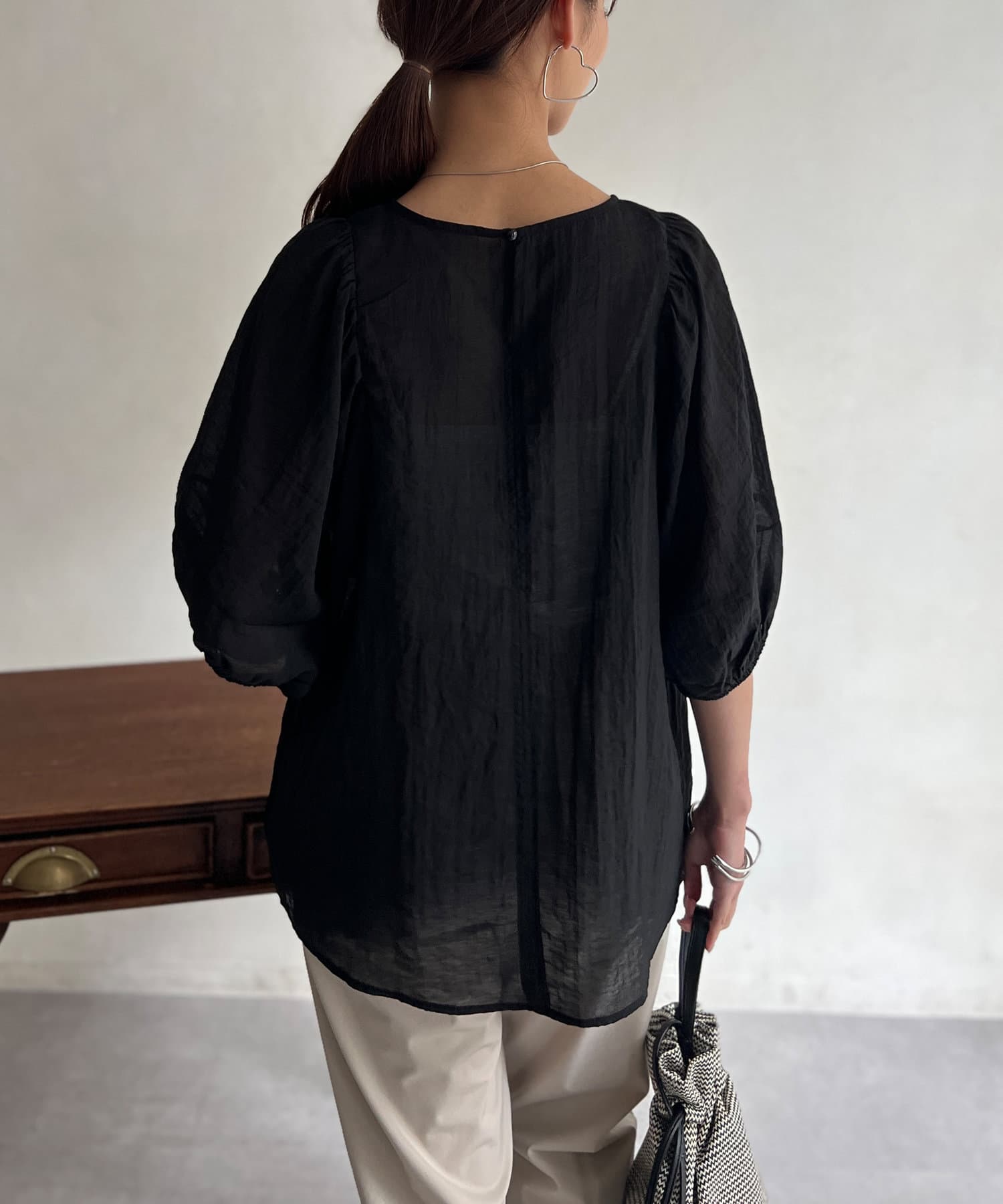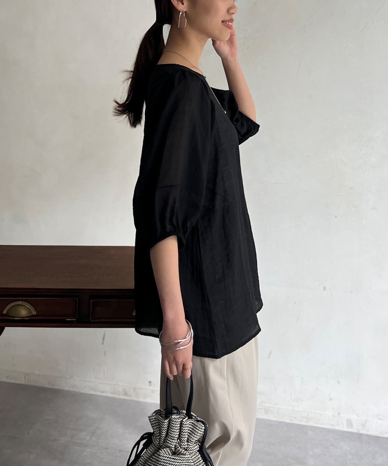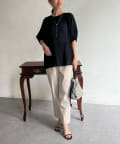 モカの色が夏の終わりにとても良くて、ランタンスリーブの袖の長さも理想的で、シアー感も上品で大活躍です。