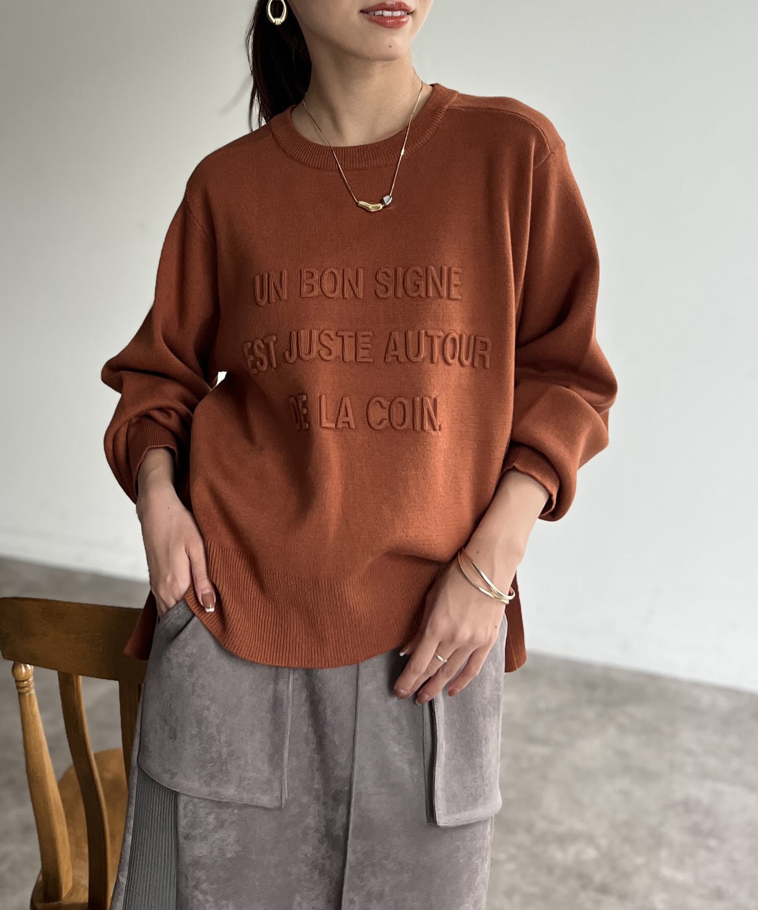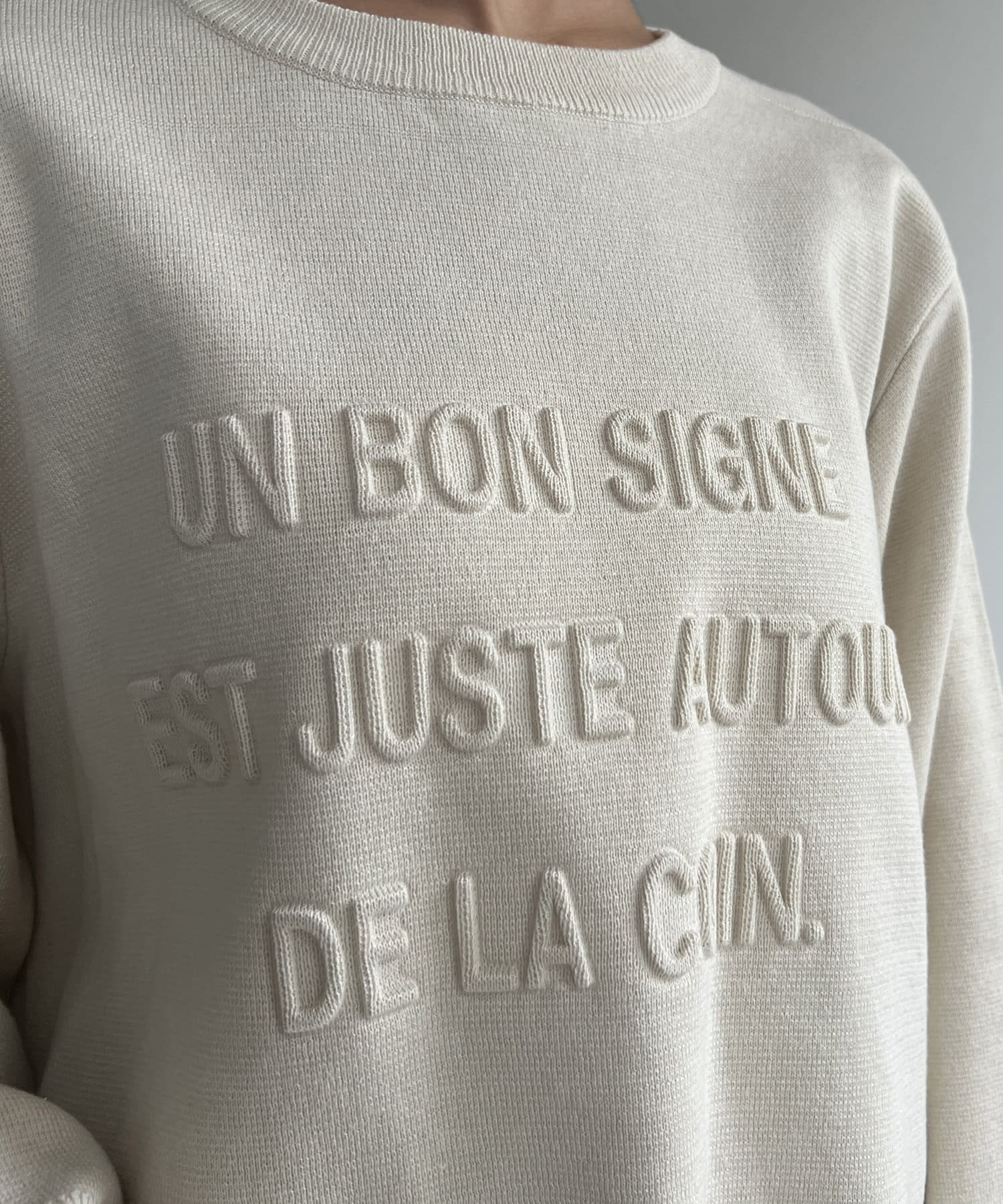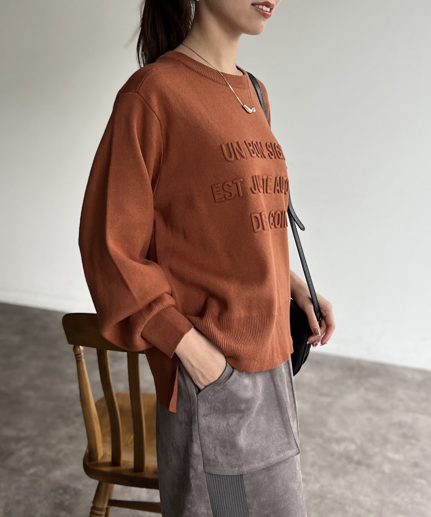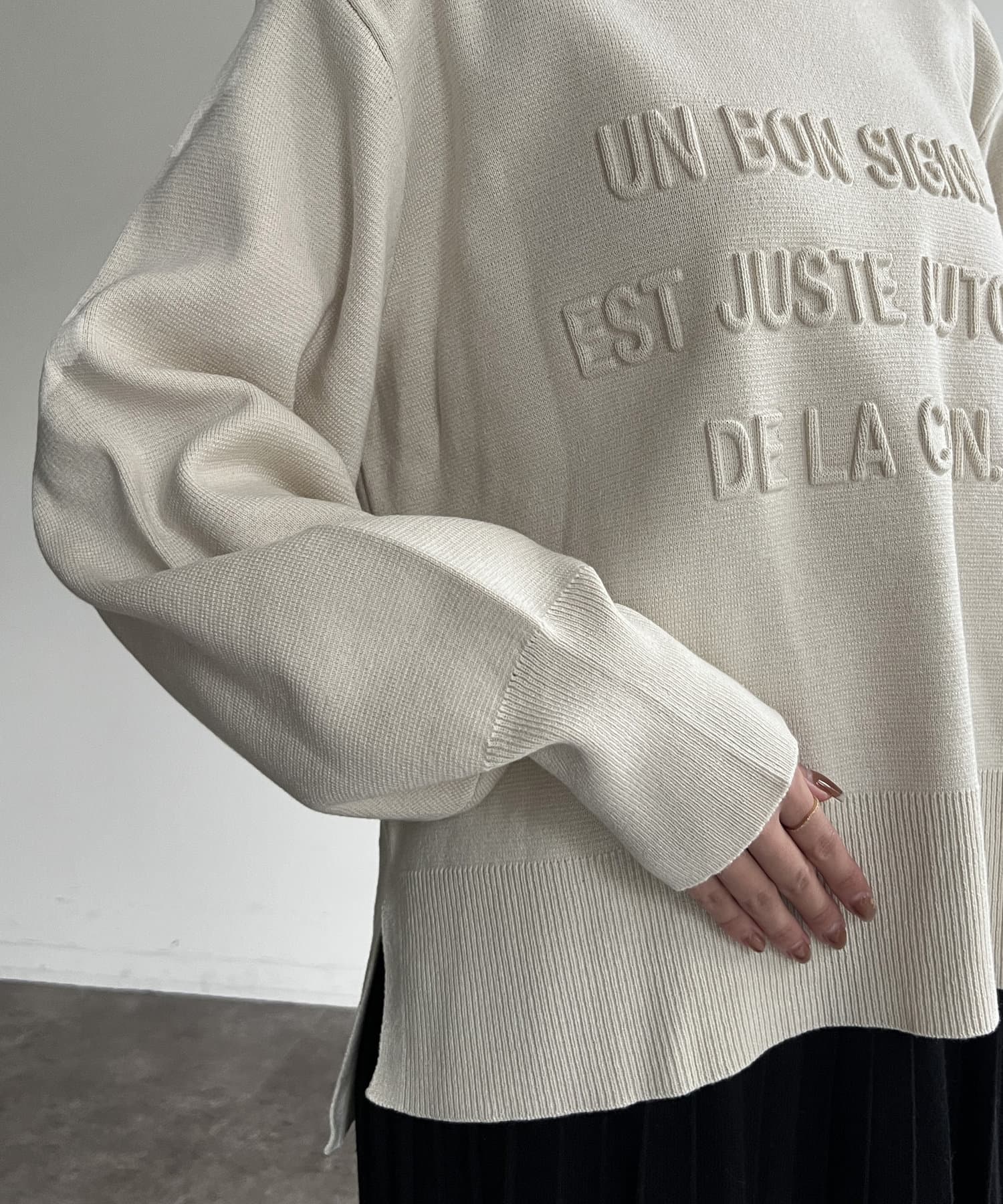 エンボス加工で文字に立体感のある大人カジュアルニット。