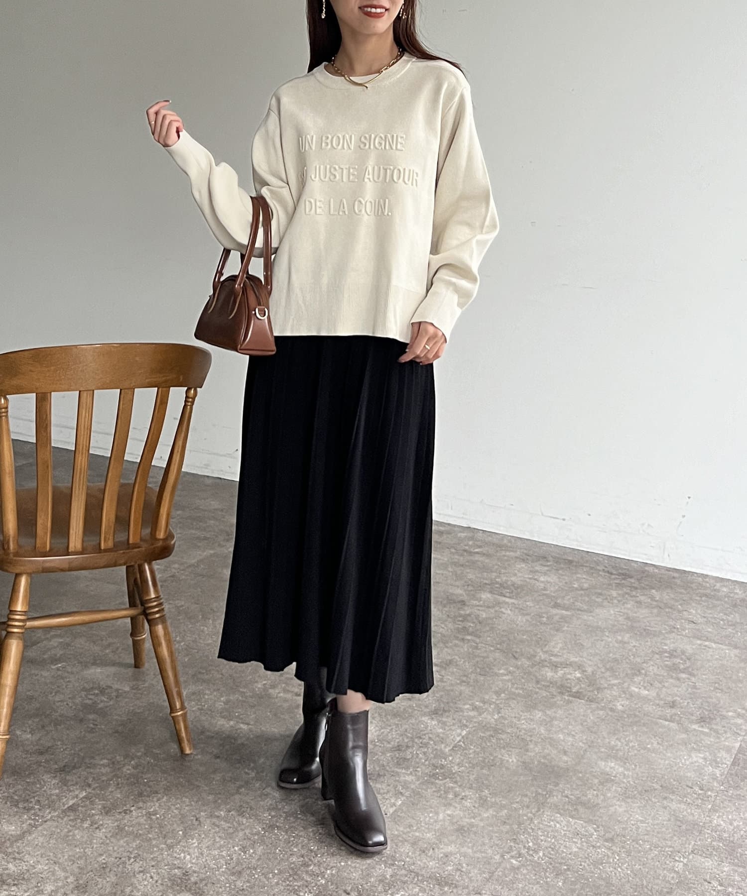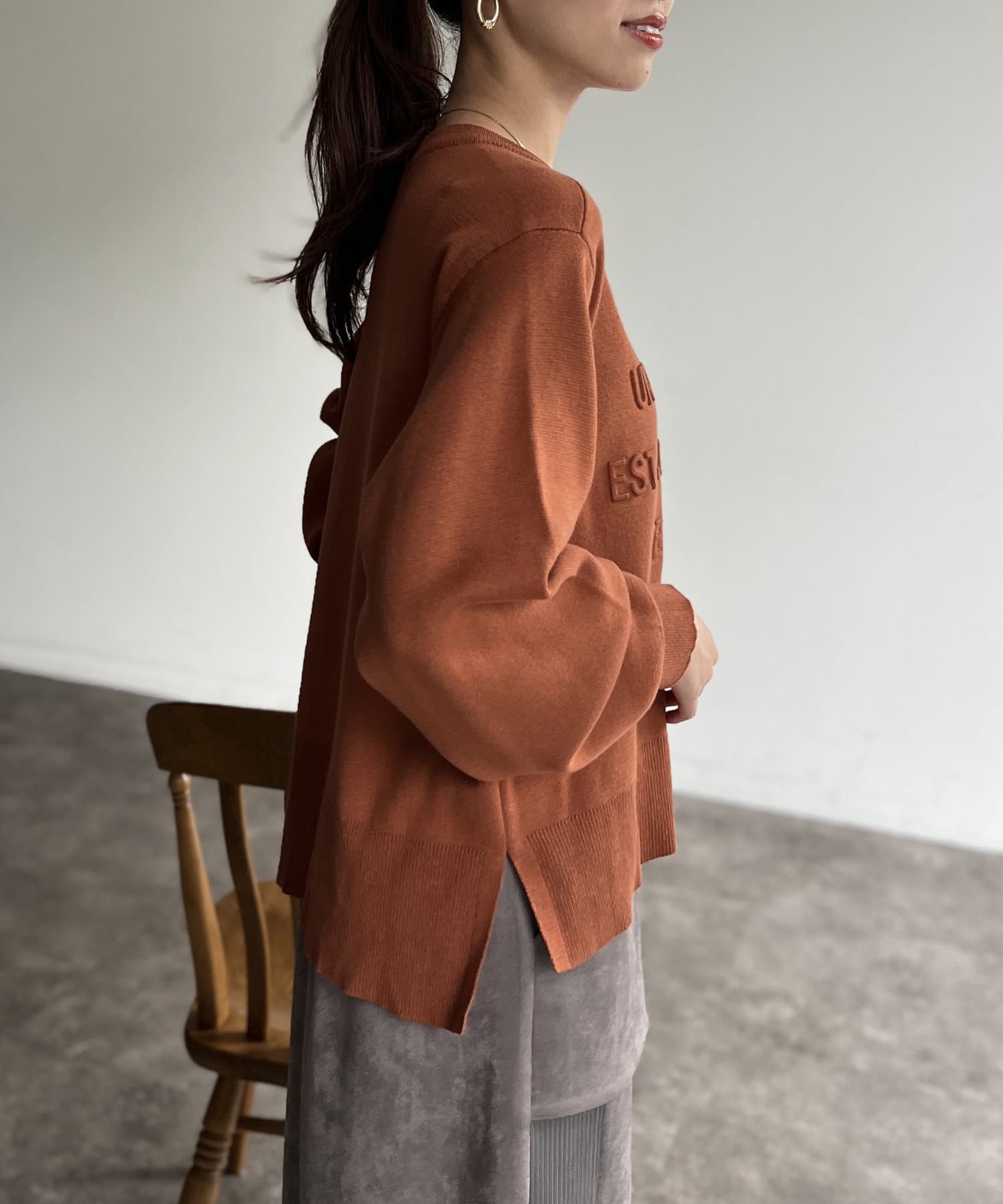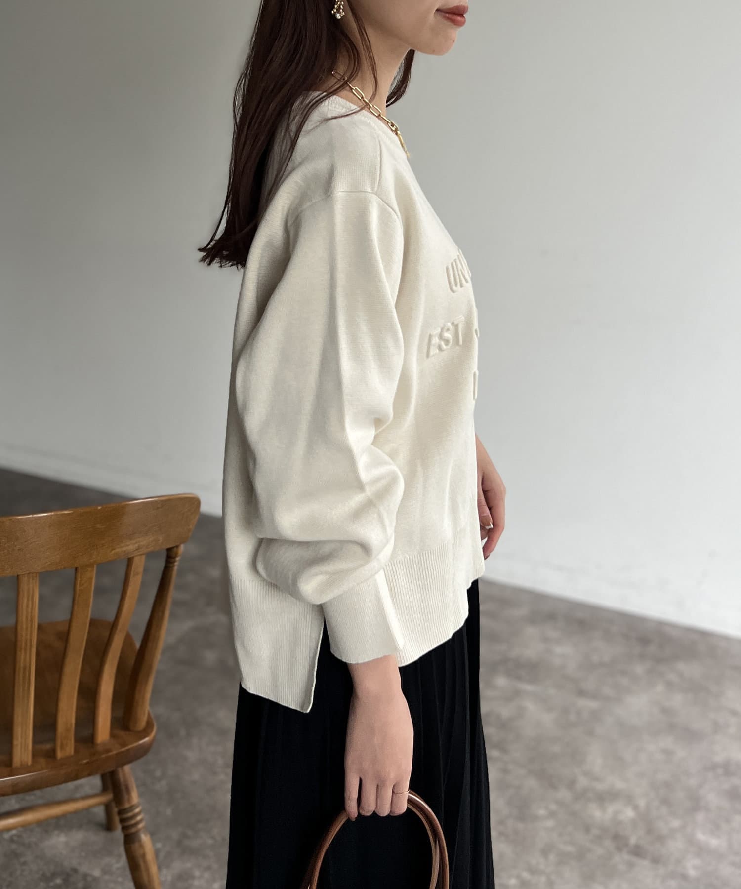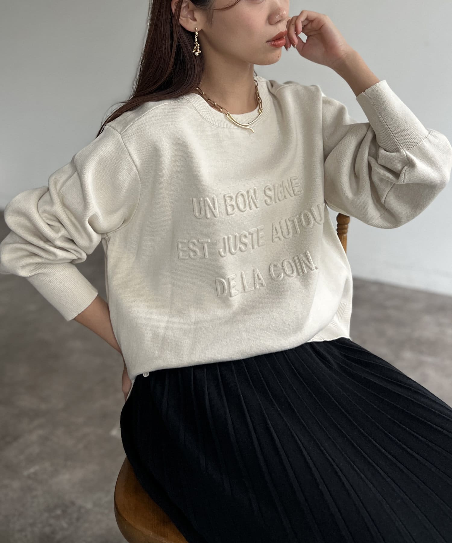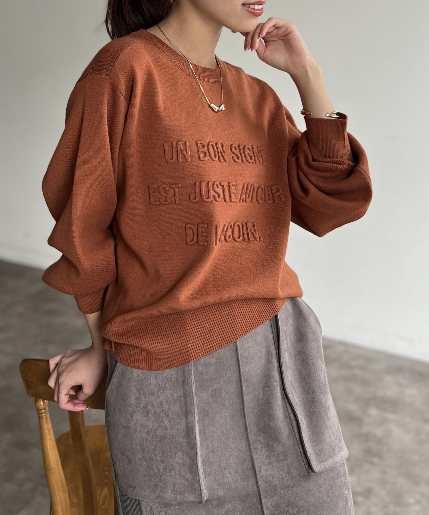 エンボス加工で文字に立体感のある大人カジュアルニット。