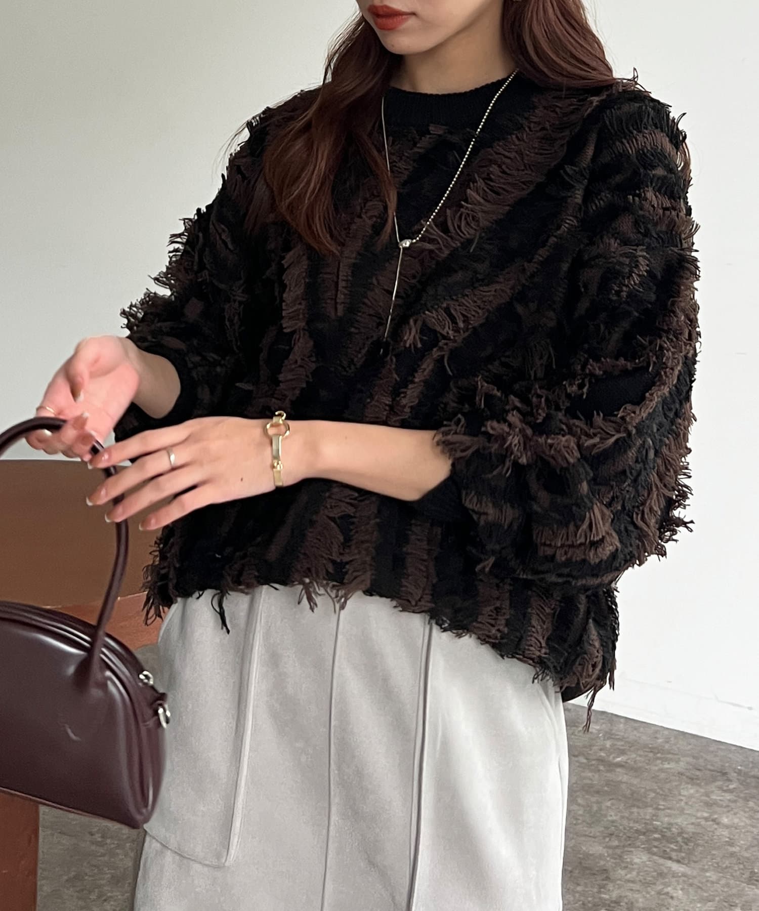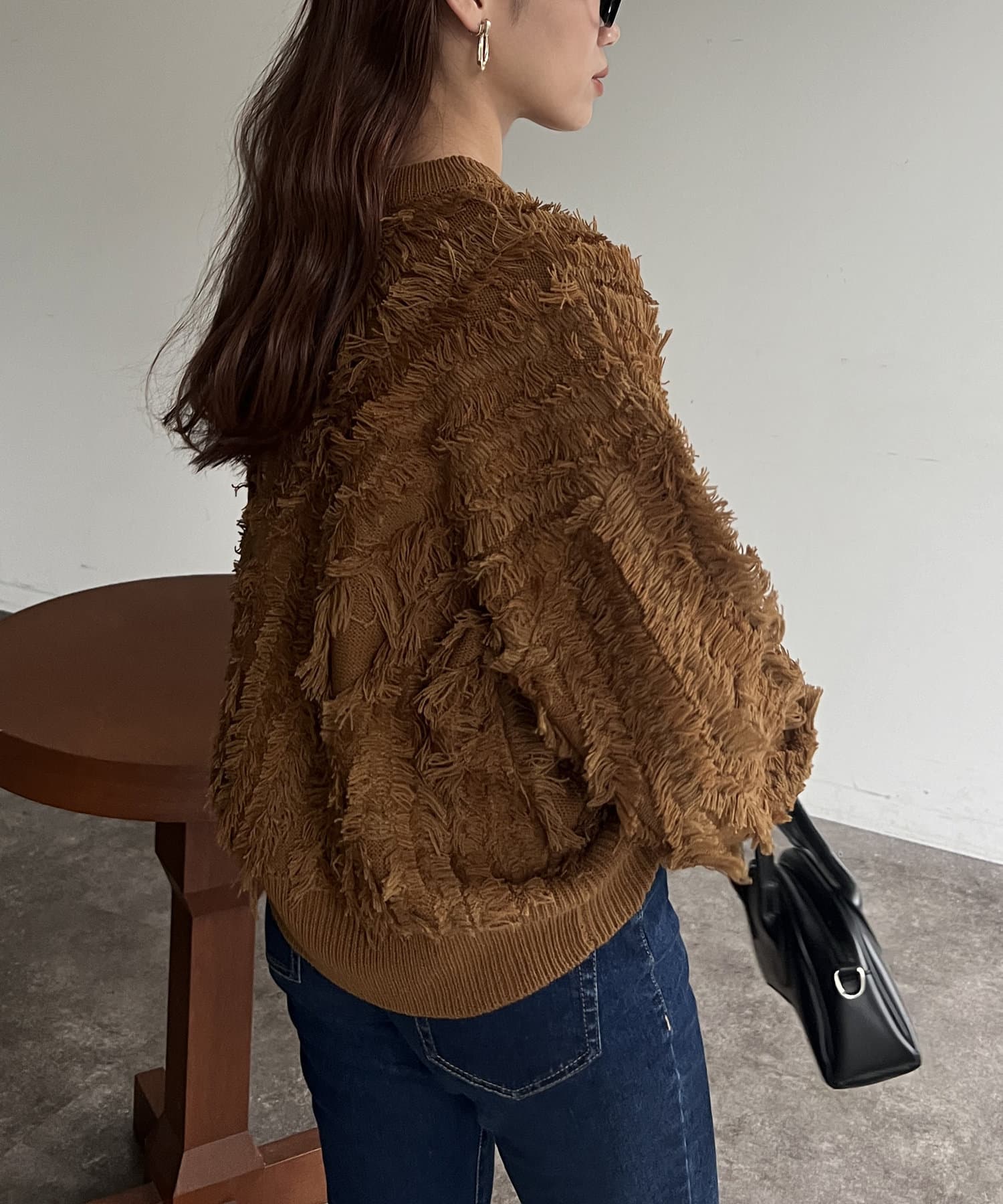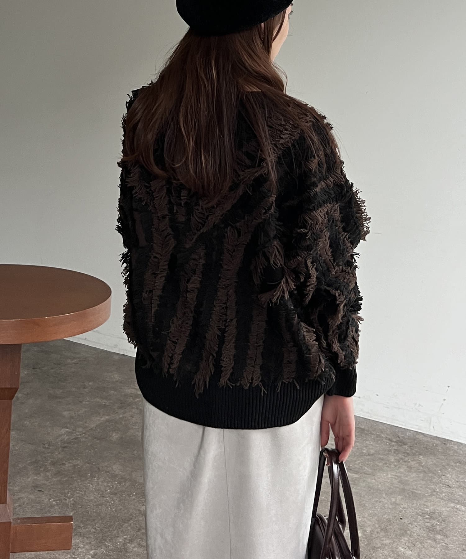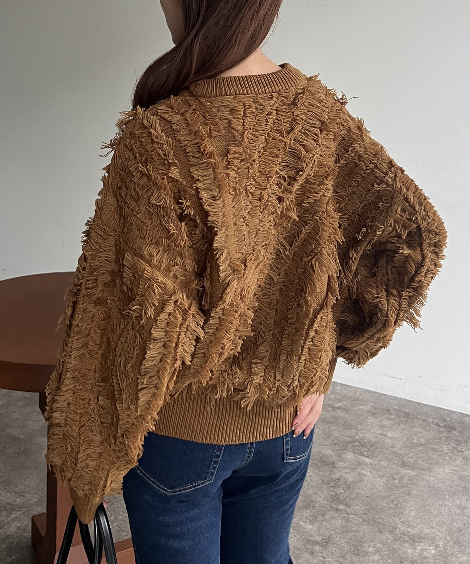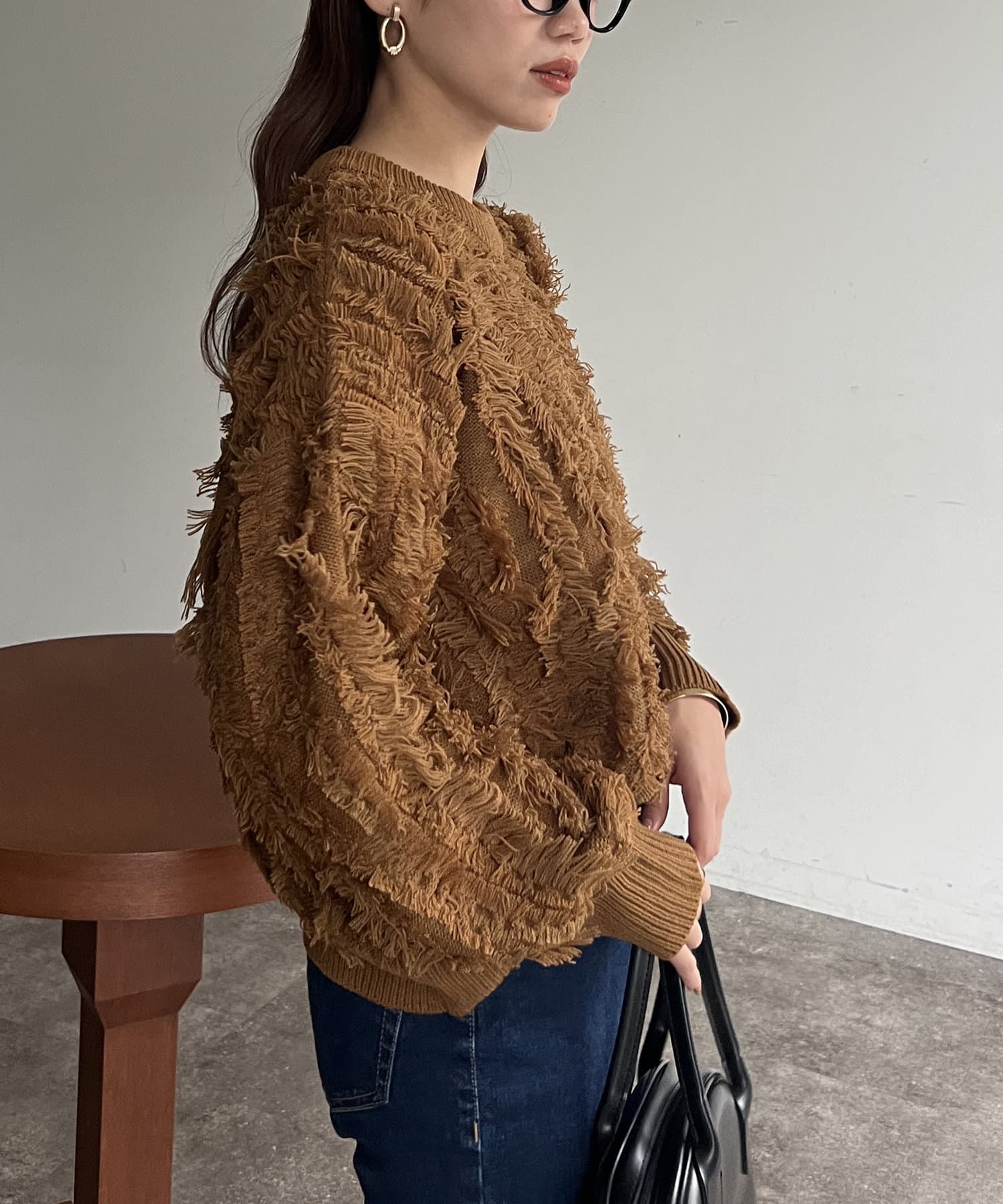ウェーブを描くフリンジシャギーデザインが印象的なニット。