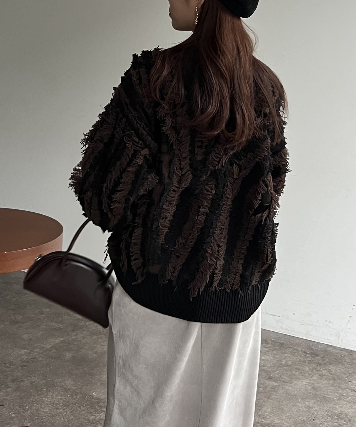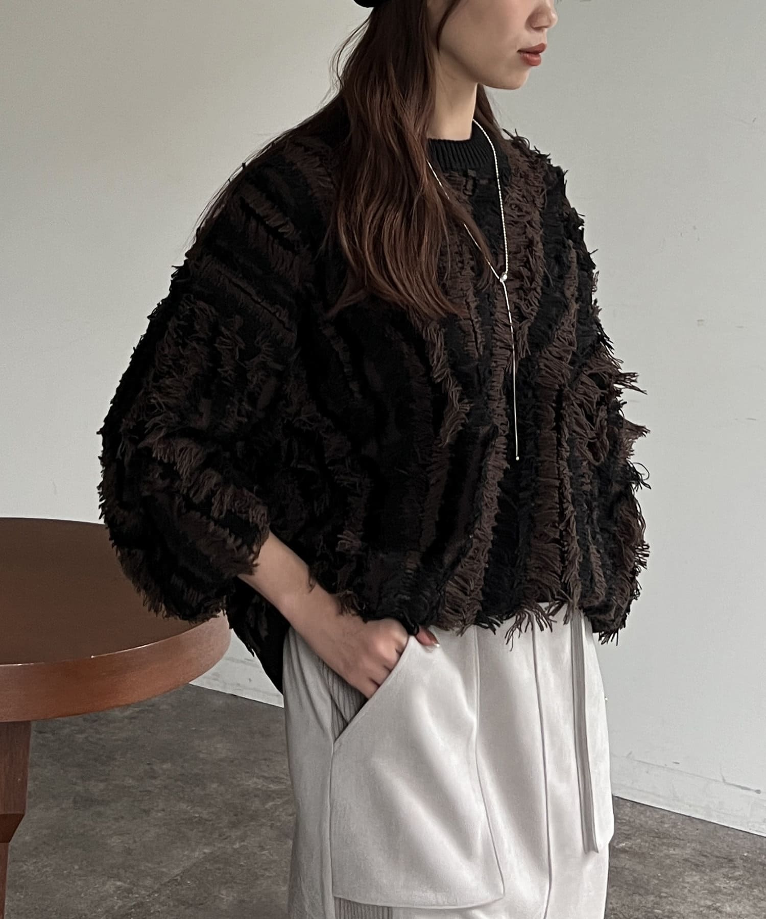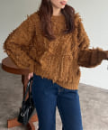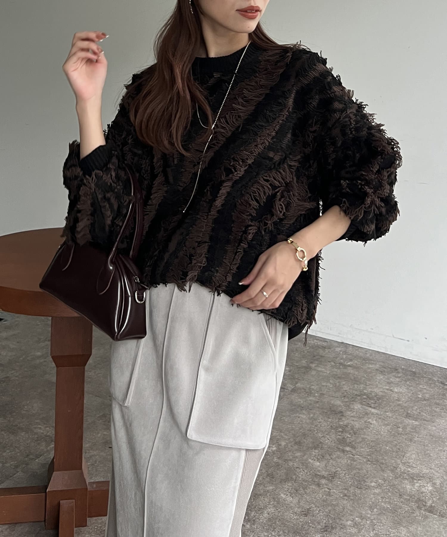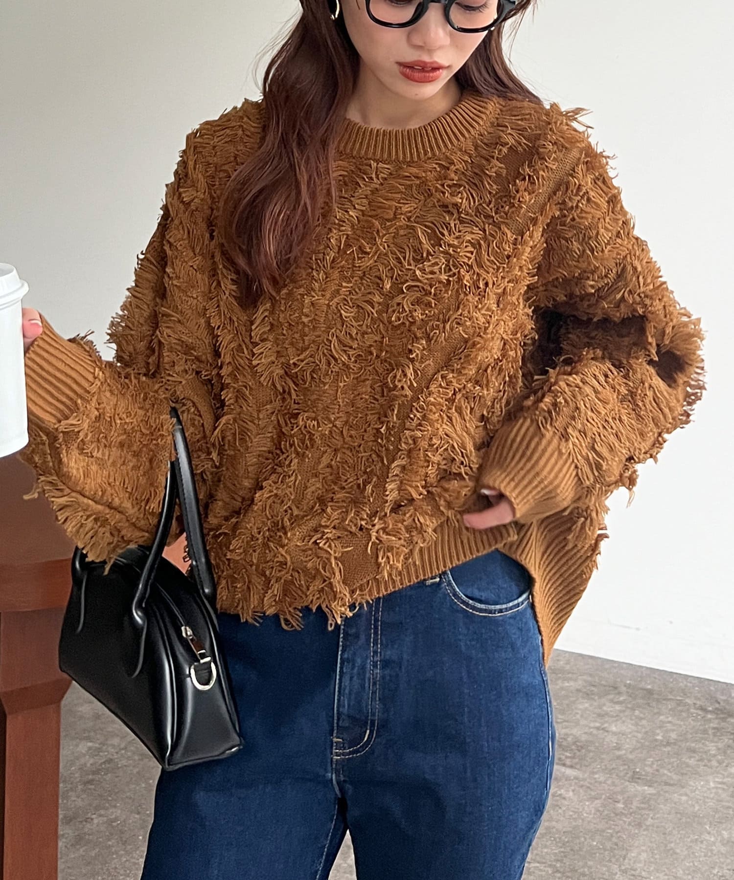 ウェーブを描くフリンジシャギーデザインが印象的なニット。