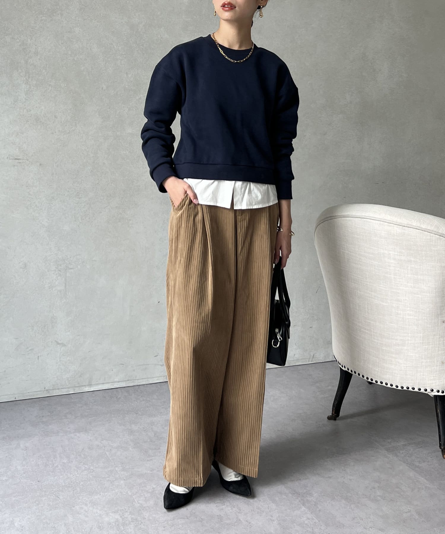 デニムやワイドパンツなどと合わせてカジュアル、ナロースカートなどと