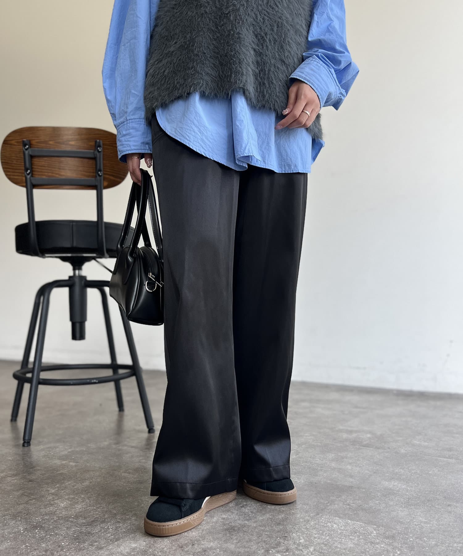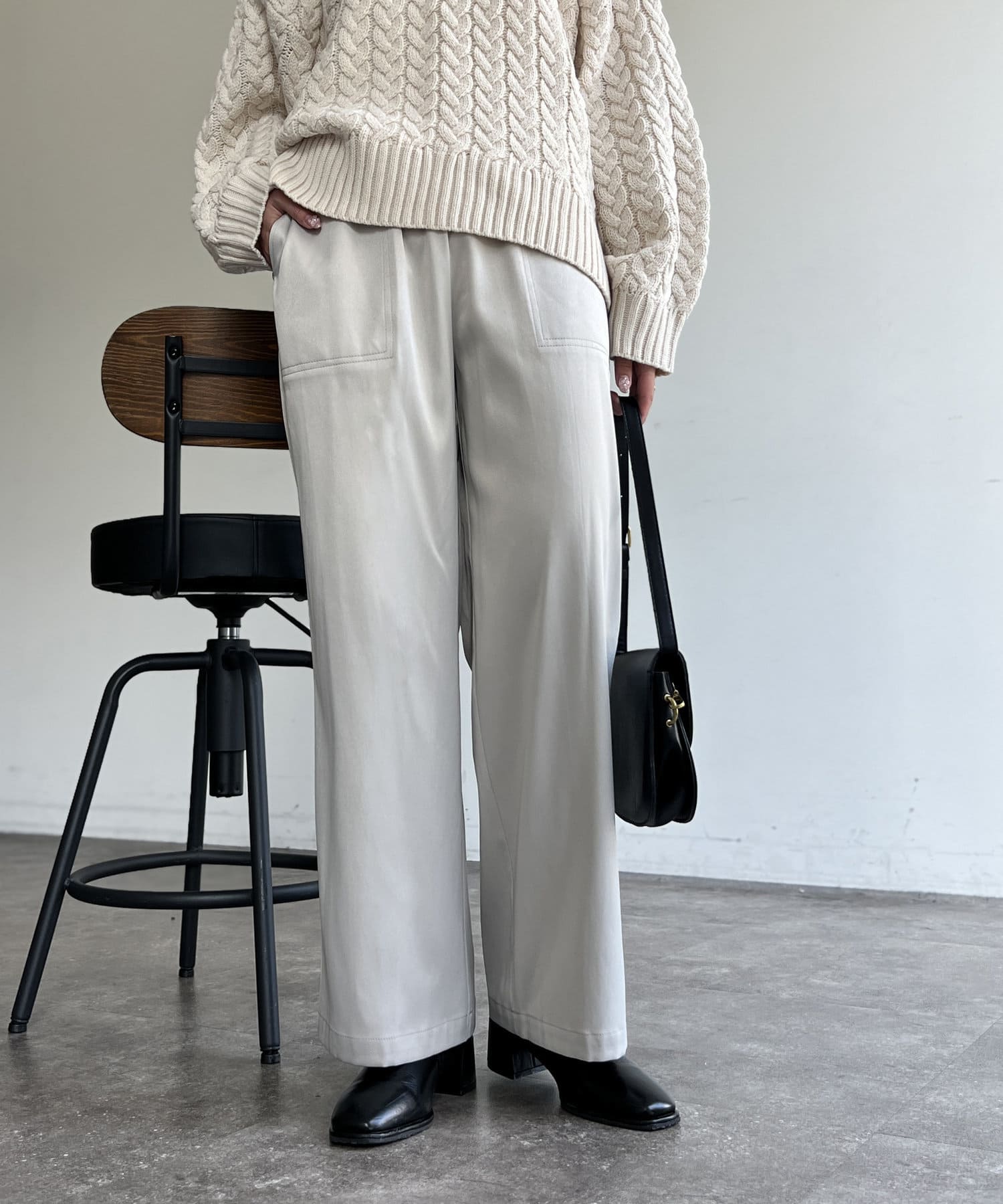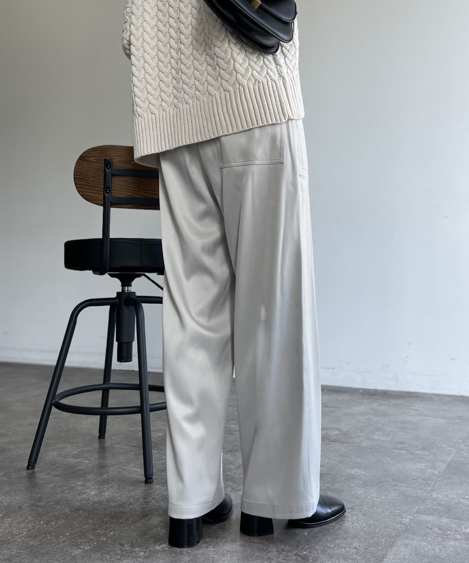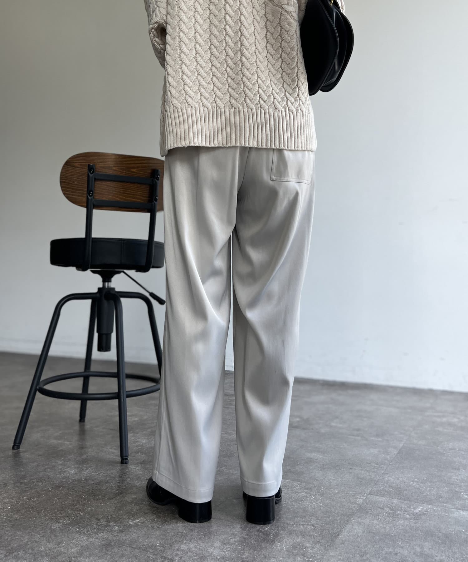 上品に着まわせるサテンイージーパンツ