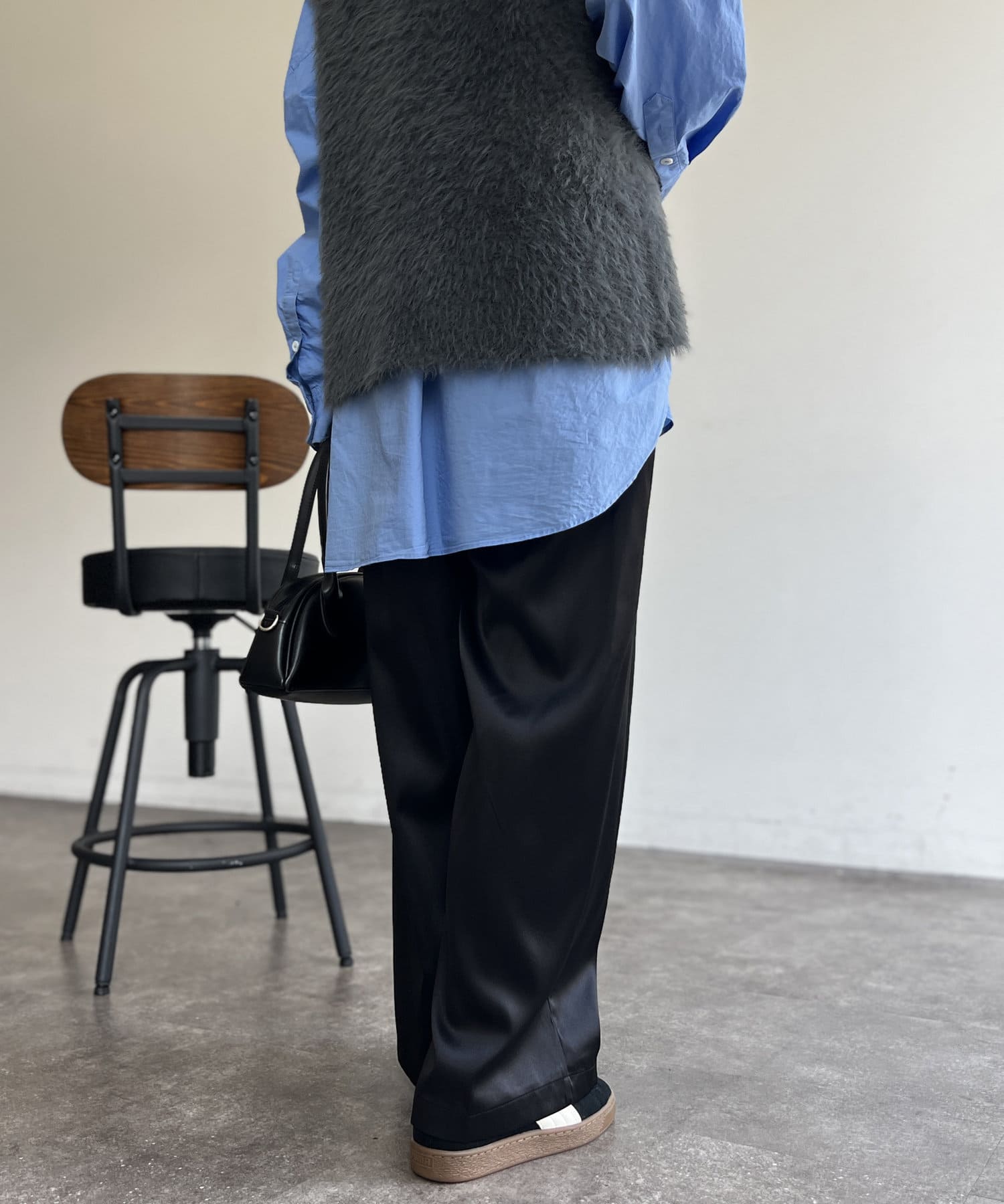 サテンの上品な光沢がスタイリングのポイントに。