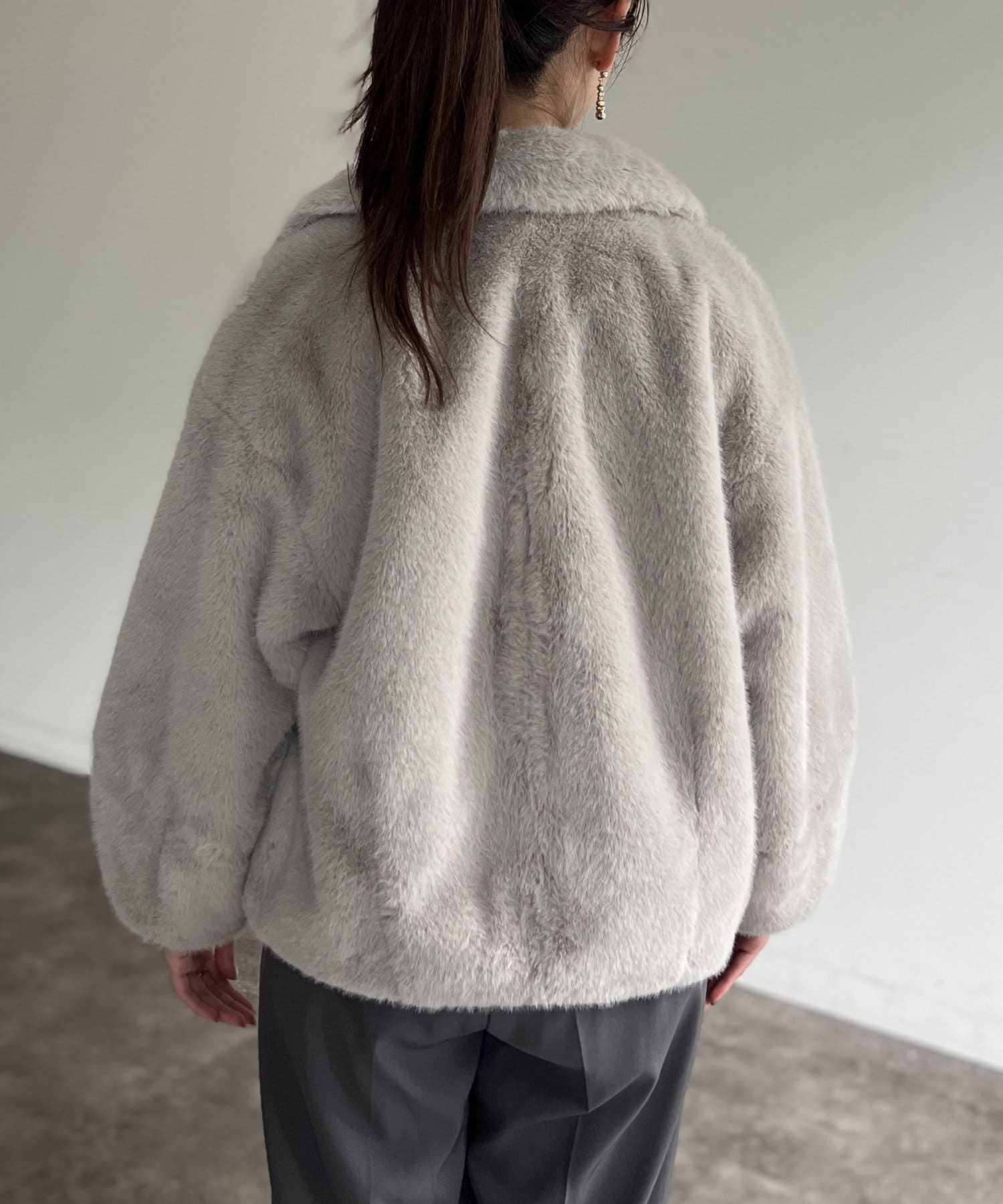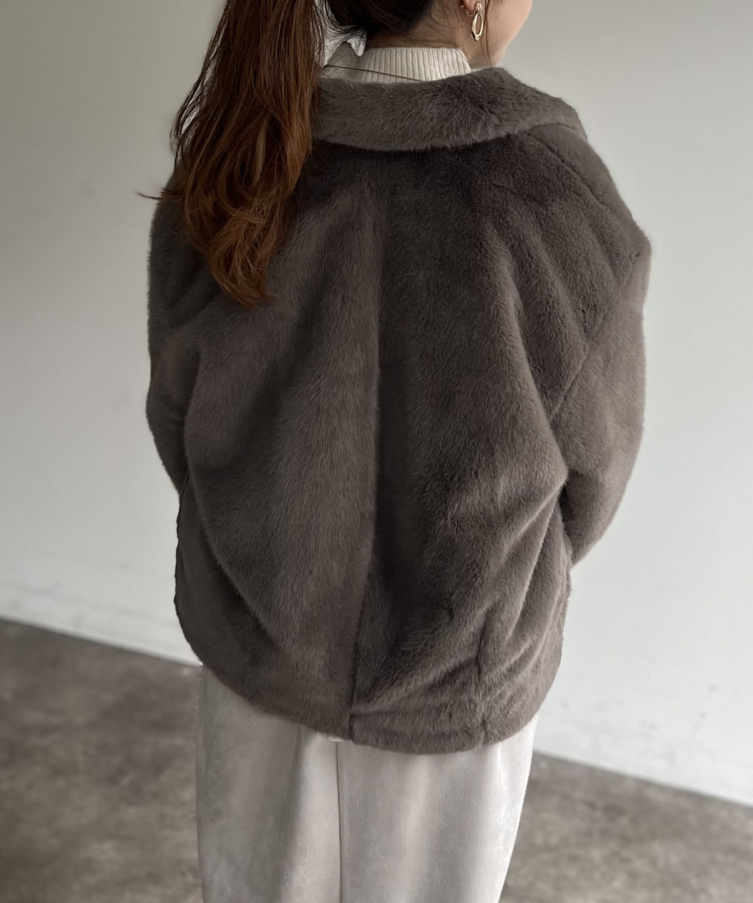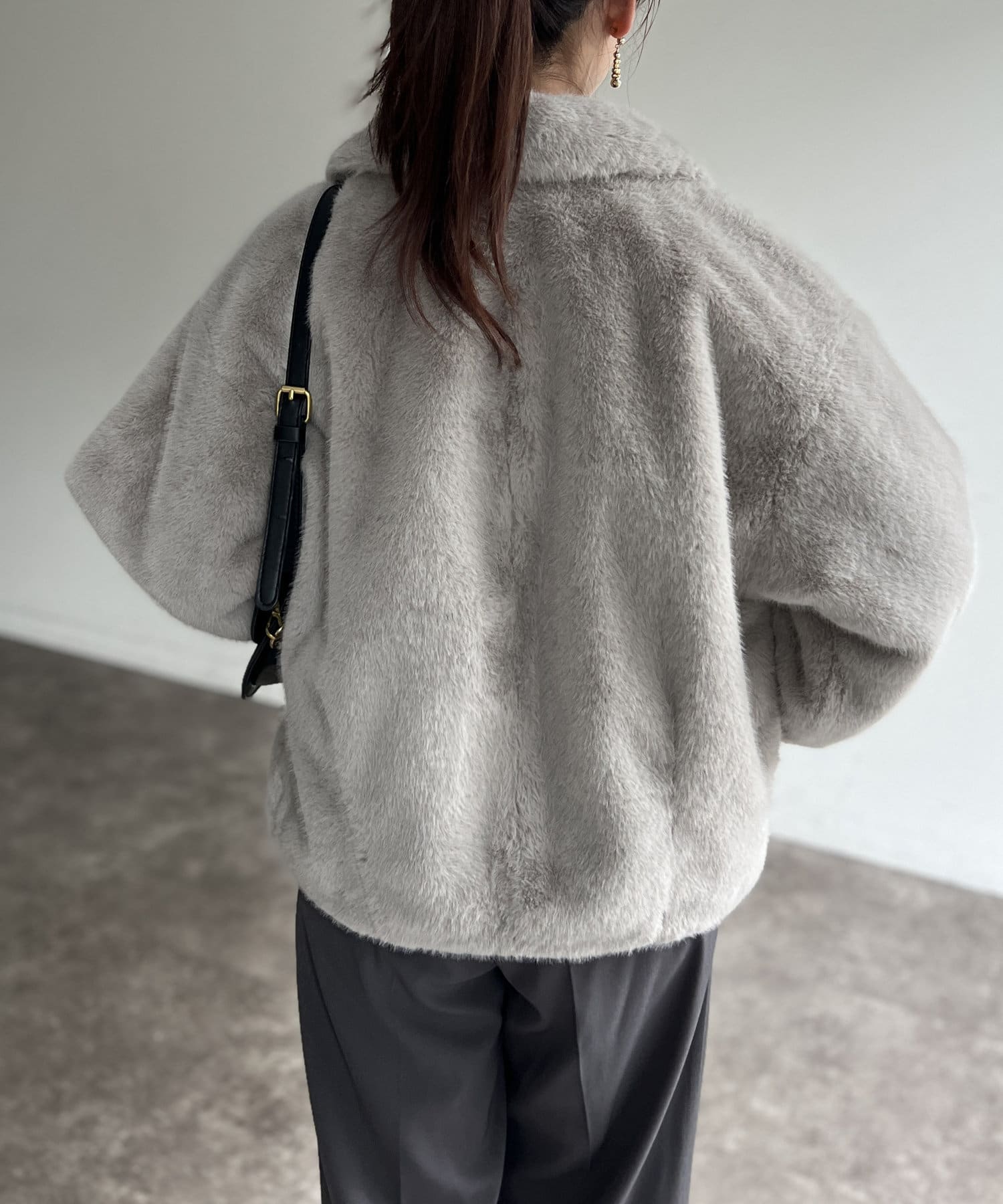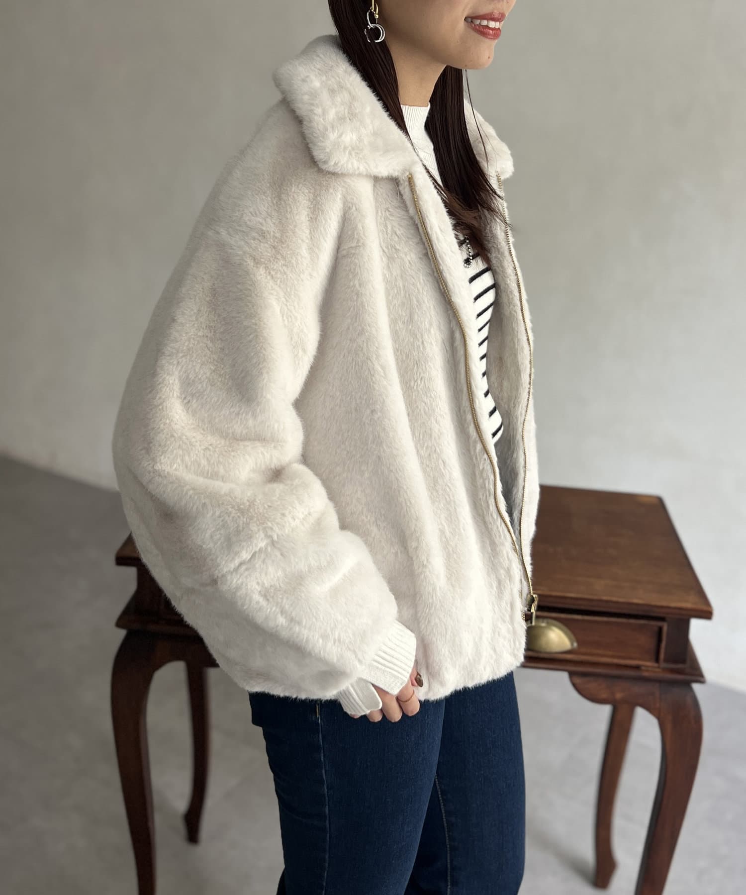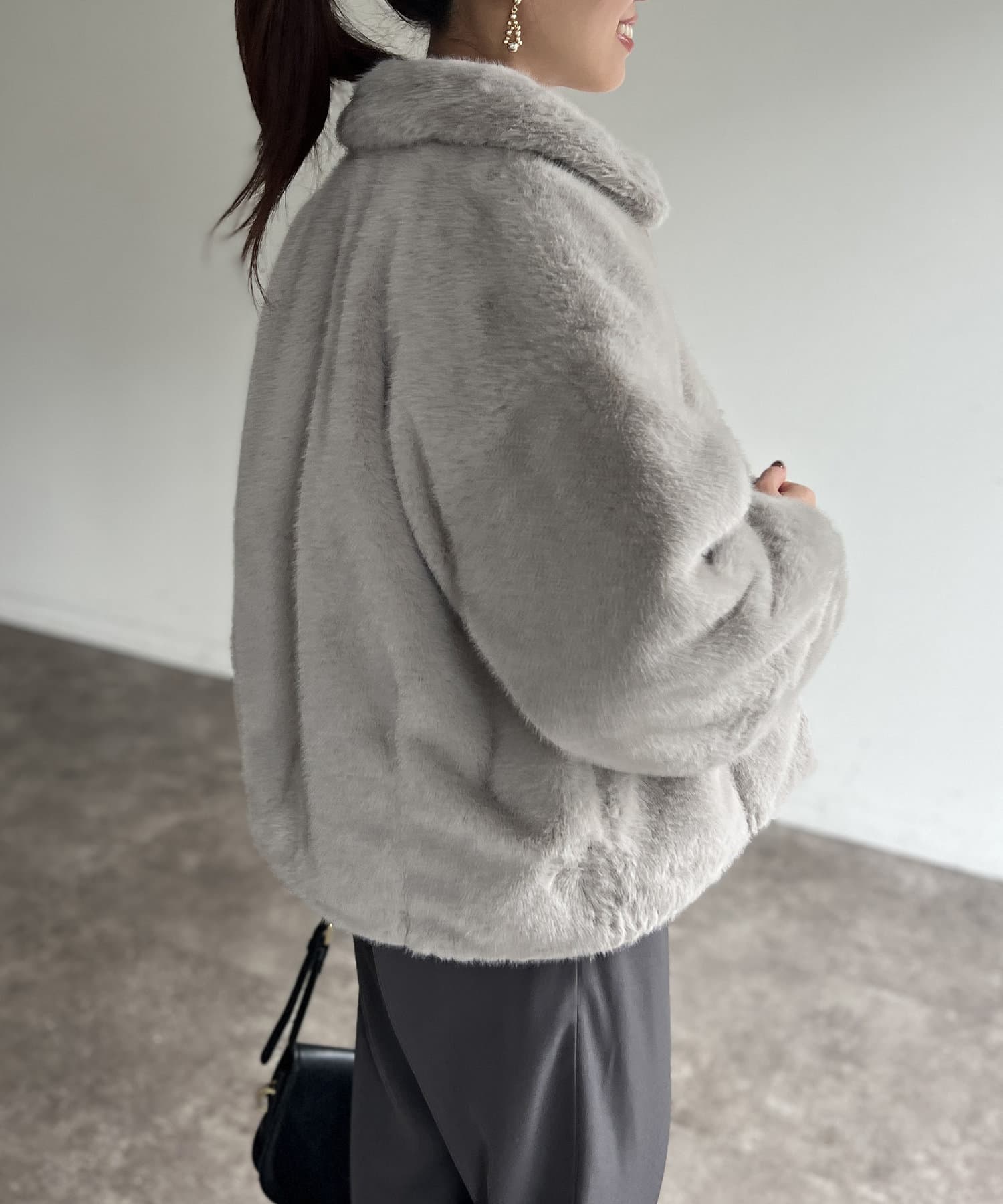 ふわふわの柔らかいフェイクファー素材のジャケット。
