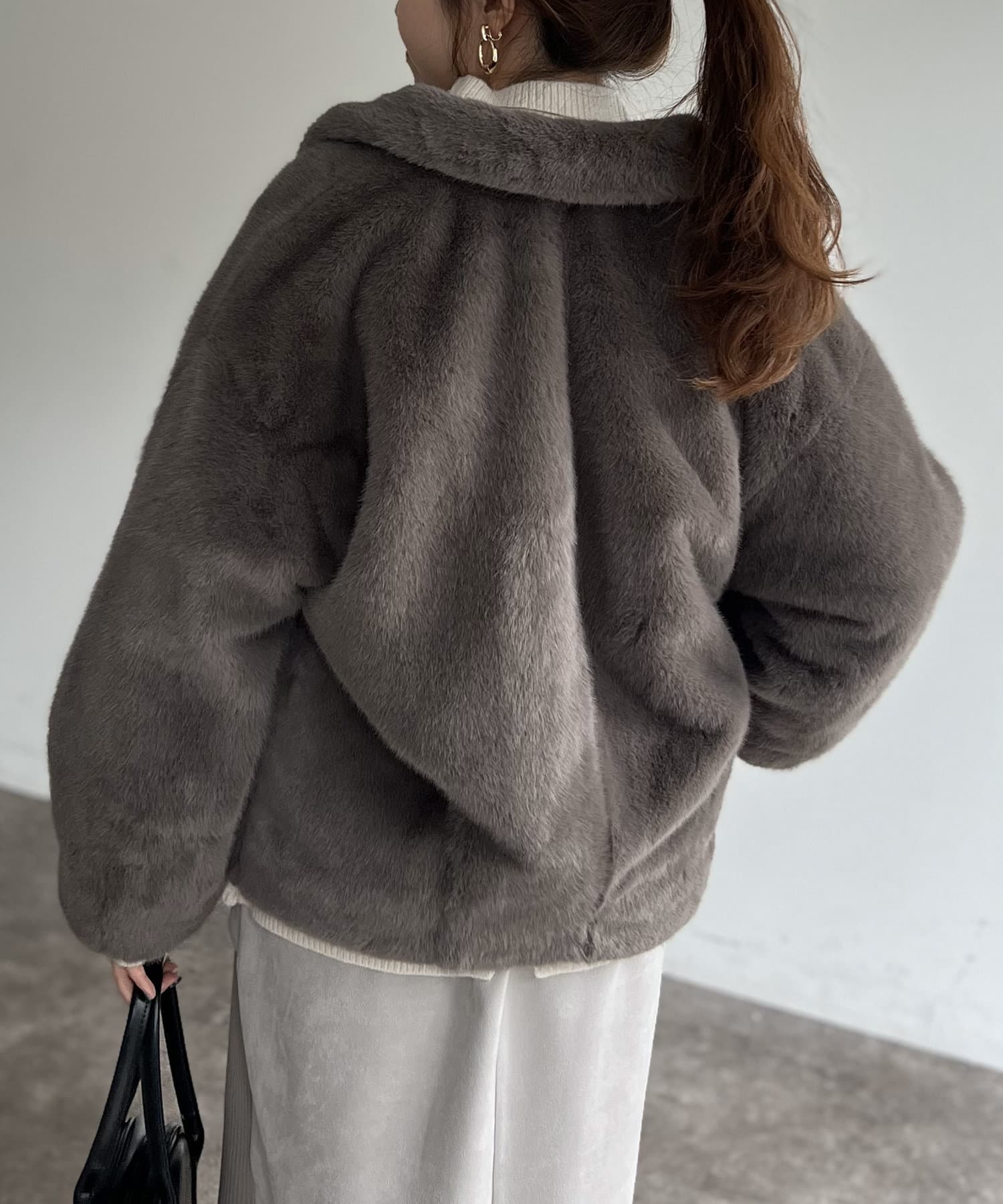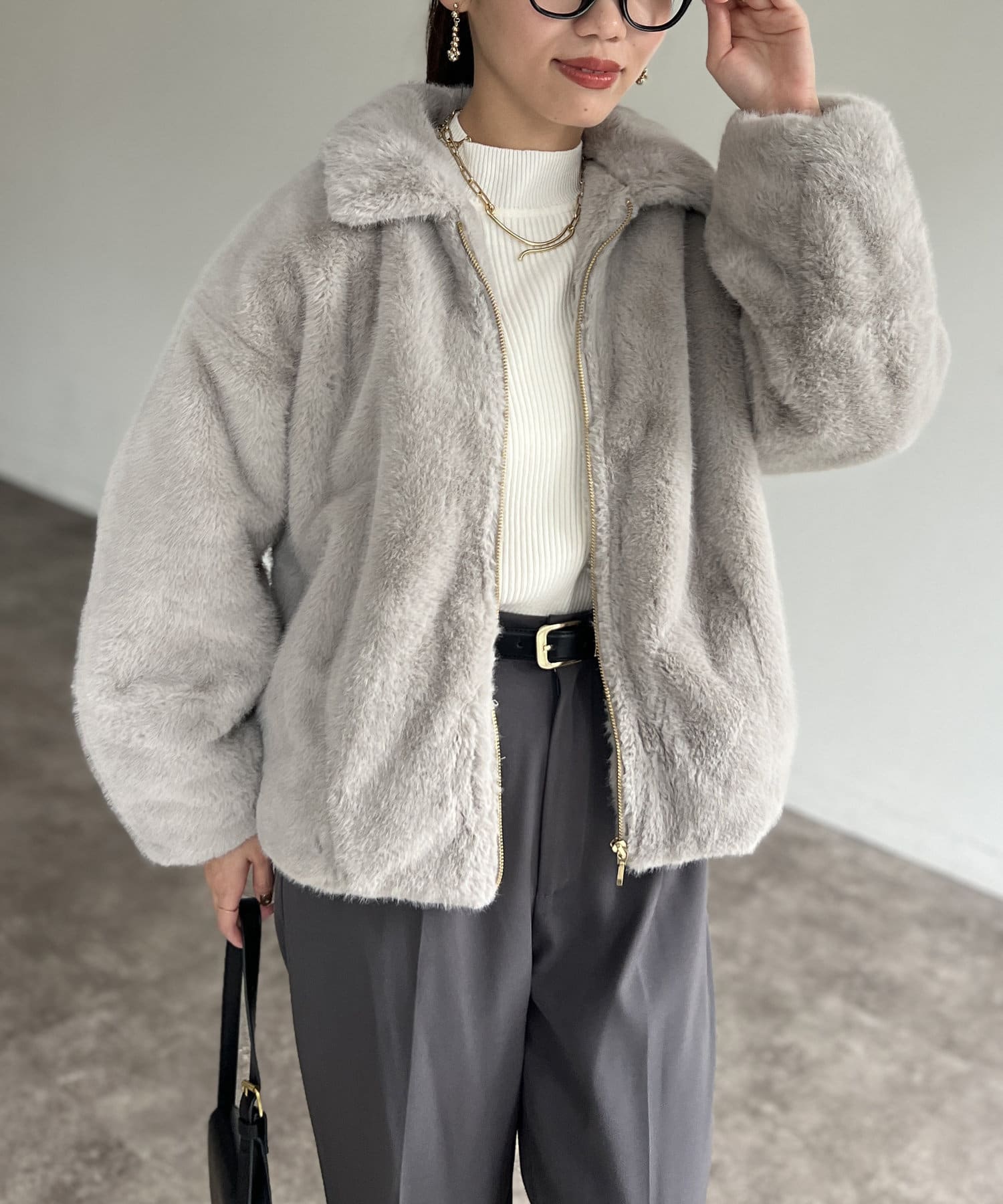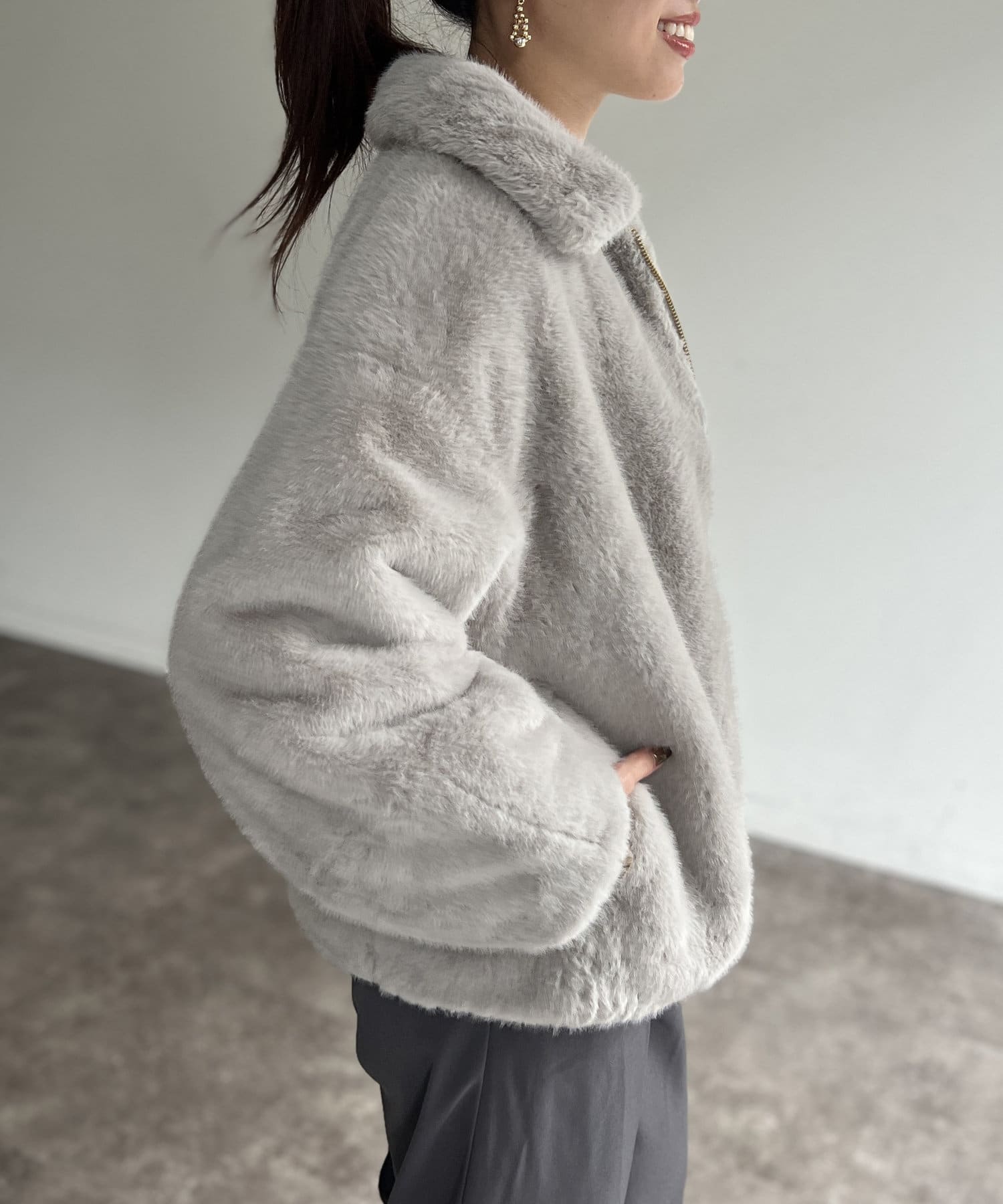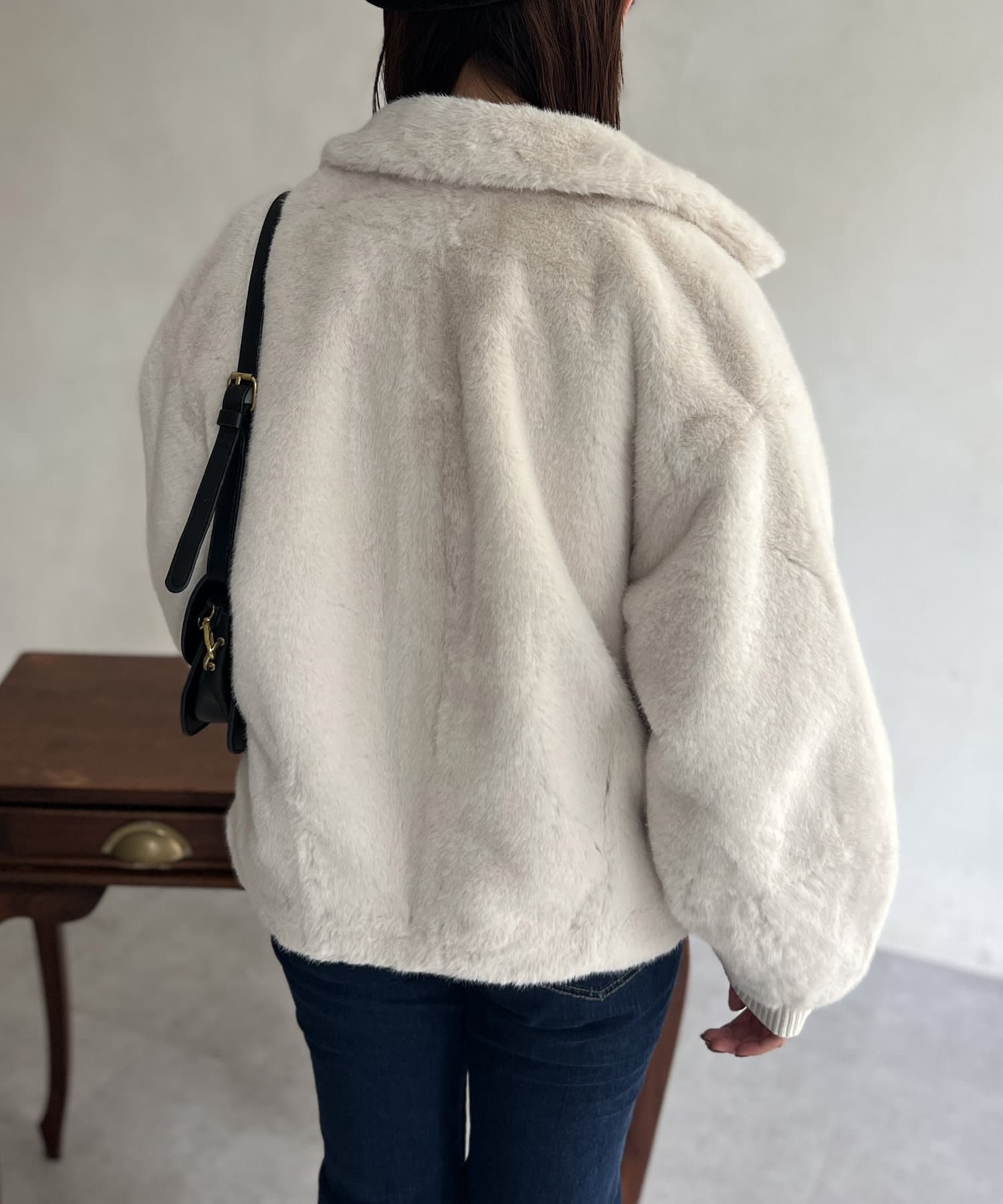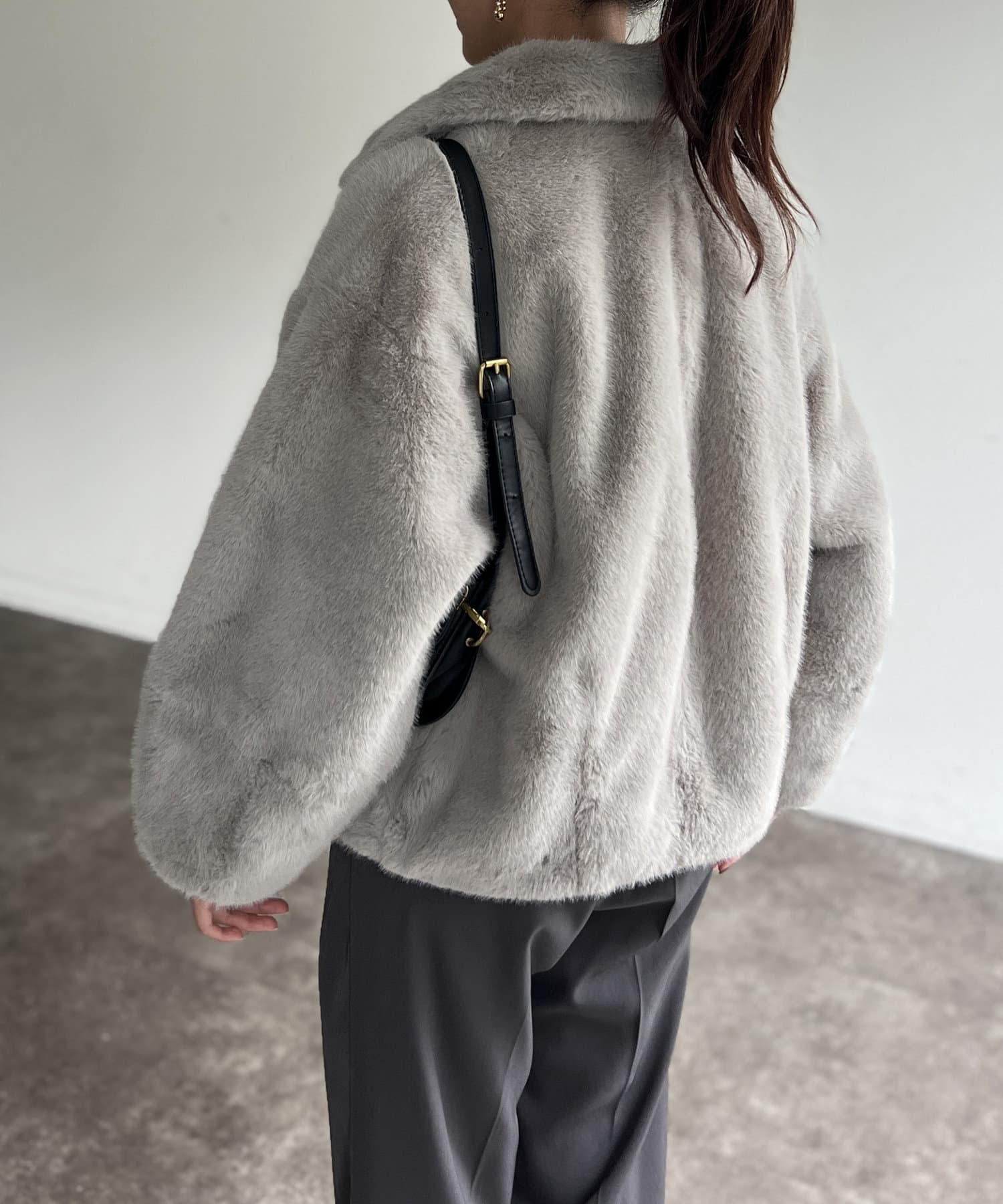 ふわふわの柔らかいフェイクファー素材のジャケット。