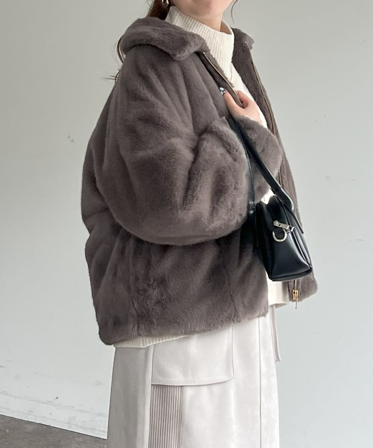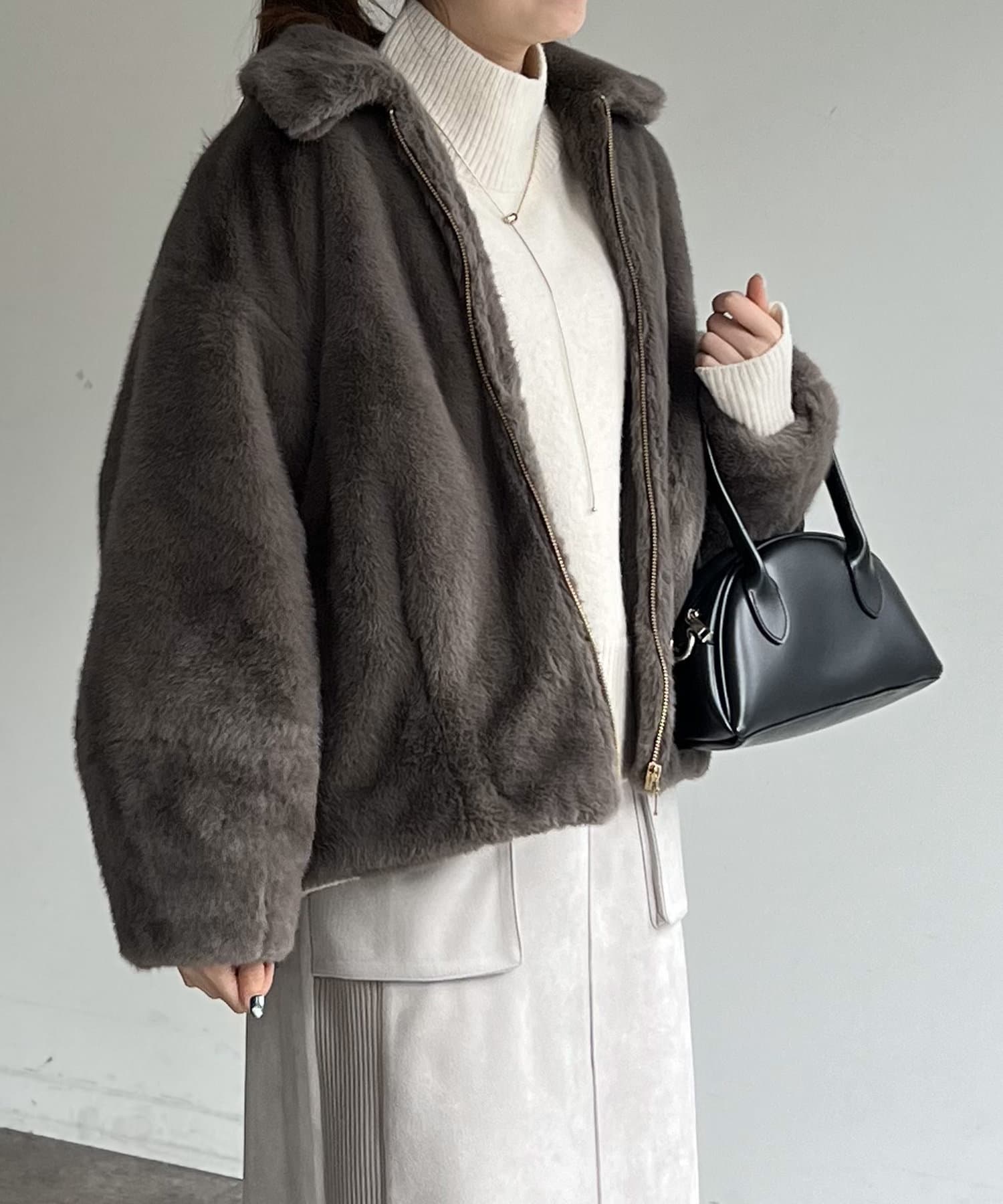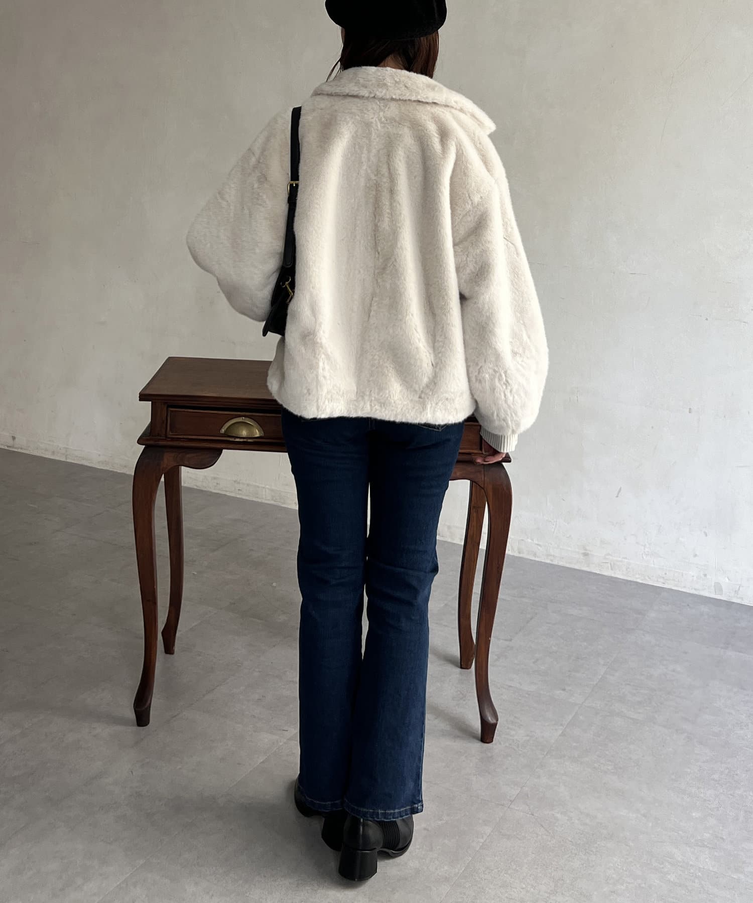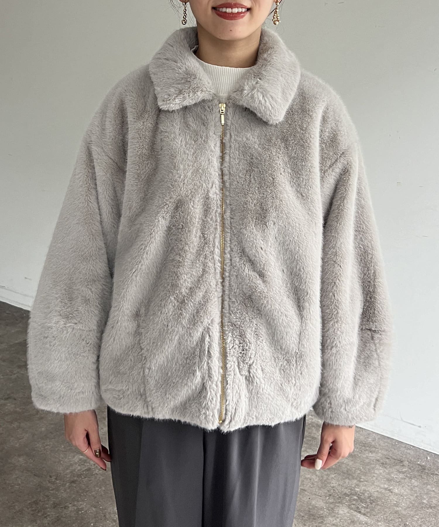 ふわふわの柔らかいフェイクファー素材のジャケット。