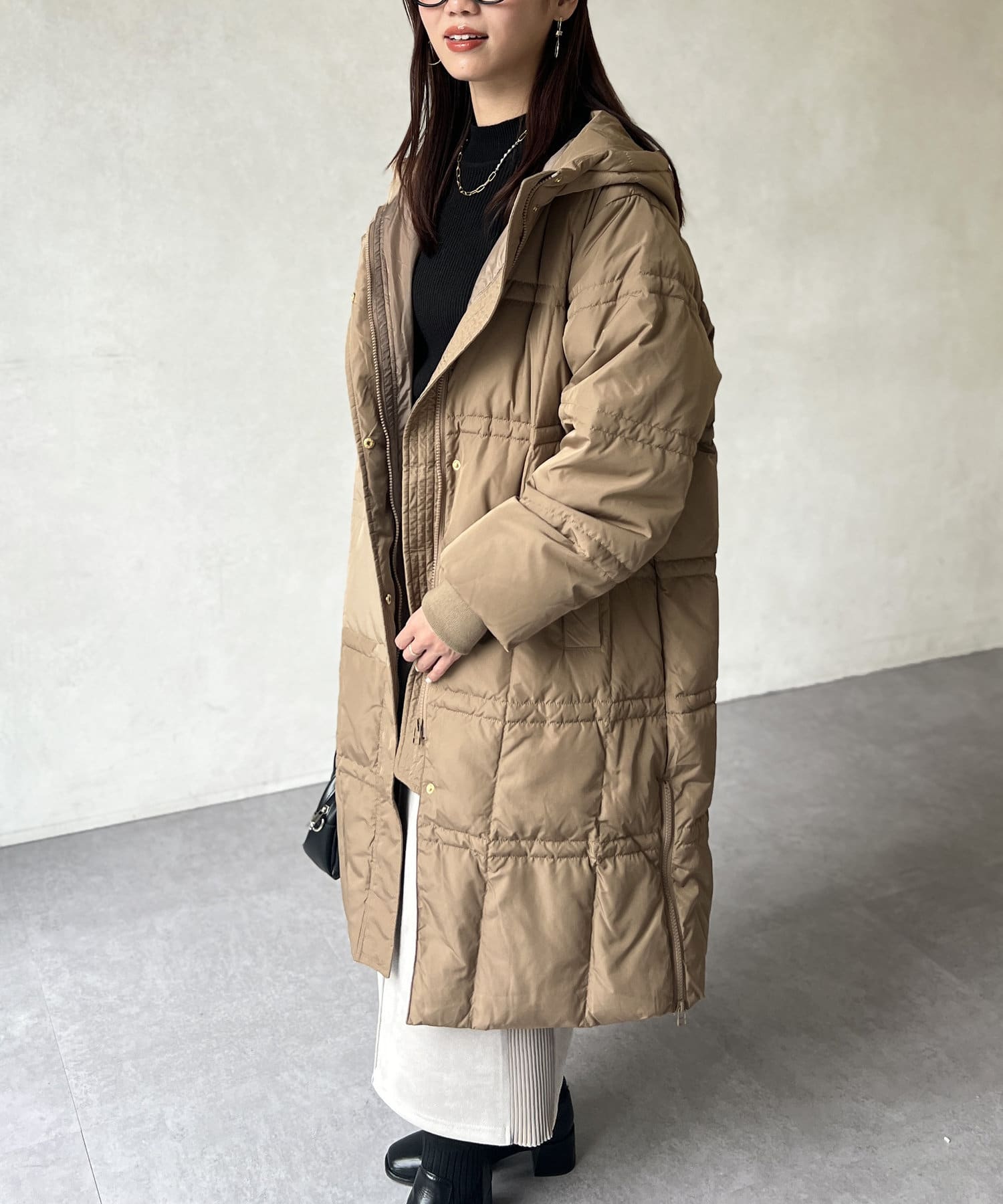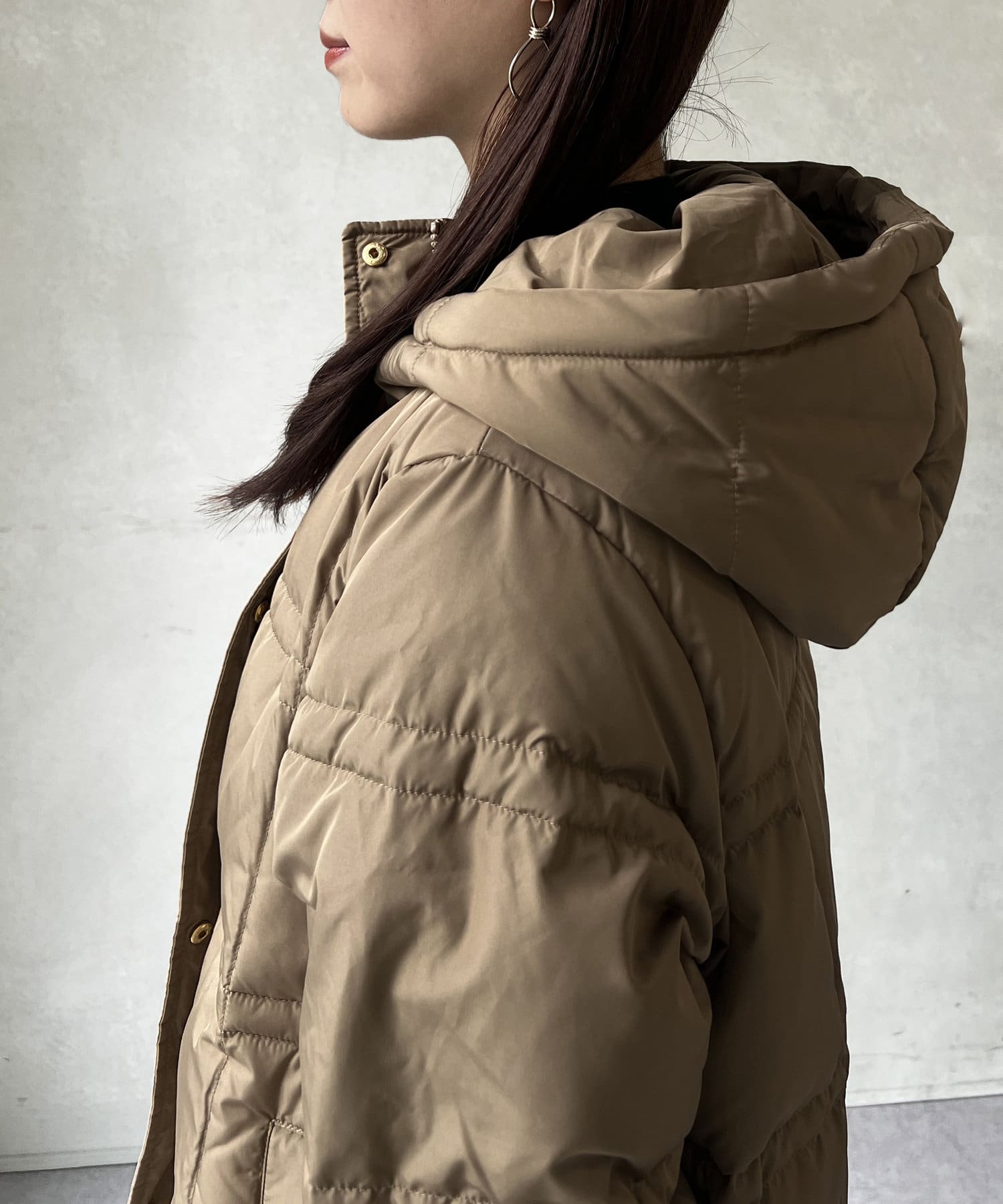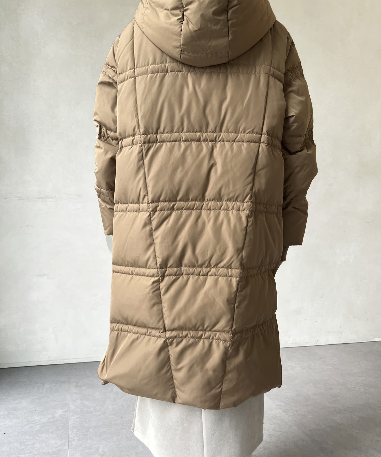 細見え効果のあるステッチデザインがポイントのフード付きロングダウン。