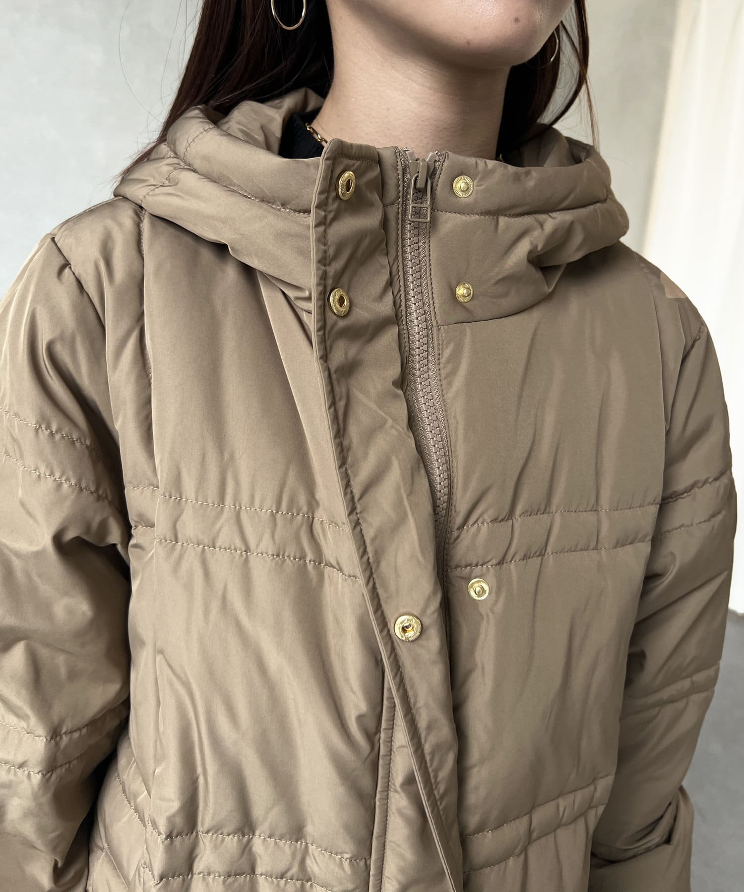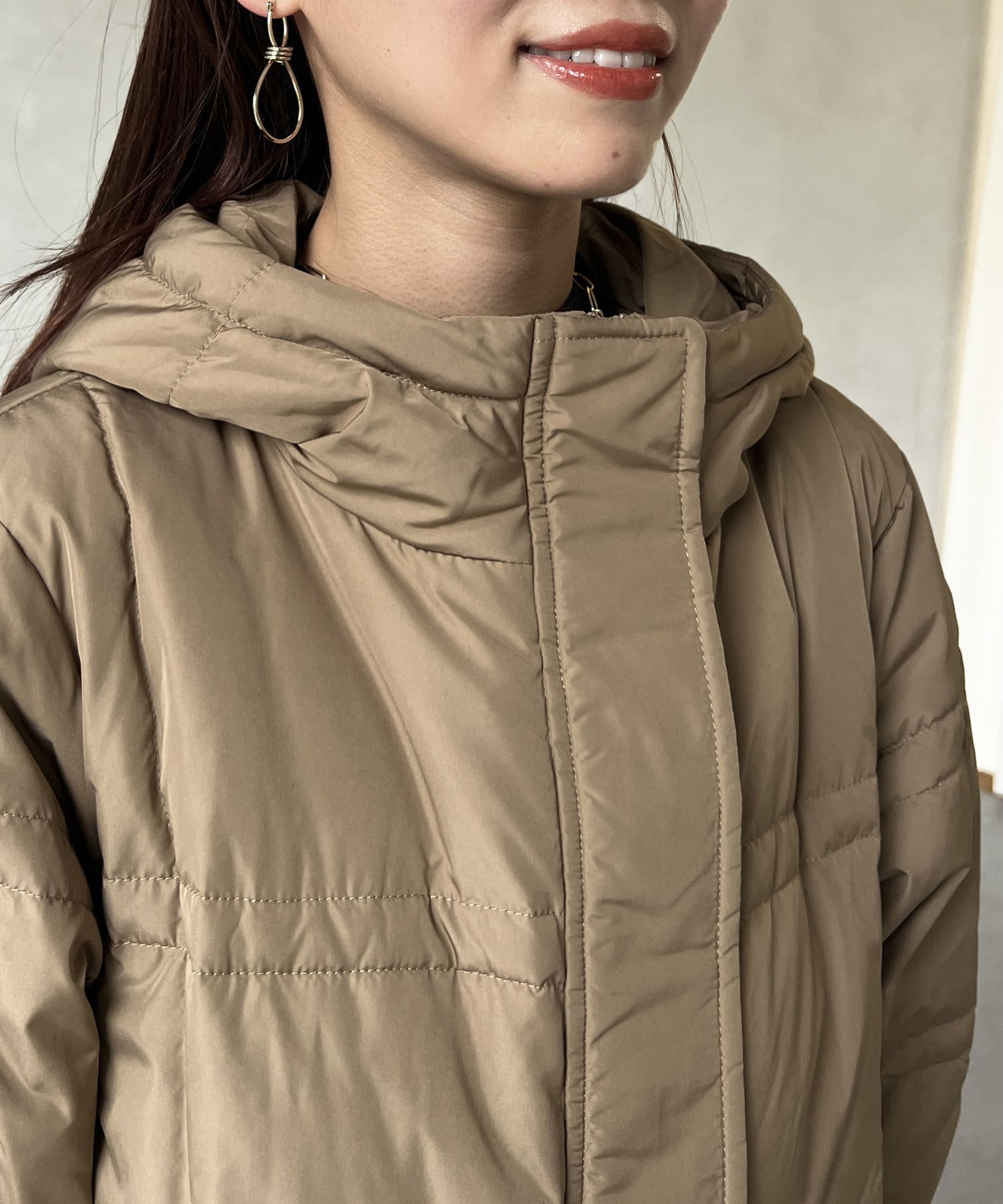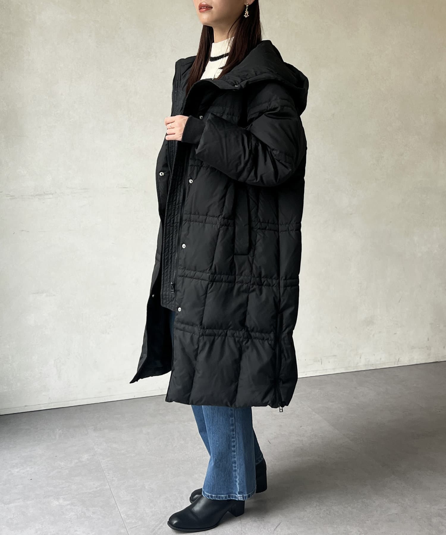 細見え効果のあるステッチデザインがポイントのフード付きロングダウン。