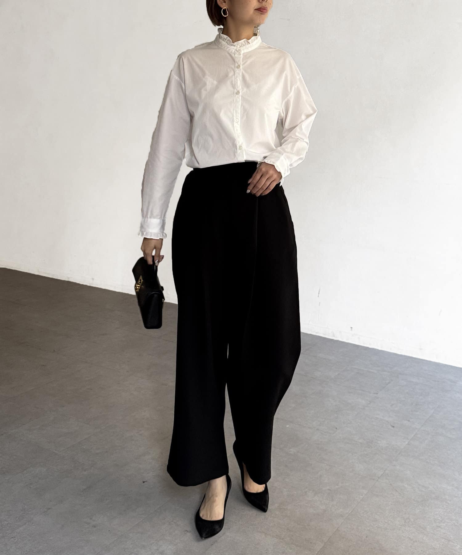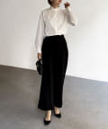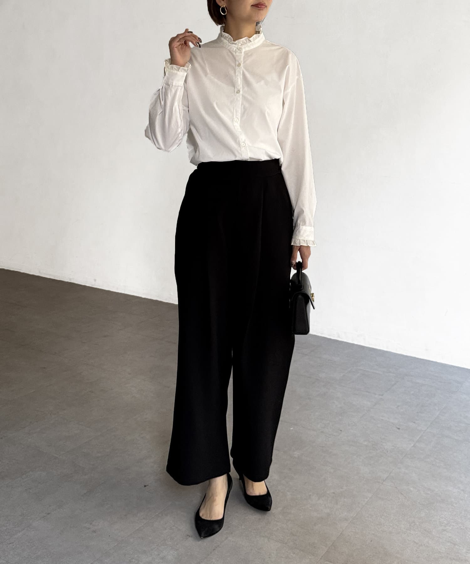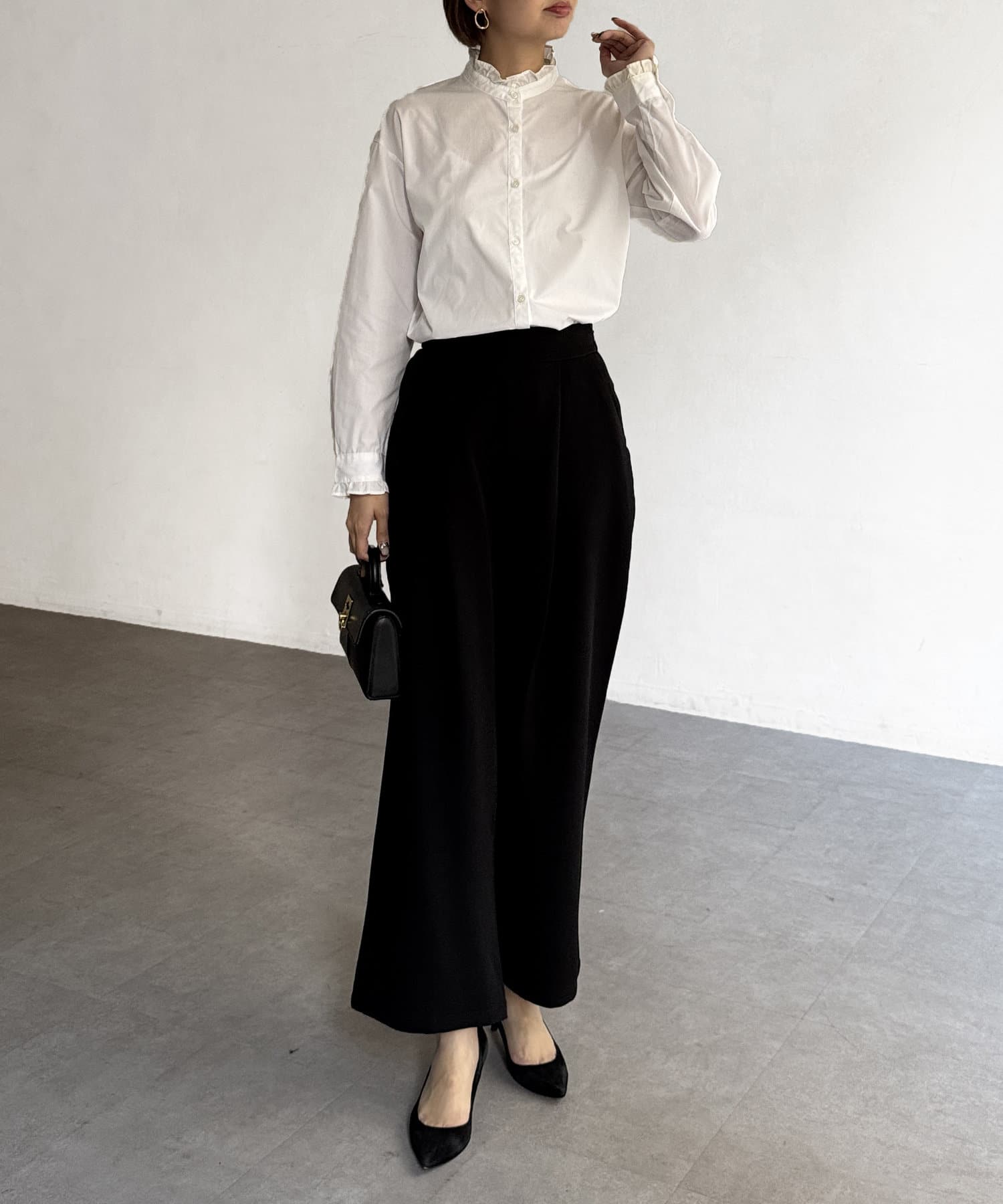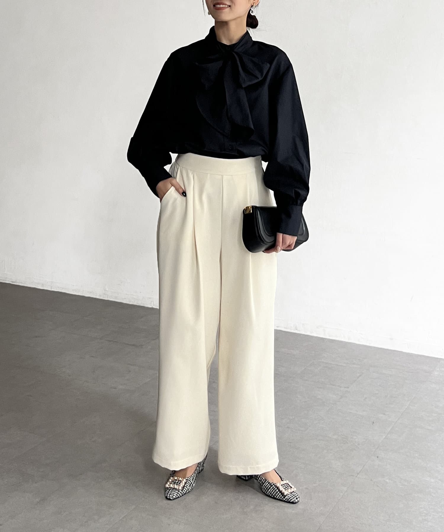 ブラウスやニットなどキレイめなスタイリングから、パーカーやロンTなどカジュアルな