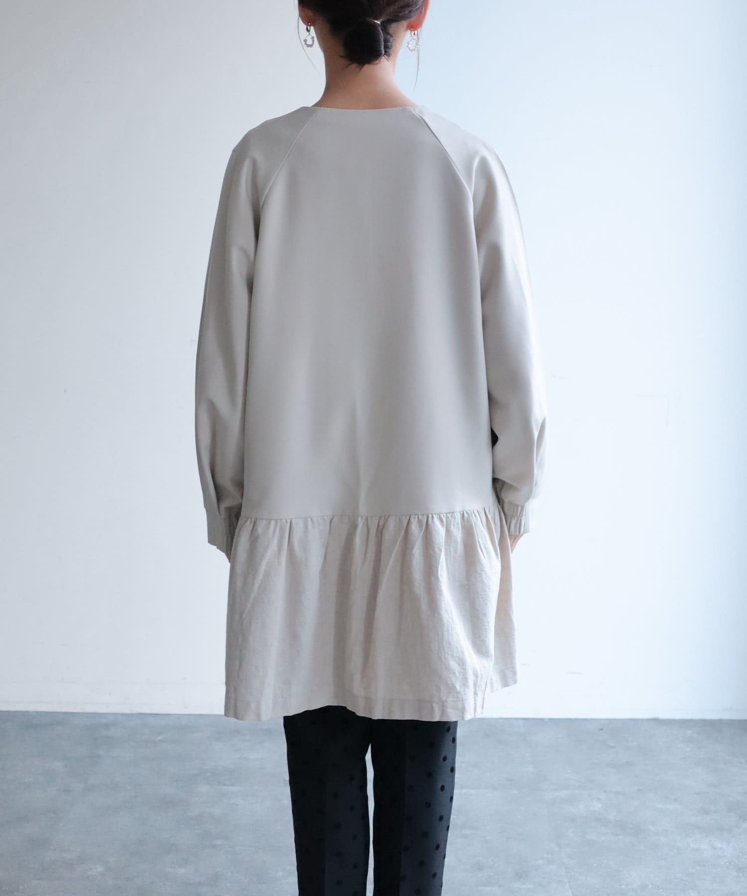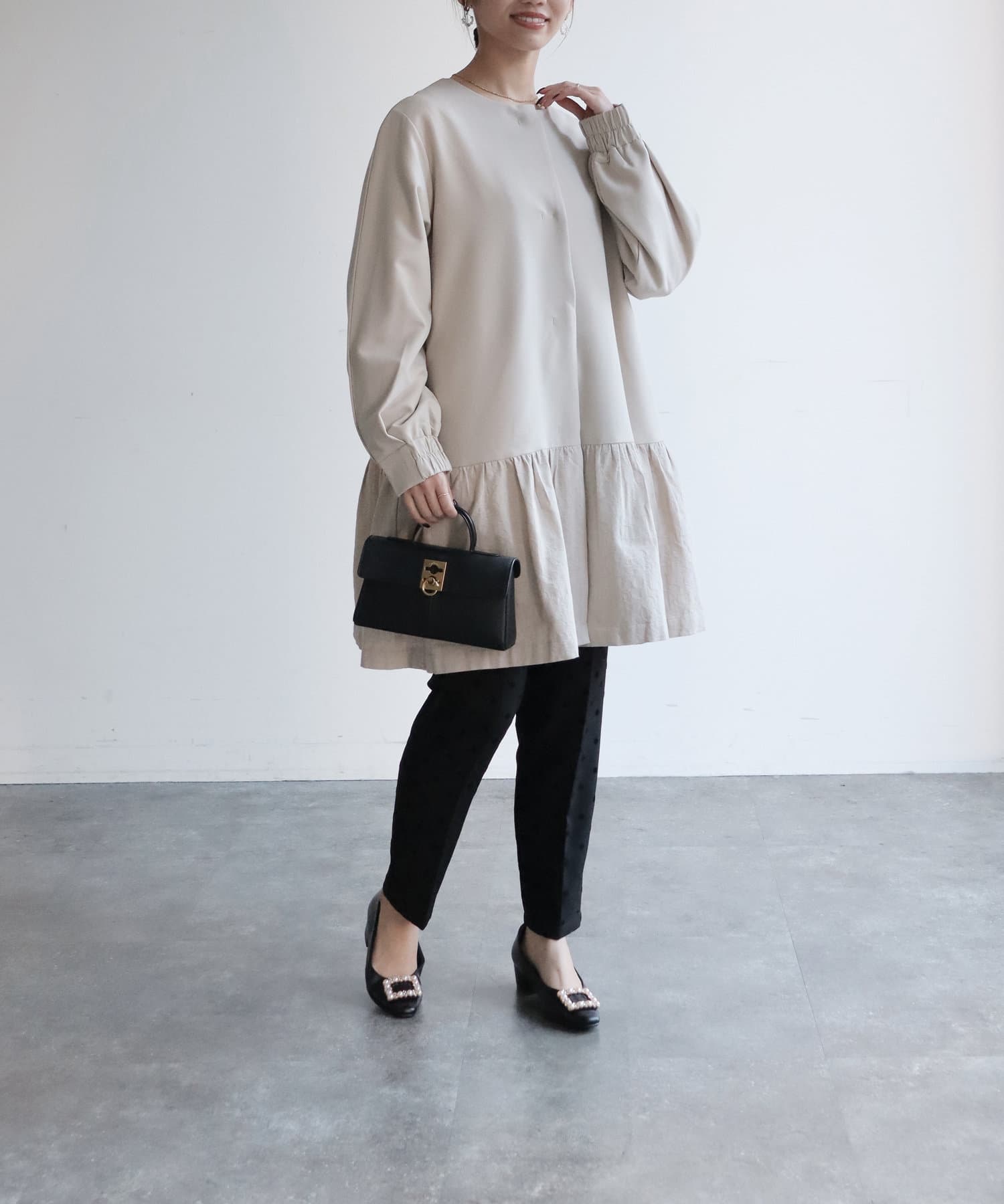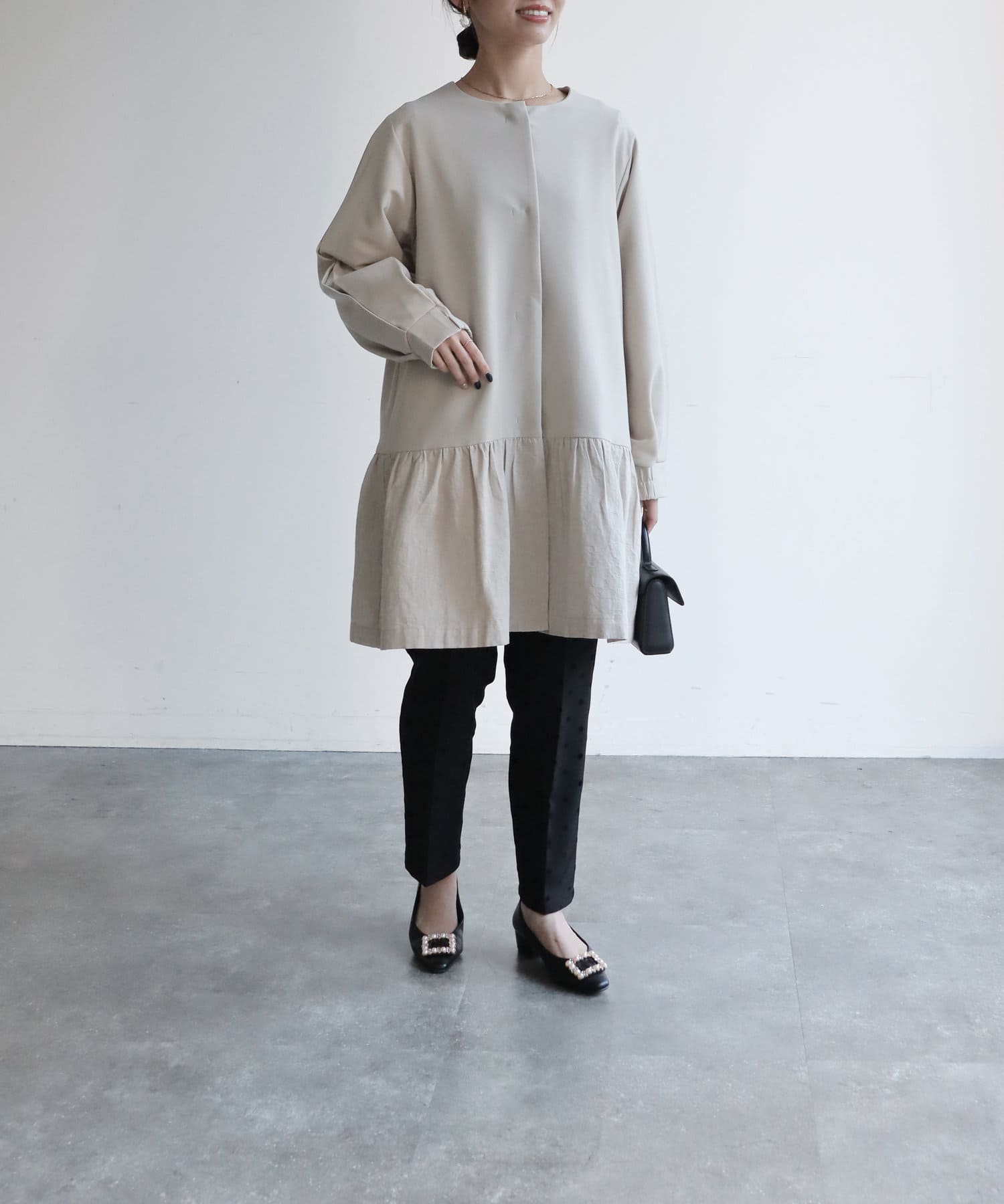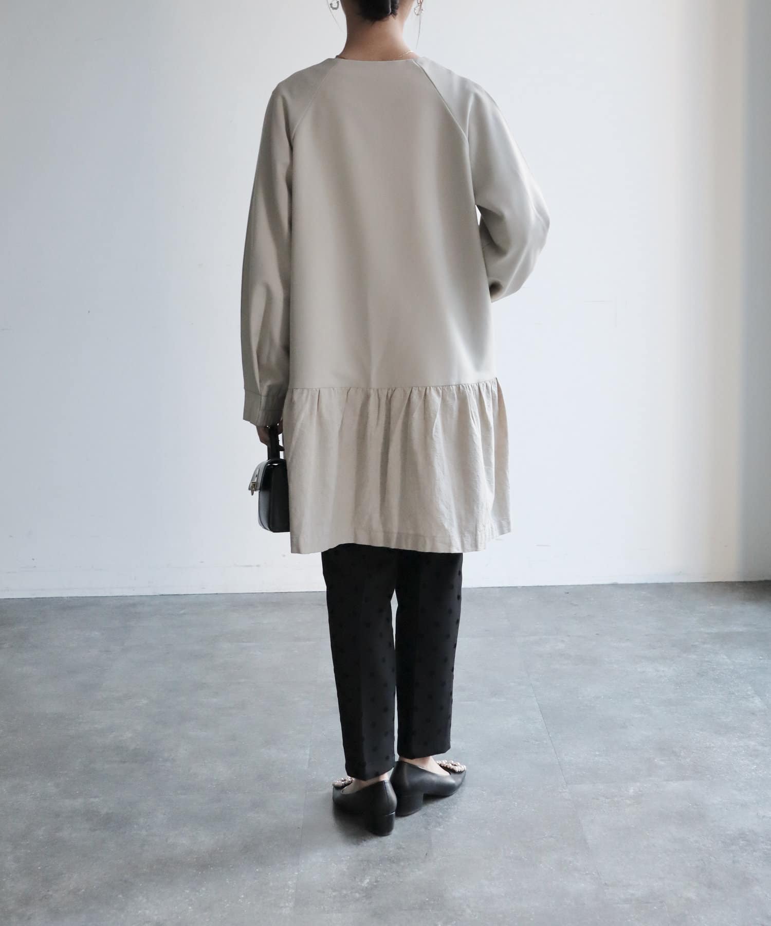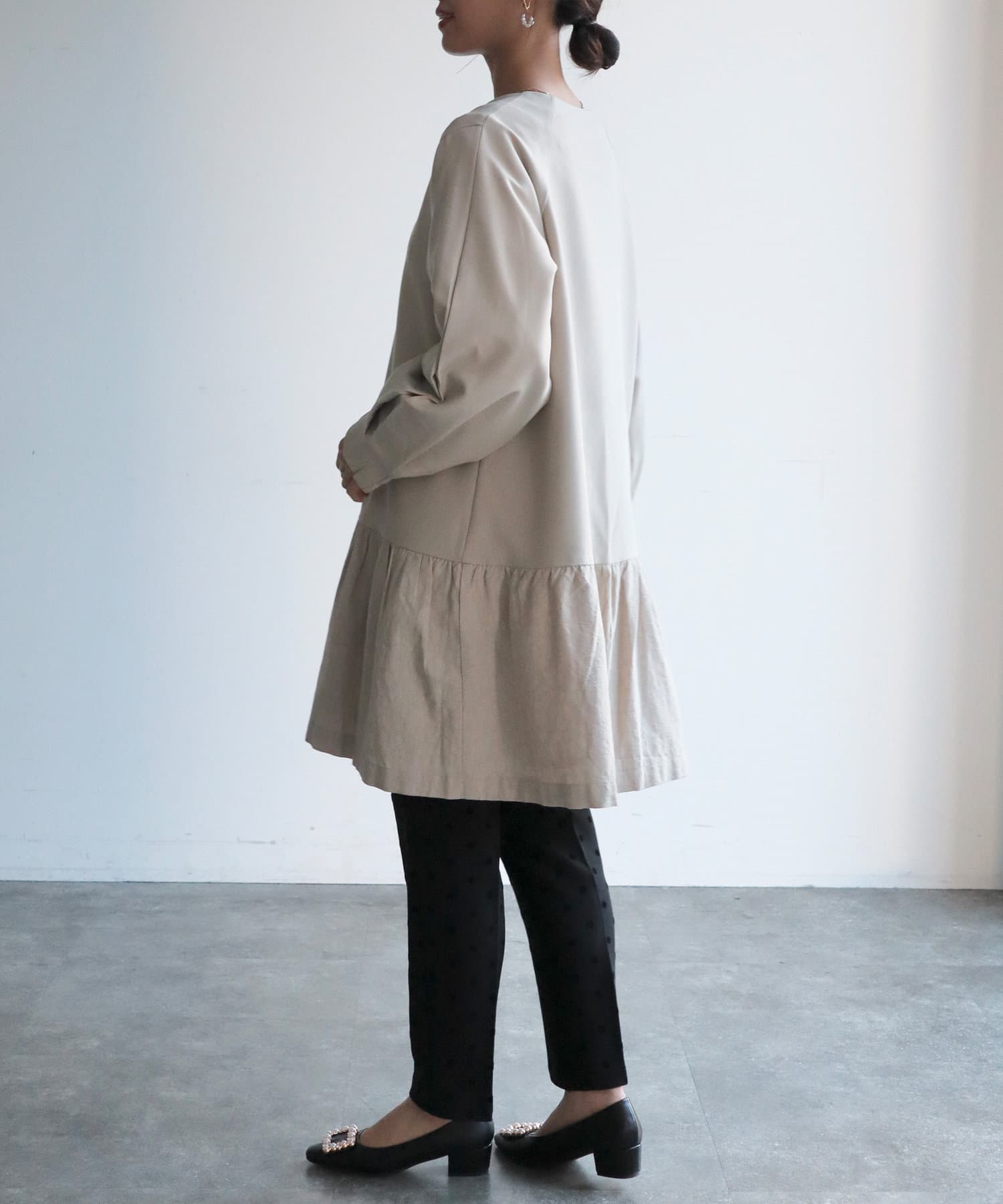 ペプラムの素材は異素材の生地を使用し、広がりすぎないシルエットは