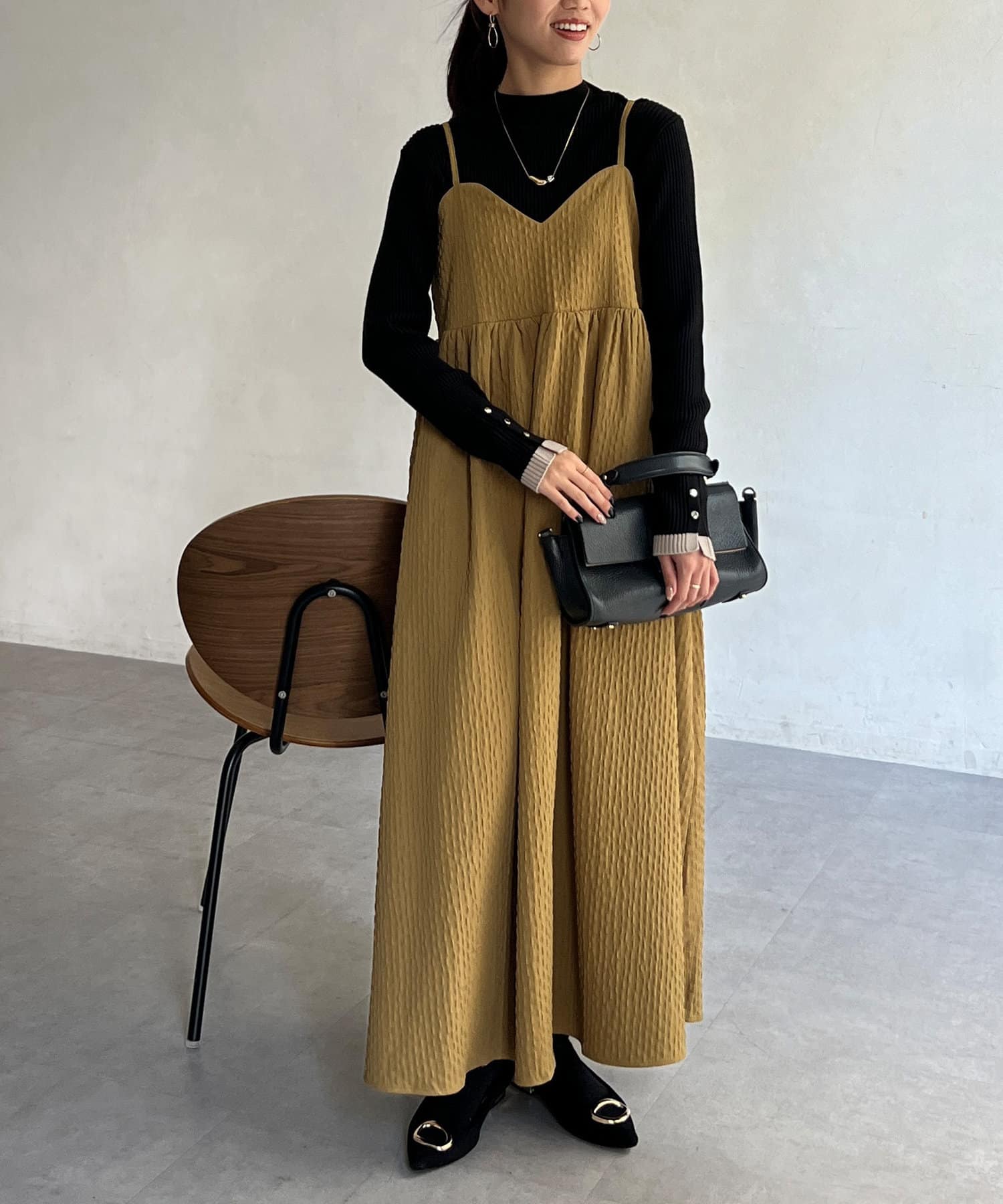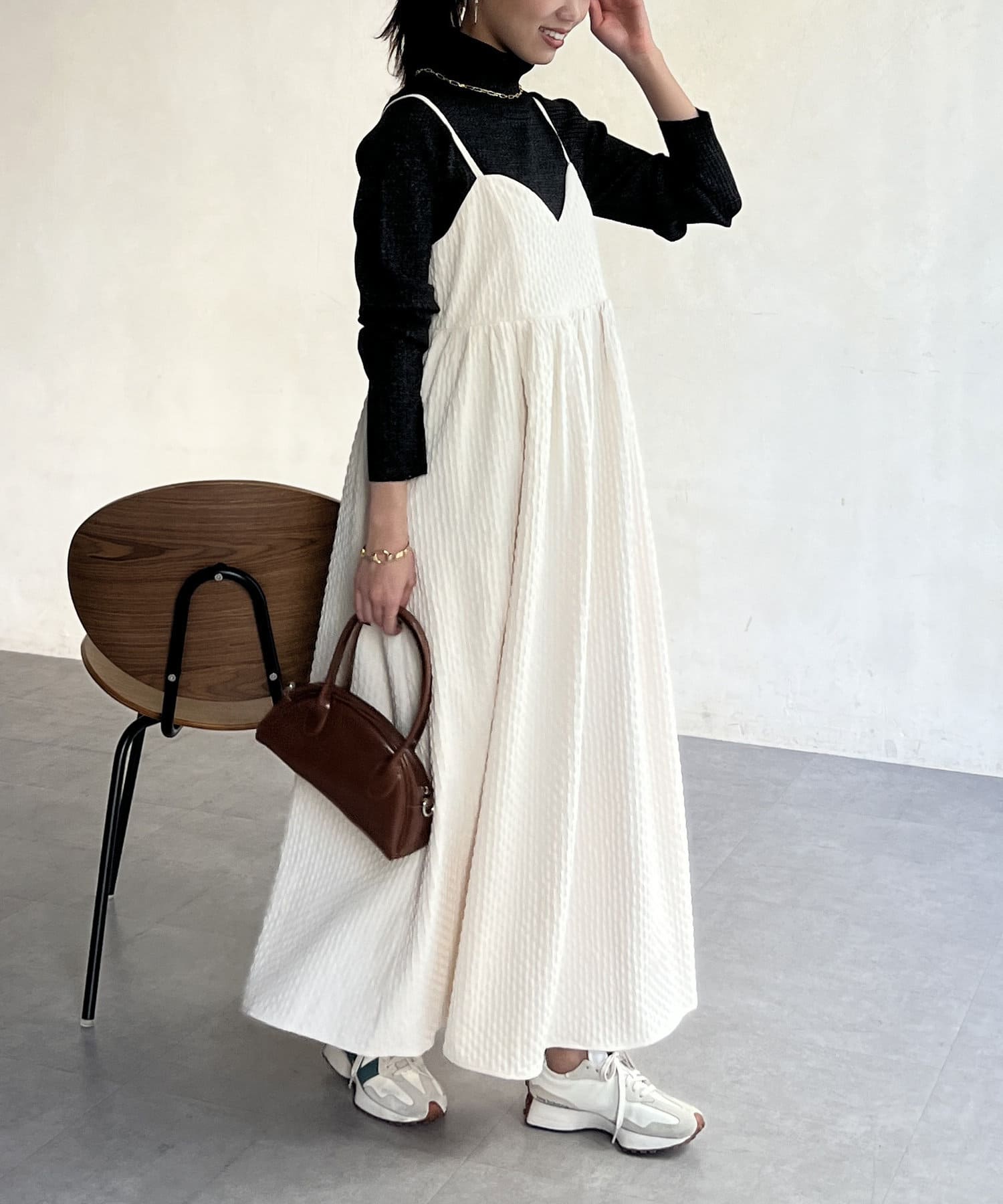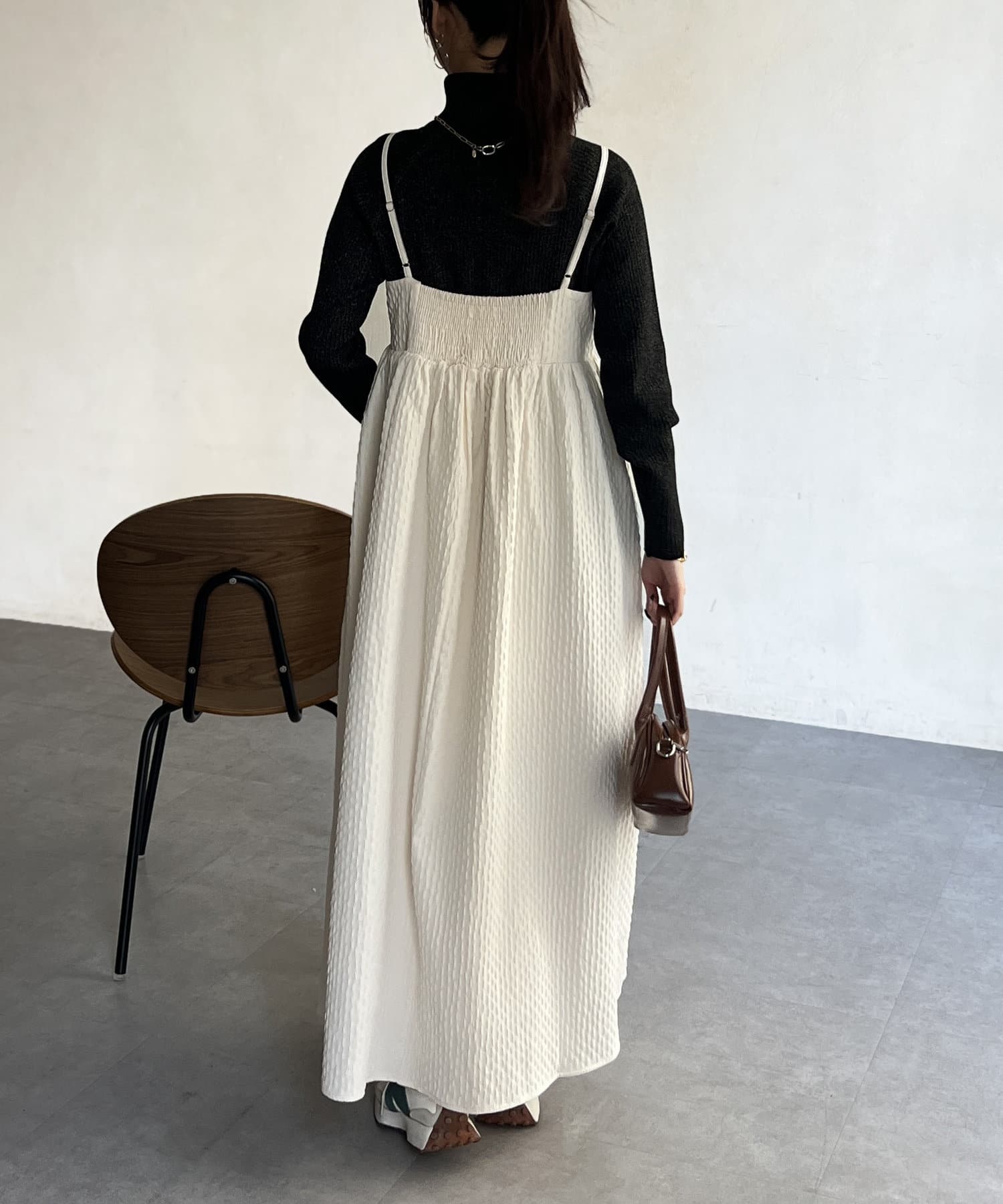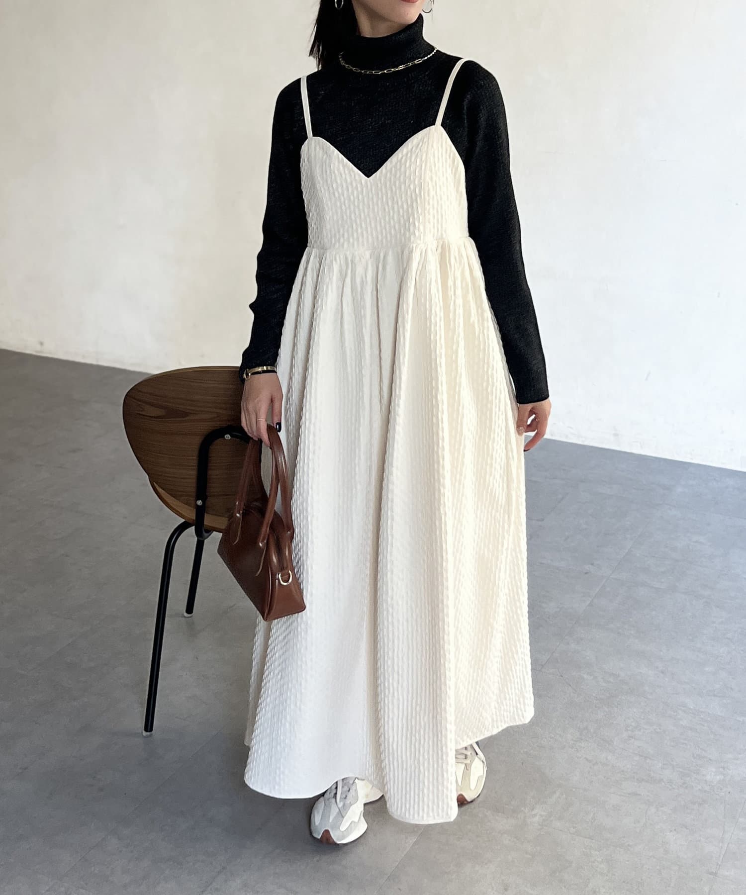エレガントな印象のジャガード生地を使用した女性らしいキャミワンピース。