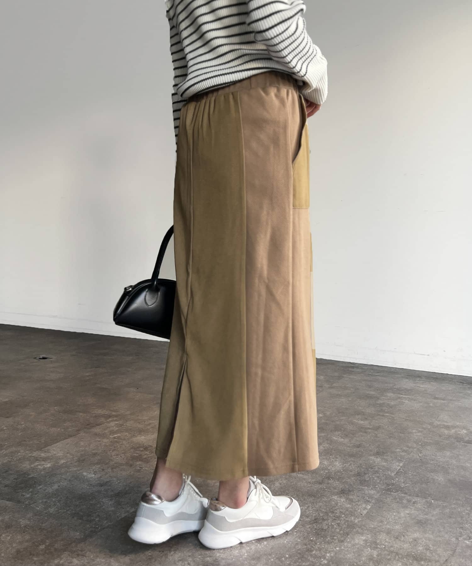 サイドに異素材生地を使用し、体のラインを拾いすぎない絶妙なシルエットが嬉しいポイント。