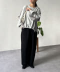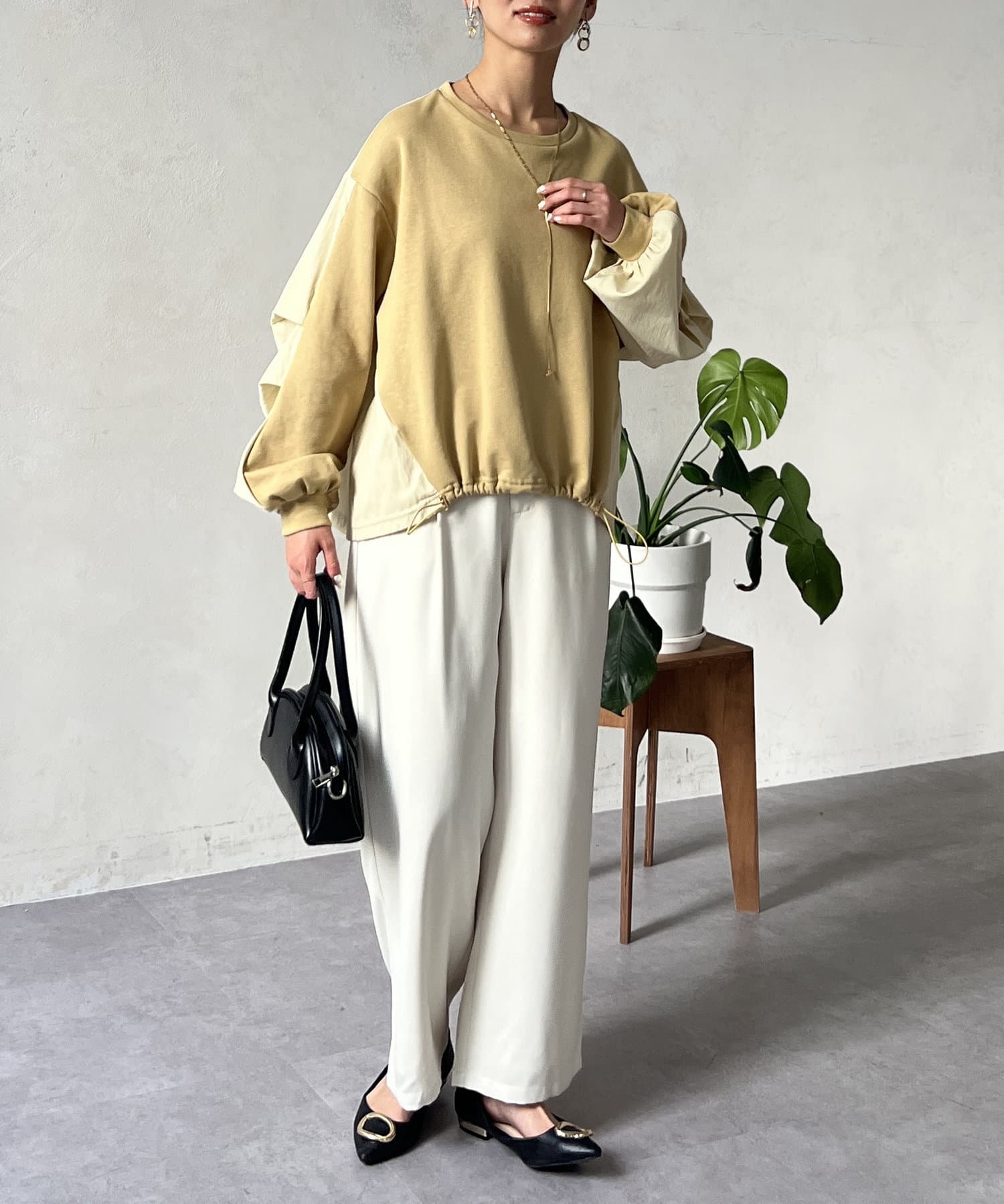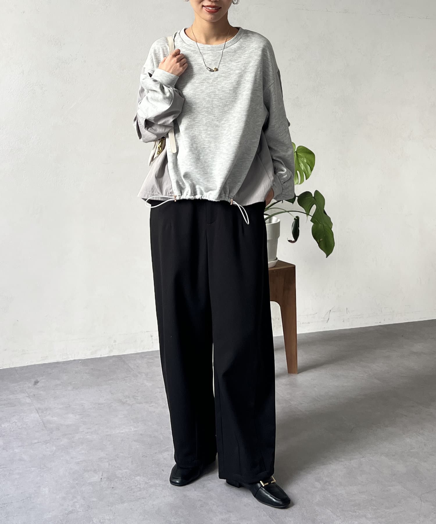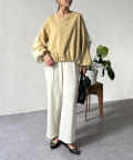 落ち感のあるワイドパンツを合わせ、抜け感のあるゆるカジュアルスタイルに。