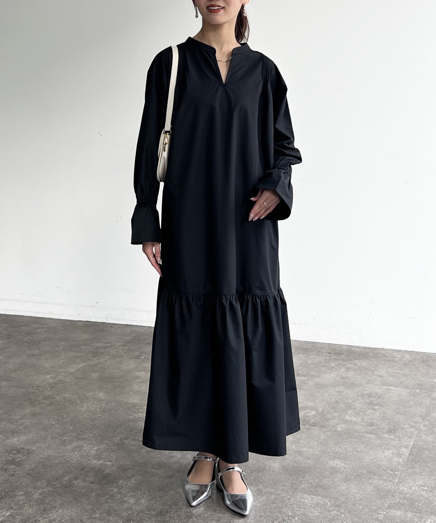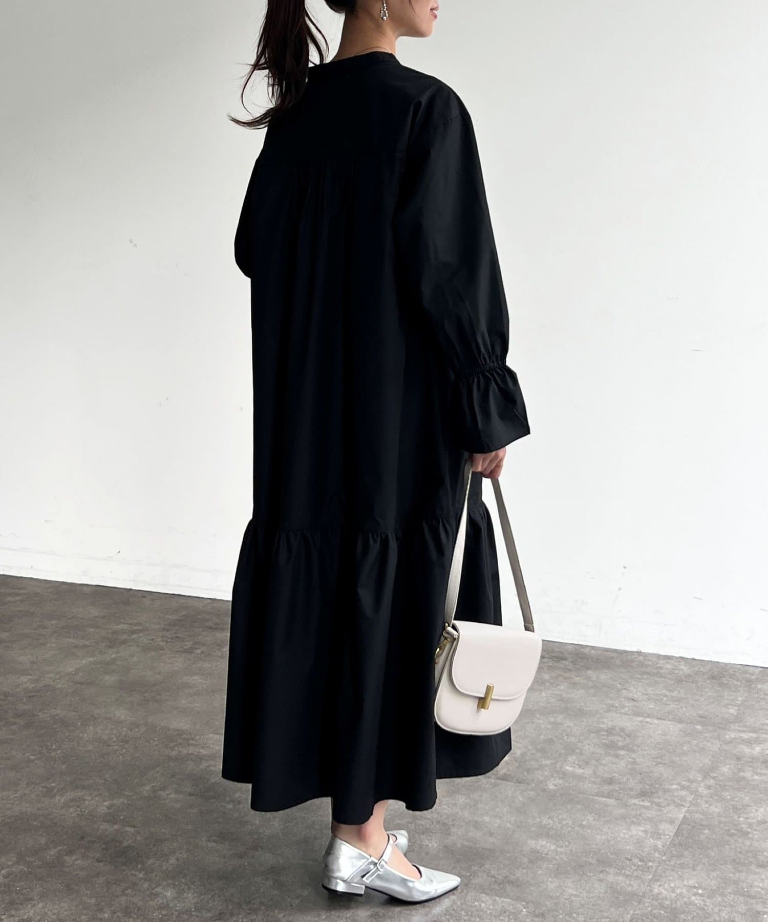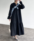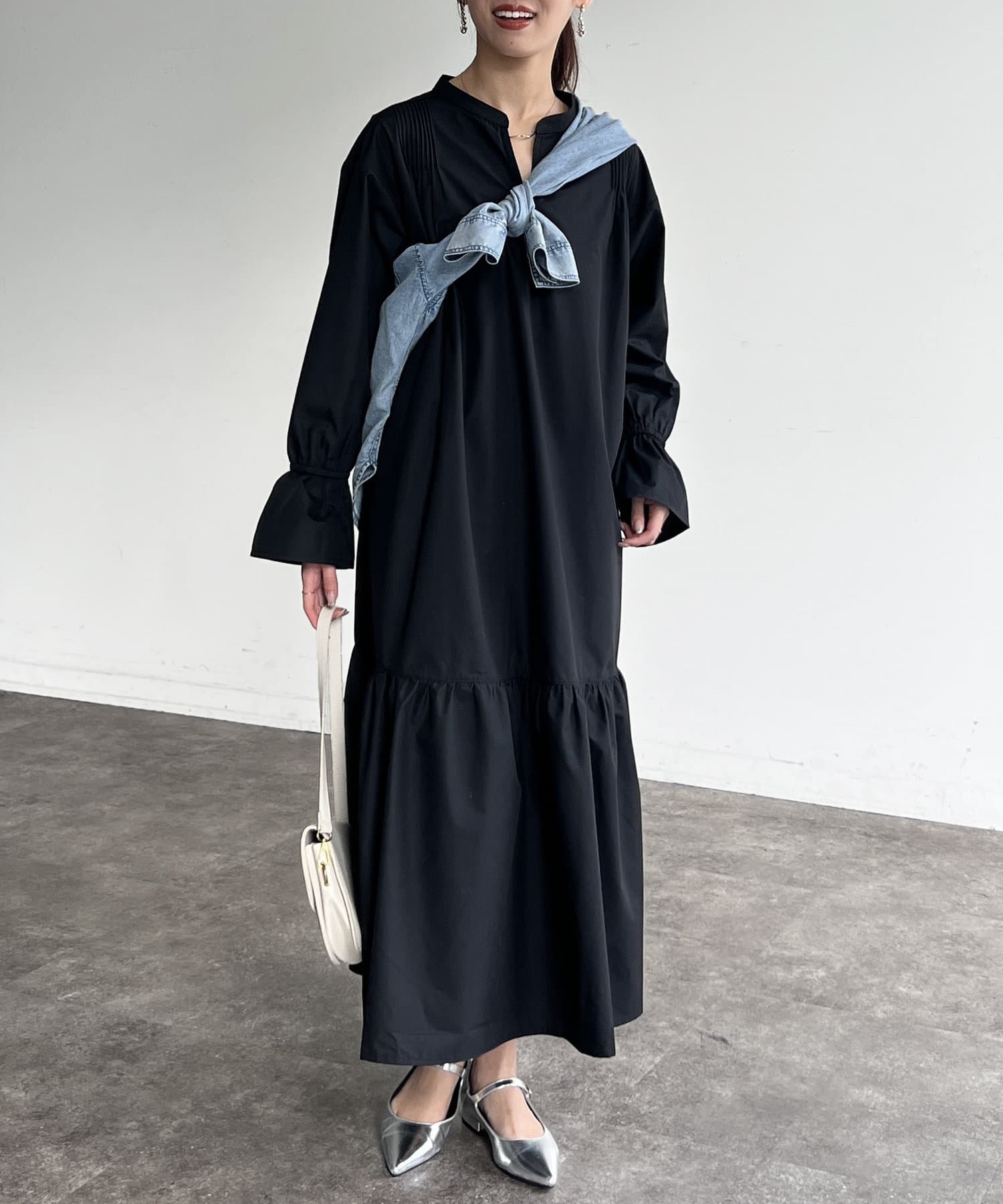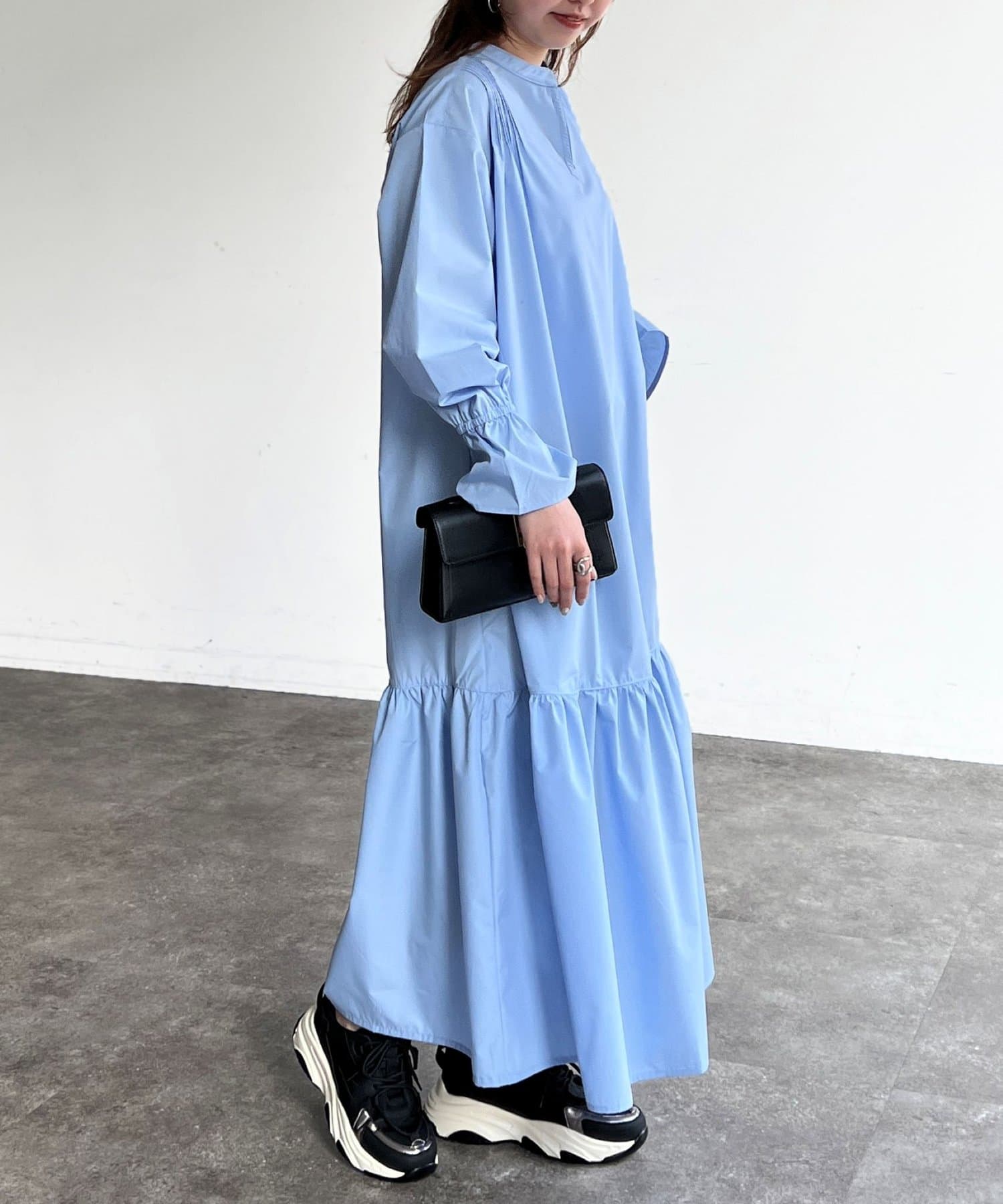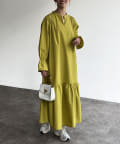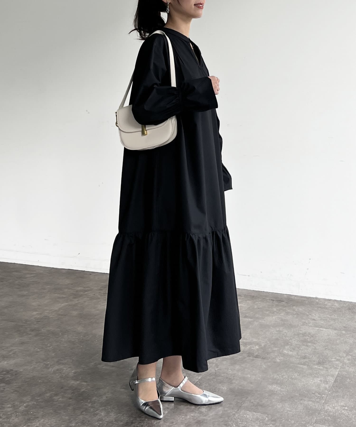 裾に向かって広がりの出るシルエットで、切り替えのティアードシルエットが大人ガーリーな雰囲気を醸し出してくれます。
