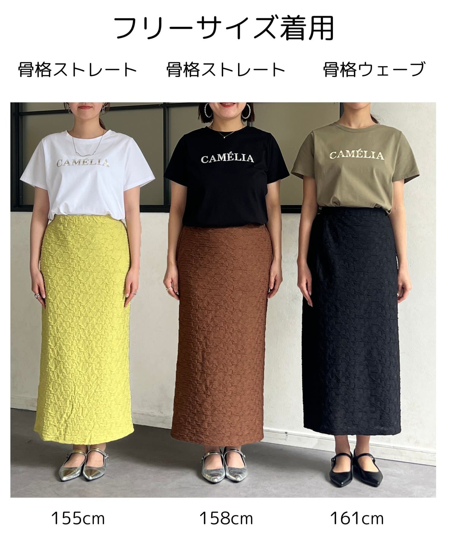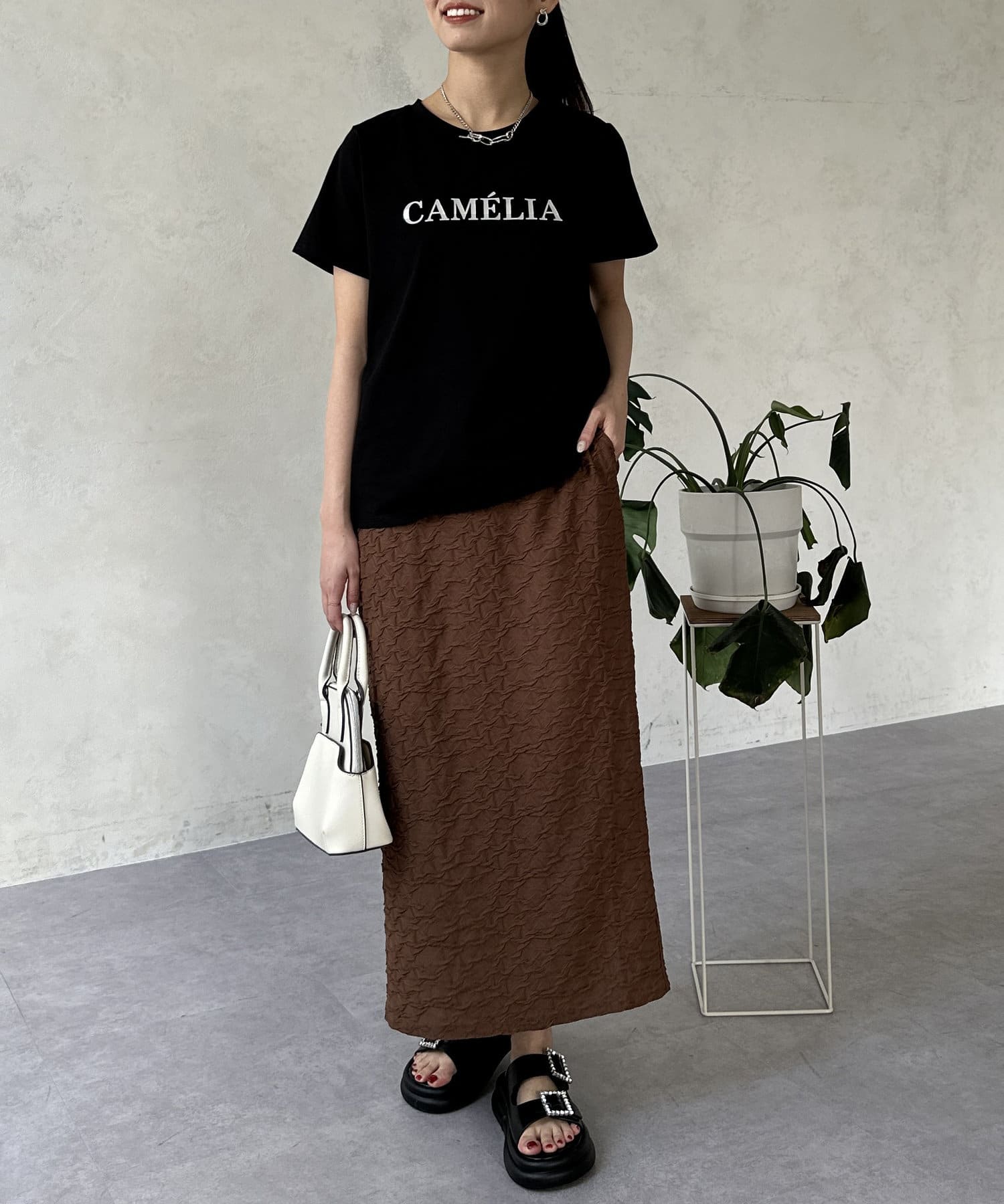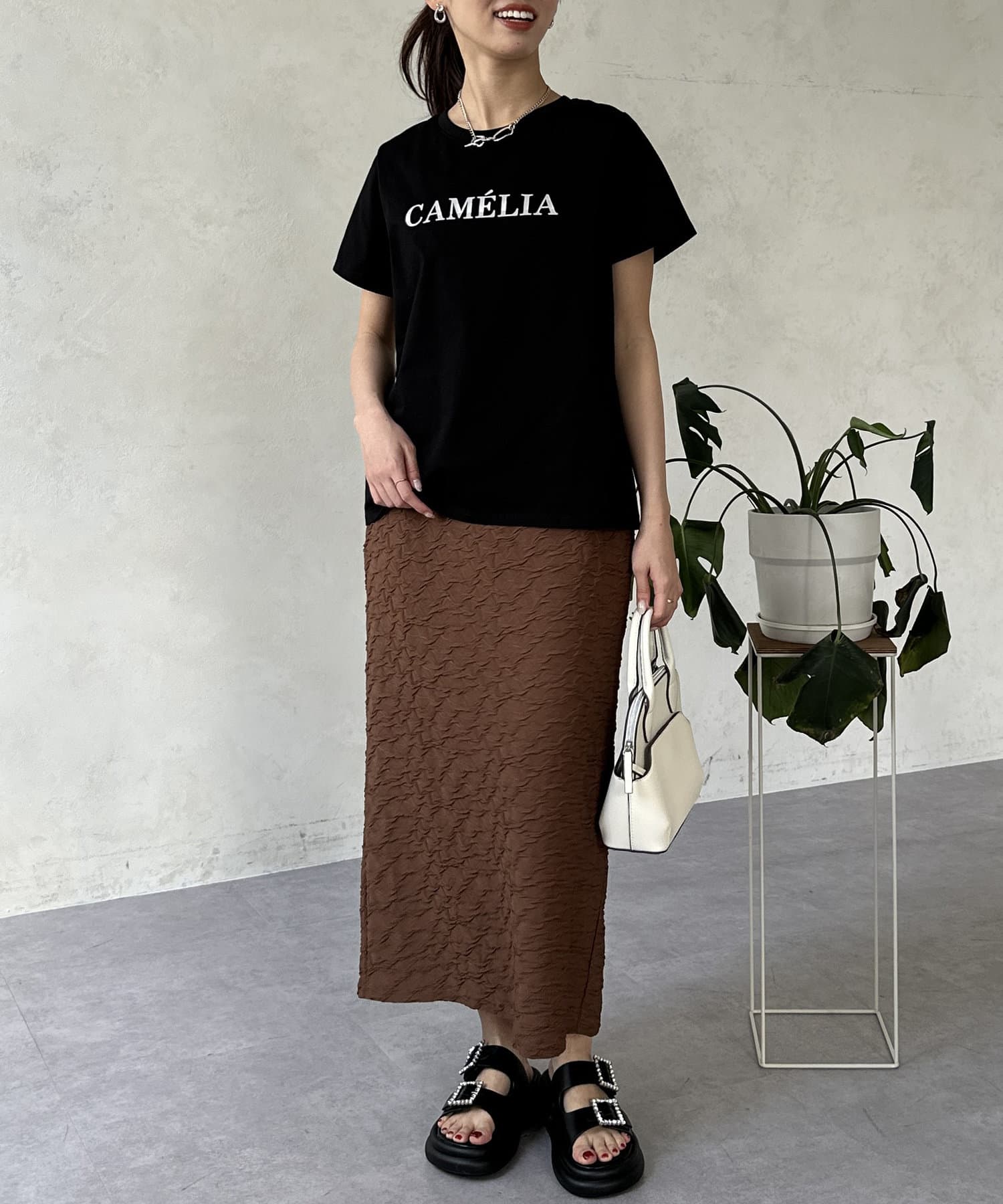 スカート一枚で華やかな印象になるので、ロゴTシャツなど