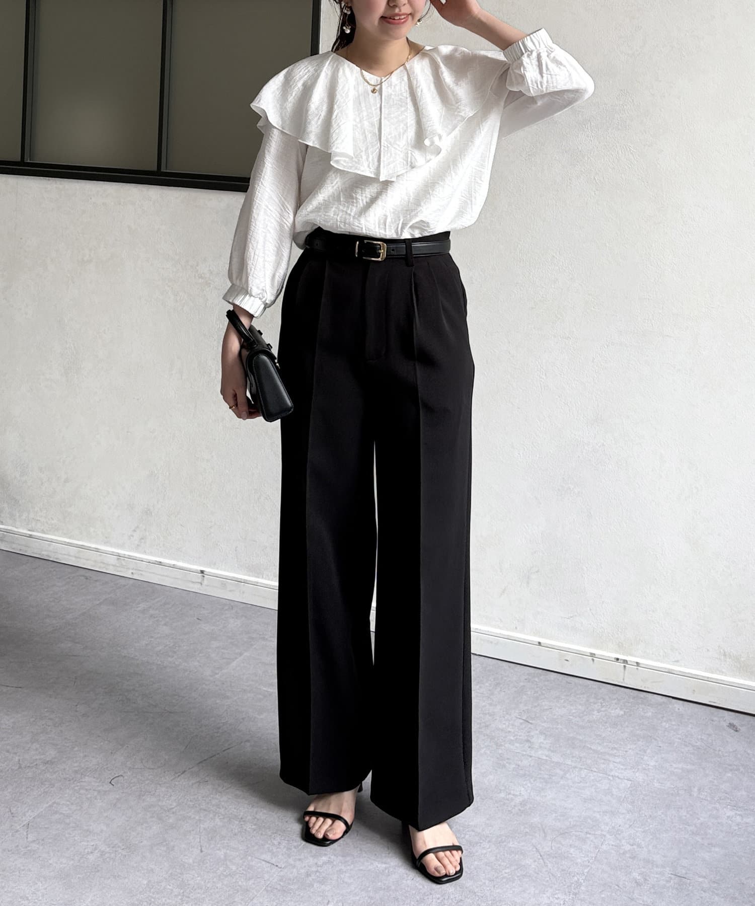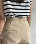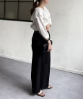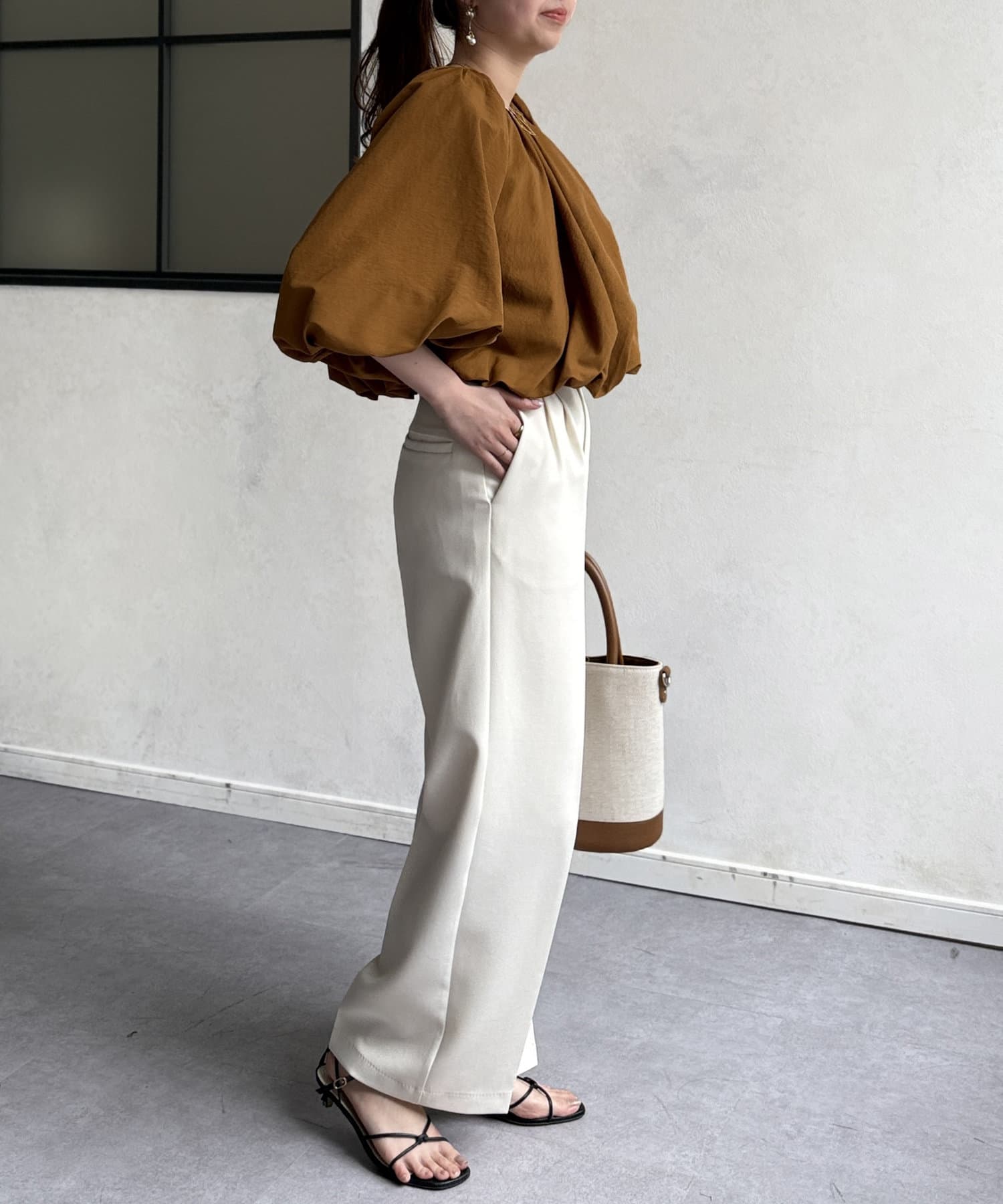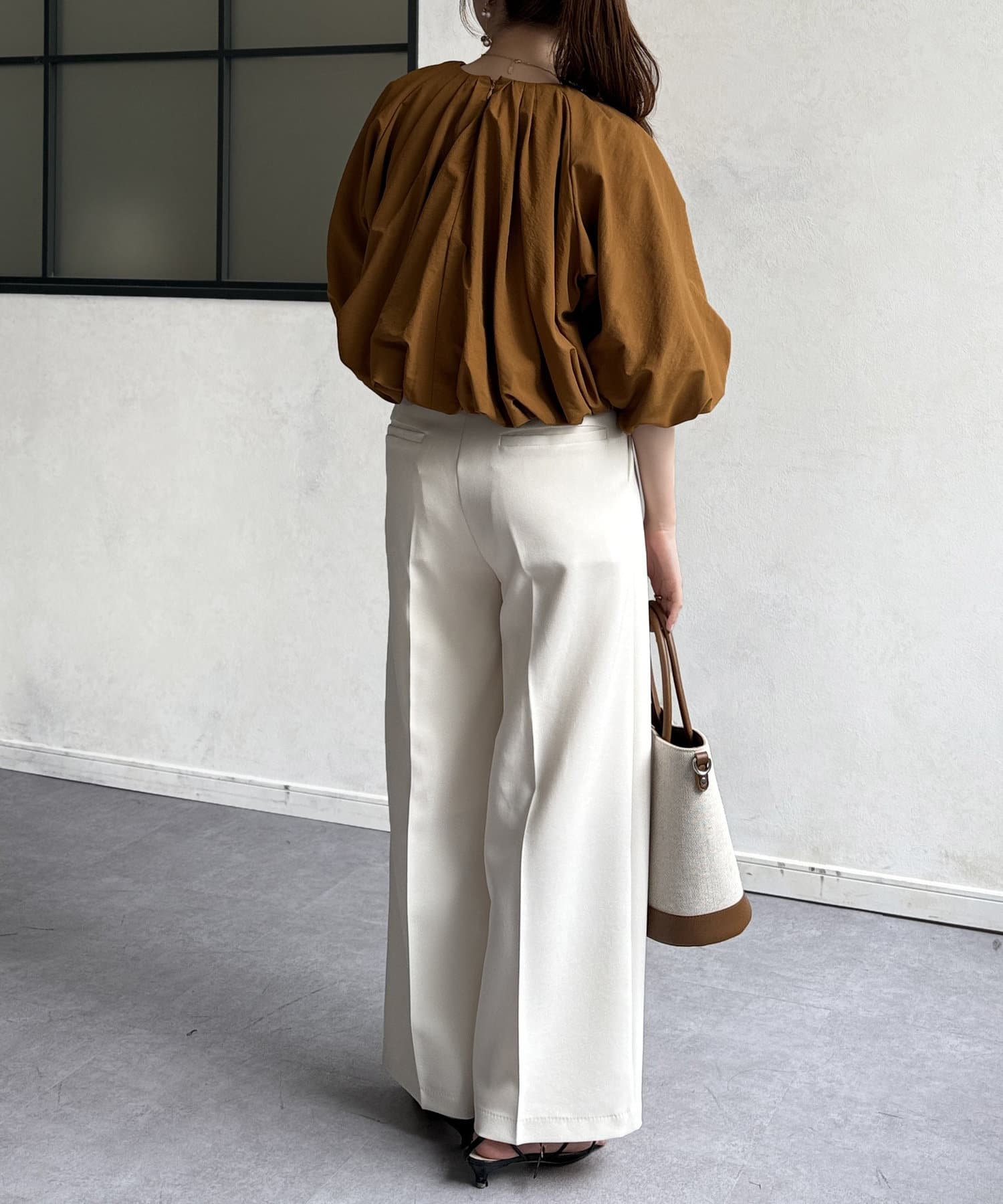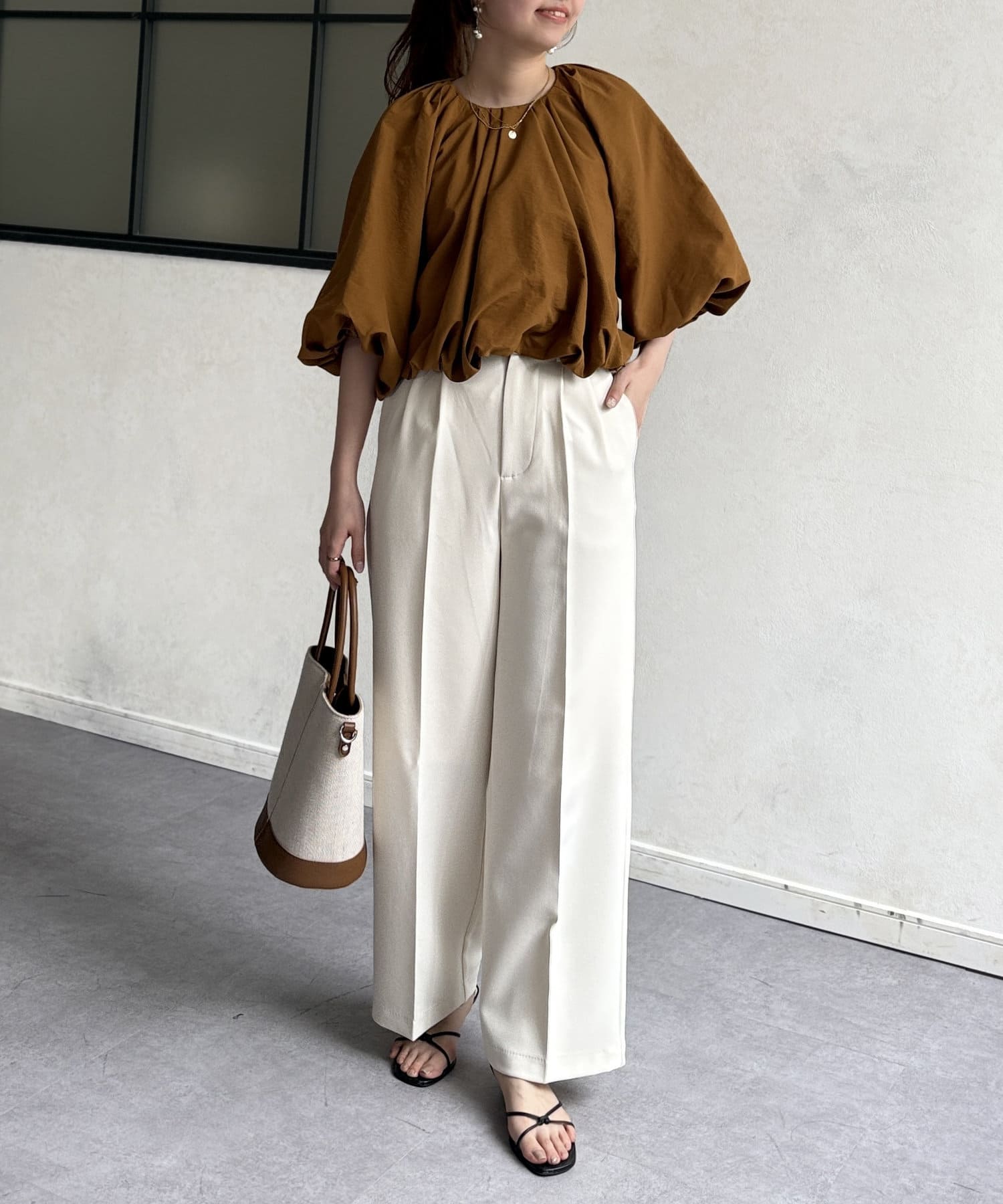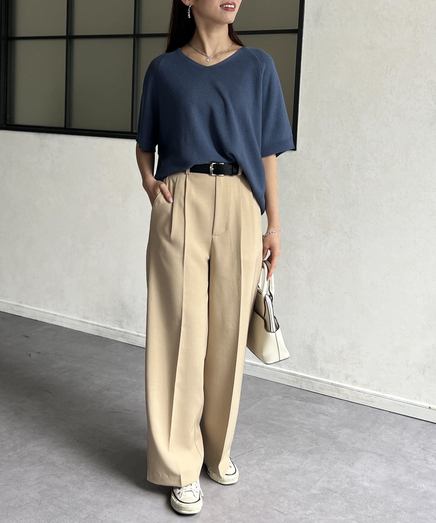 ウエストにタックが入っているので、トップスをタックインしたスタイルや前だけ引っ掛けメリハリを付けた着こなしがオススメ。