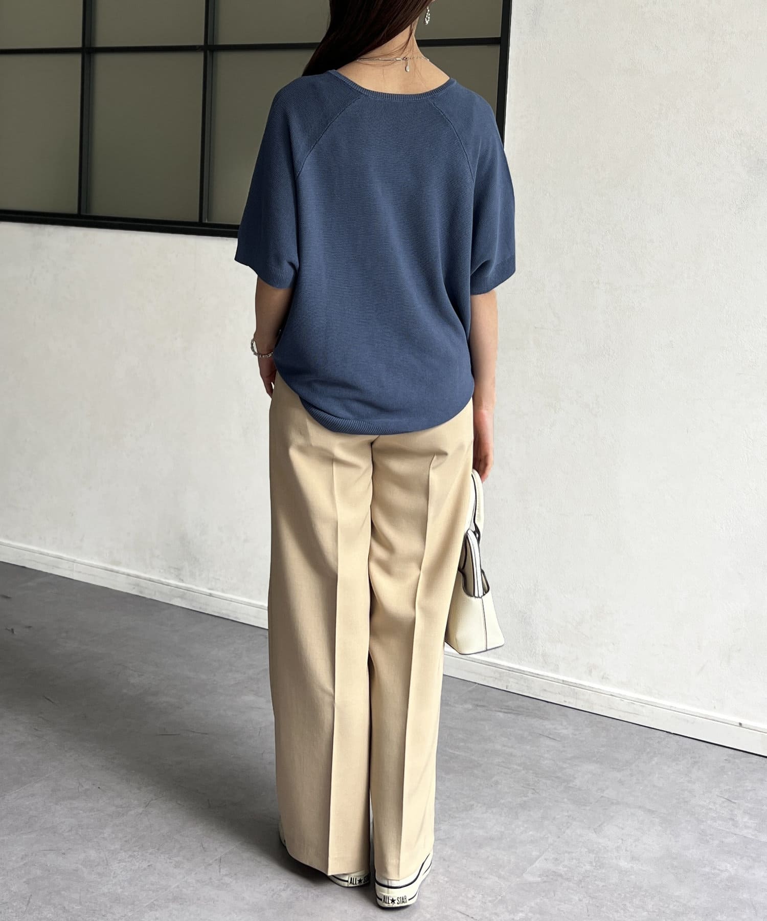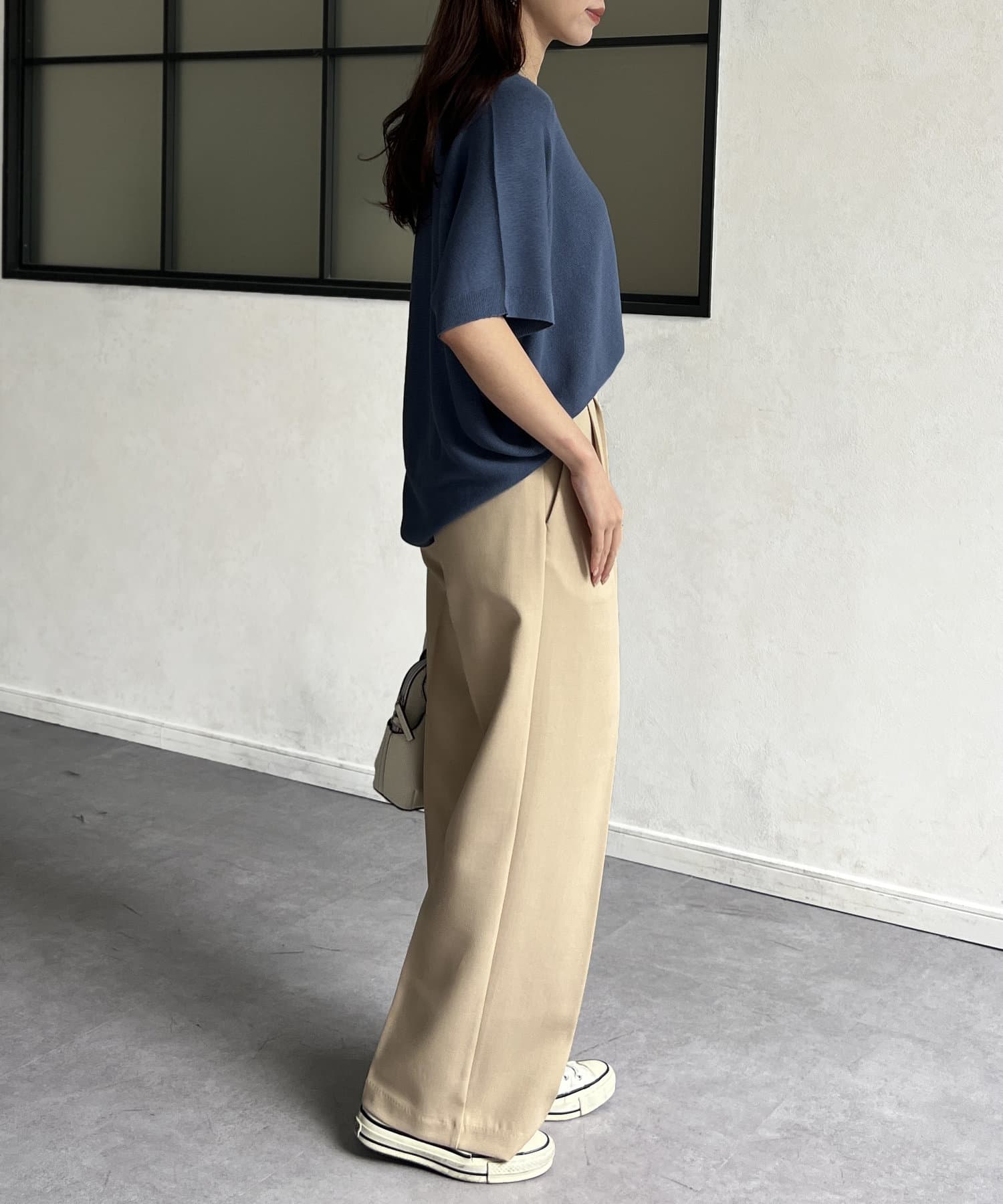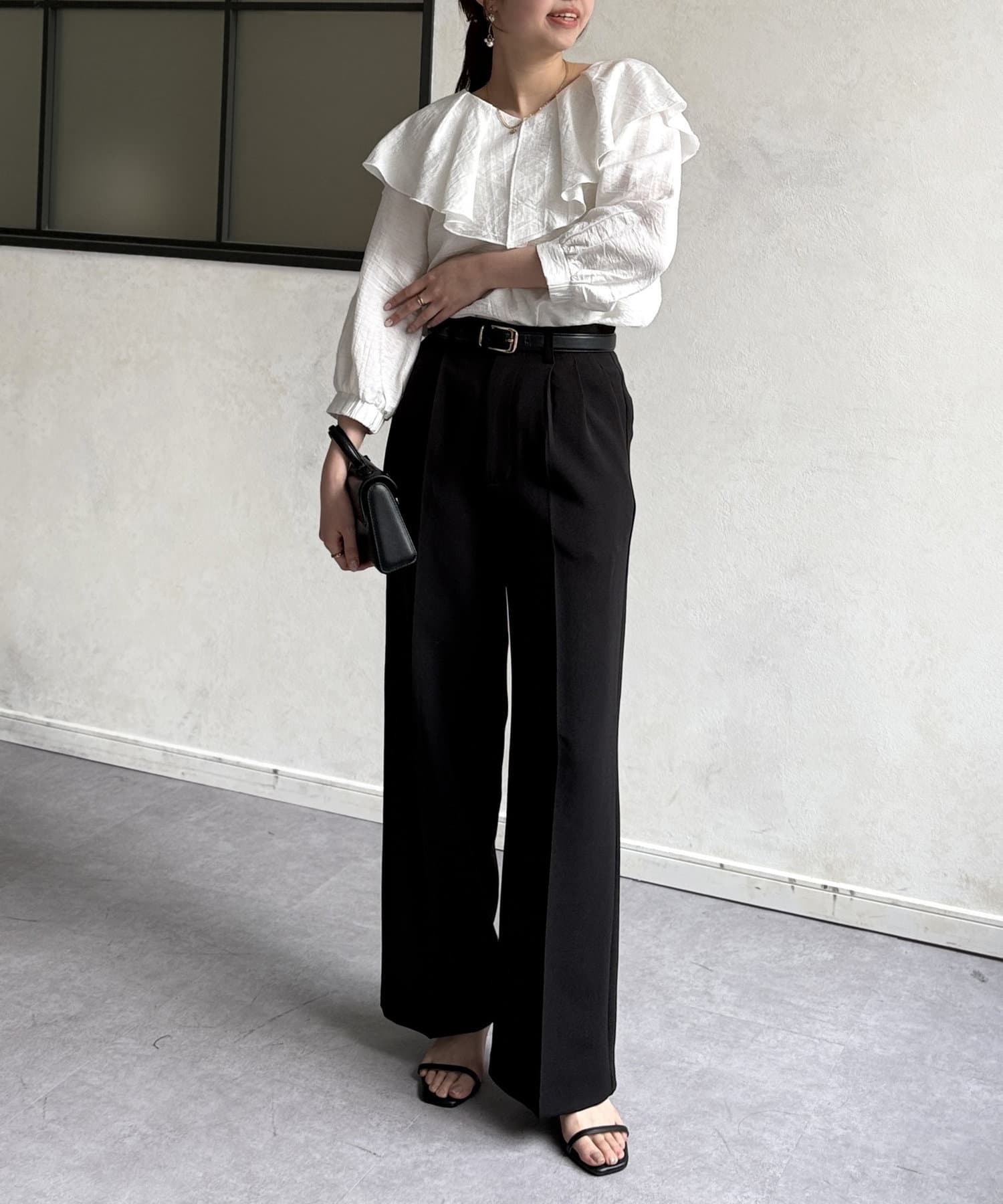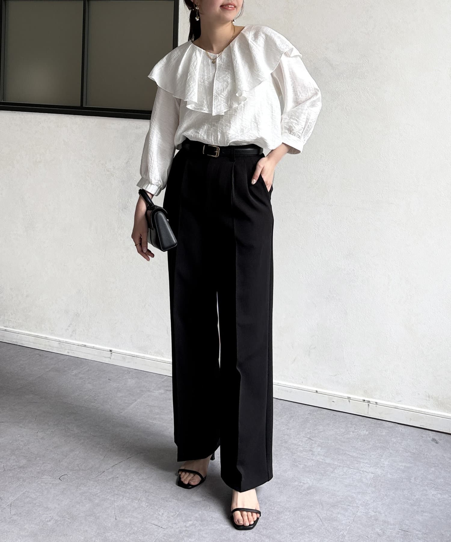 ウエストにタックが入っているので、トップスをタックインしたスタイルや前だけ引っ掛けメリハリを付けた着こなしがオススメ。