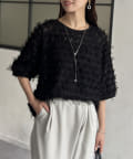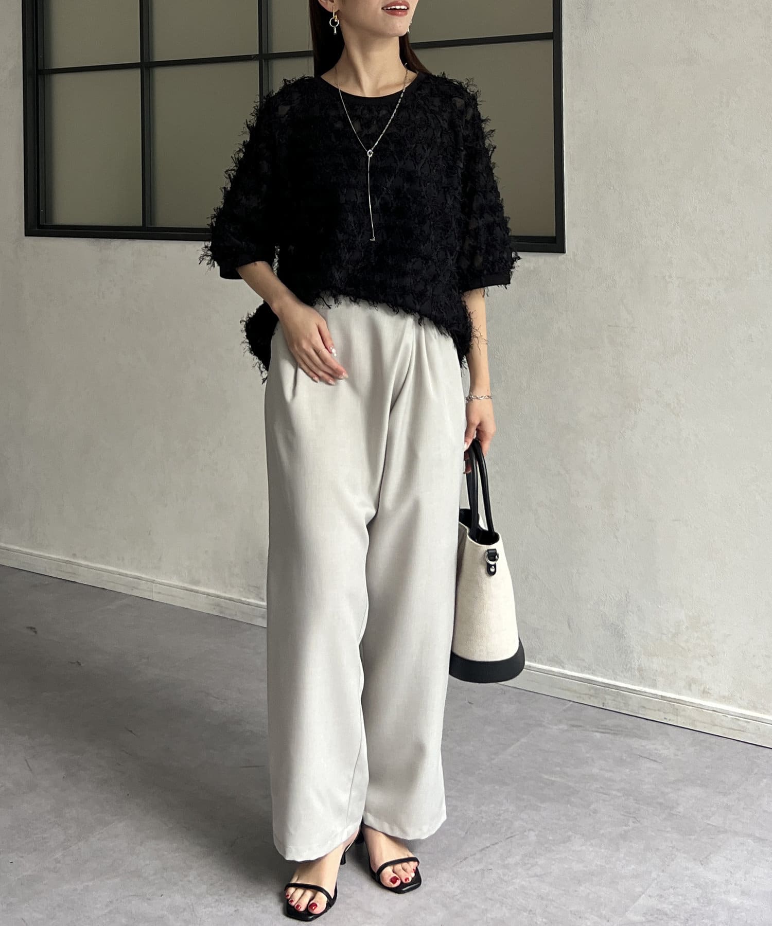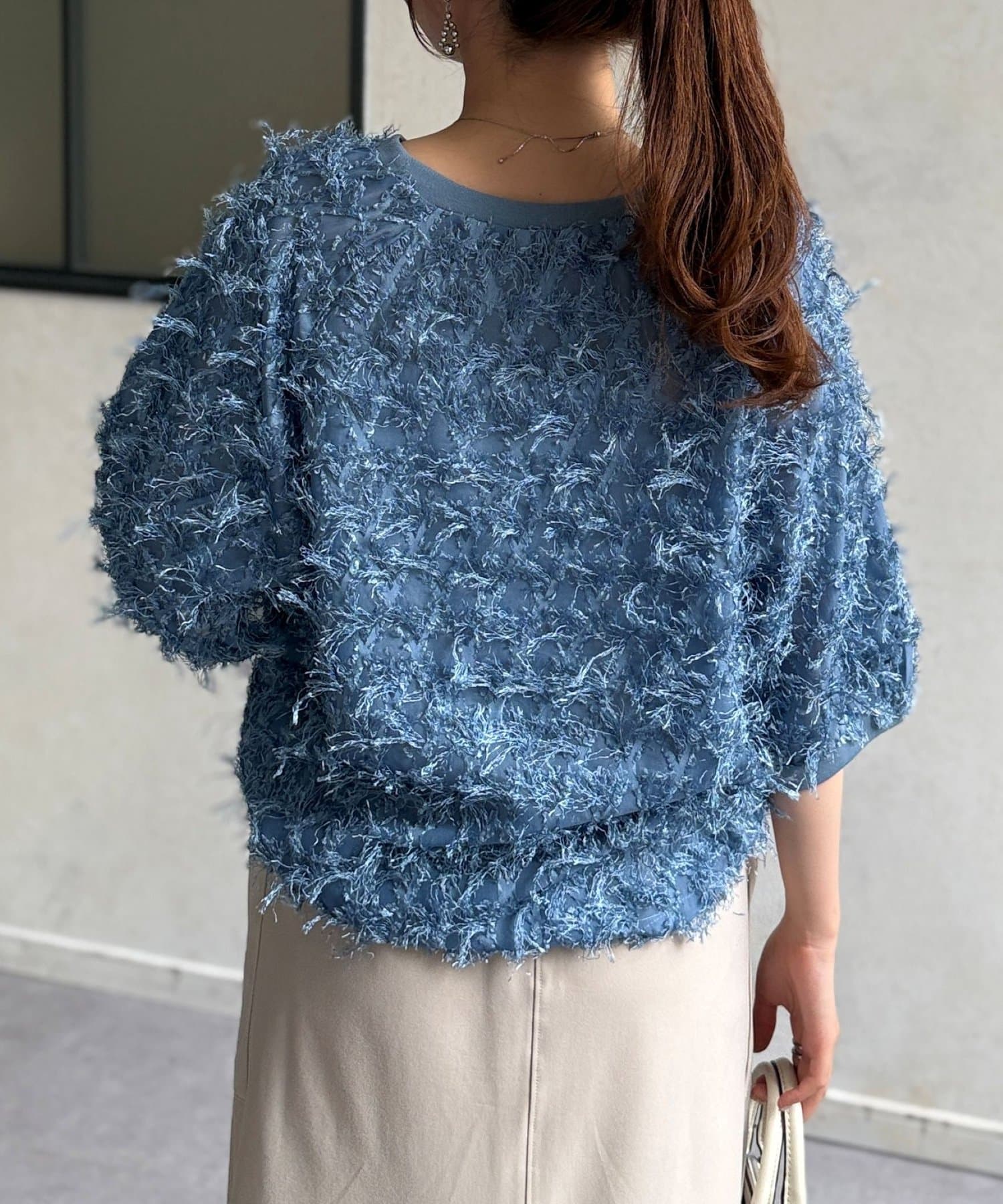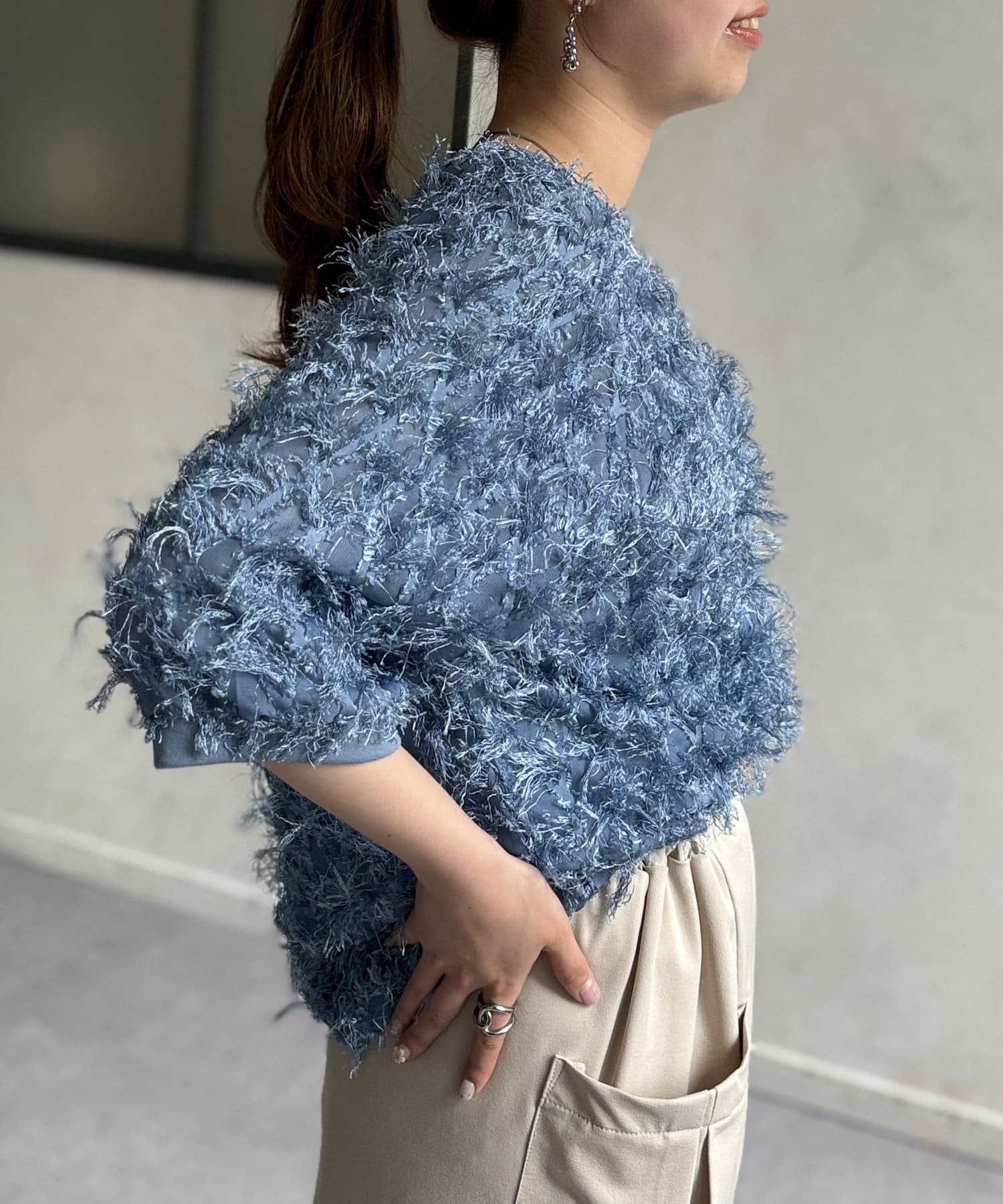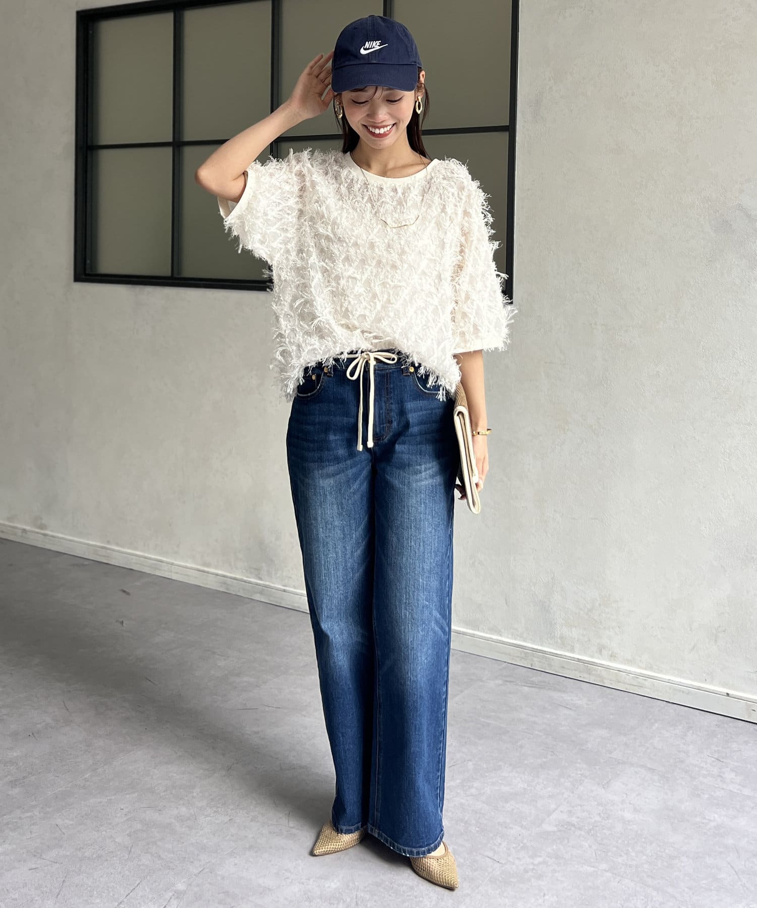着映えするシアーフリンジ素材には、シンプルなスラックスやデニムとの合わせがおすすめです。