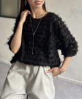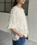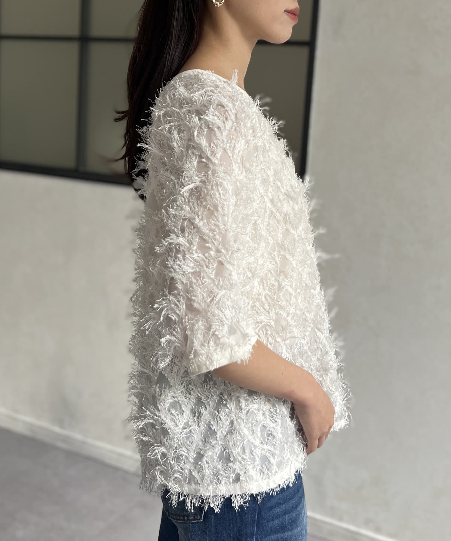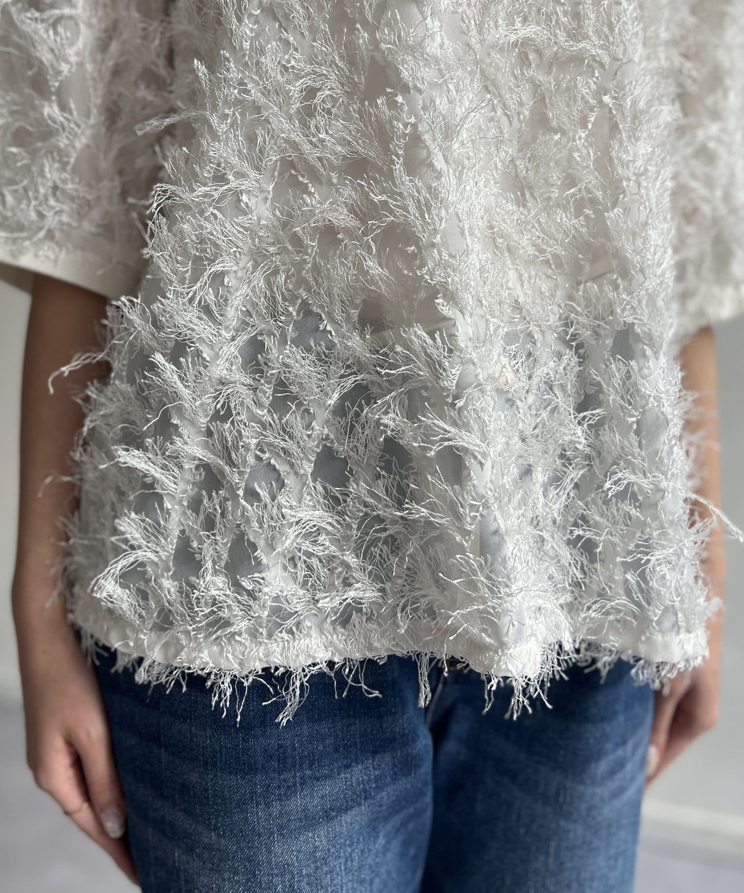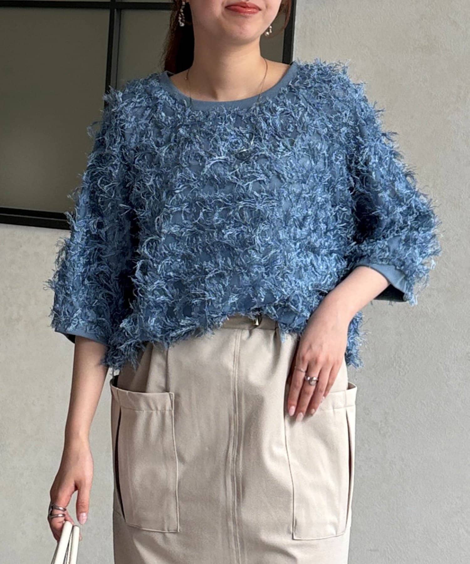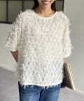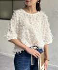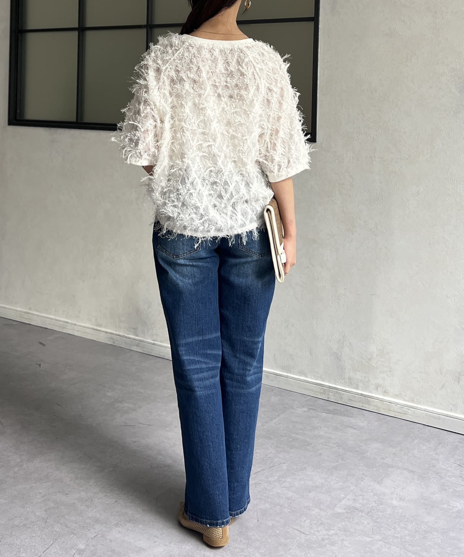 着映えするシアーフリンジ素材には、シンプルなスラックスやデニムとの合わせがおすすめです。