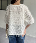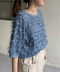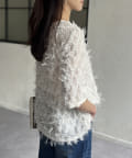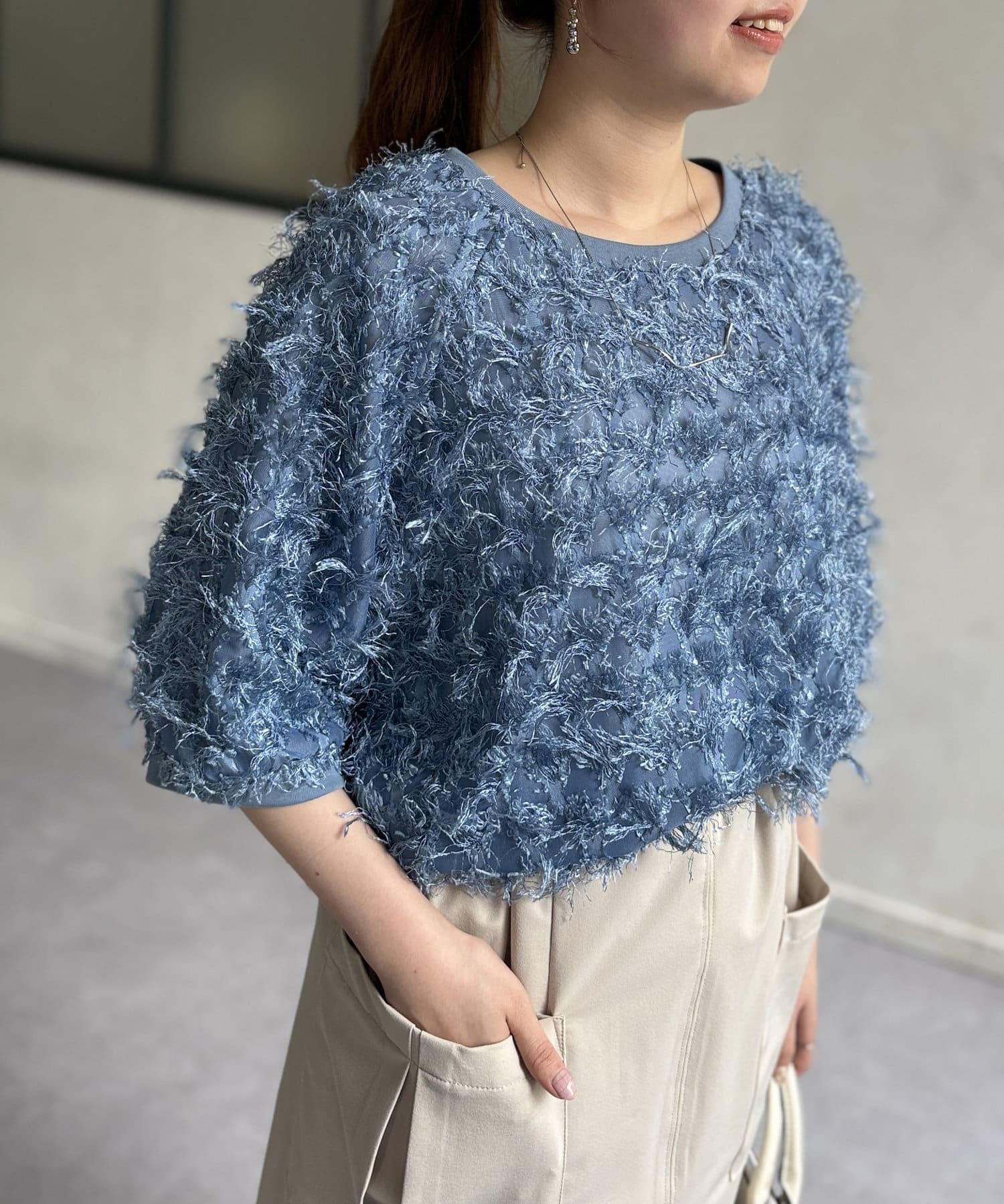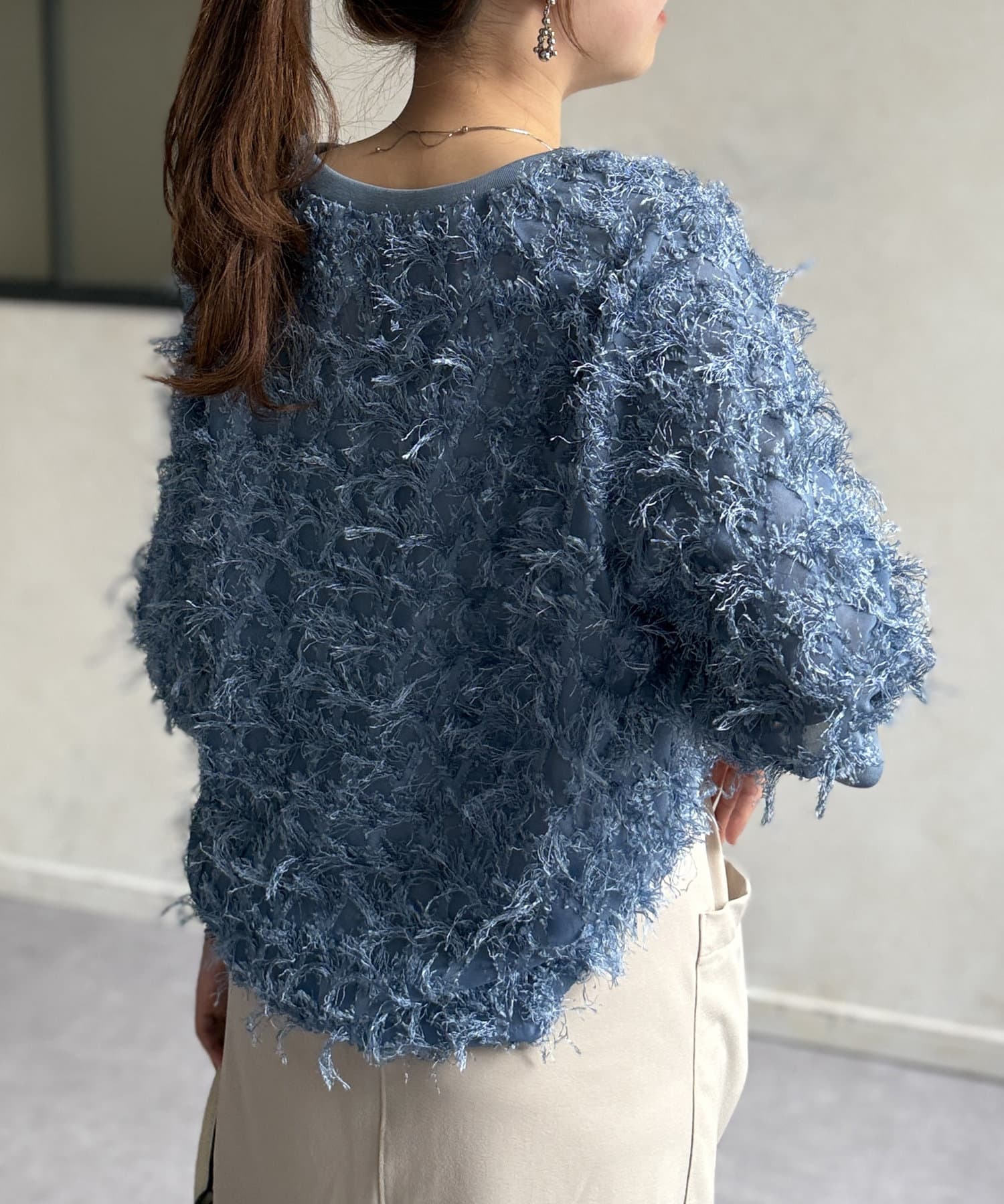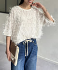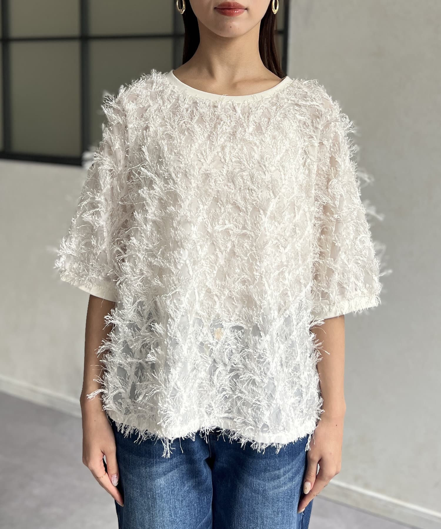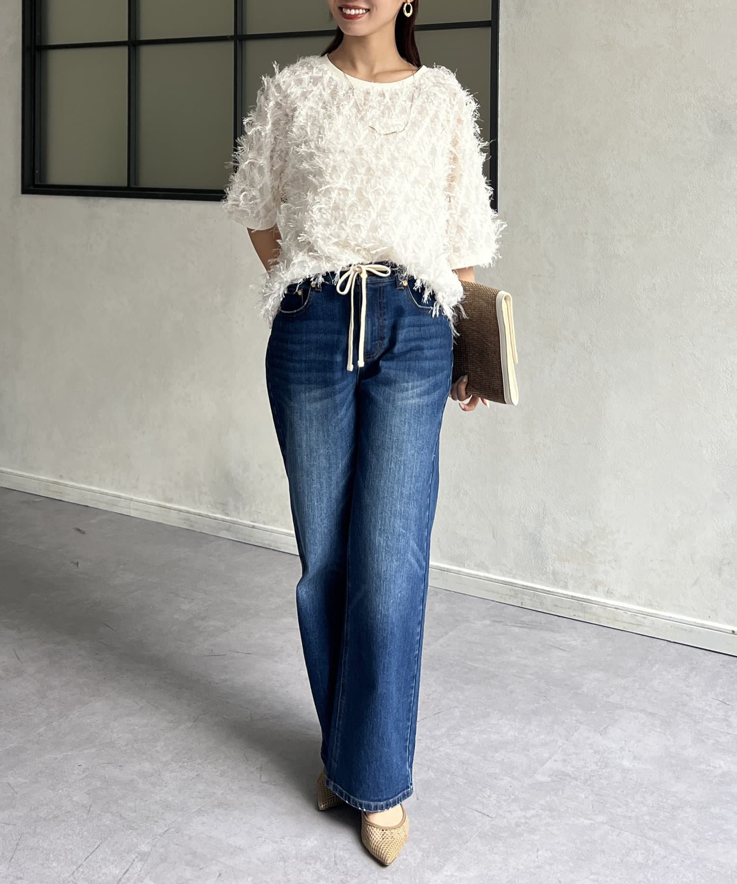 着映えするシアーフリンジ素材には、シンプルなスラックスやデニムとの合わせがおすすめです。
