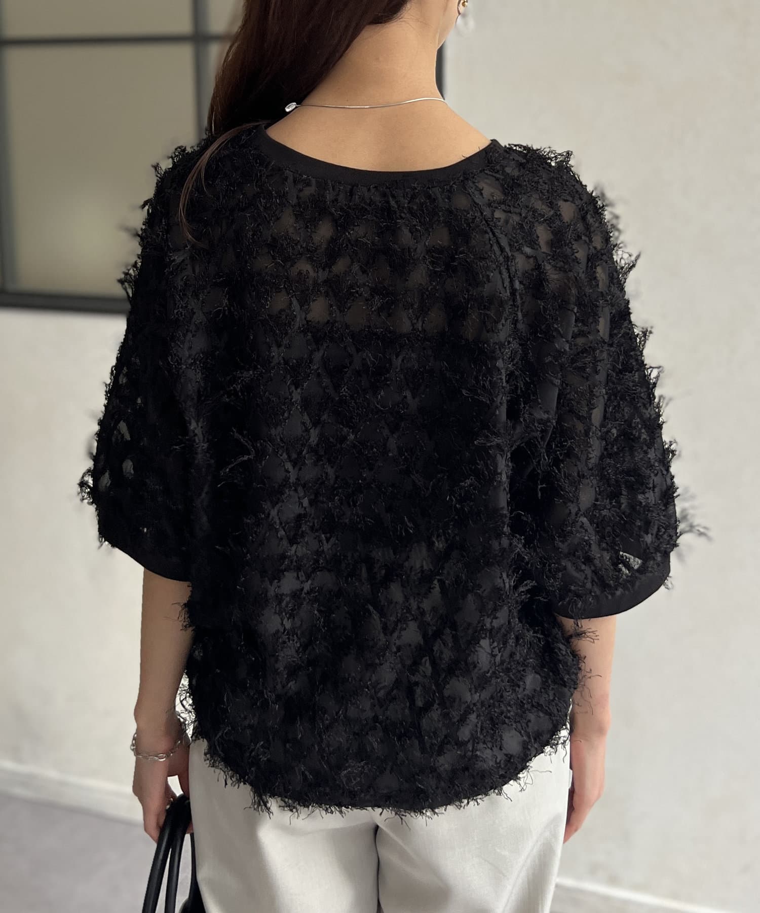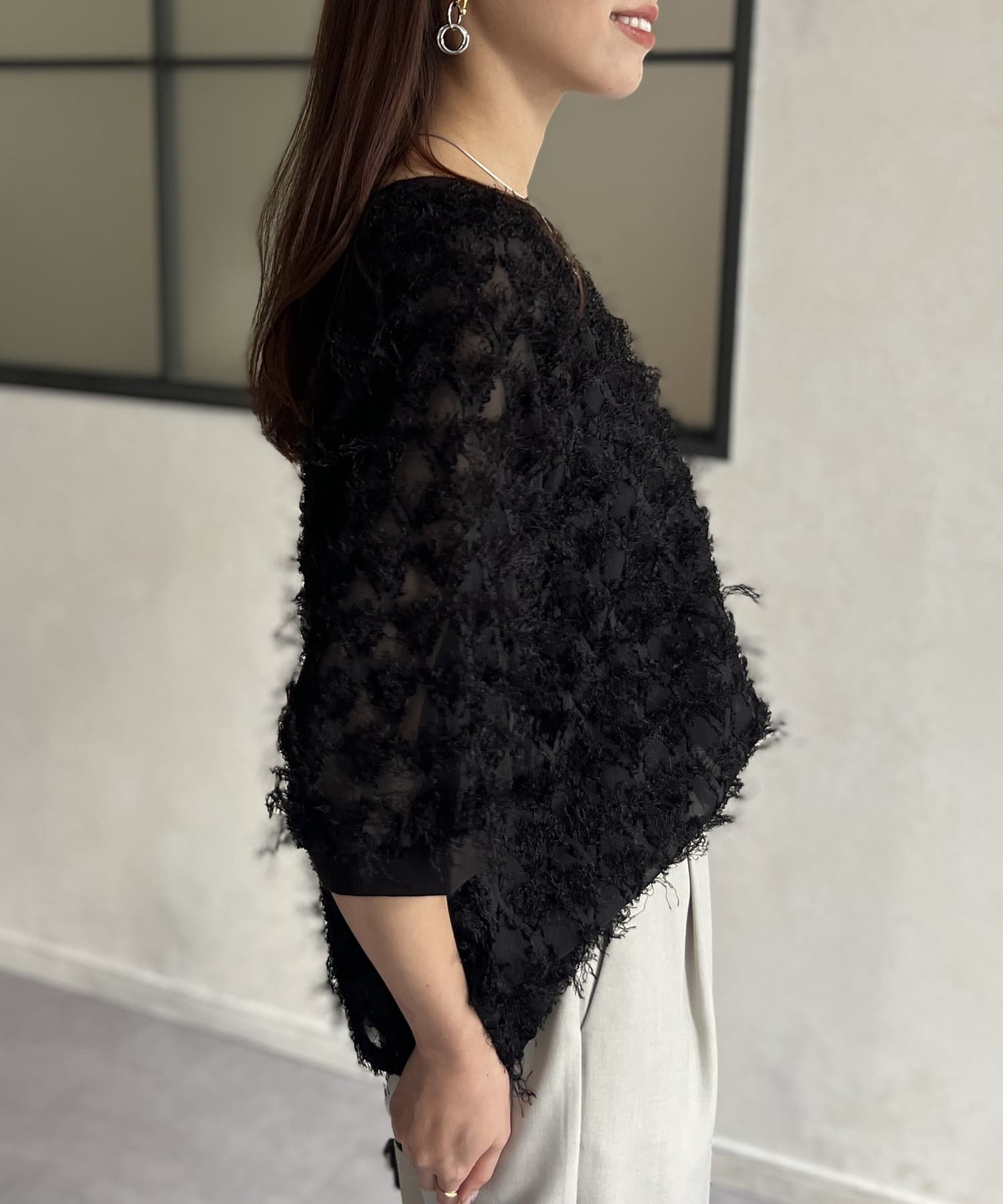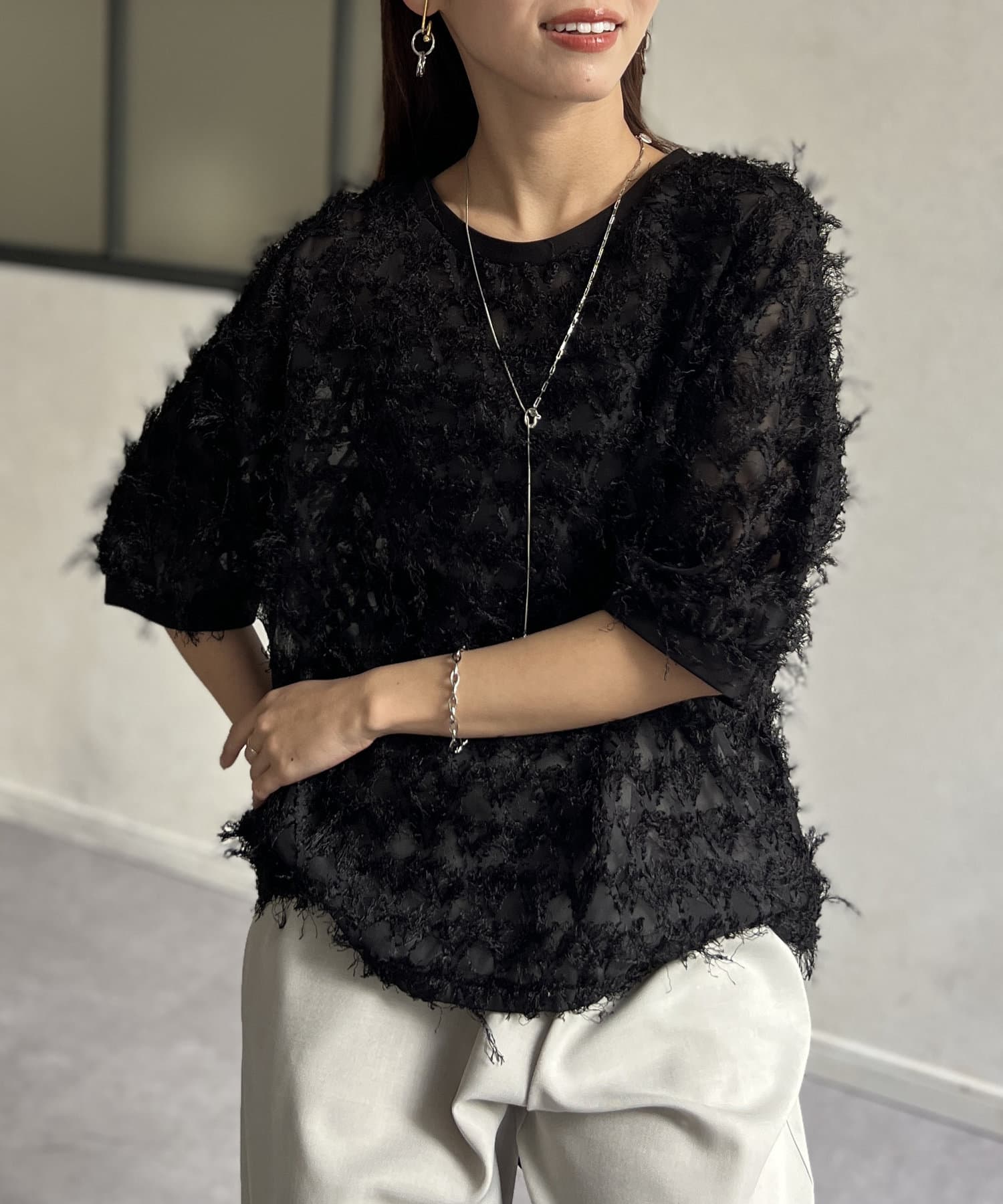 華やかな印象になるフリンジ素材で、女性らしい大人な透け感♪