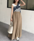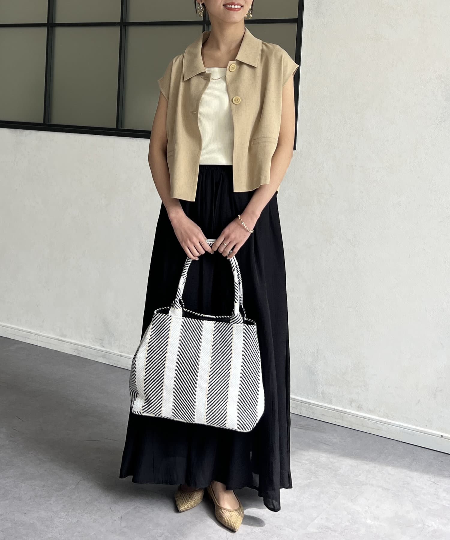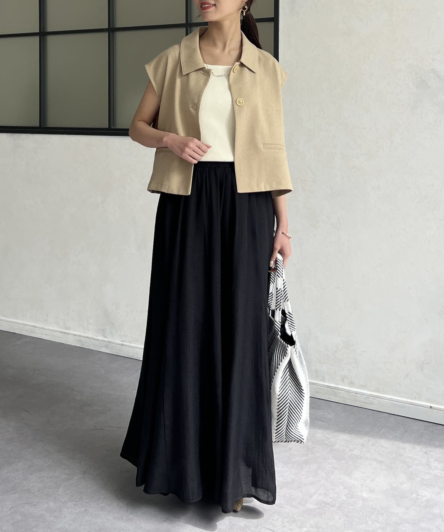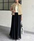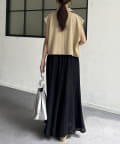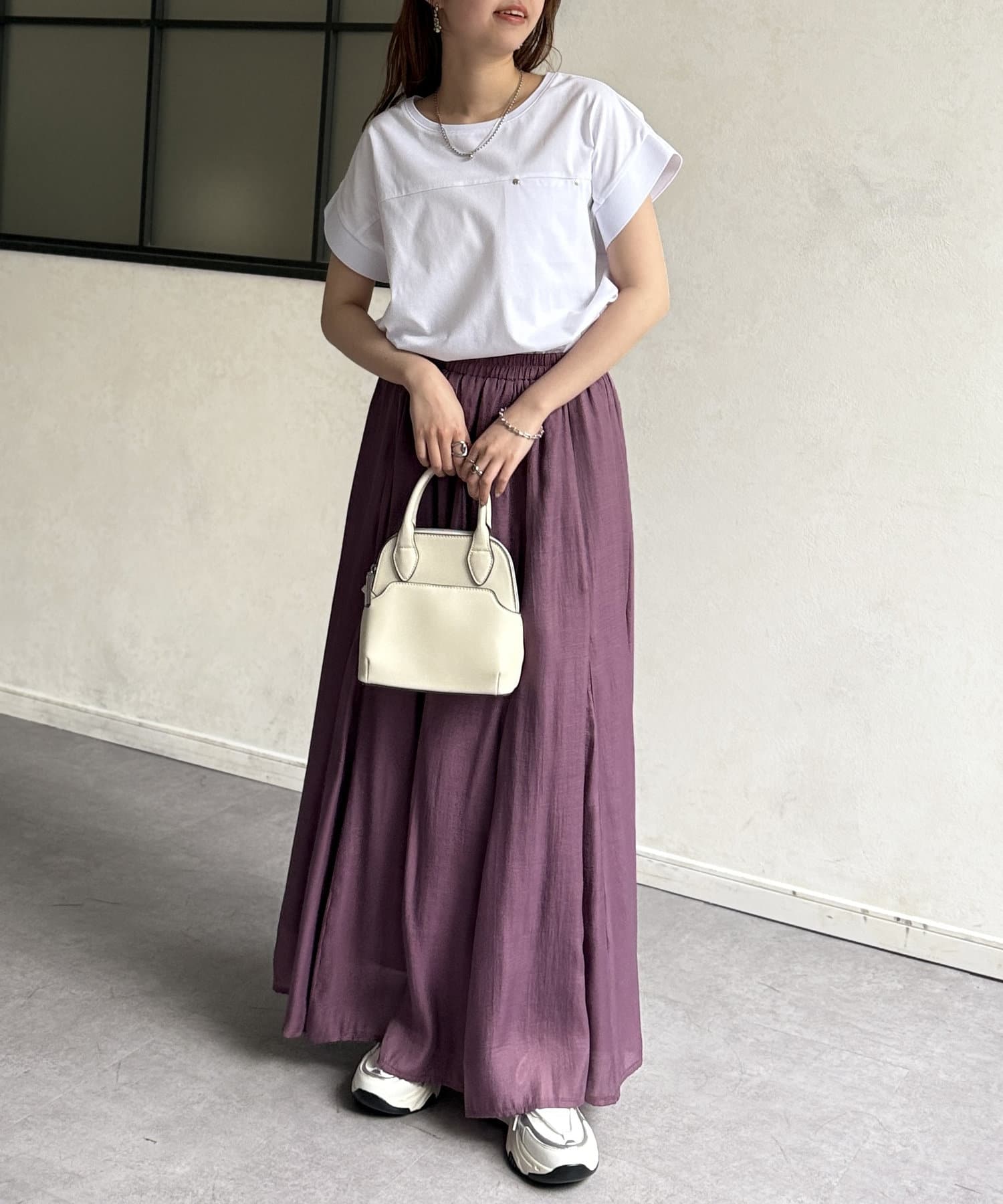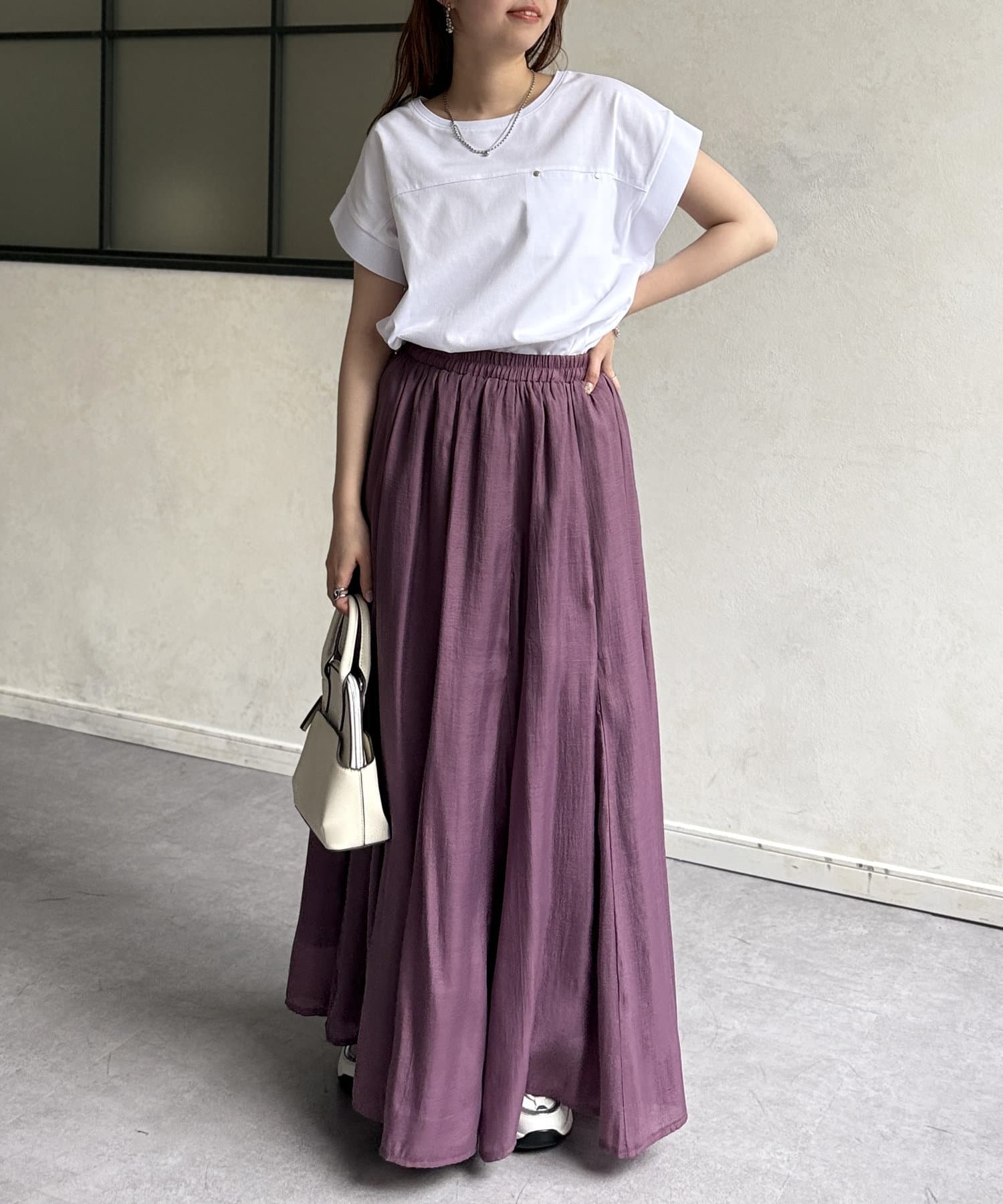 上品スタイルにはブラウスやサマーニット、カジュアルにロゴT合わせもおすすめです。