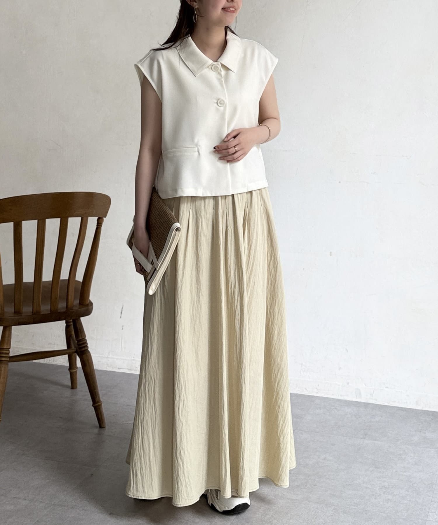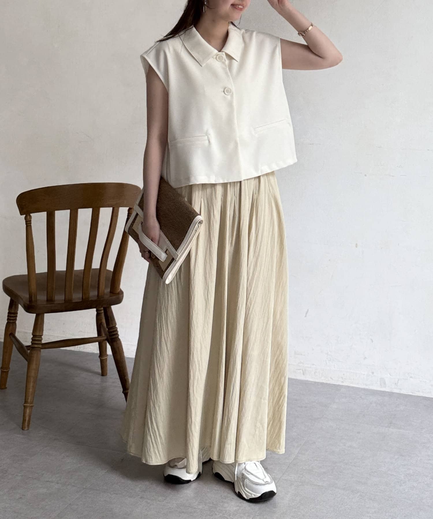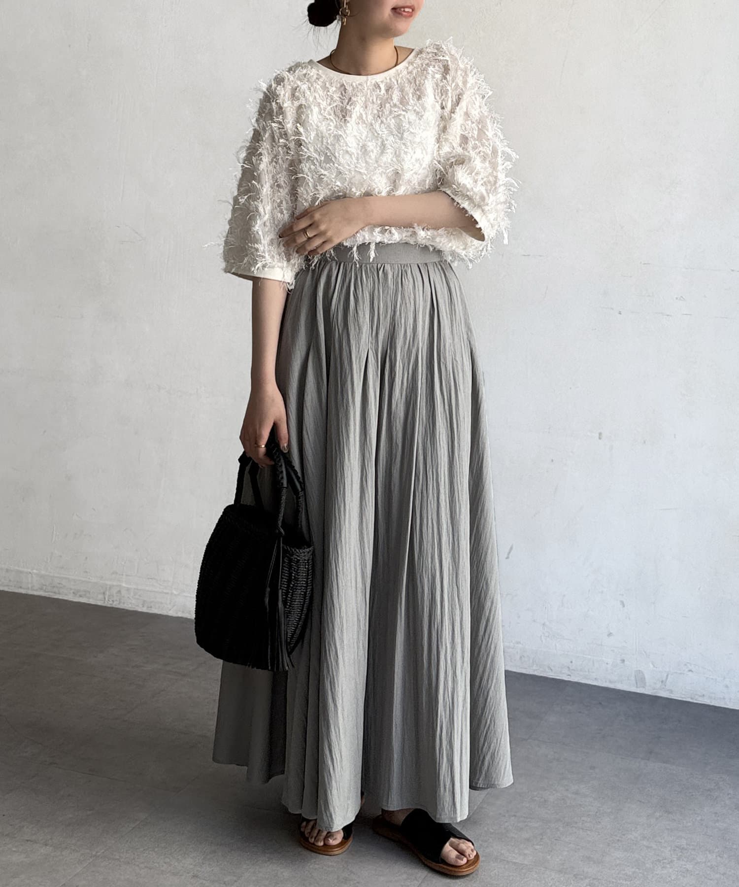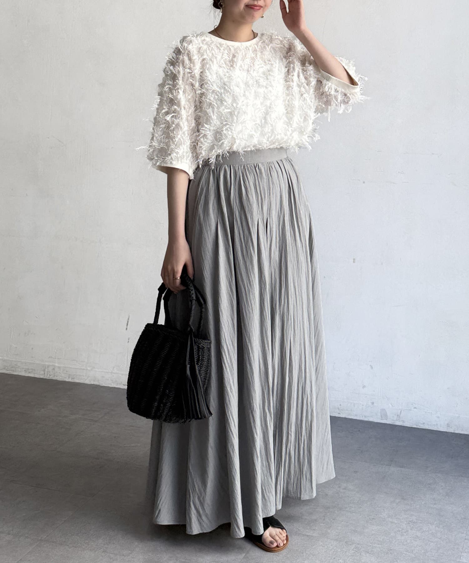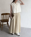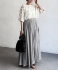 上品なスタイルにはブラウスやサマーニット、カジュアルにロゴT合わせもおすすめです。