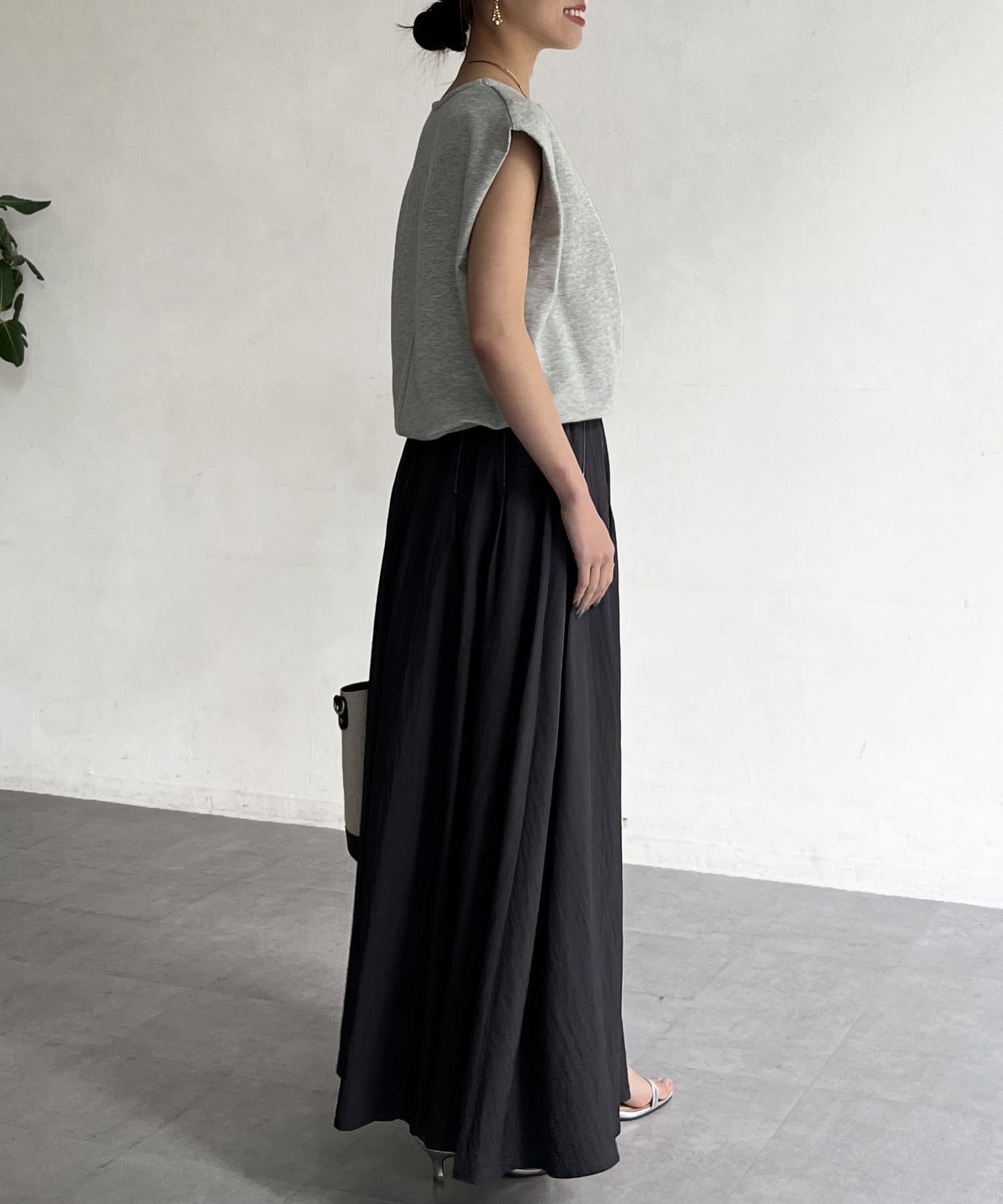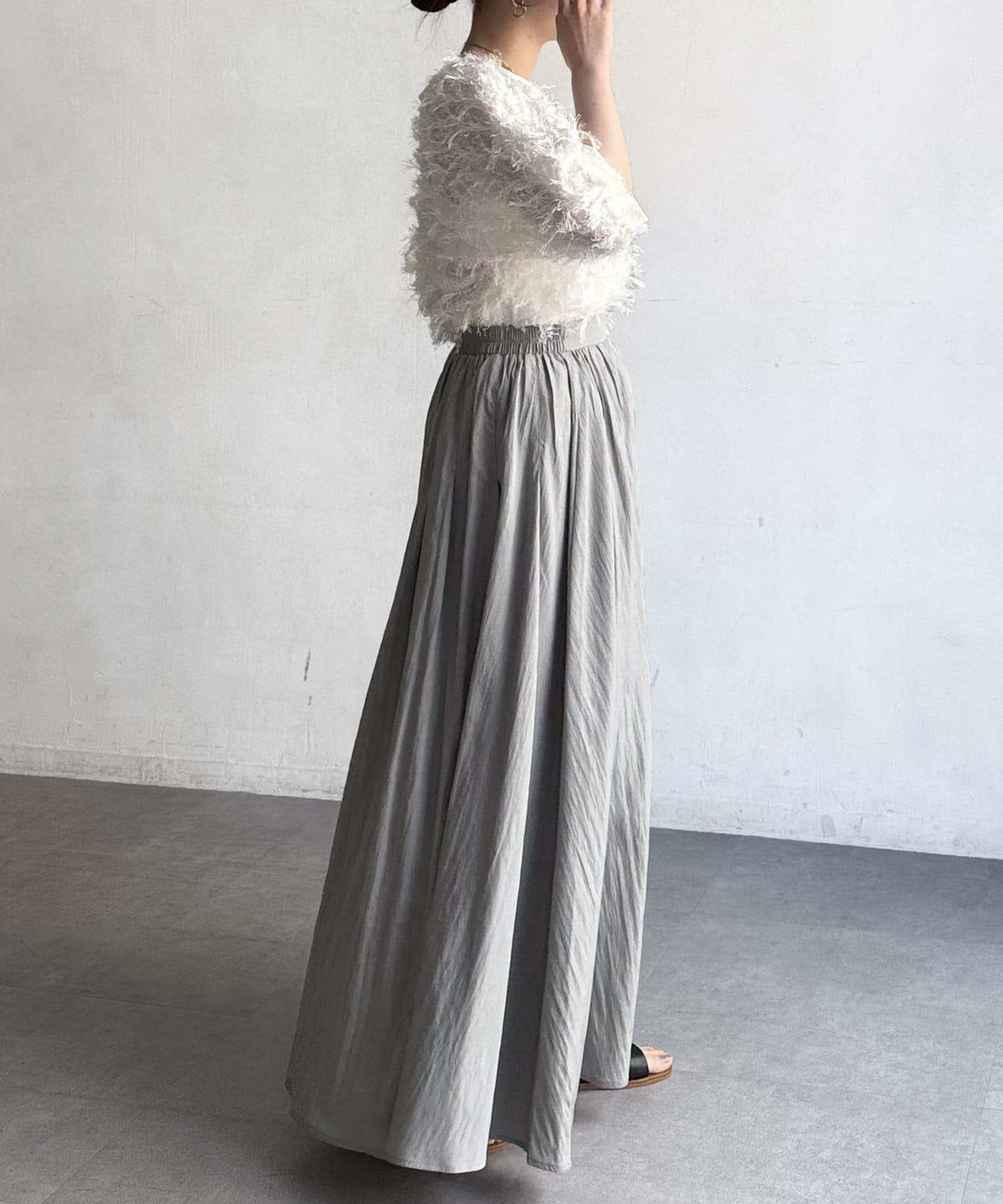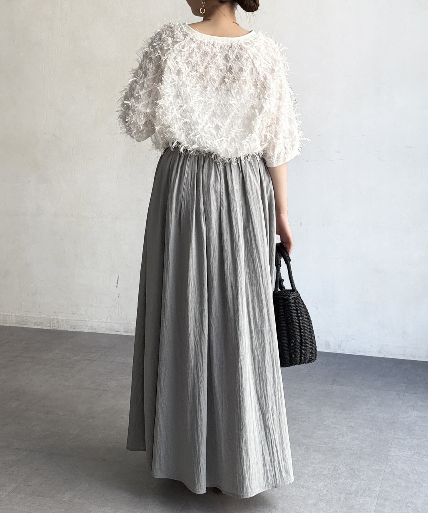 上品でハリ感のある素材を使用し、身体に沿ってふわっと広がるシルエットがポイント。