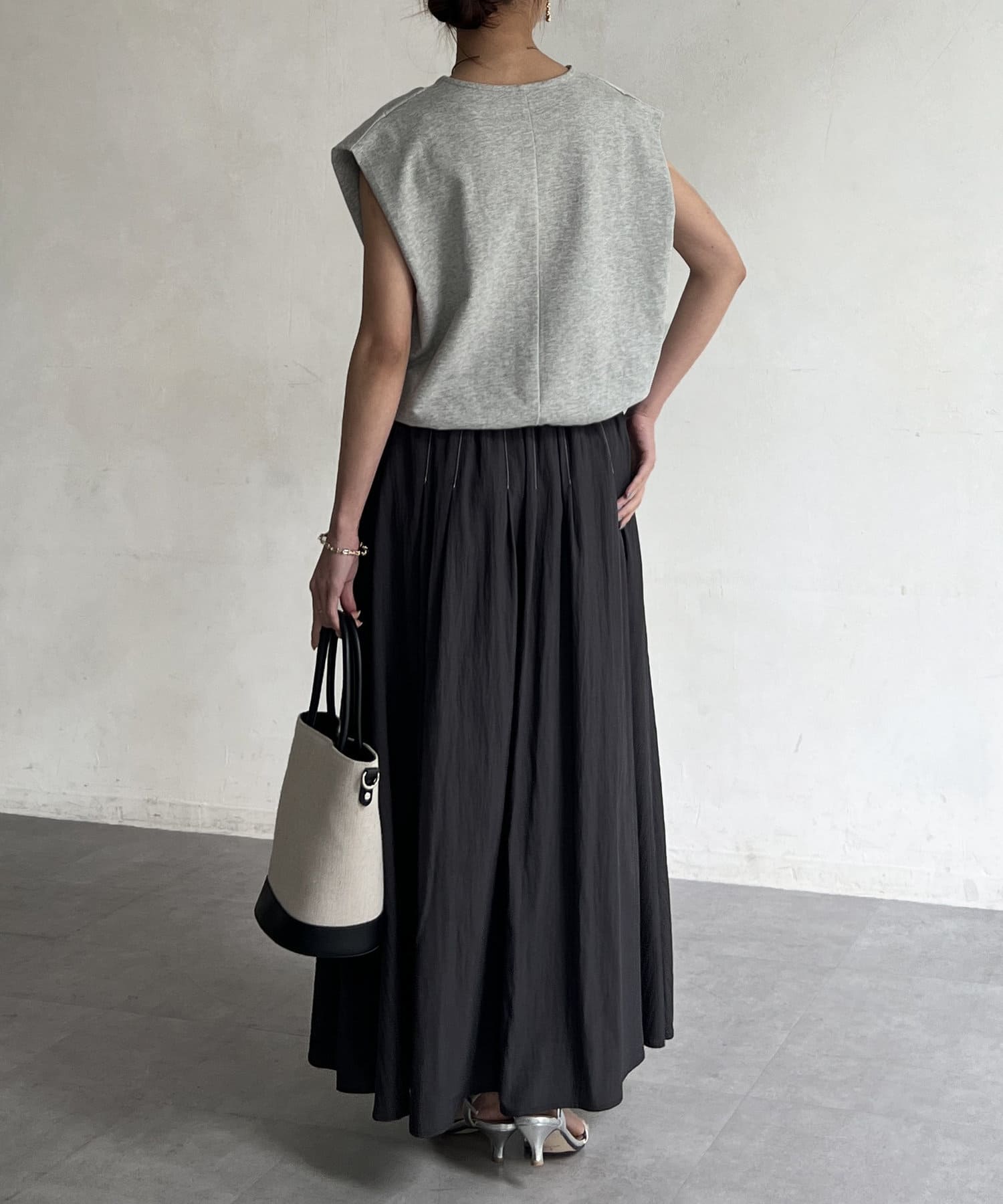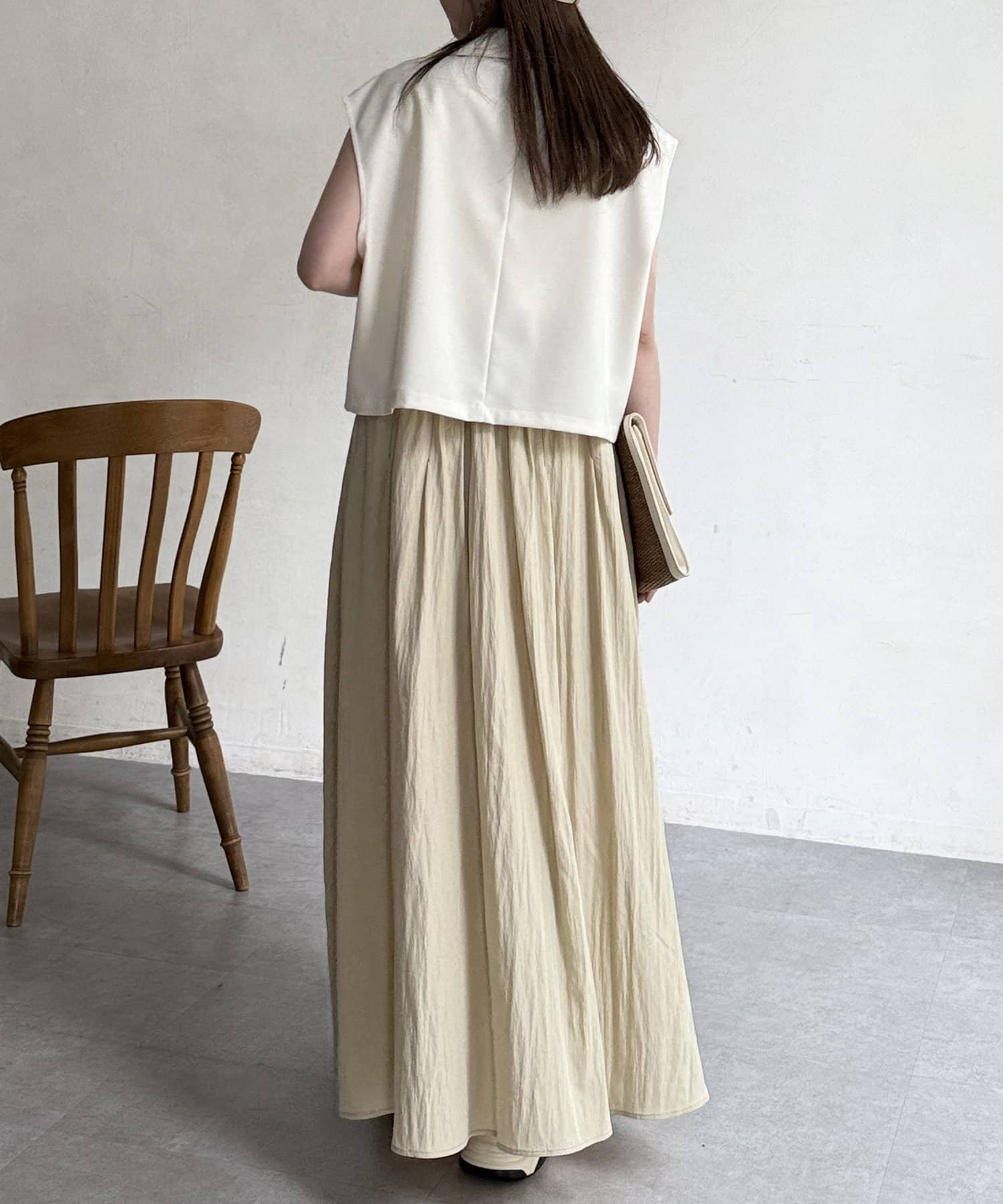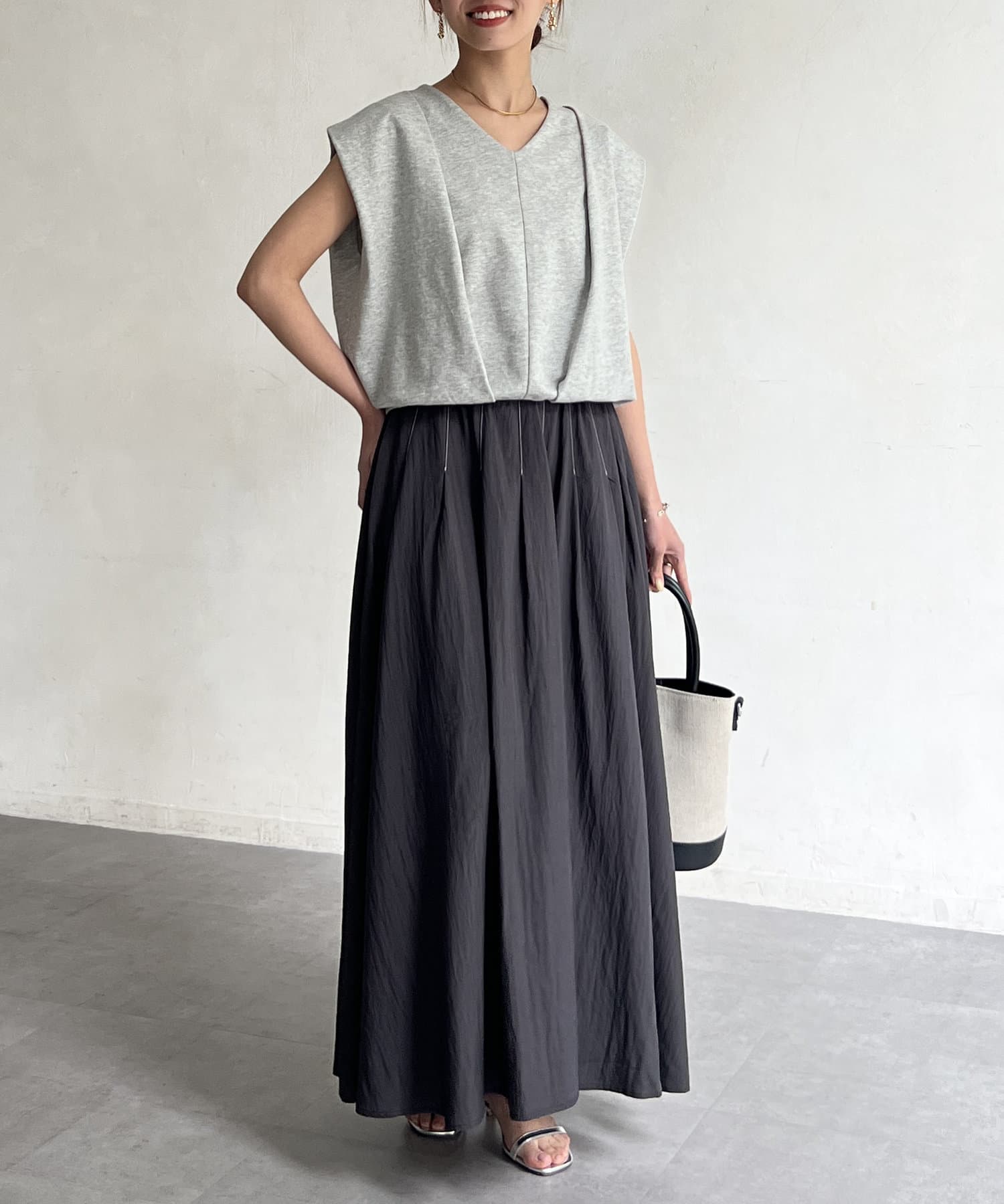 上品でハリ感のある素材を使用し、身体に沿ってふわっと広がるシルエットがポイント。