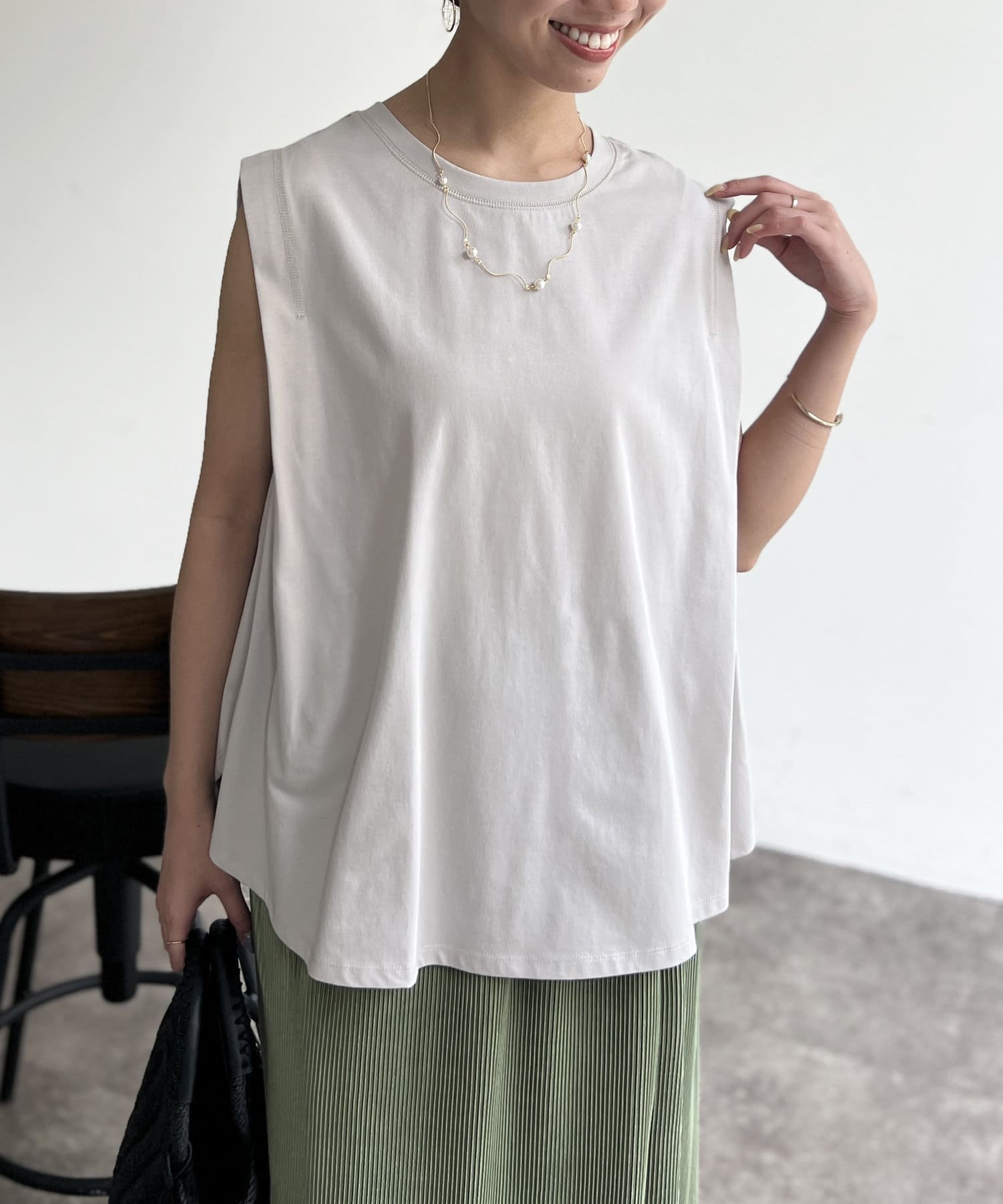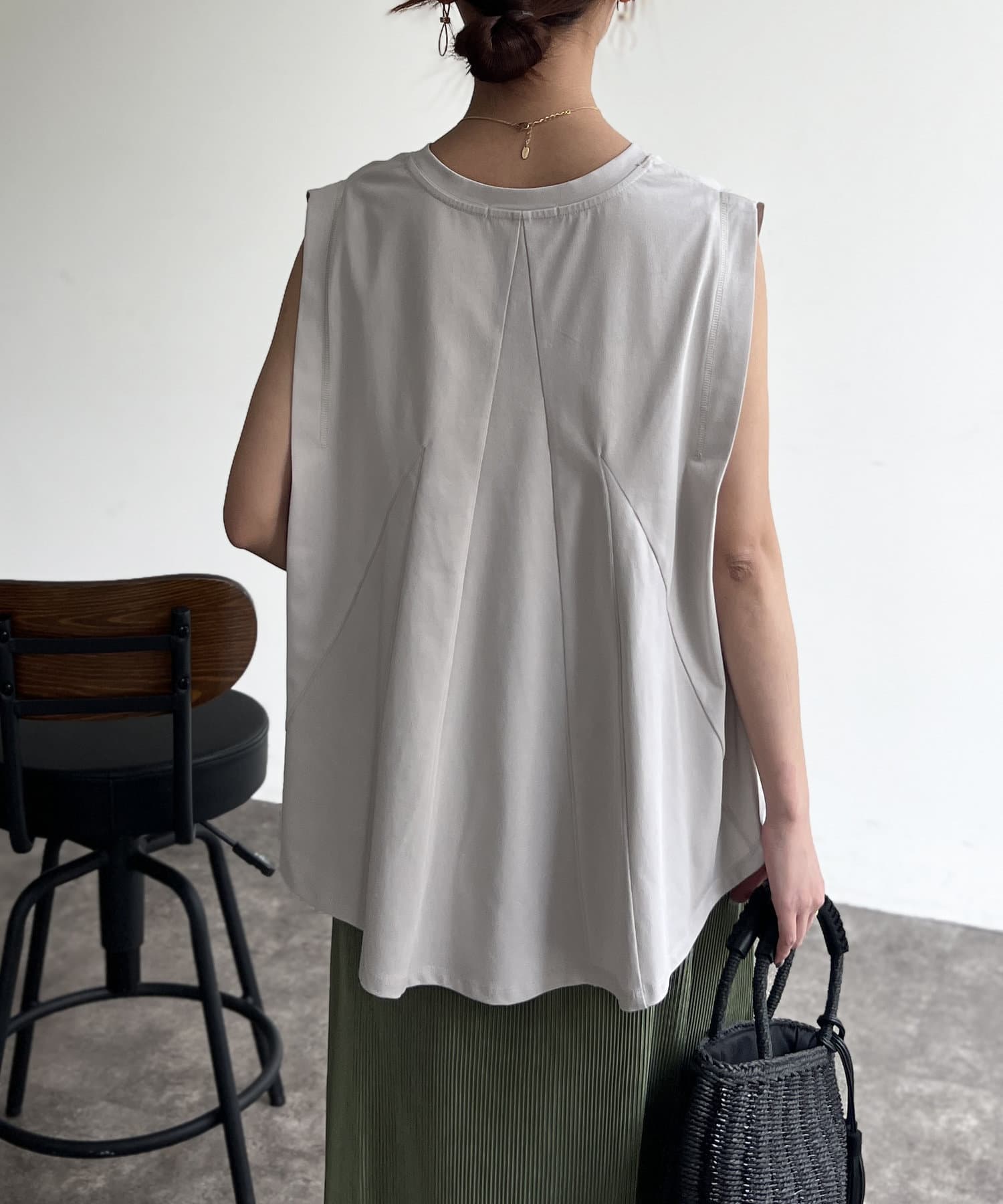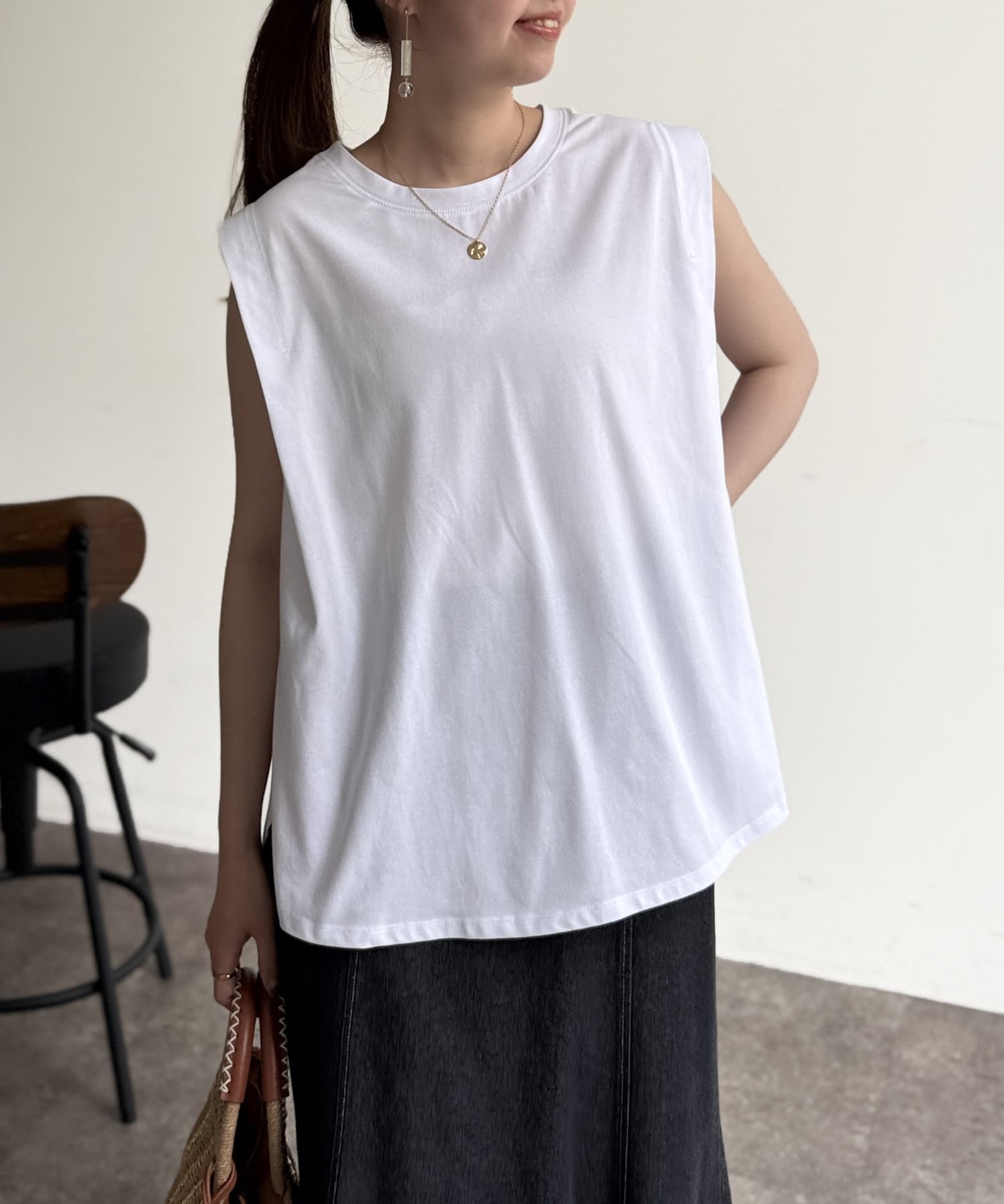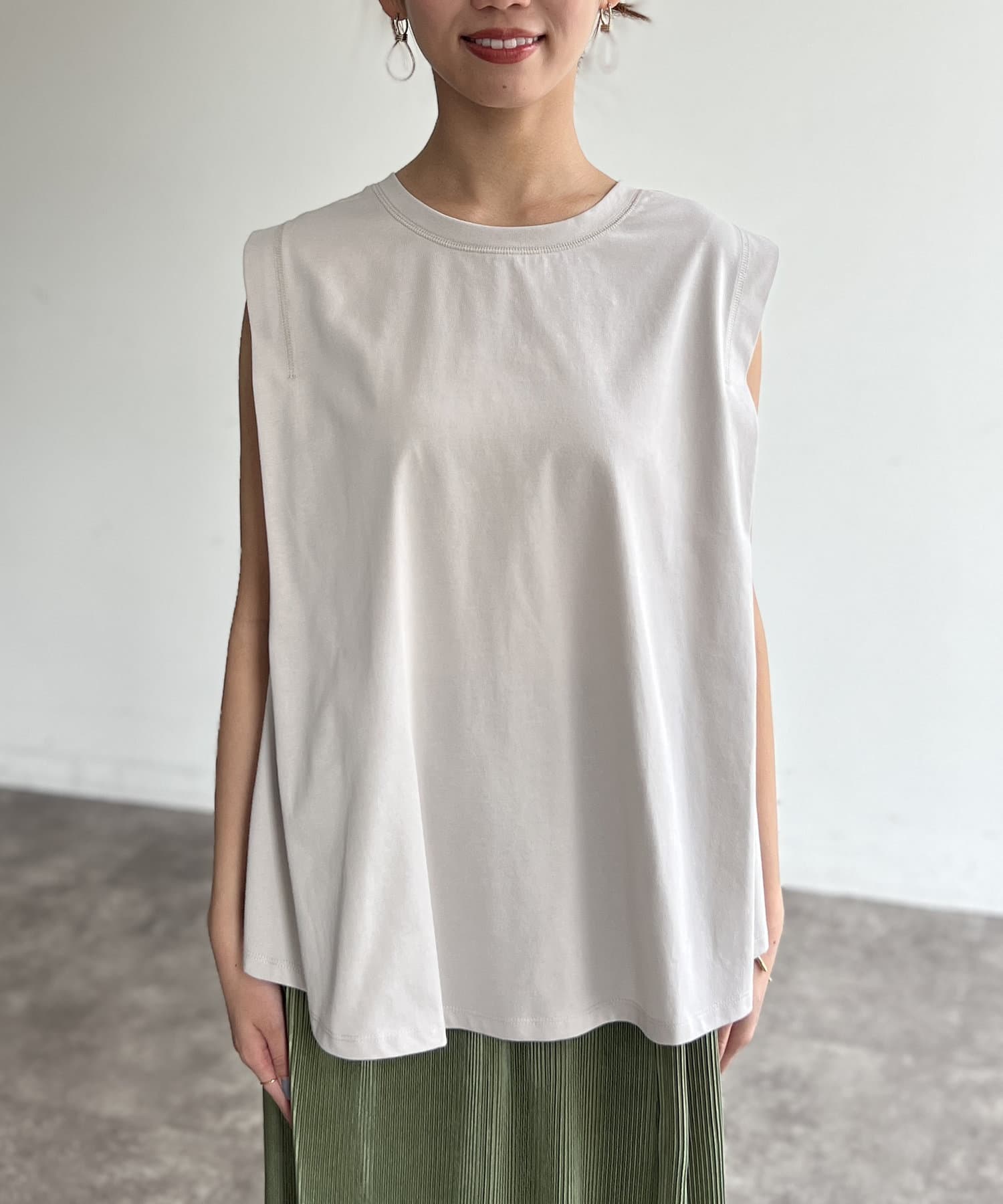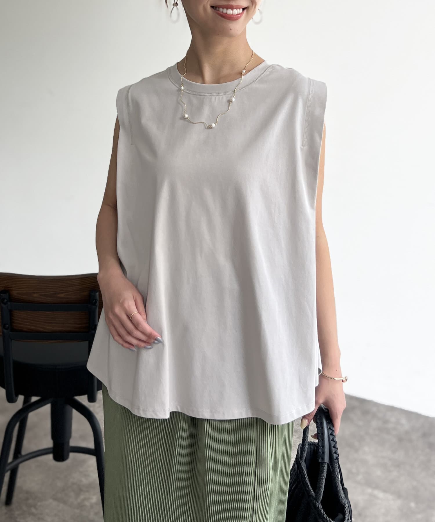 肩のまっすぐに切り落とされたラインが腕をすっきり見せてくれるノースリーブ。