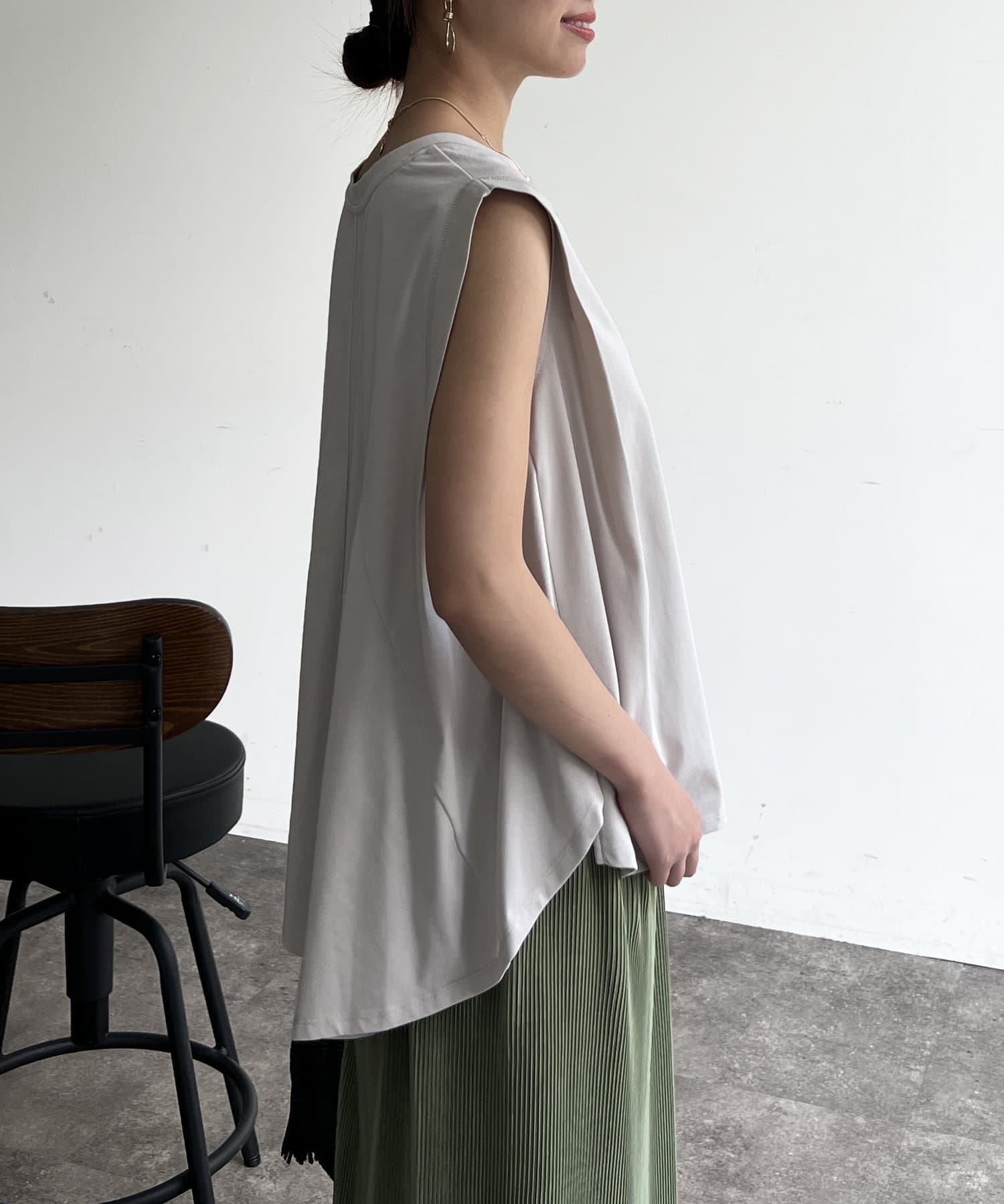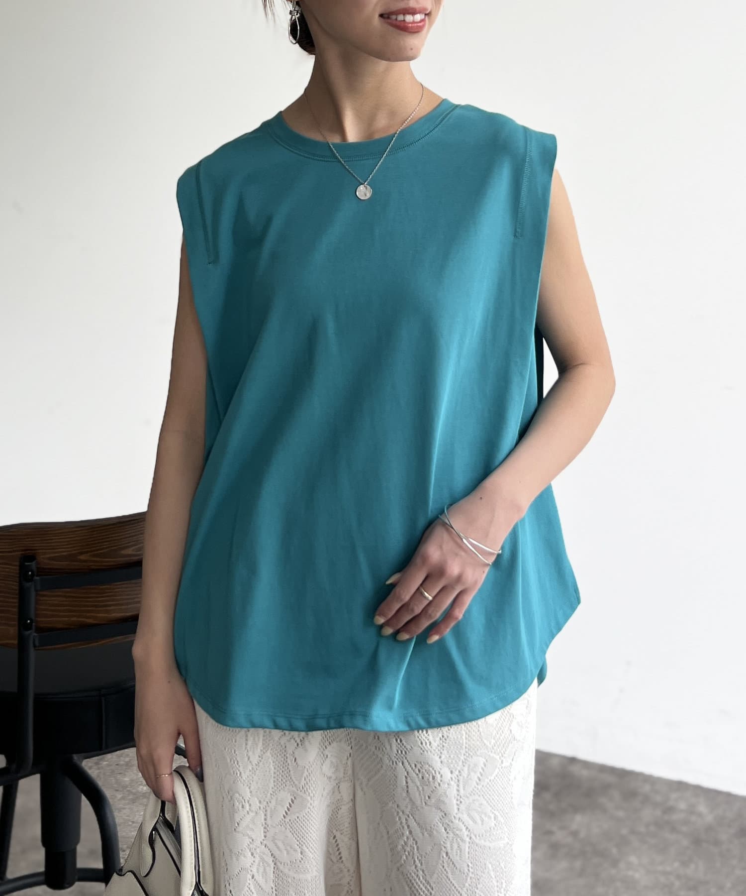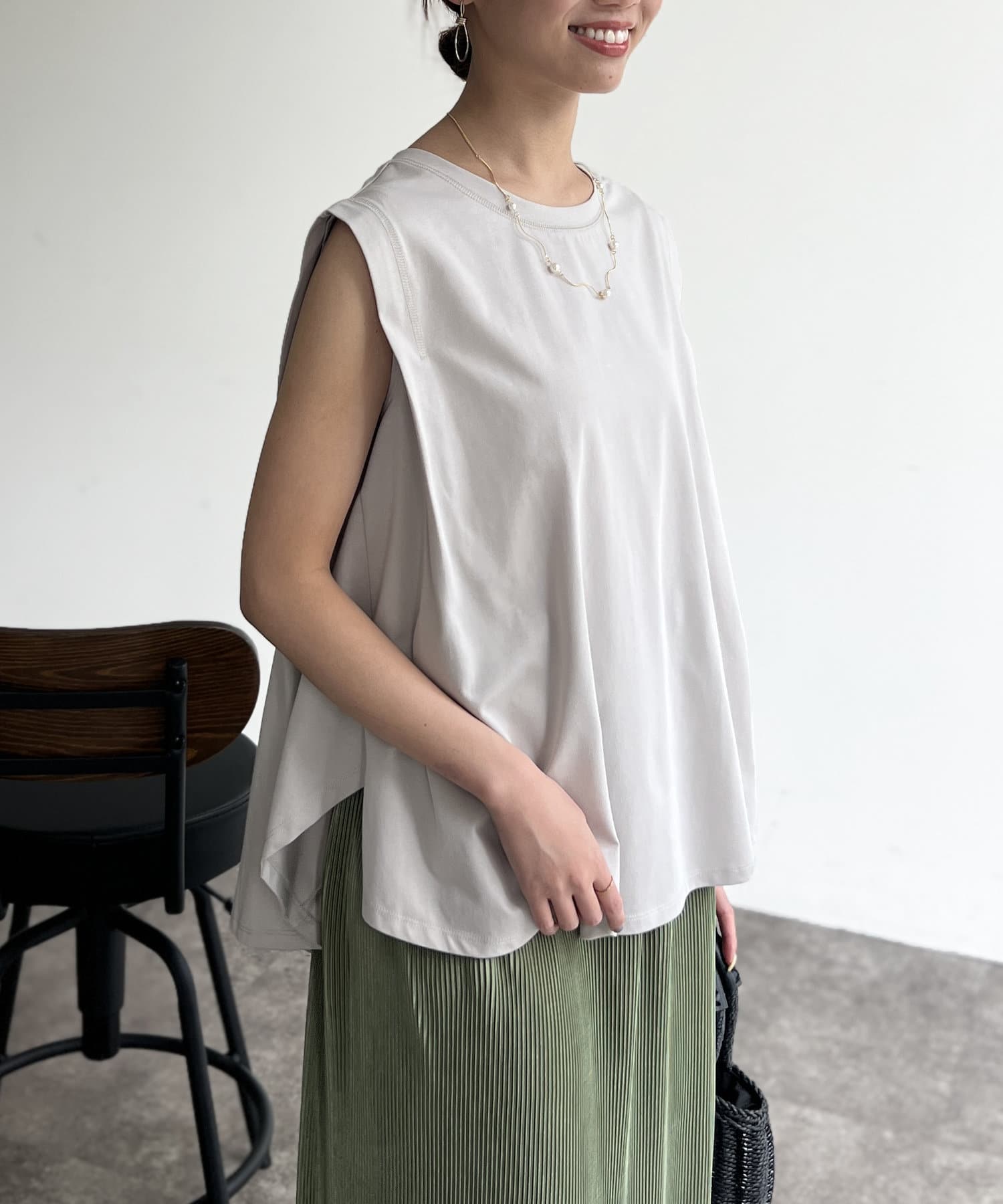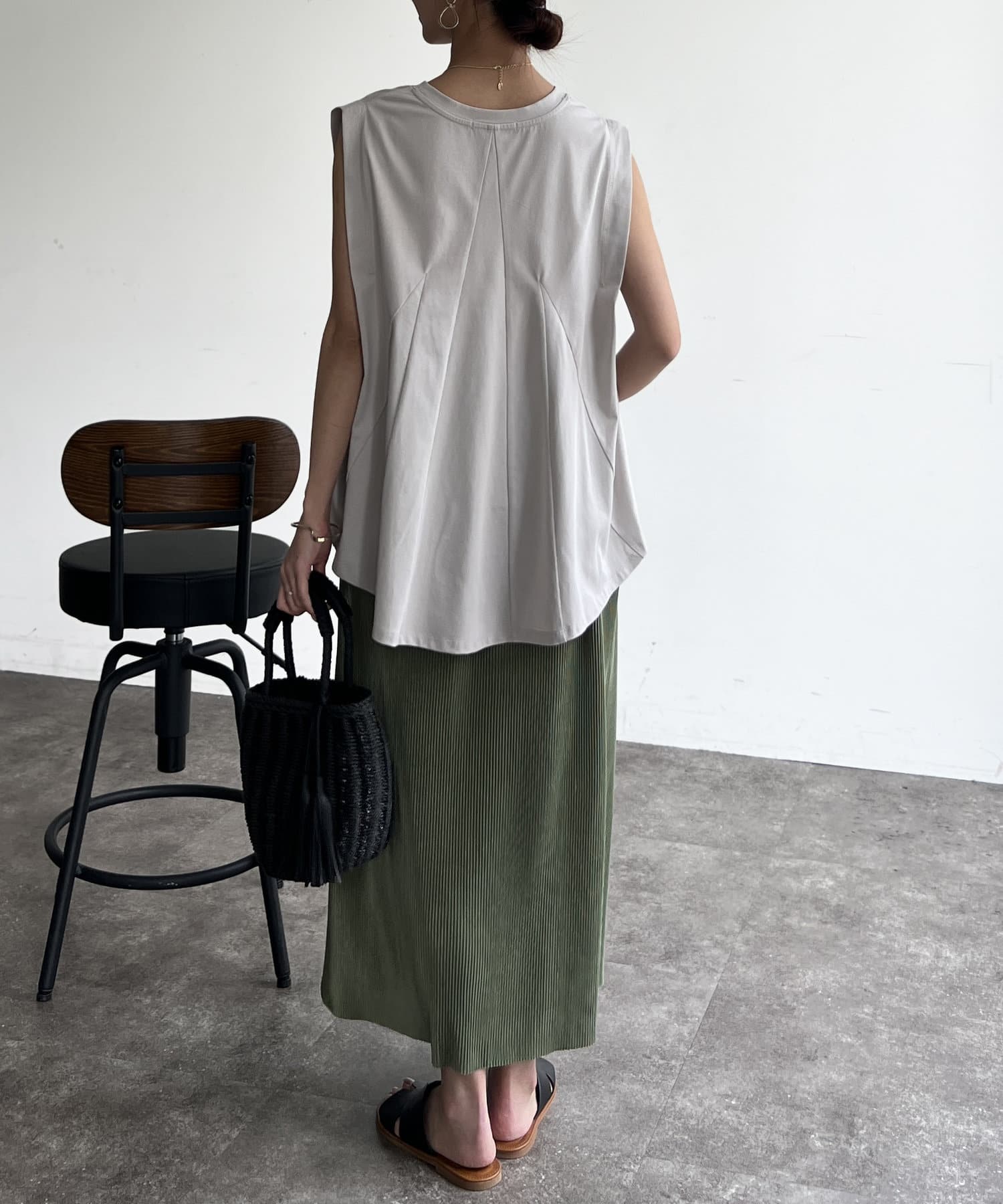 肩のまっすぐに切り落とされたラインが腕をすっきり見せてくれるノースリーブ。