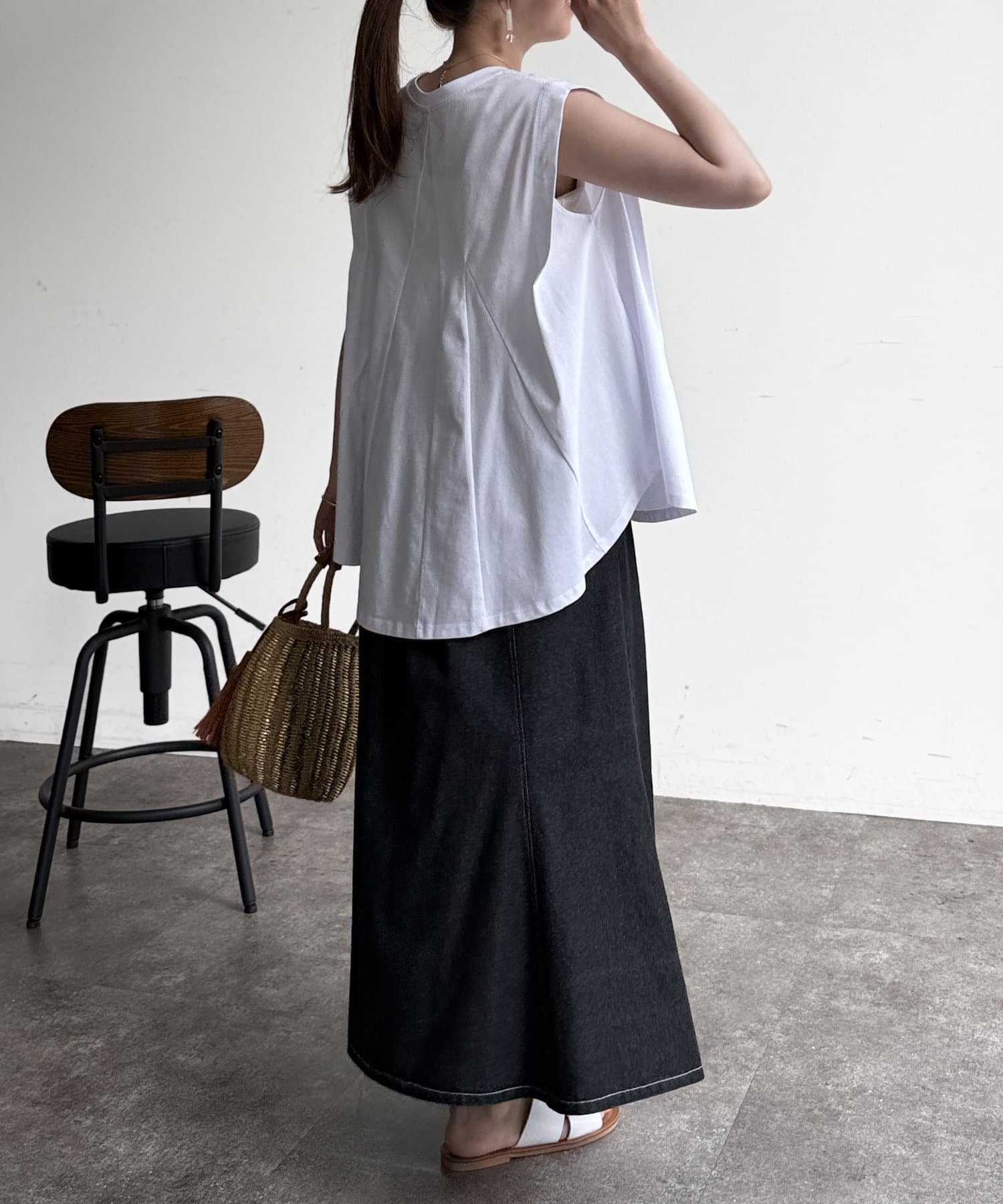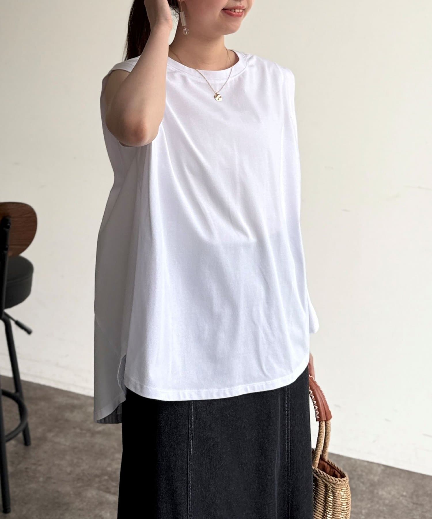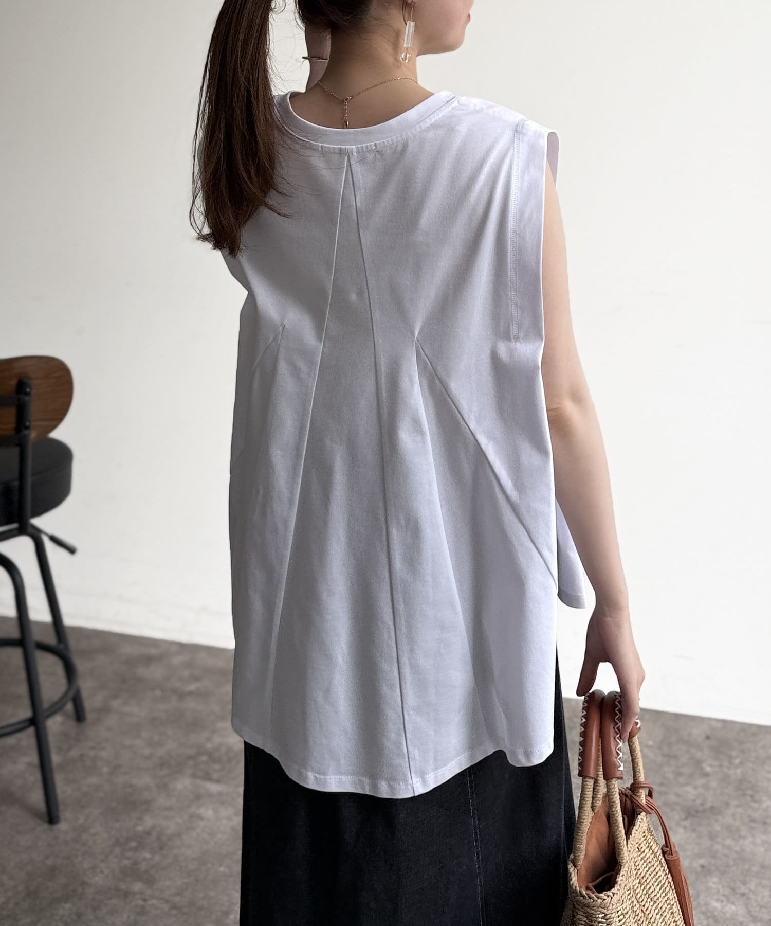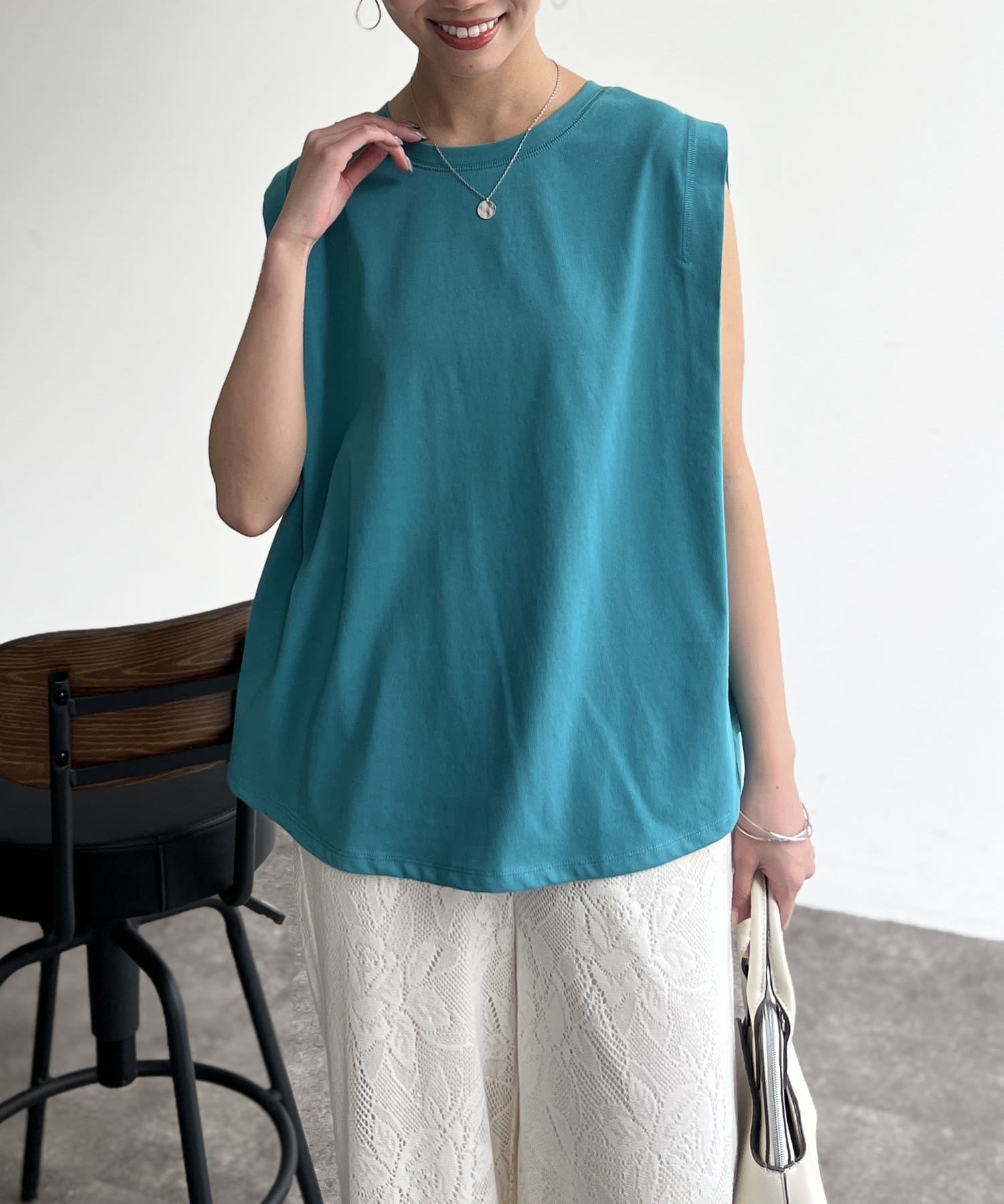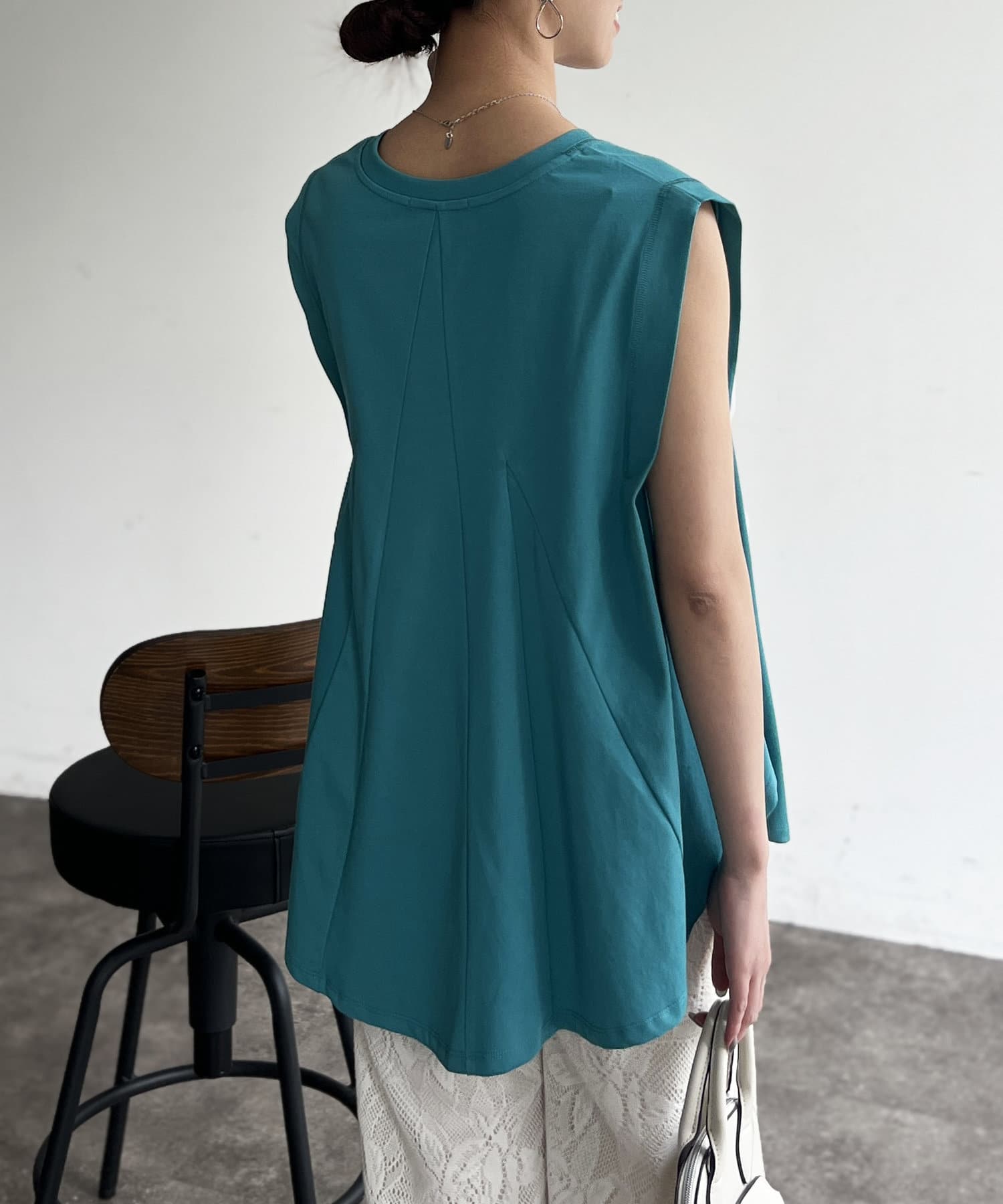 肩のまっすぐに切り落とされたラインが腕をすっきり見せてくれるノースリーブ。